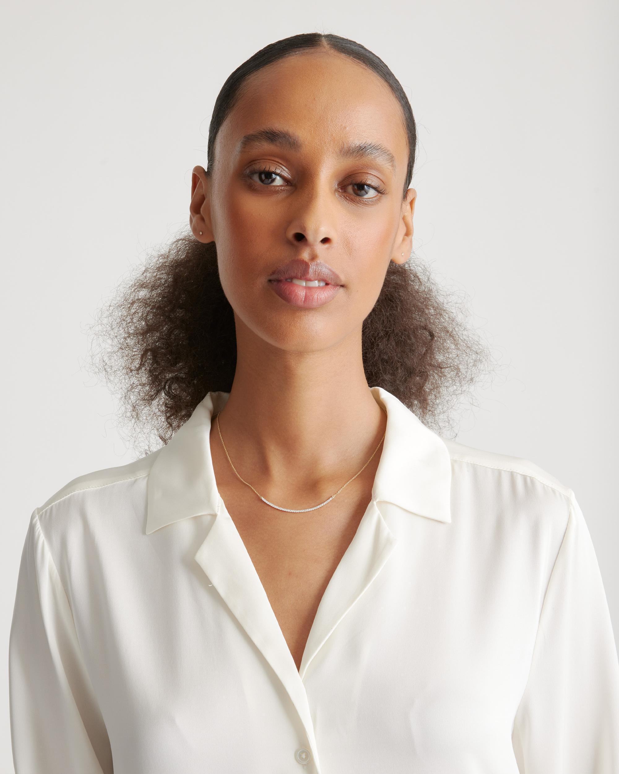 From wedding ready to office appropriate, our Harlowe Necklace promises all-day glam any time you need to dress up your look. The delicately curved bar of round-cut pavé diamonds set in 14k gold is low-key luxury defined. And it’s made to last a lifetime (for real). | Quince | Women's 14K Gold Pave Diamond Harlowe Curved Bar Neck in White Gold