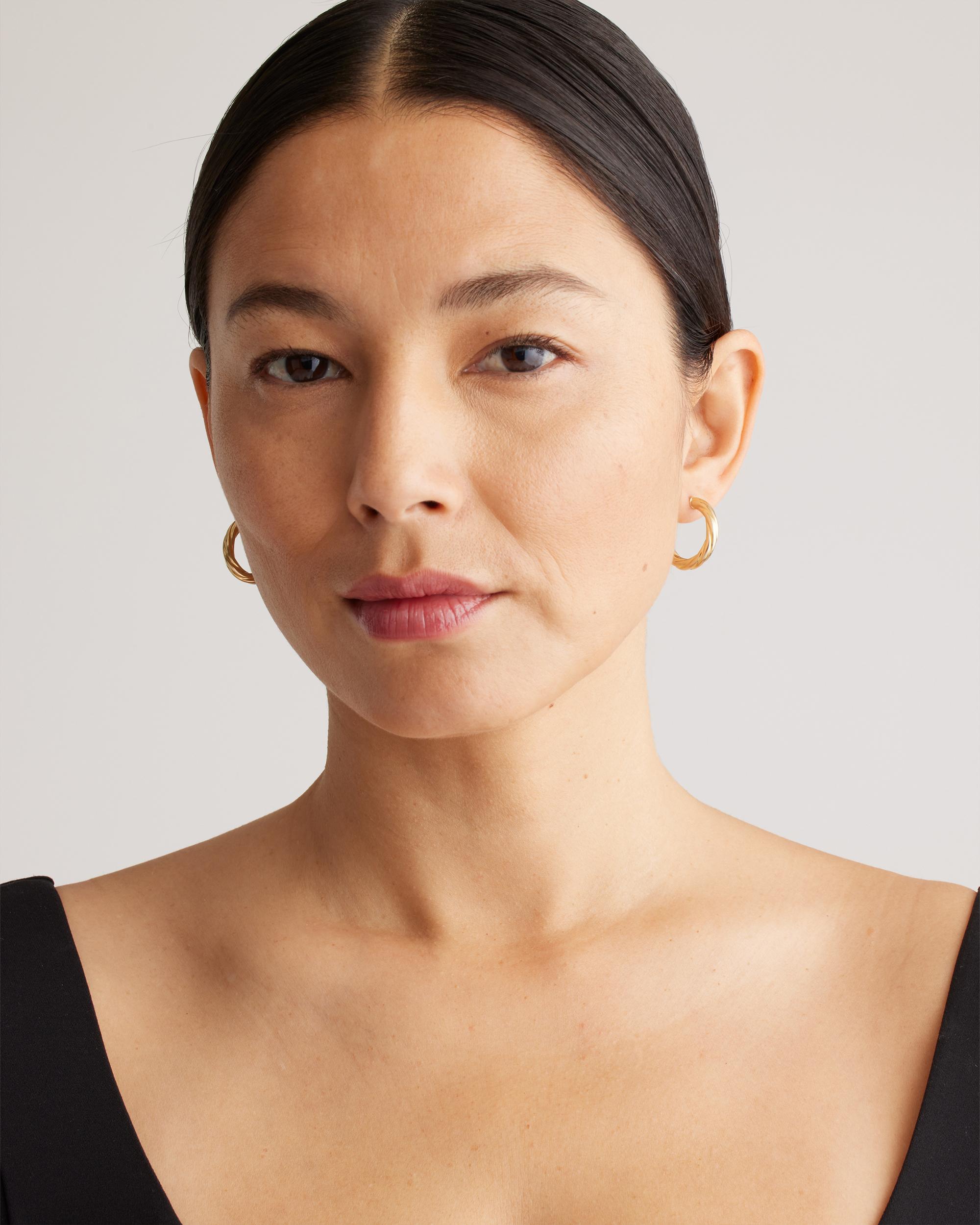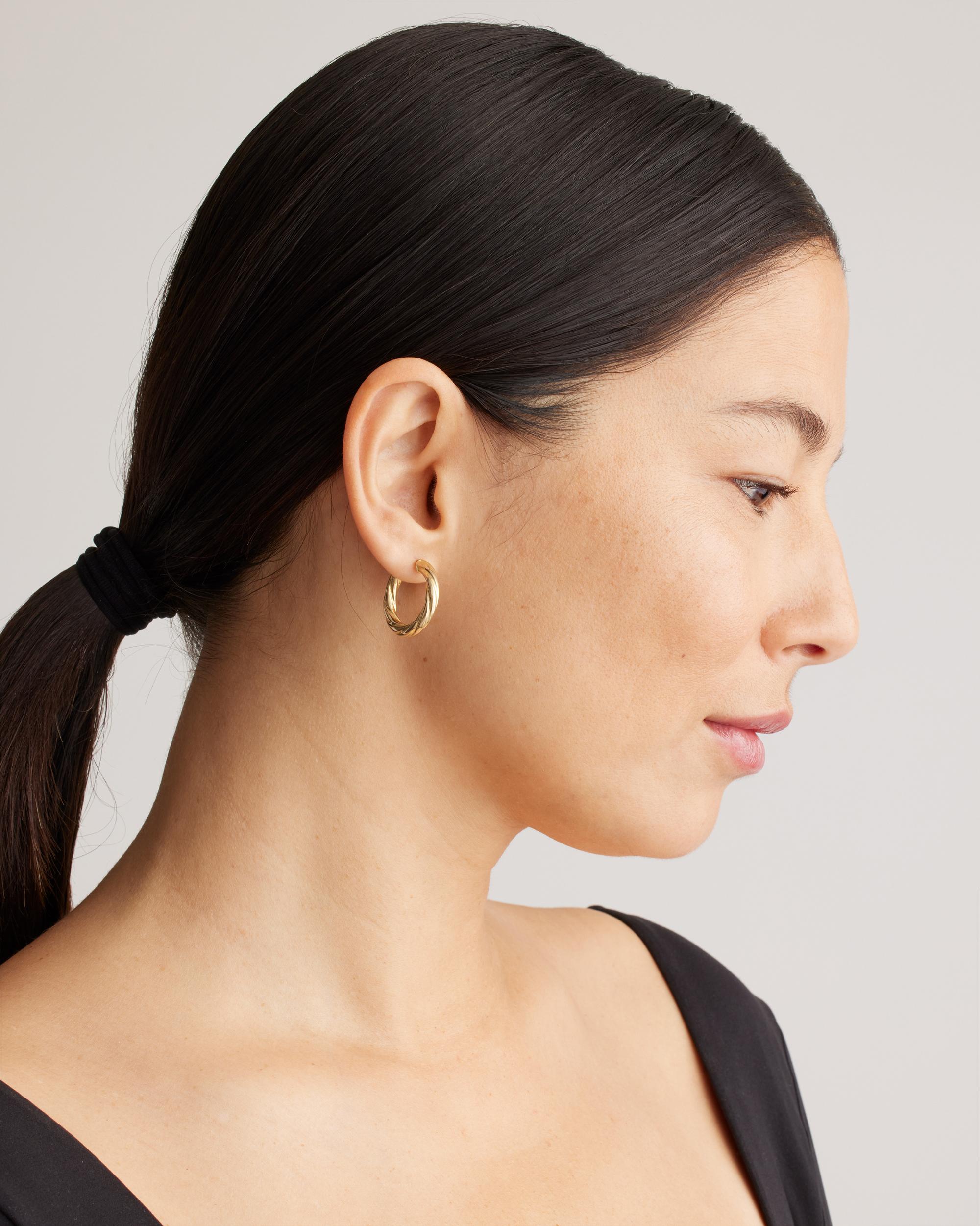 These 14K Gold Twisted Wide Hoop earrings are the perfect blend of classic and modern style. The lightweight design makes them comfortable for everyday wear, while the subtle twisted detailing adds a unique touch. Made from high-quality 14k gold, these hoops are sure to elevate any outfit. Whether you're dressing up for a special occasion or just running errands, these earrings are a versatile and stylish choice. | Quince | Women's 14K Gold Twisted Wide Hoop in Yellow Gold
