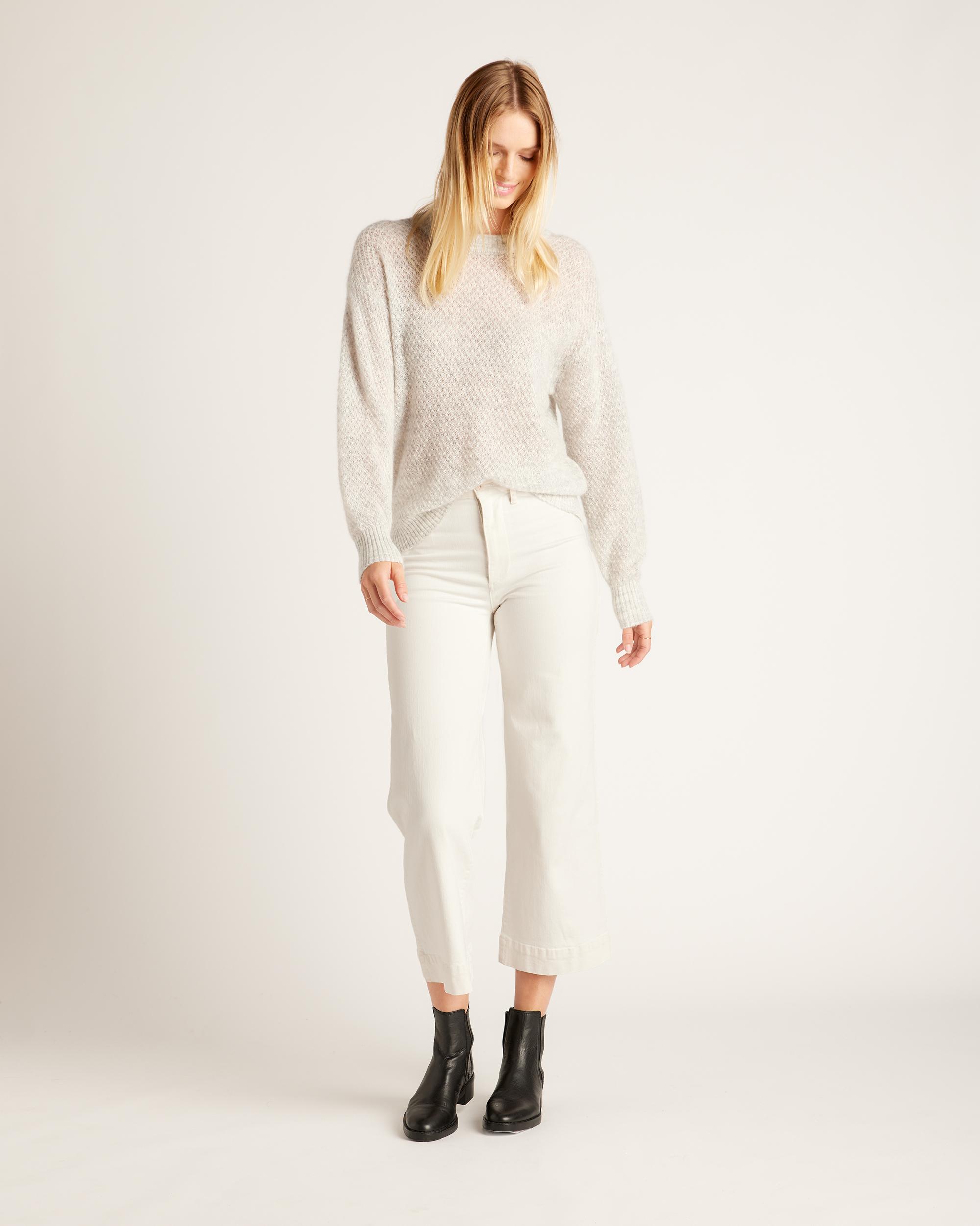 Soft, textured, tactile. We love that our alpaca crewneck sweater has an oversized silhouette with a light feel. It has a diamond stitch pattern with an incredibly soft texture for ultimate easy styling and comfort. Alpaca wool is long lasting and resistant to pilling, and doesn't have the scratchiness of some other wools. | Quince | Women's Baby Alpaca-Wool Diamond Stitch Crew Neck Alpaca Sweater in Light Grey, Size XS