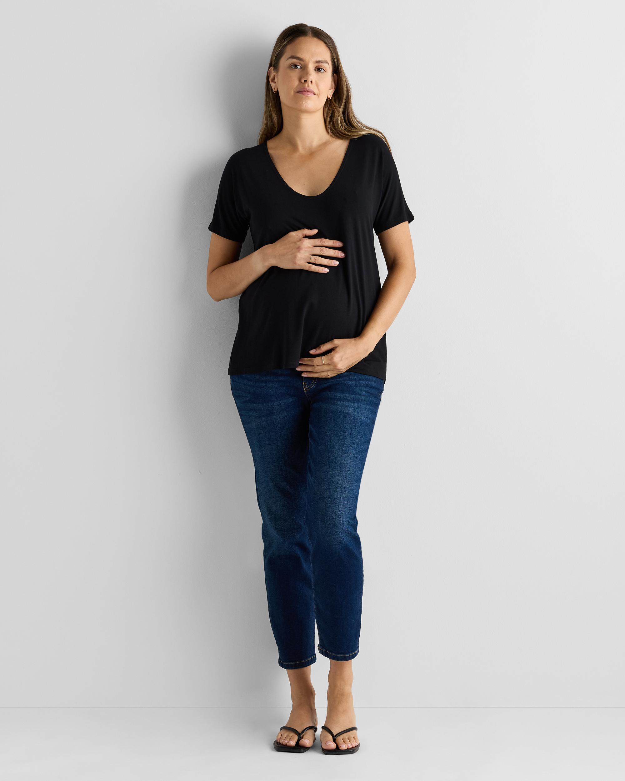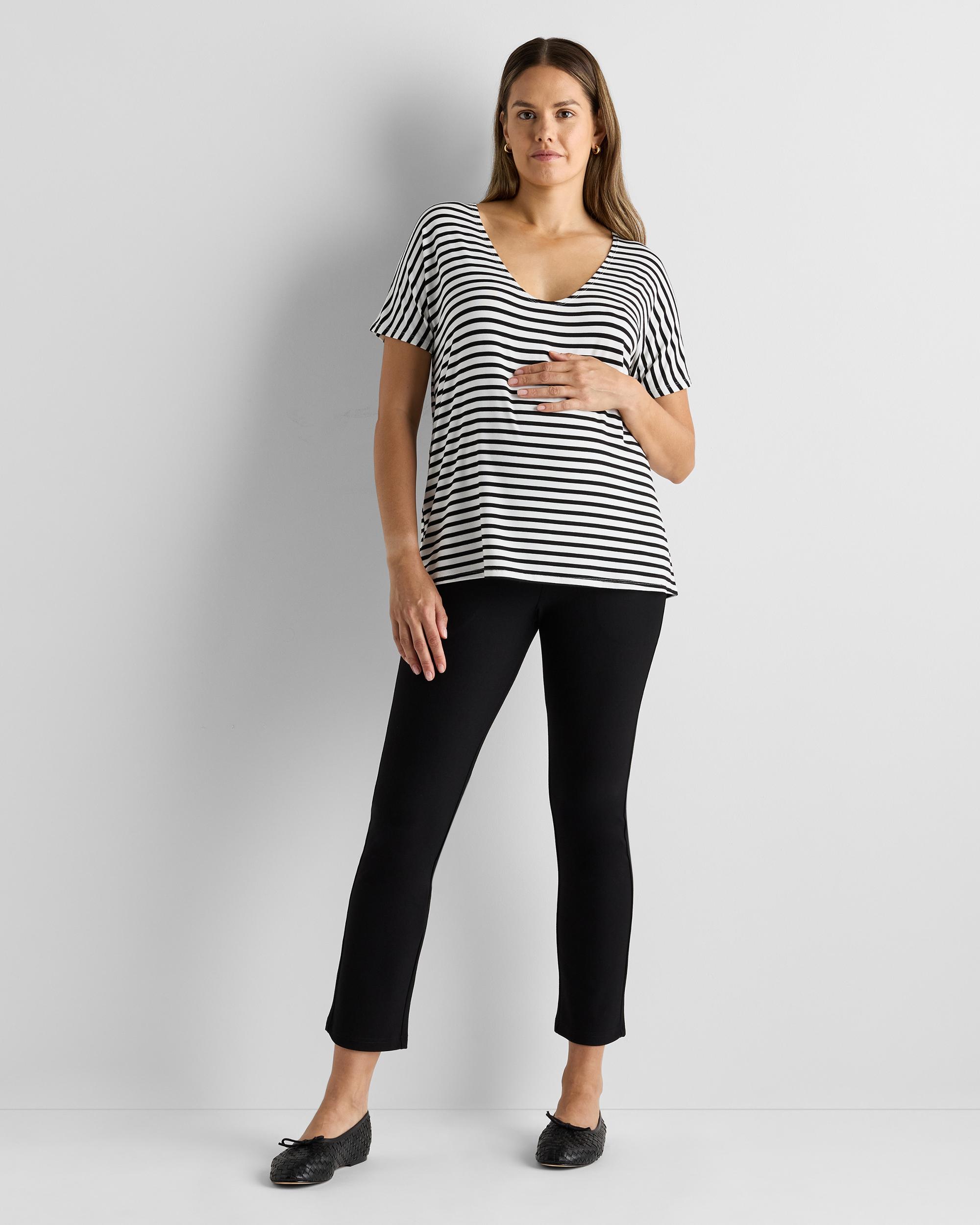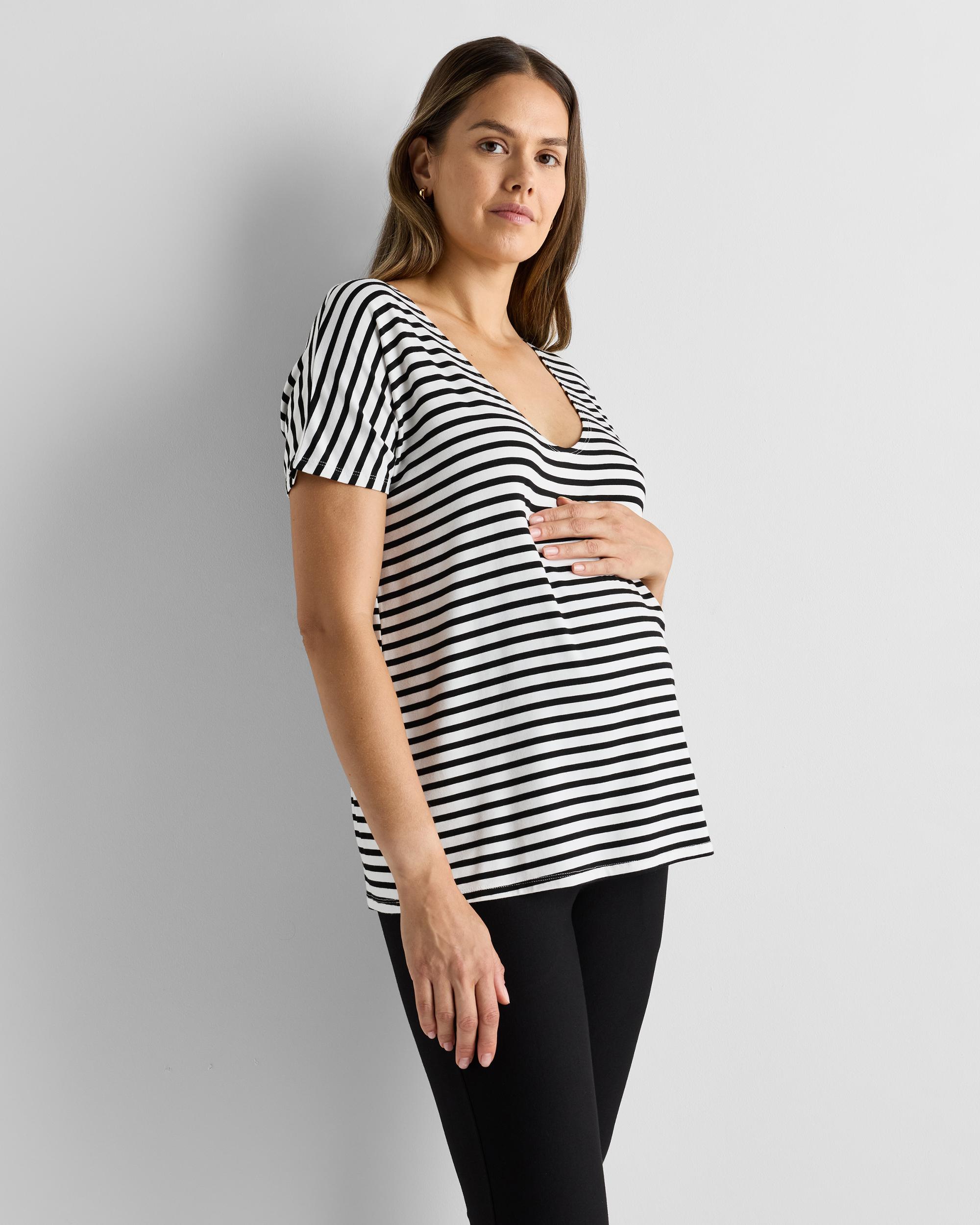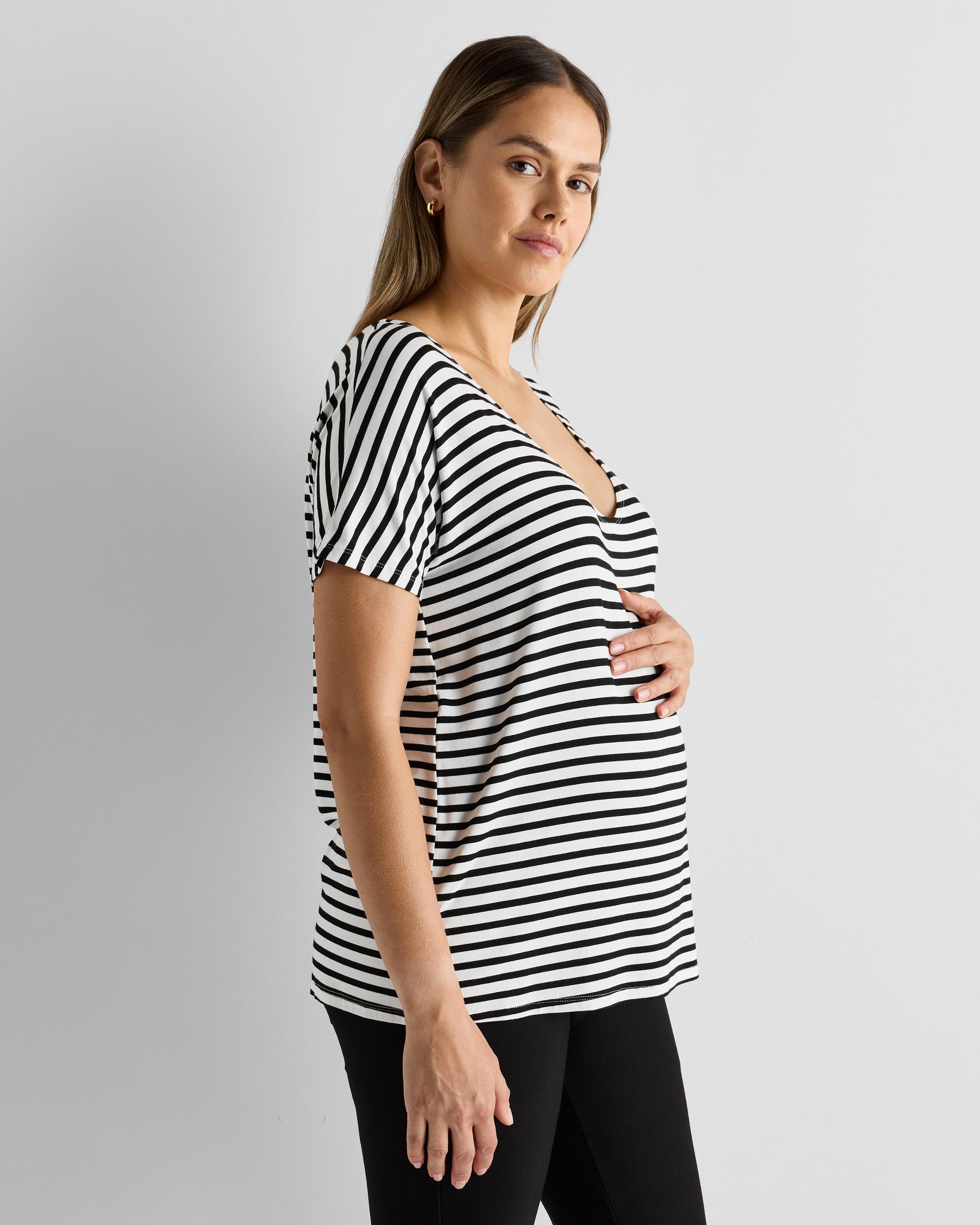 You’re go-to before, during and after tee. This soft and drapey v-neck tee is crafted in our premium rayon from bamboo fabric, with just the right amount of stretch. Designed with an oversized fit and a soft, curved v neckline to accommodate all stages of pregnancy and beyond. A wardrobe staple so great, we figured you needed two. | Quince | Women's Bamboo Jersey Maternity Soft V-Neck T-Shirt in Black/Black White Stripe, Size XL