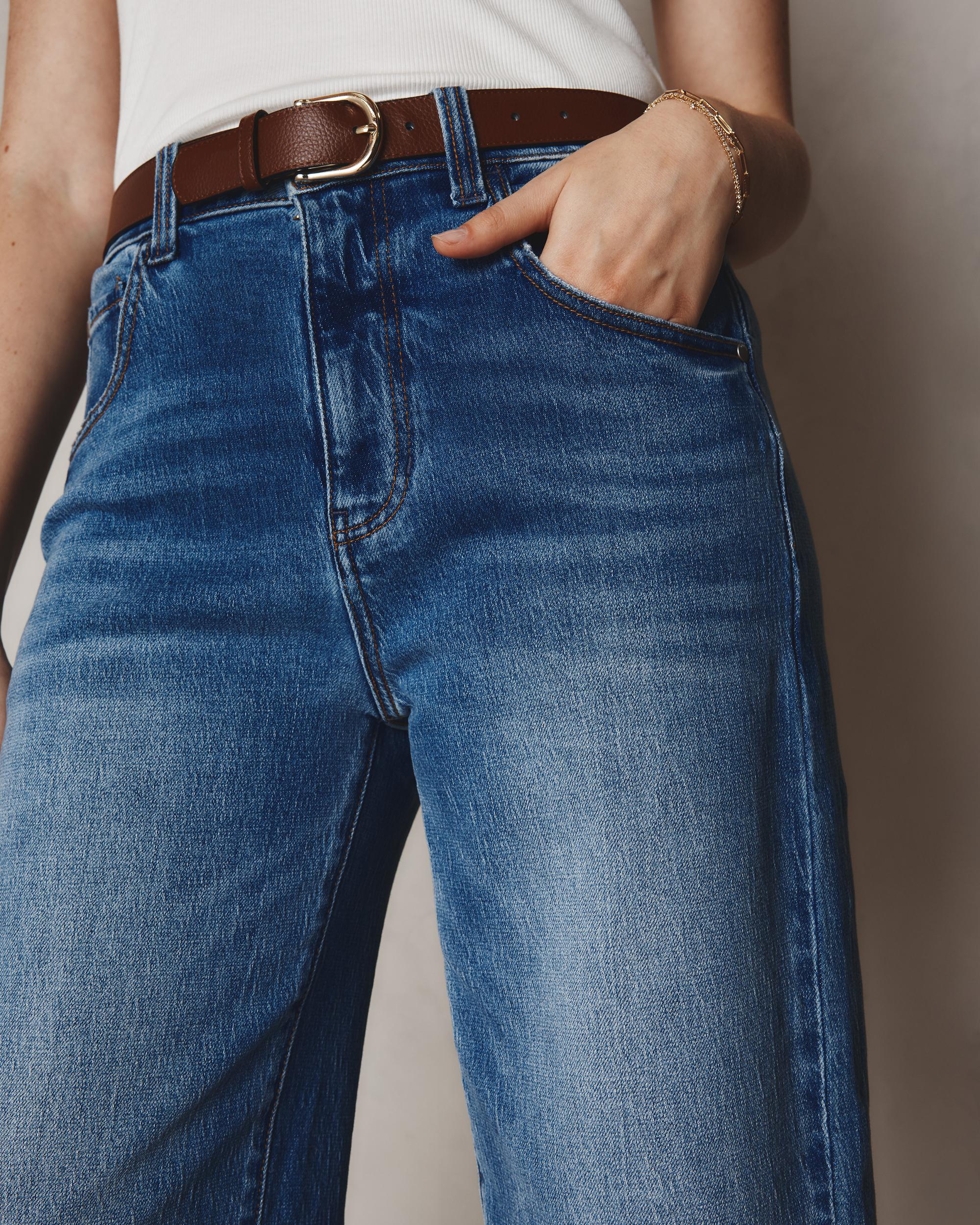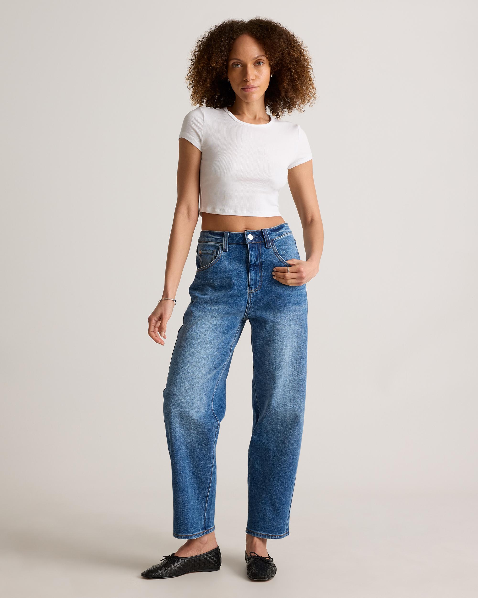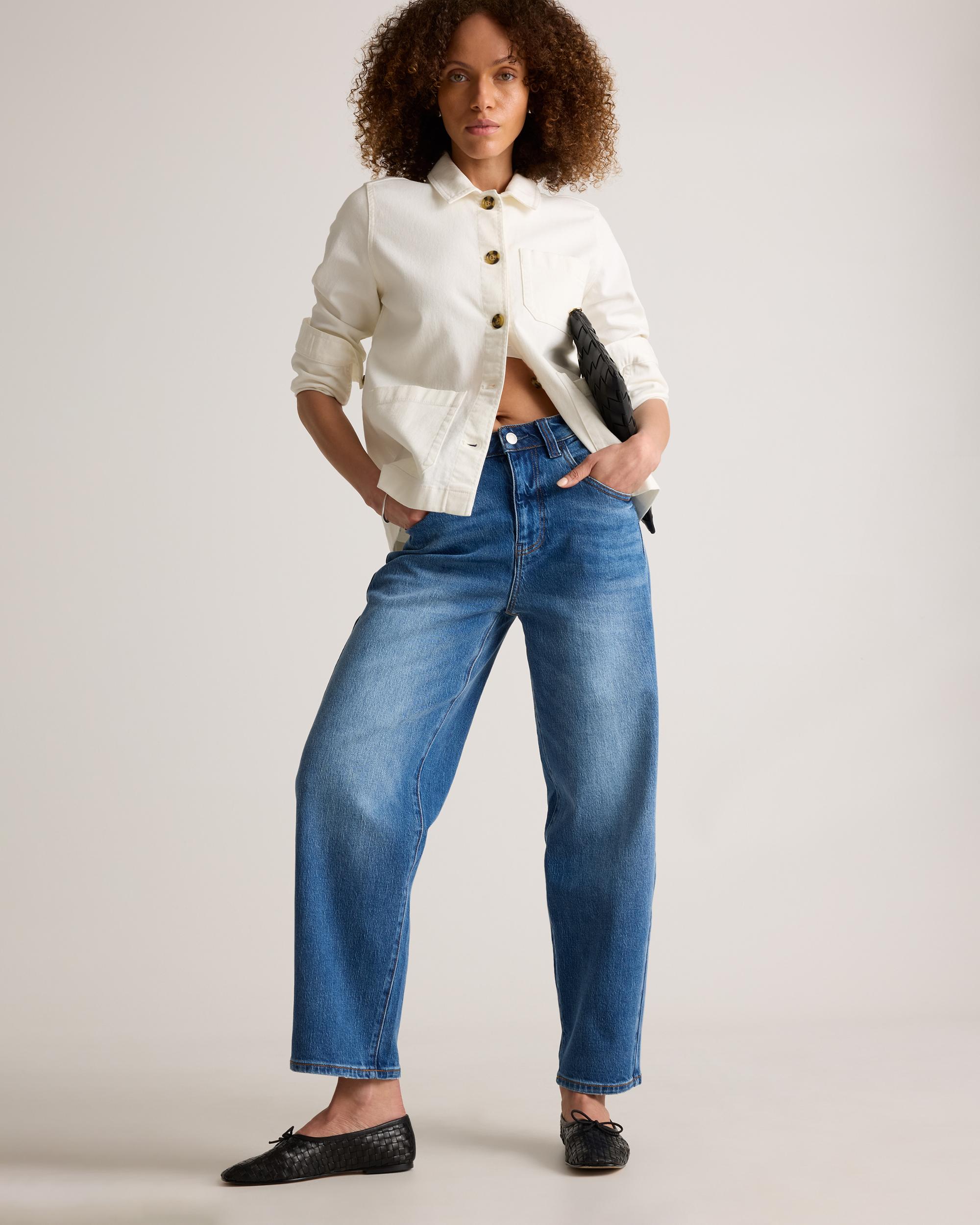 Our Bella Stretch Barrel Jeans redefine everyday denim with a high-rise fit that hugs your waist and a structured barrel leg that makes a statement. Plus it’s crafted from premium denim with organic cotton for a supportive yet comfy fit and impossibly soft feel. It’s the perfect pair you’ll always reach for. | Quince | Women's Bella Stretch Barrel Jeans in Atlantic Blue, Size 27, Organic Cotton
