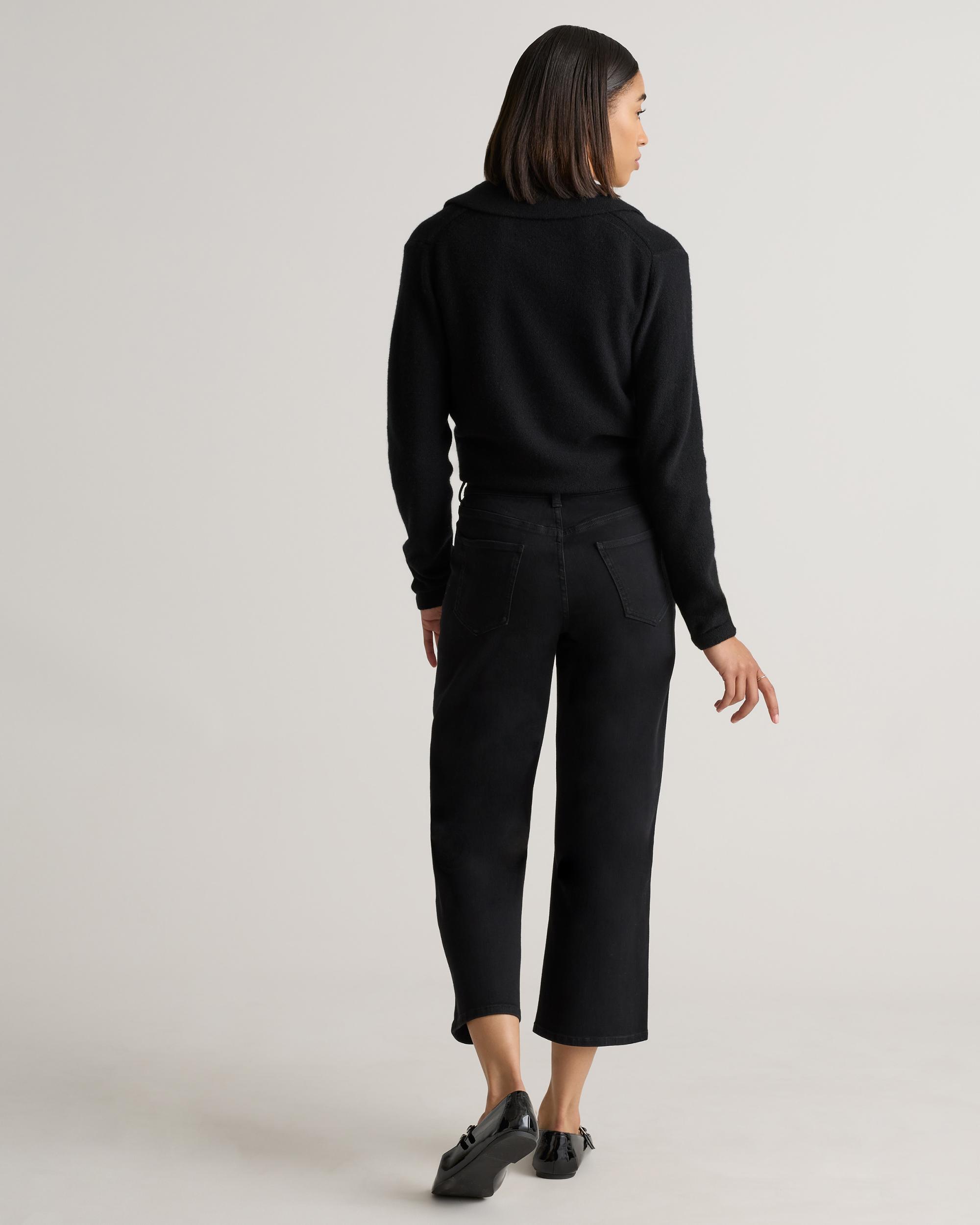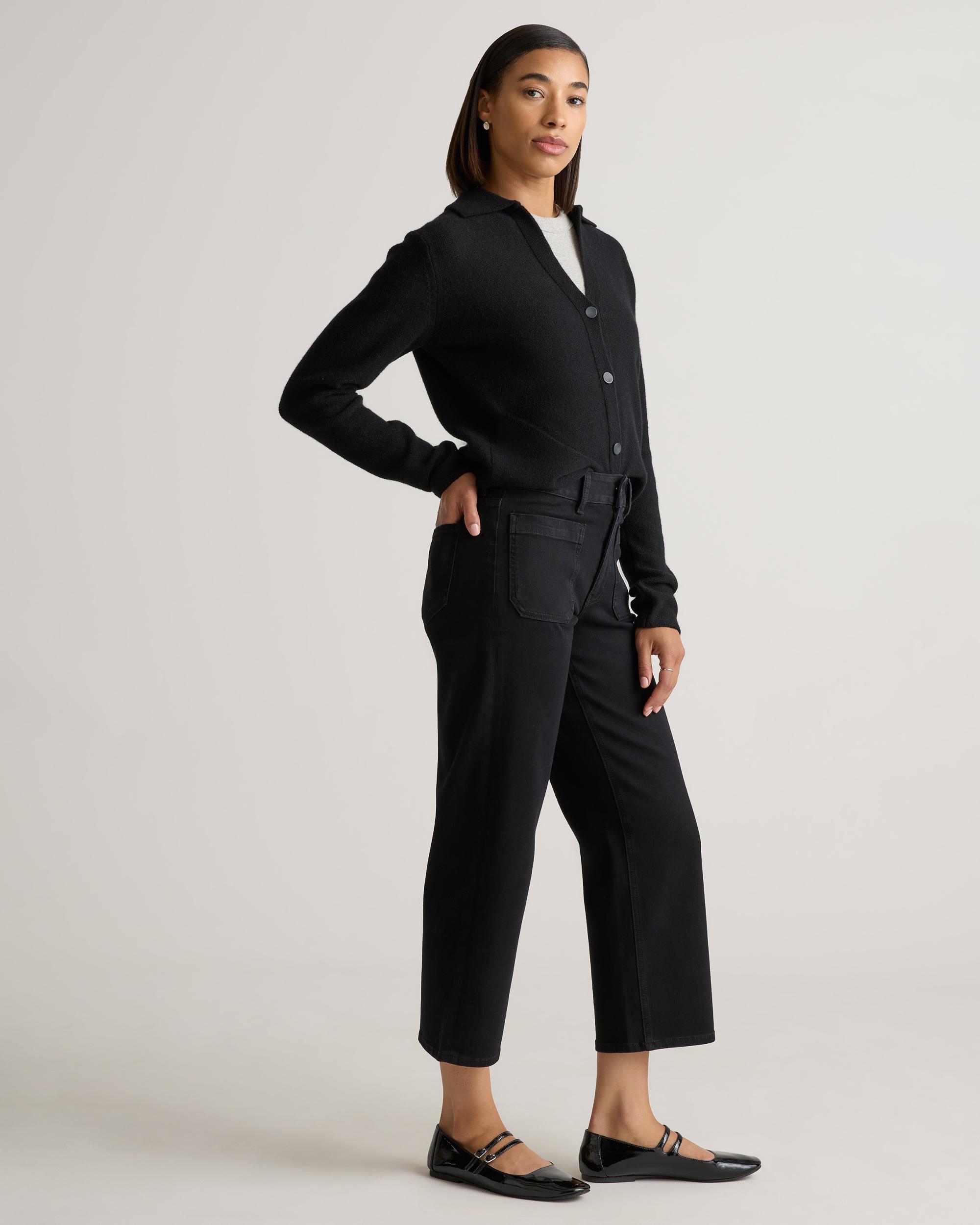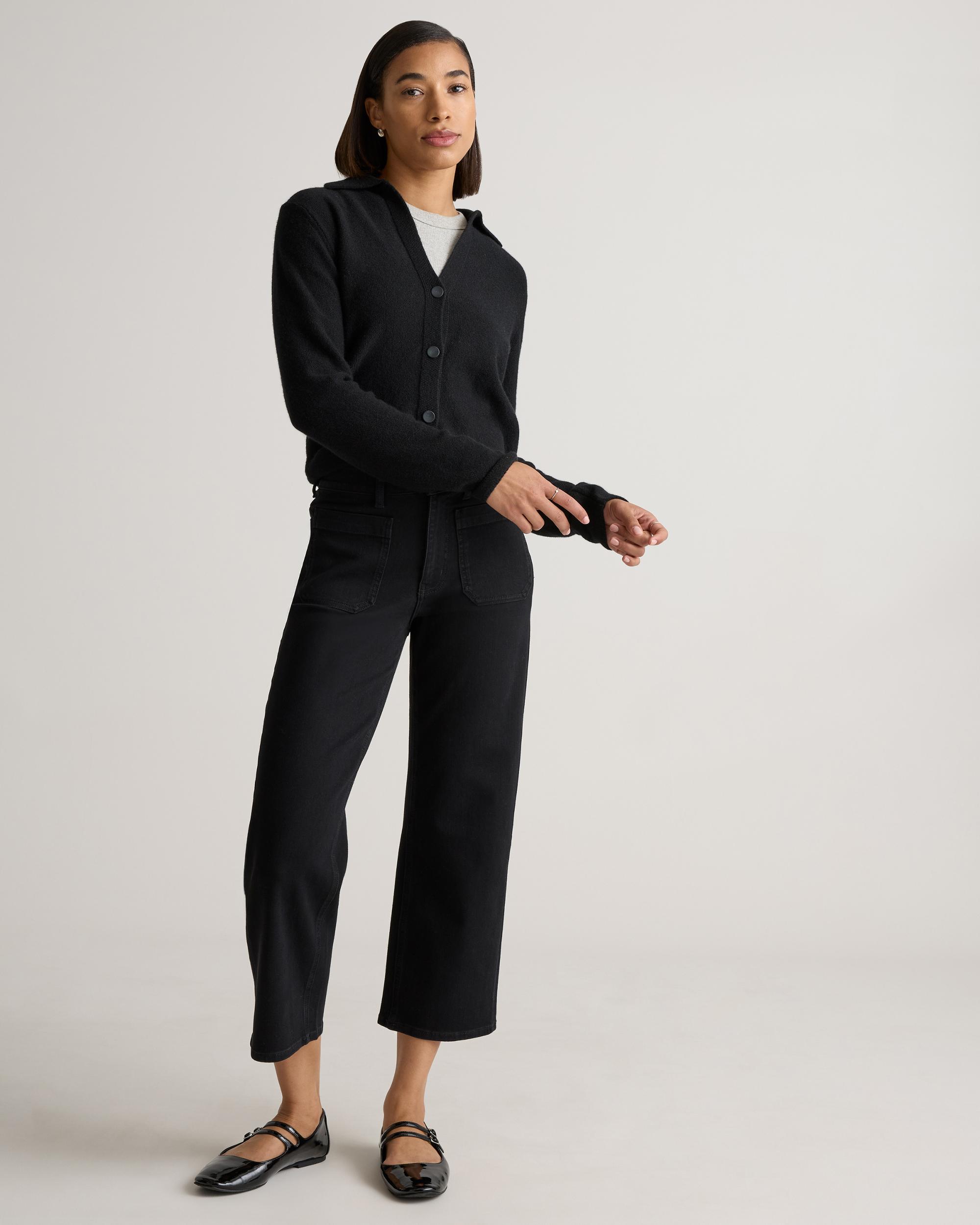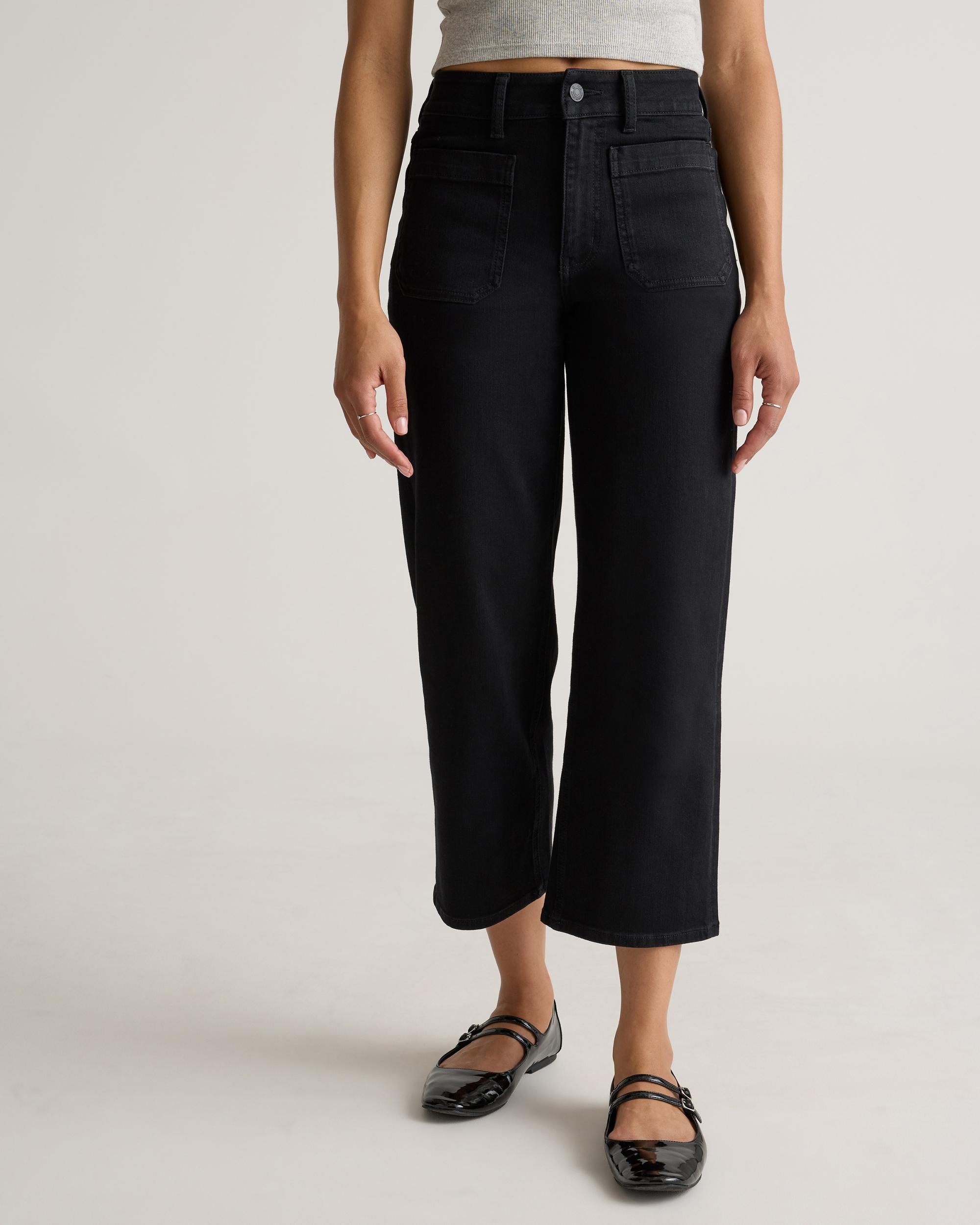 Meet the Bella Stretch Patch Pocket Wide Leg Jeans, our ‘70s-inspired style with an added stretch that fits just right. The curve-hugging high-rise cut, cropped wide leg, and patch pocket detail make these a versatile pair for dressing up or down. Crafted from premium super-stretch denim with organic cotton, it has the flexible fit and impossibly soft feel you’ll always reach for. | Quince | Women's Bella Stretch Patch Pocket Wide Leg Jeans in Black, Size 24, Organic Cotton
