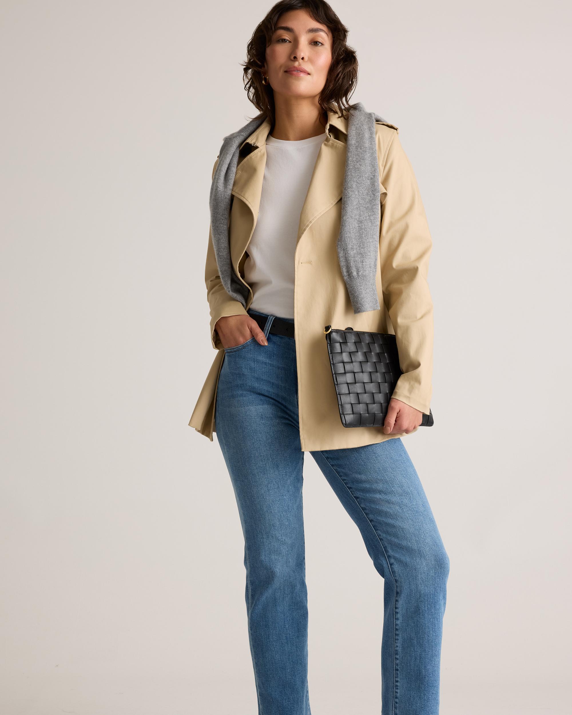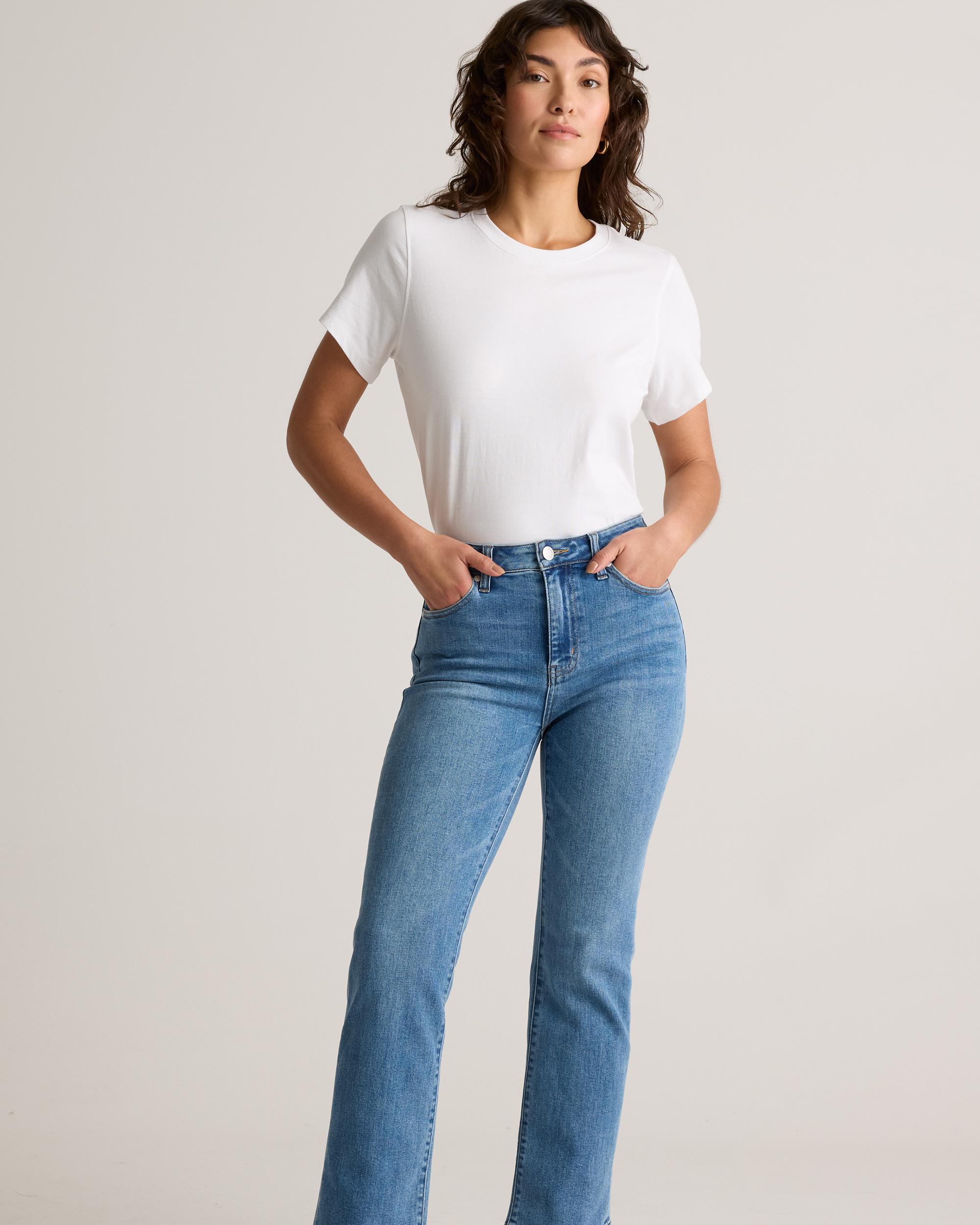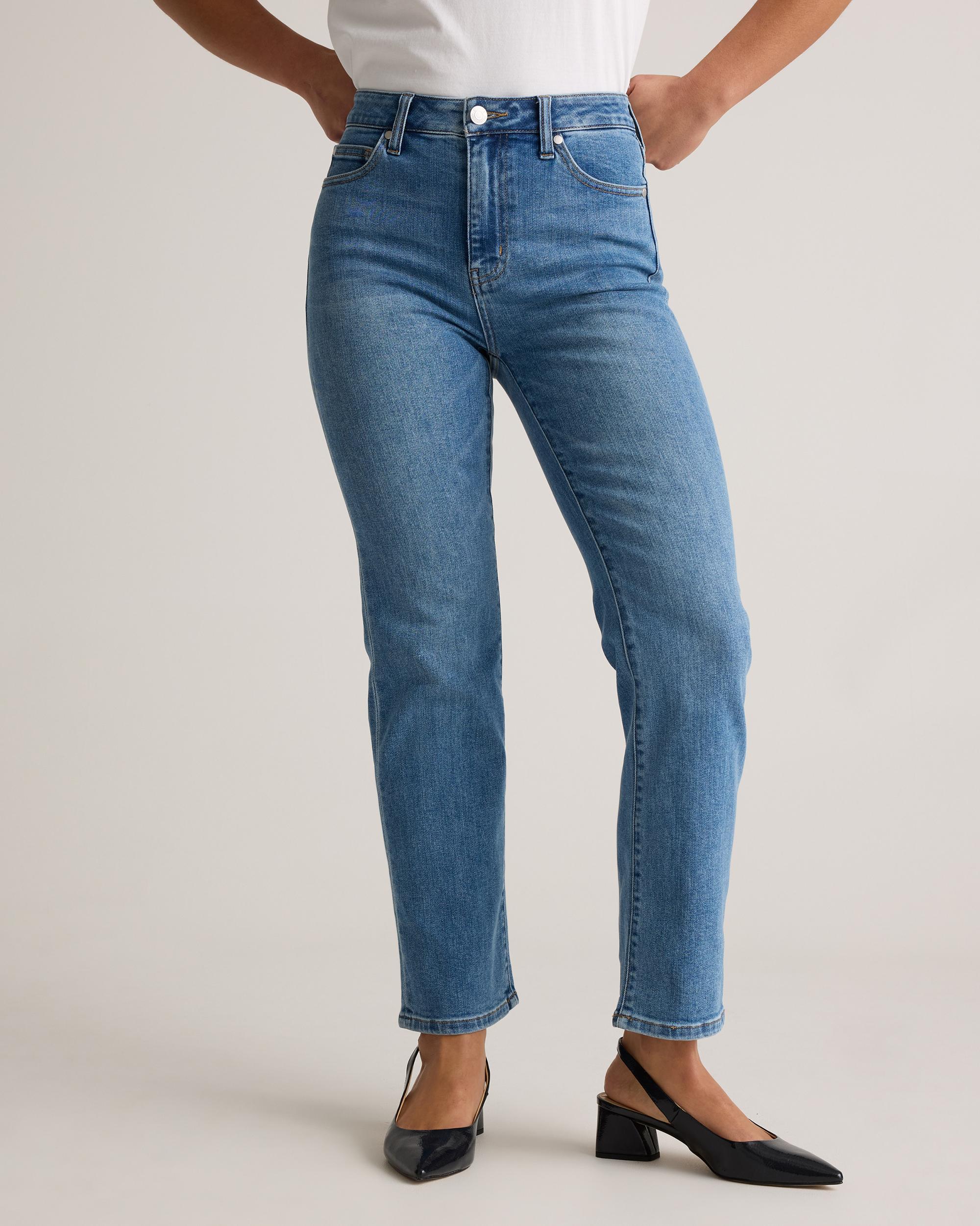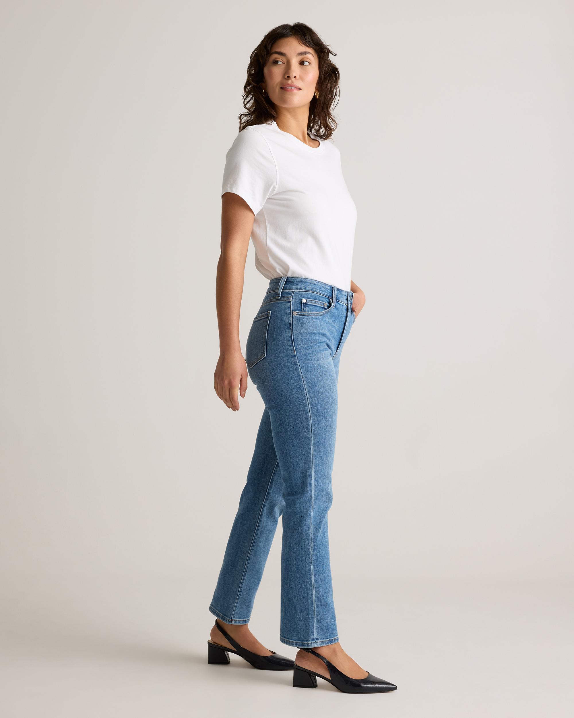 A textbook classic denim silhouette with a contemporary ankle length. Our Bella Stretch Straight Jeans feature a high rise that accentuates your hips and feels good. Plus it’s crafted from premium super stretch denim with organic cotton for a flexible fit and impossibly soft feel. It’s the comfy pair you’ll always reach for. | Quince | Women's Bella Stretch Straight Jeans in Medium Wash, Size 29, Organic Cotton