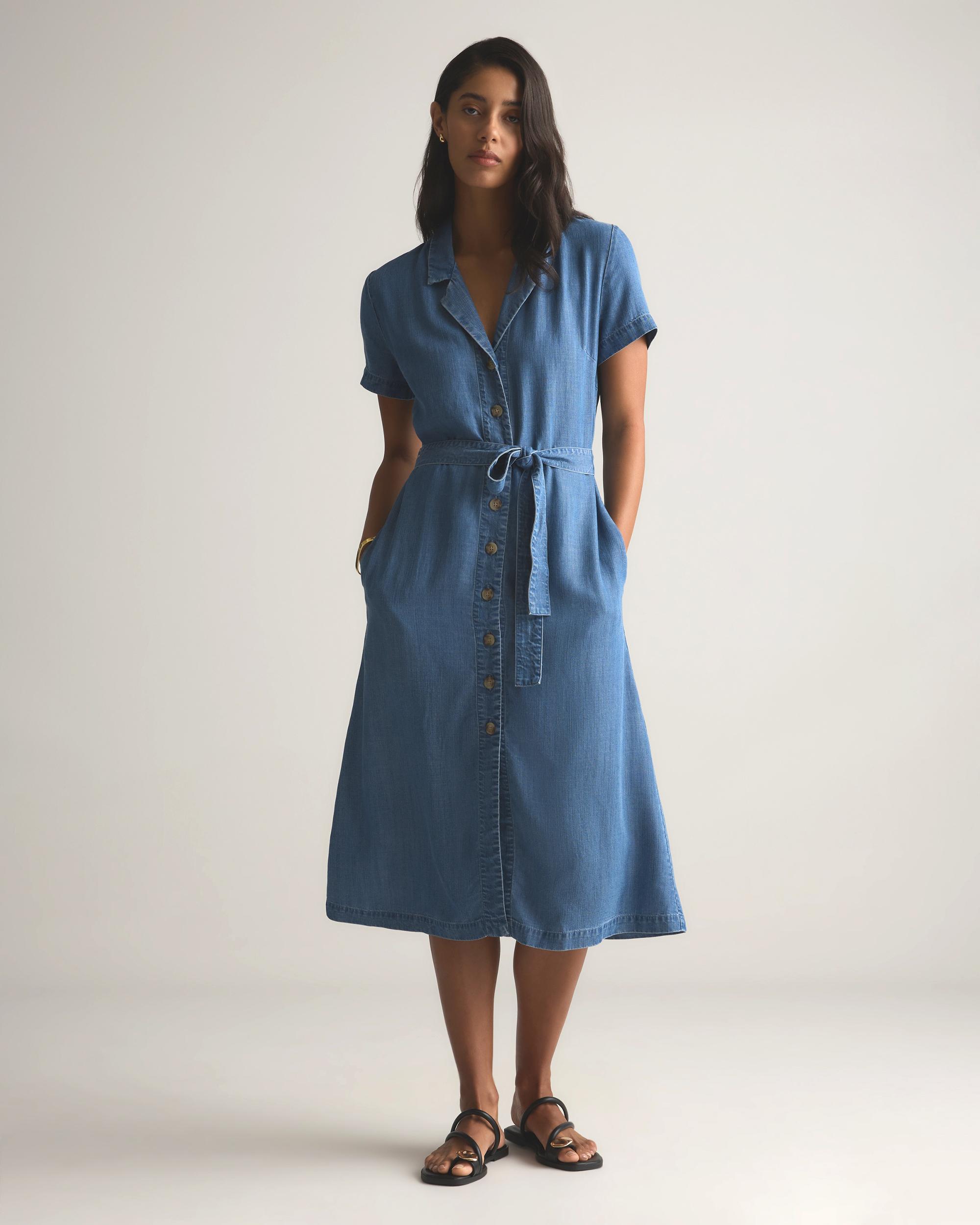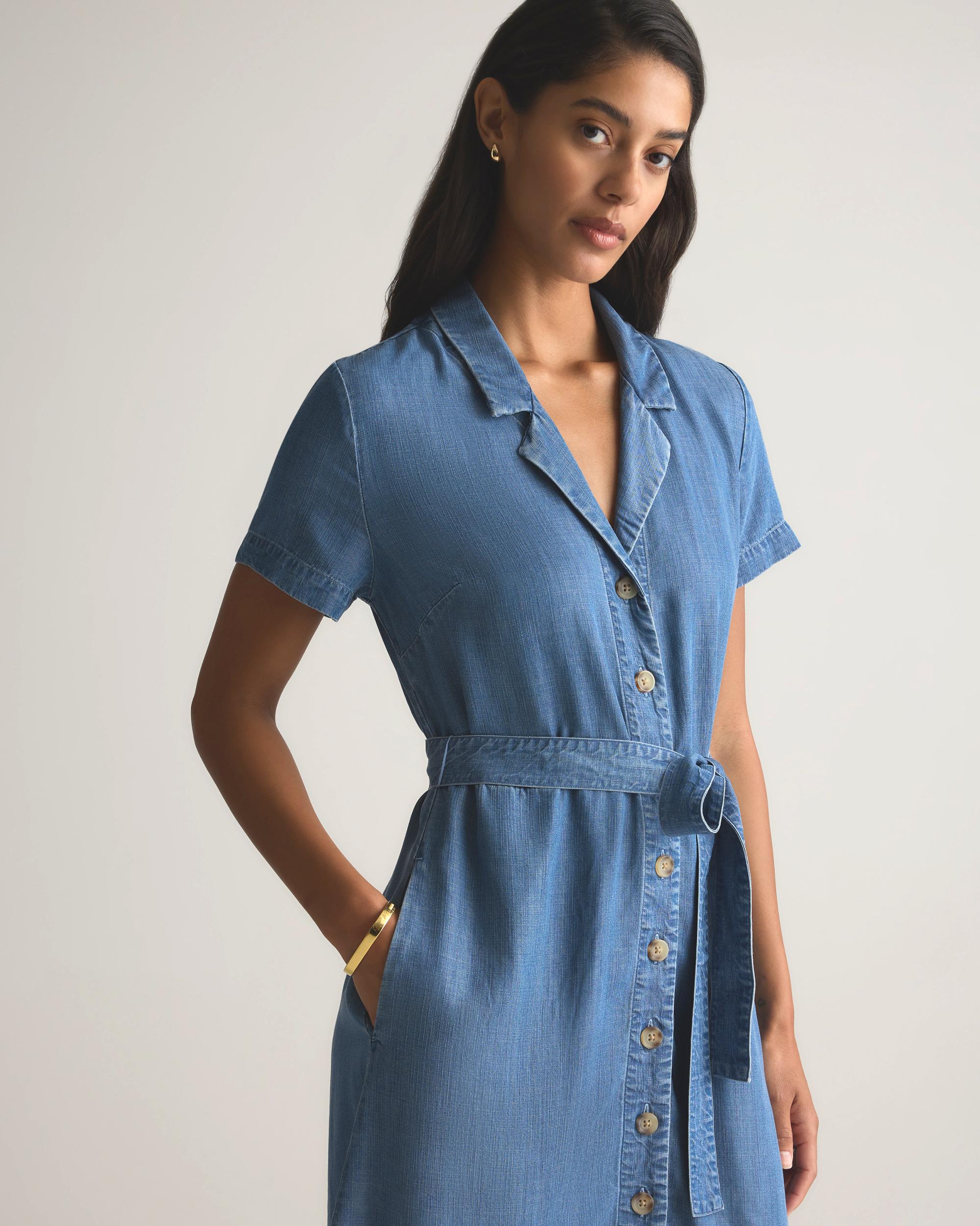 Step into spring with our new Chambray Tencel Button Front Dress. Crafted from fabric even more soft and breathable than cotton, this dress will keep you feeling comfortable all day long. The button-front closure and tie belt create an easy-to-wear and flattering silhouette. Dress it up or down for everyday office wear or weekend brunch! | Quince | Women's Chambray Tencel Button Front Dress in Medium Indigo, Size XL