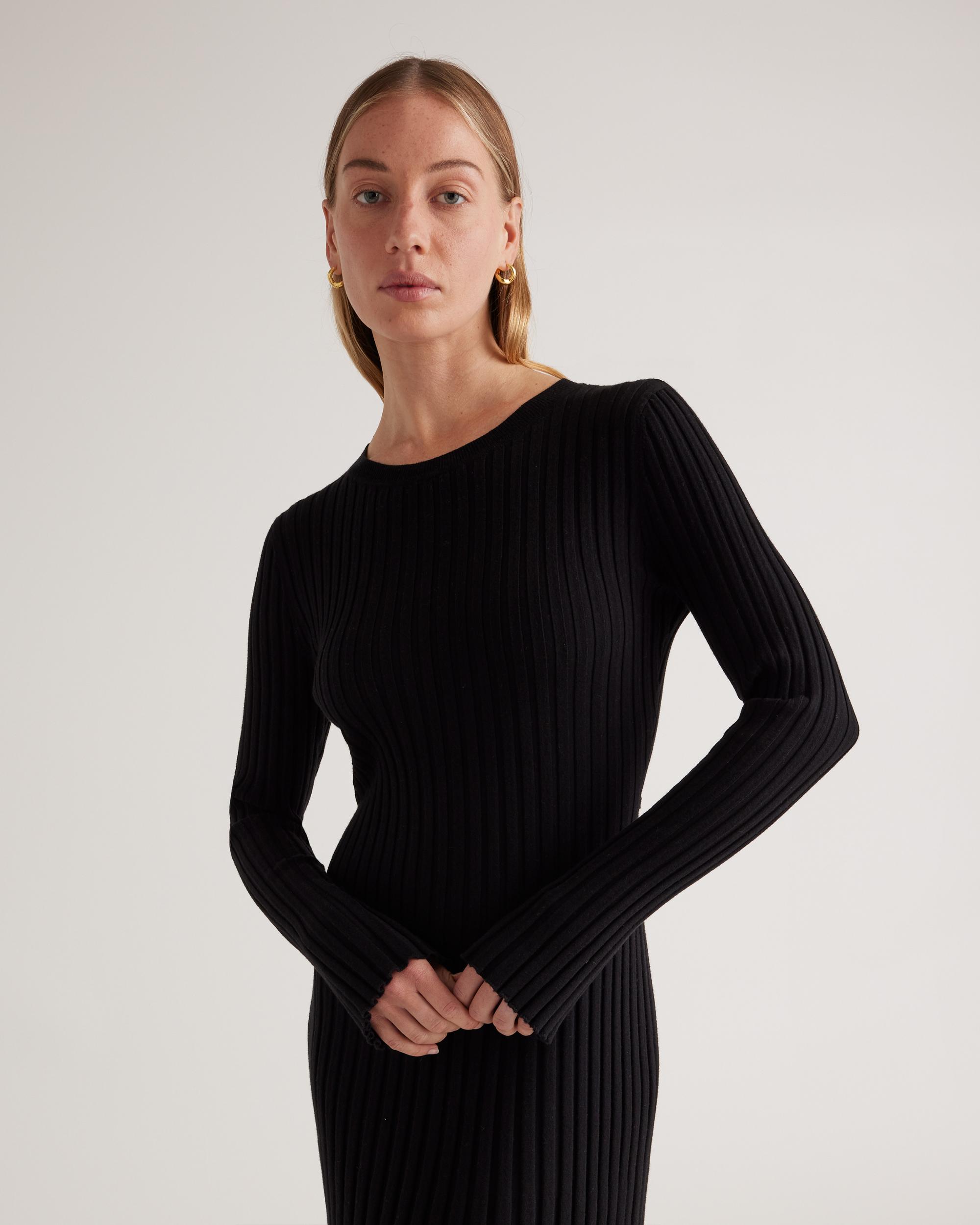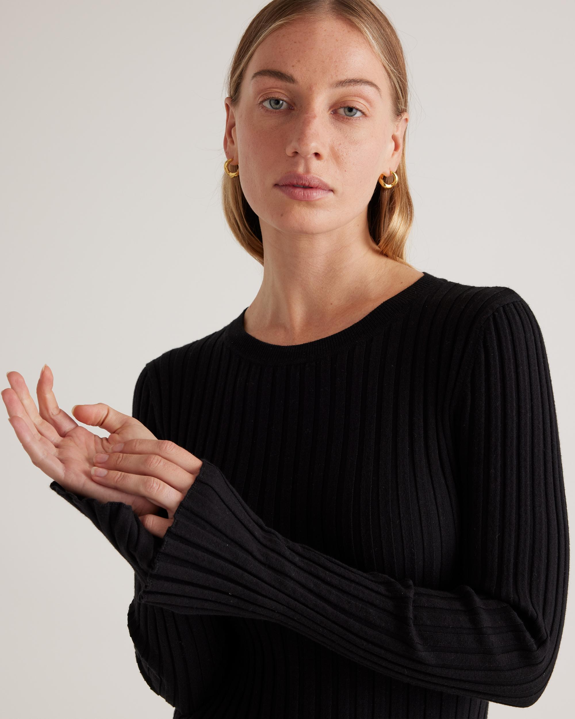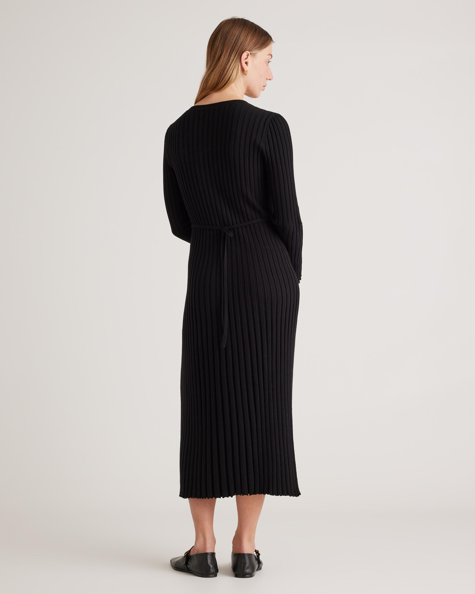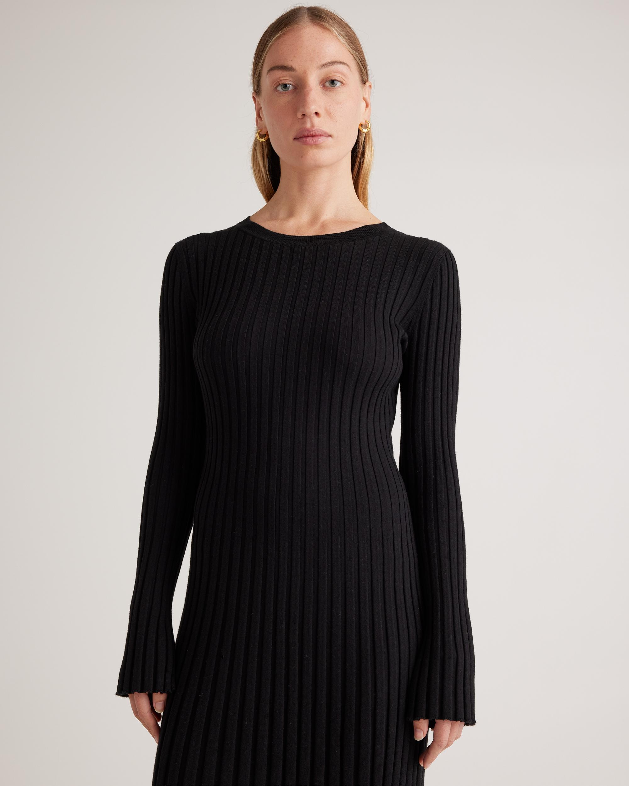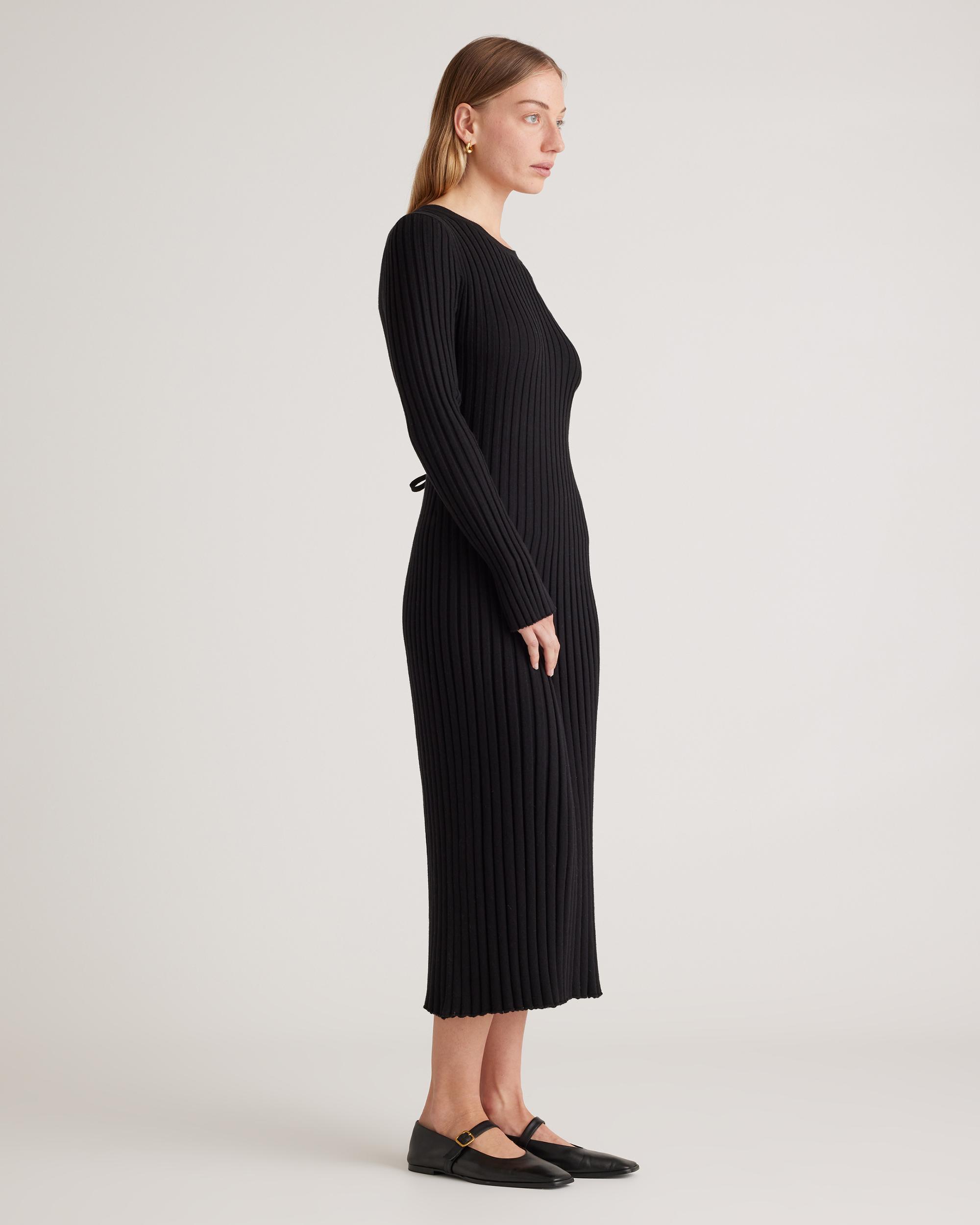 Everyday luxury is a thing—and our Cotton Cashmere Ribbed Long Sleeve Crew Midi Dress is proof. This sweater dress does it all with a cotton-cashmere blend that's light and breathable, and a ribbed knit for touchable texture. The adjustable tie means a custom-feeling fit. | Quince | Women's Cotton Cashmere Ribbed Long Sleeve Crew Midi Dress in Black, Size Large