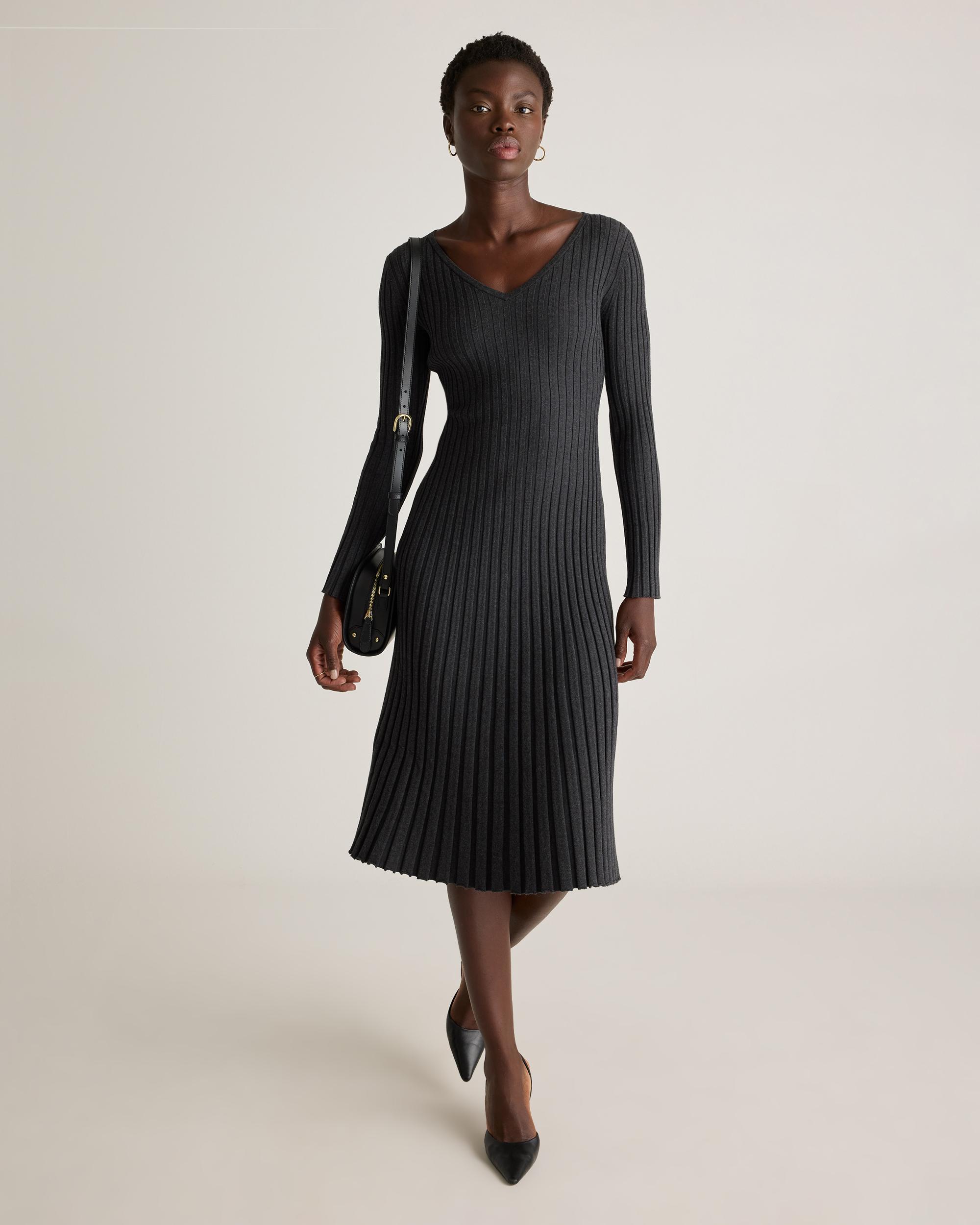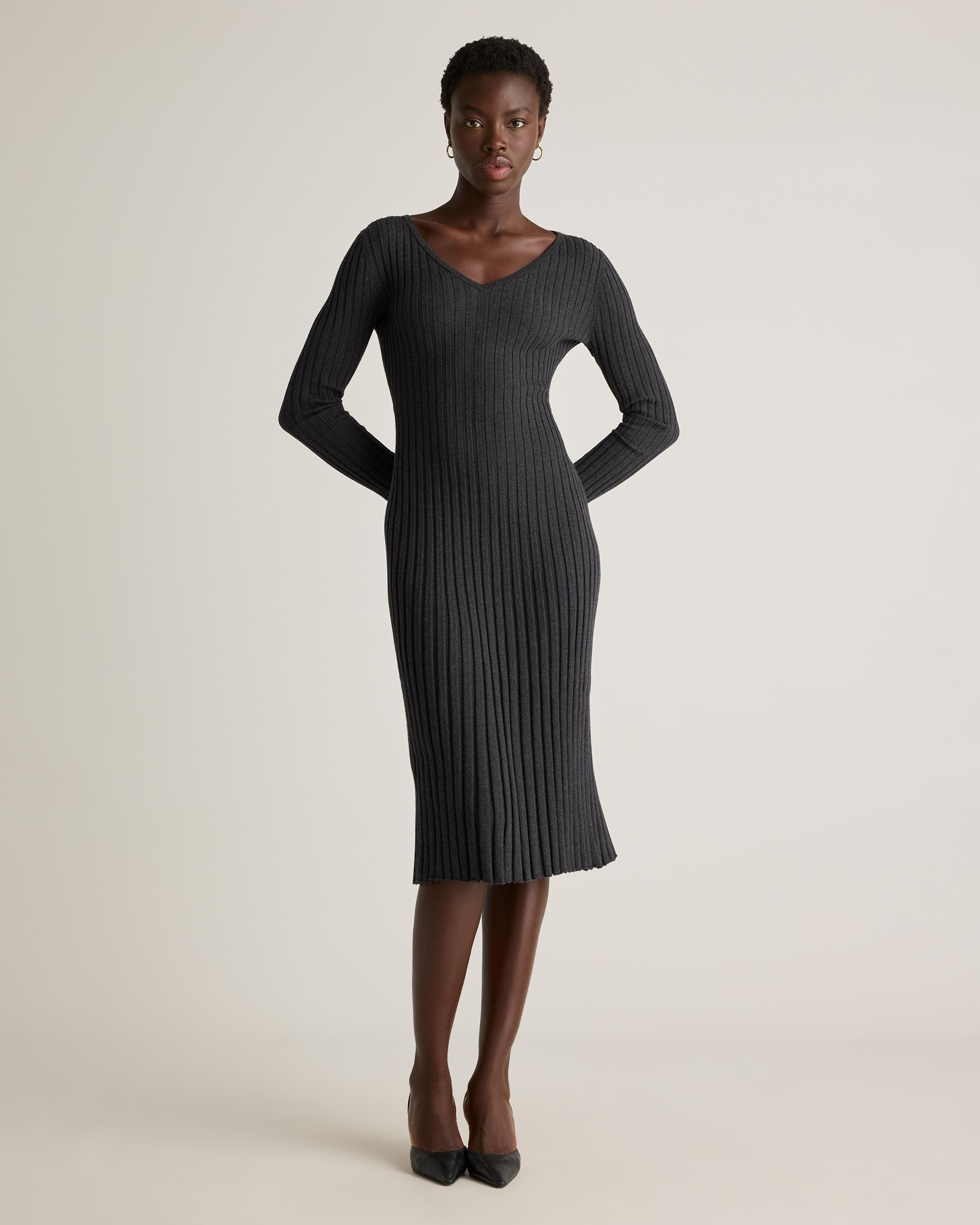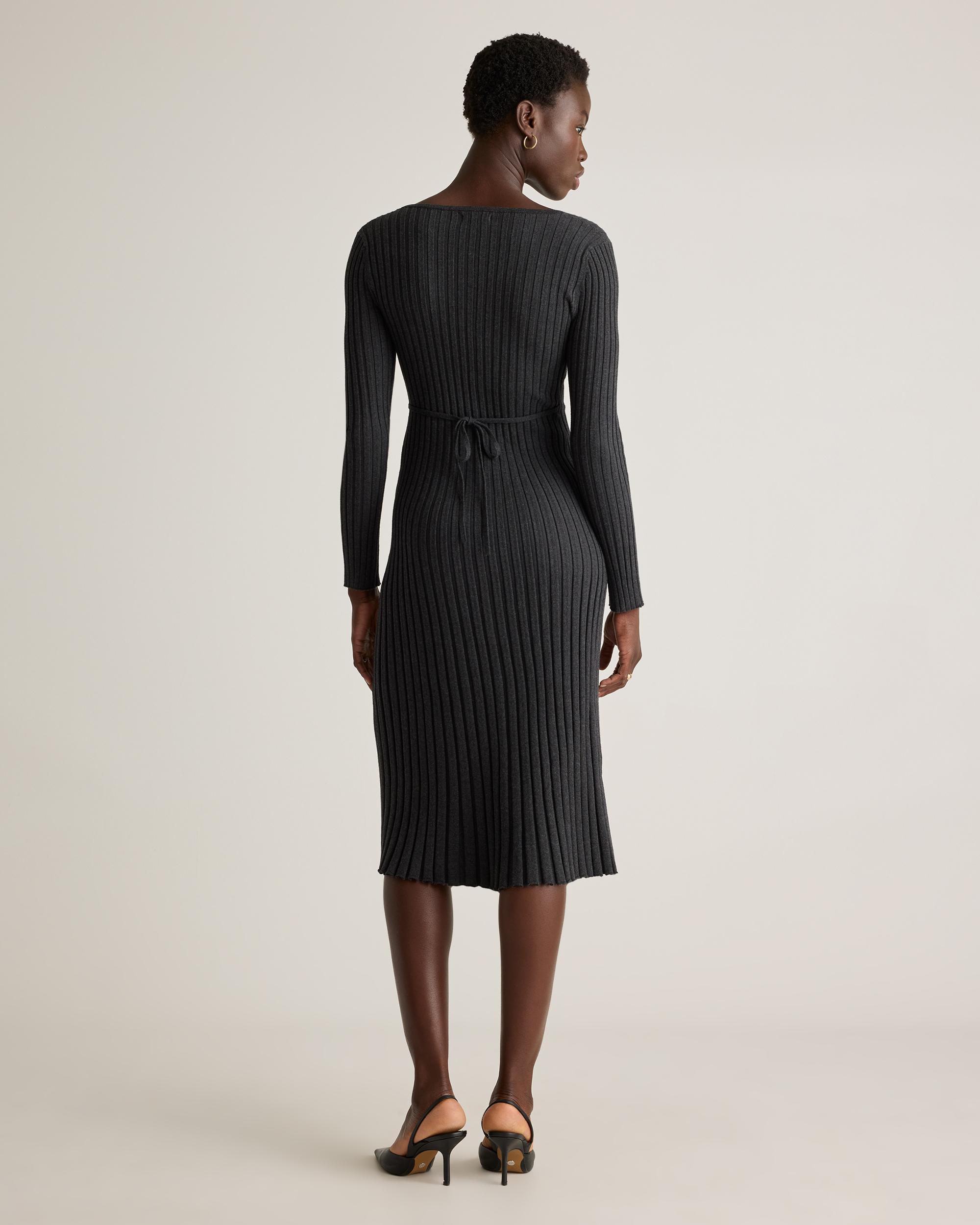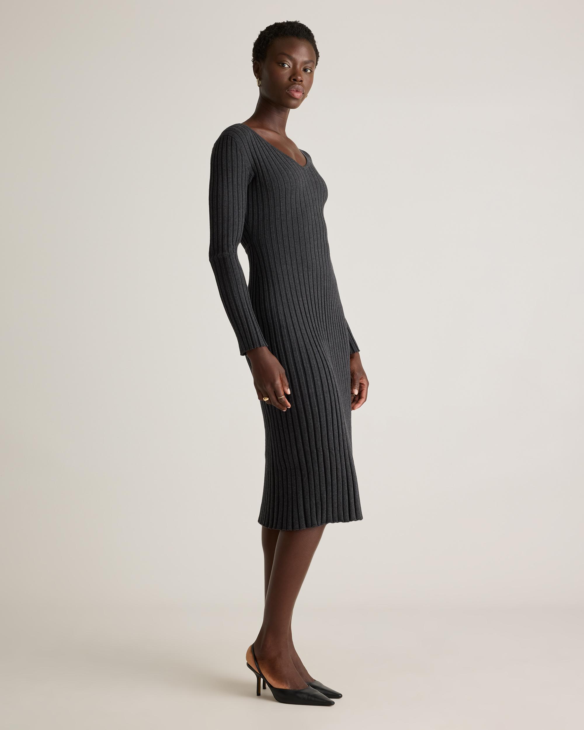 Everyday luxury is a thing—and our Cotton Cashmere Ribbed Long Sleeve V-Neck Midi Dress is proof. This sweater dress does it all with a cotton-cashmere blend that's light and breathable, and a ribbed knit for touchable texture. The adjustable tie means a custom-feeling fit. | Quince | Women's Cotton Cashmere Ribbed Long Sleeve V-Neck Midi Dress in Heather Charcoal, Size Large
