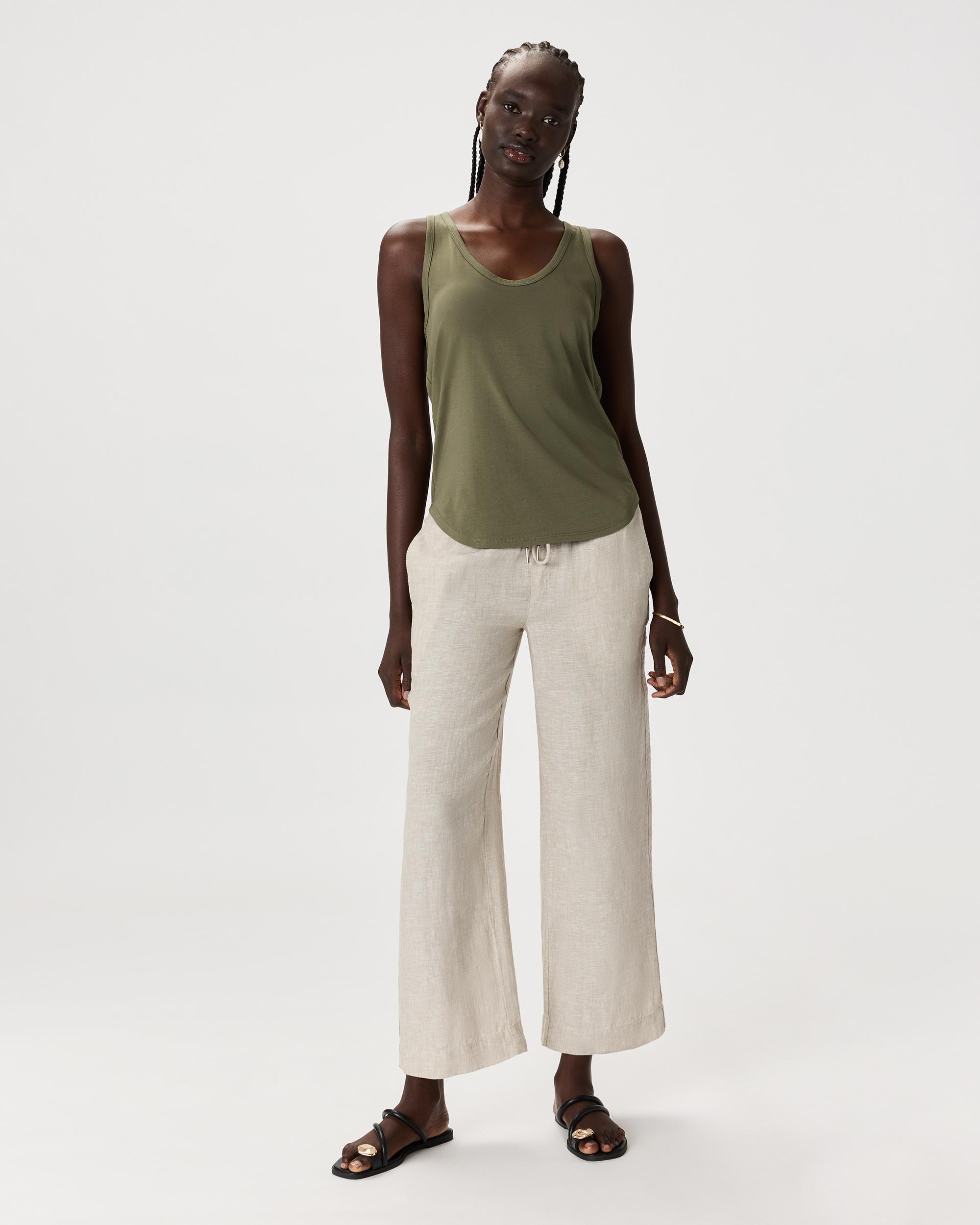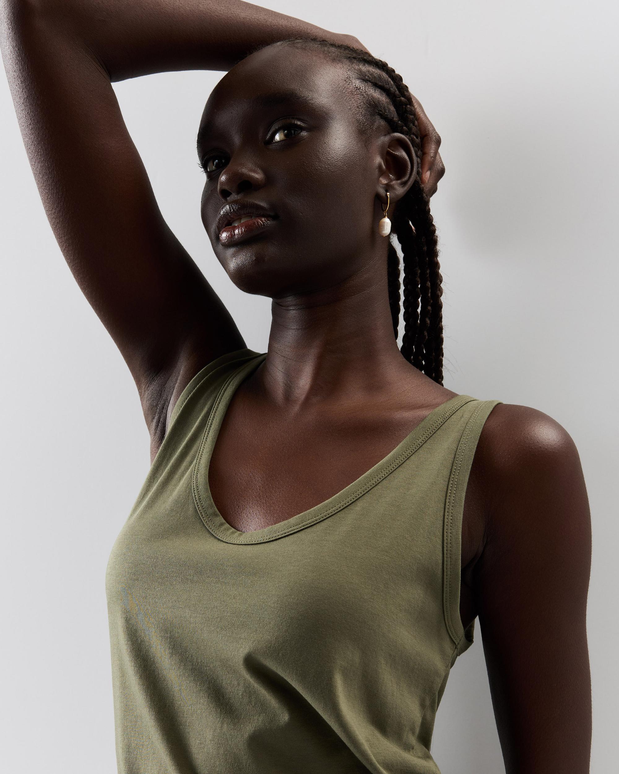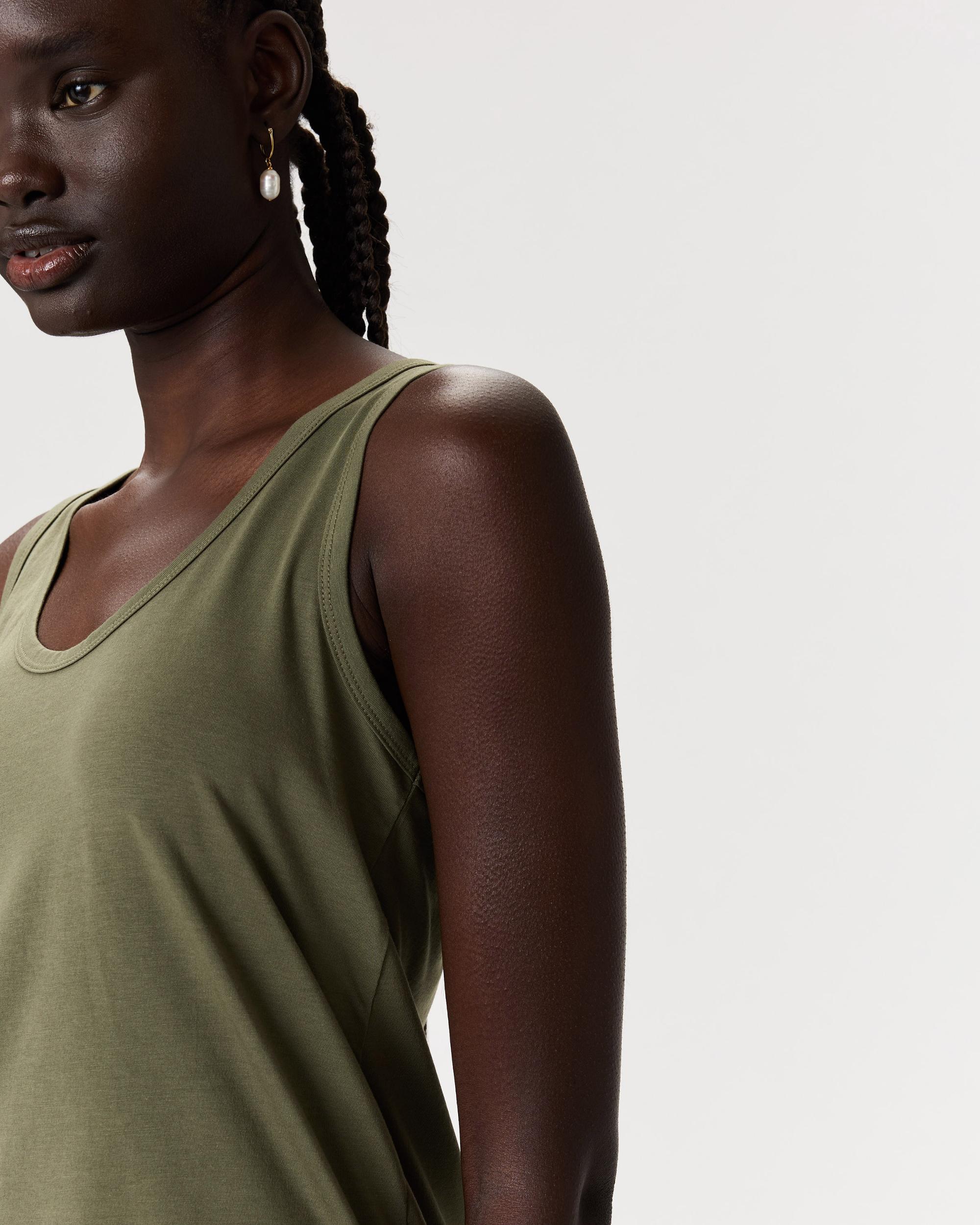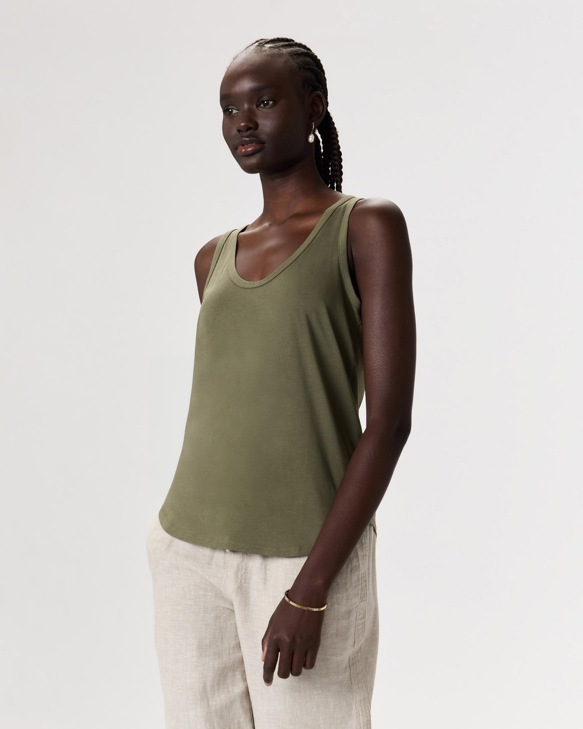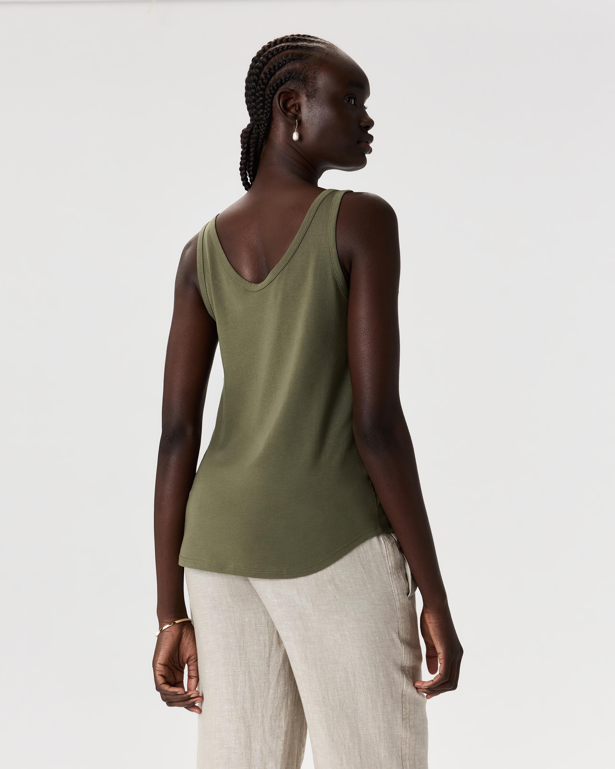 A layering essential in a rounded V-neck style. This tank is made from a super soft and stretchy cotton blend that's wrinkle-resistant and has a smooth finish. Also: bra-friendly straps and a curved hem for the win. | Quince | Women's Cotton Modal Double Scoop Neck Tank Top in Dark Olive, Size XS, Cotton/Modal