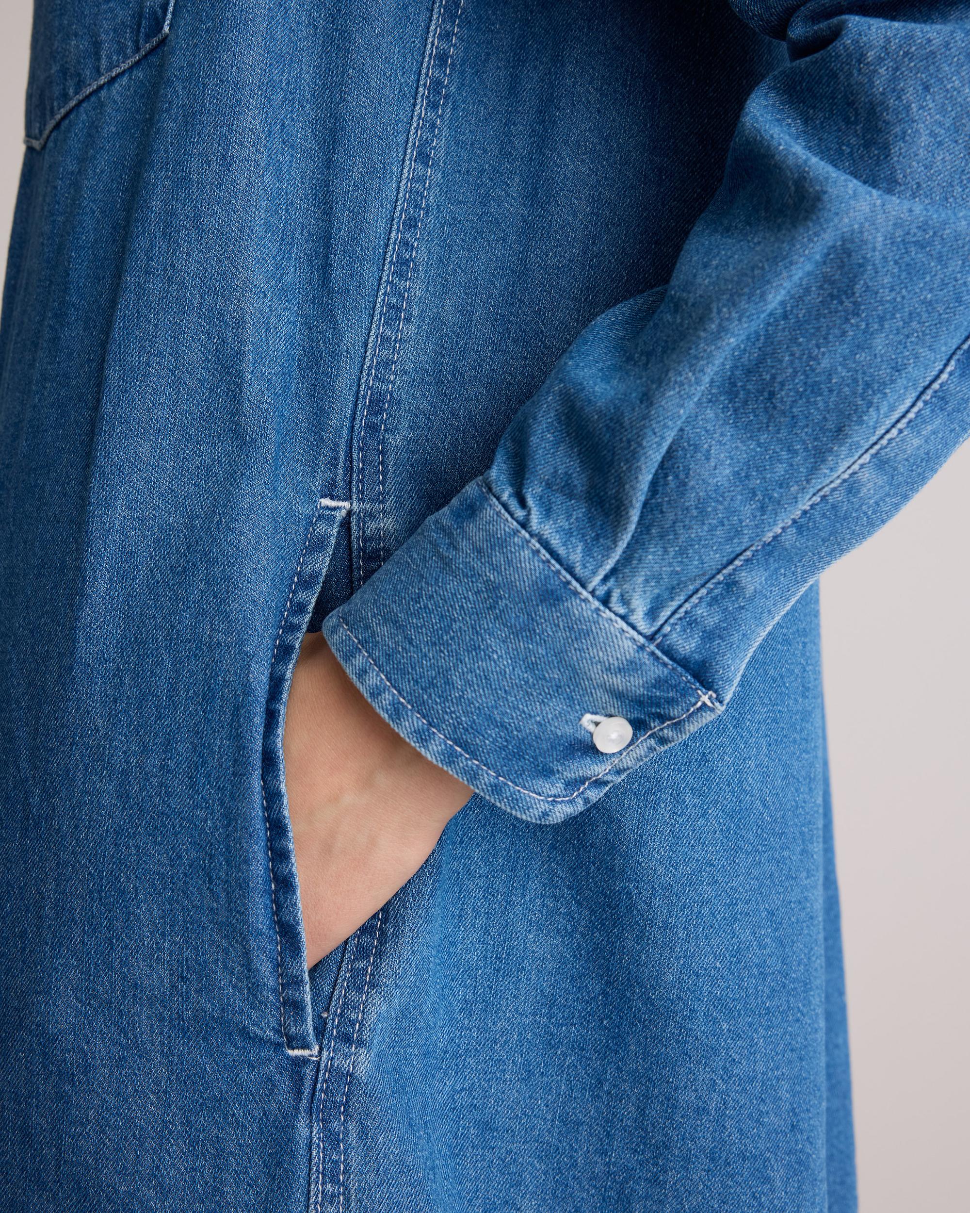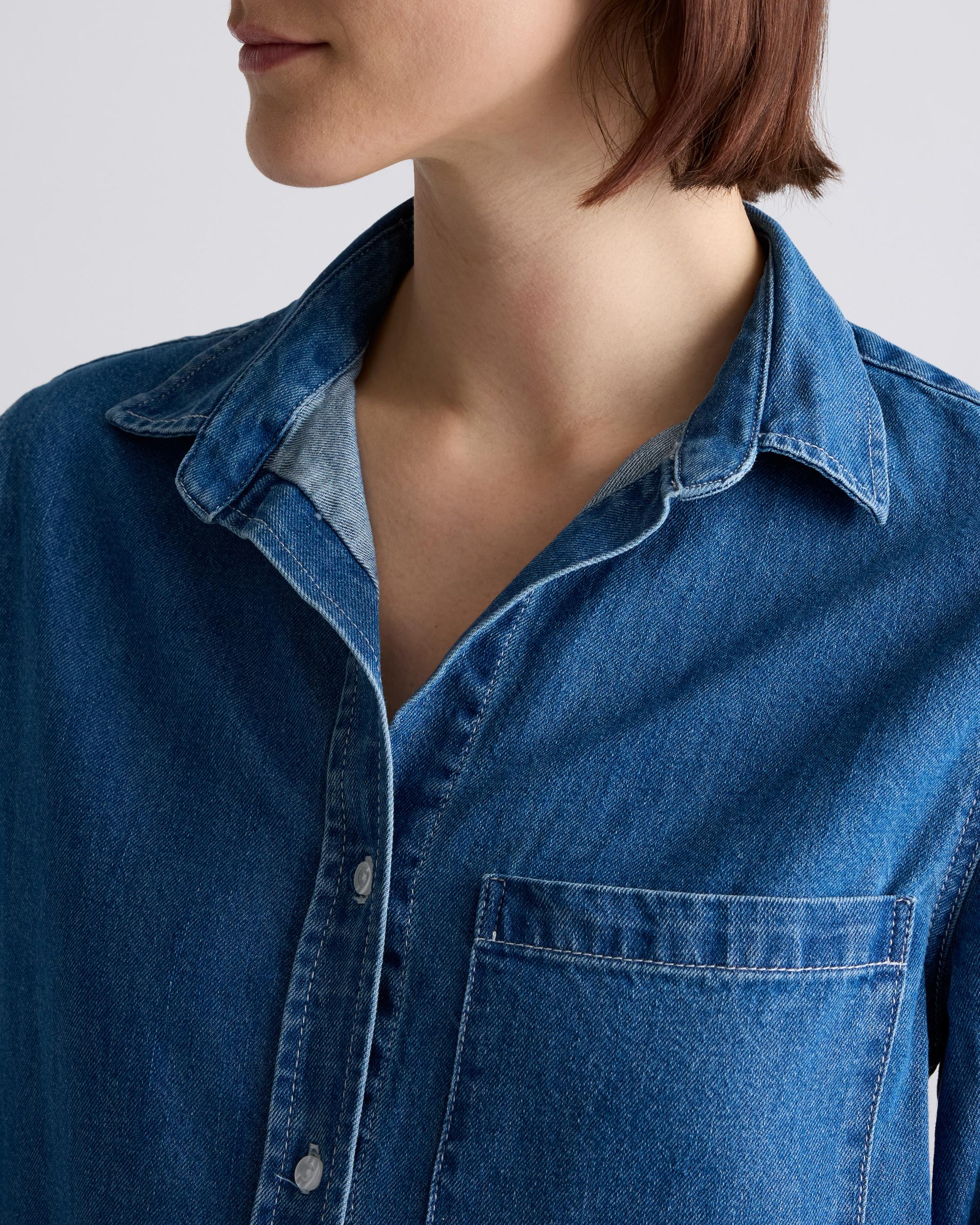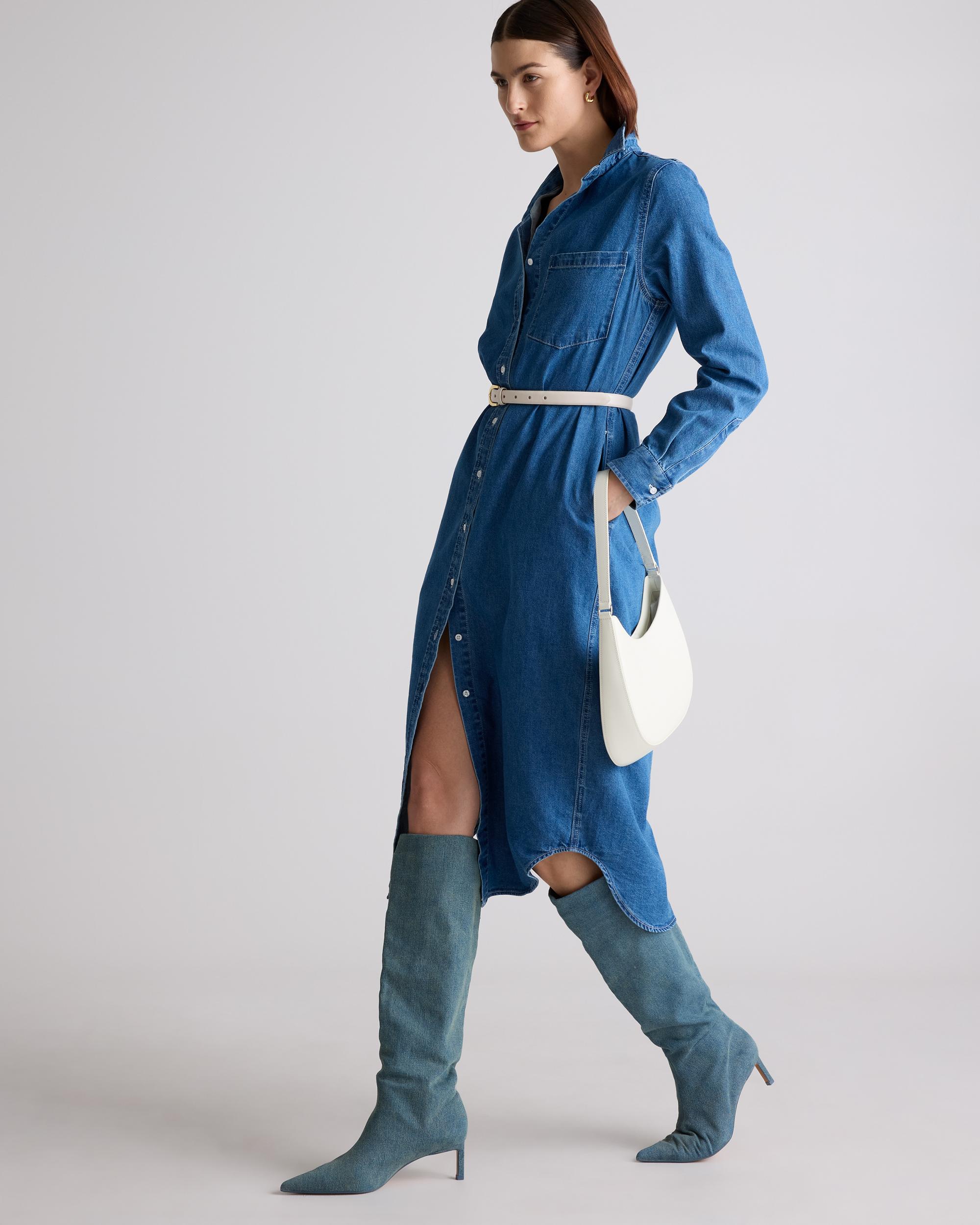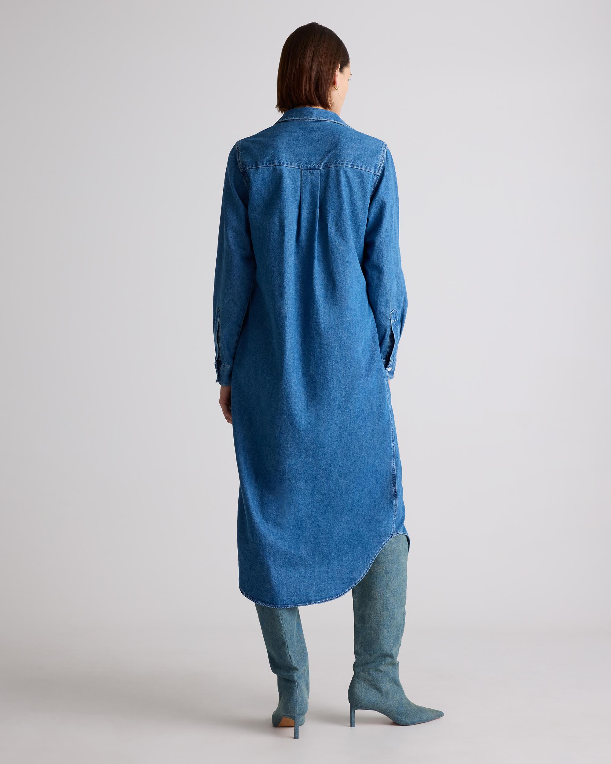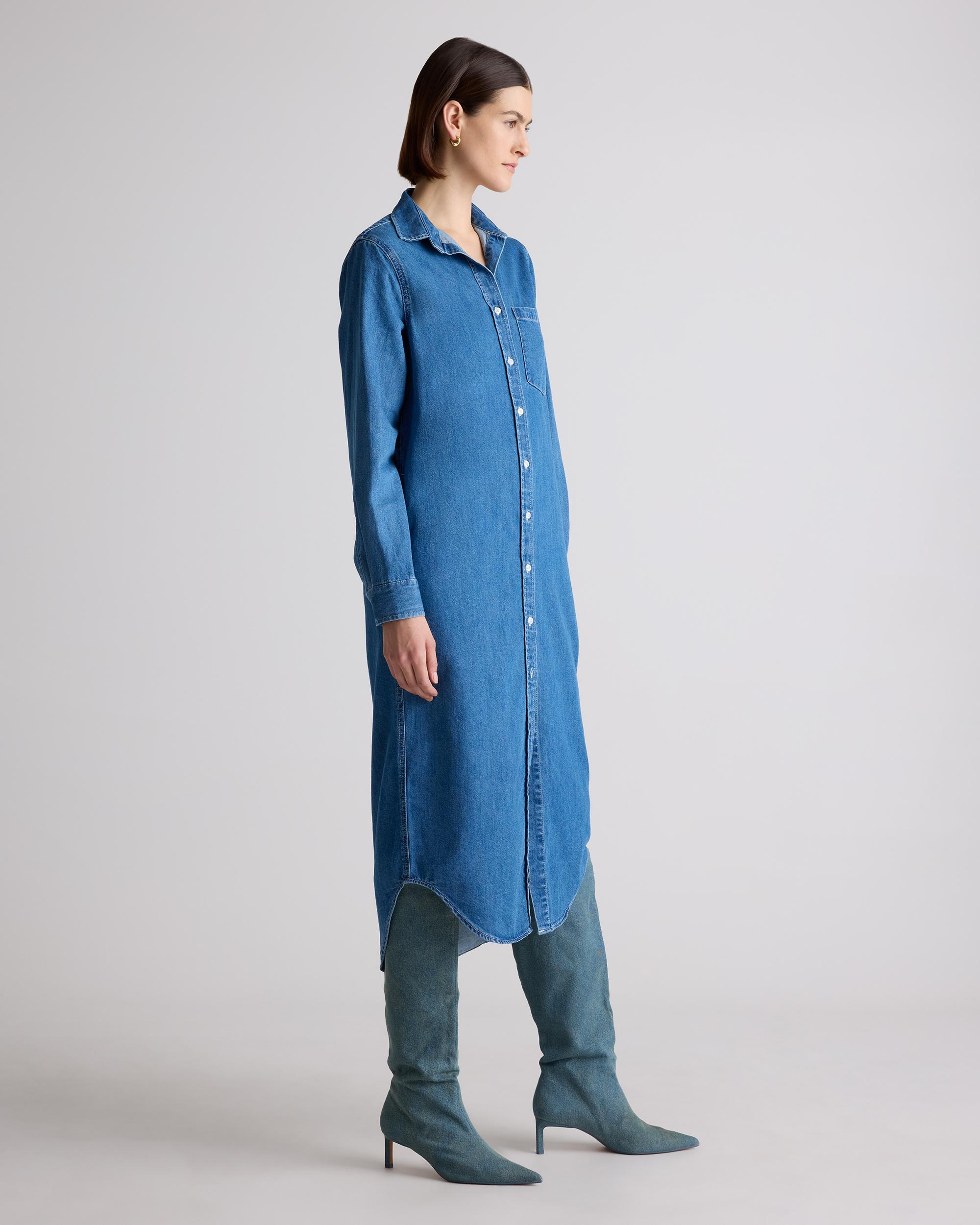 Made from soft yet durable denim, our Distressed Denim Maxi Shirt Dress is a bold twist on a classic silhouette. Featuring a classic button-down front, long sleeves with button cuffs, functional pockets, and a flattering maxi length that effortlessly drapes over the body, this dress offers a relaxed yet refined look. Whether you're dressing it up with heels and accessories or keeping it casual with sneakers or sandals, this versatile dress can be styled in countless ways for both day-to-night wear. | Quince | Women's Distressed Denim Maxi Shirt Dress in Medium Indigo, Size Small, Cotton