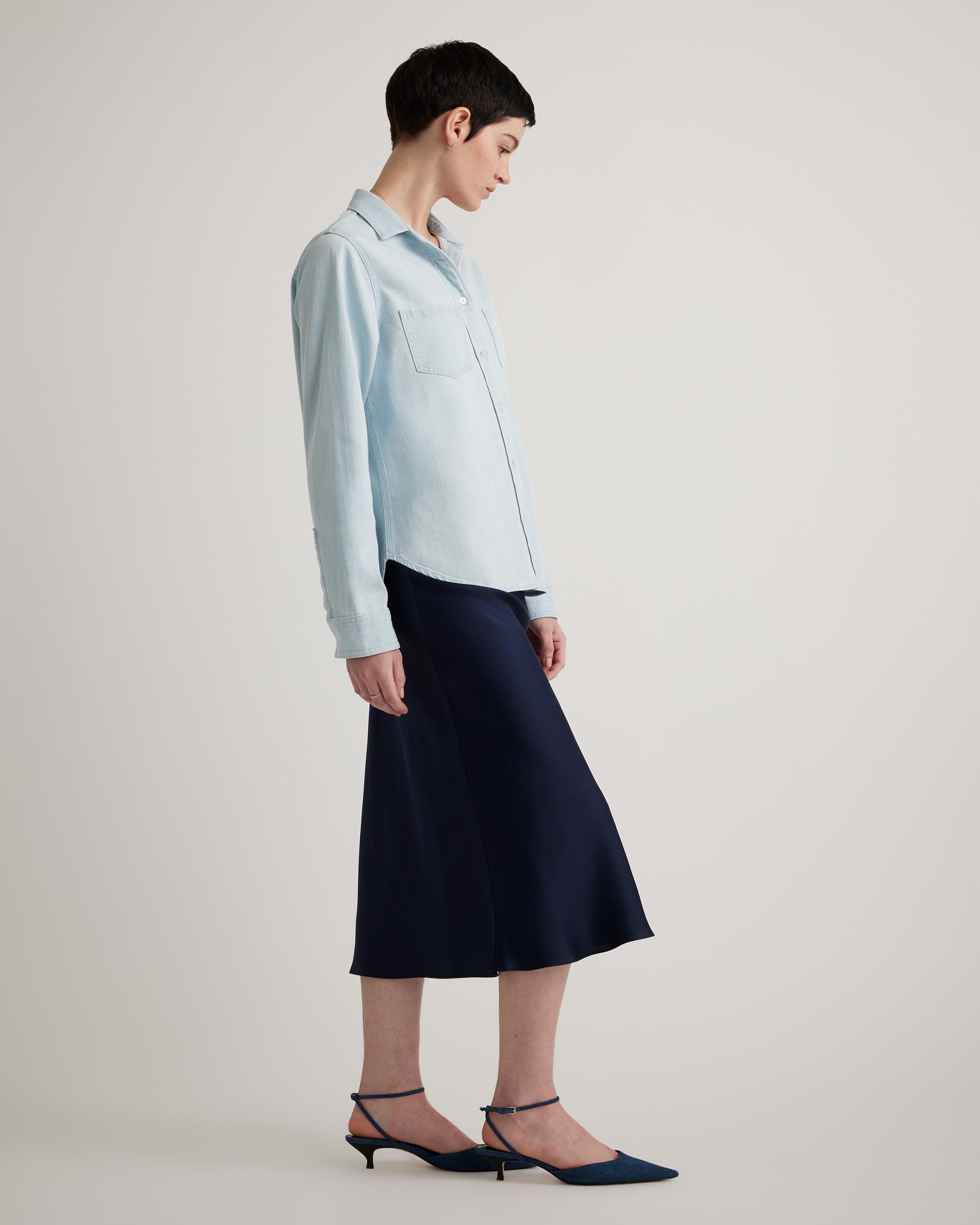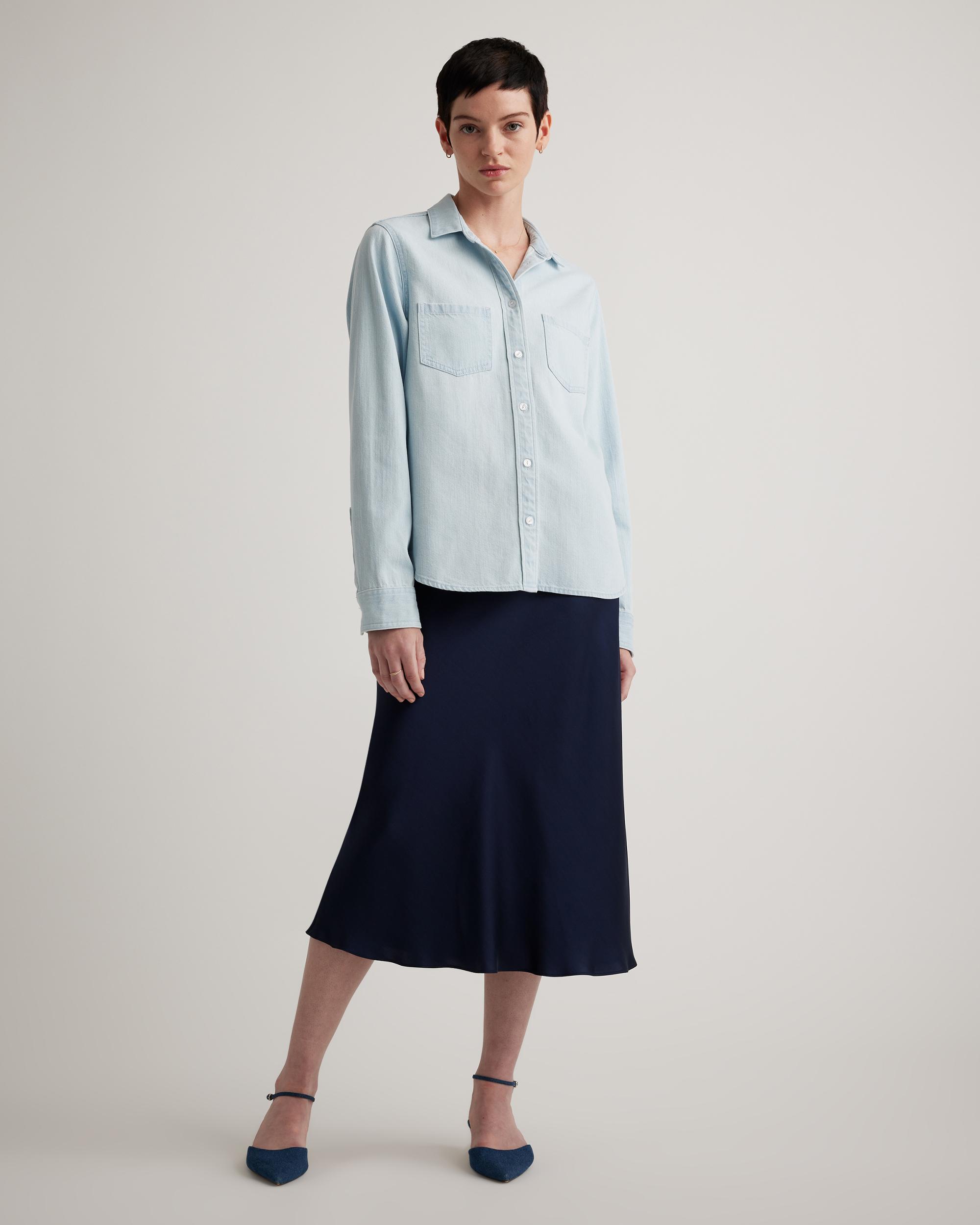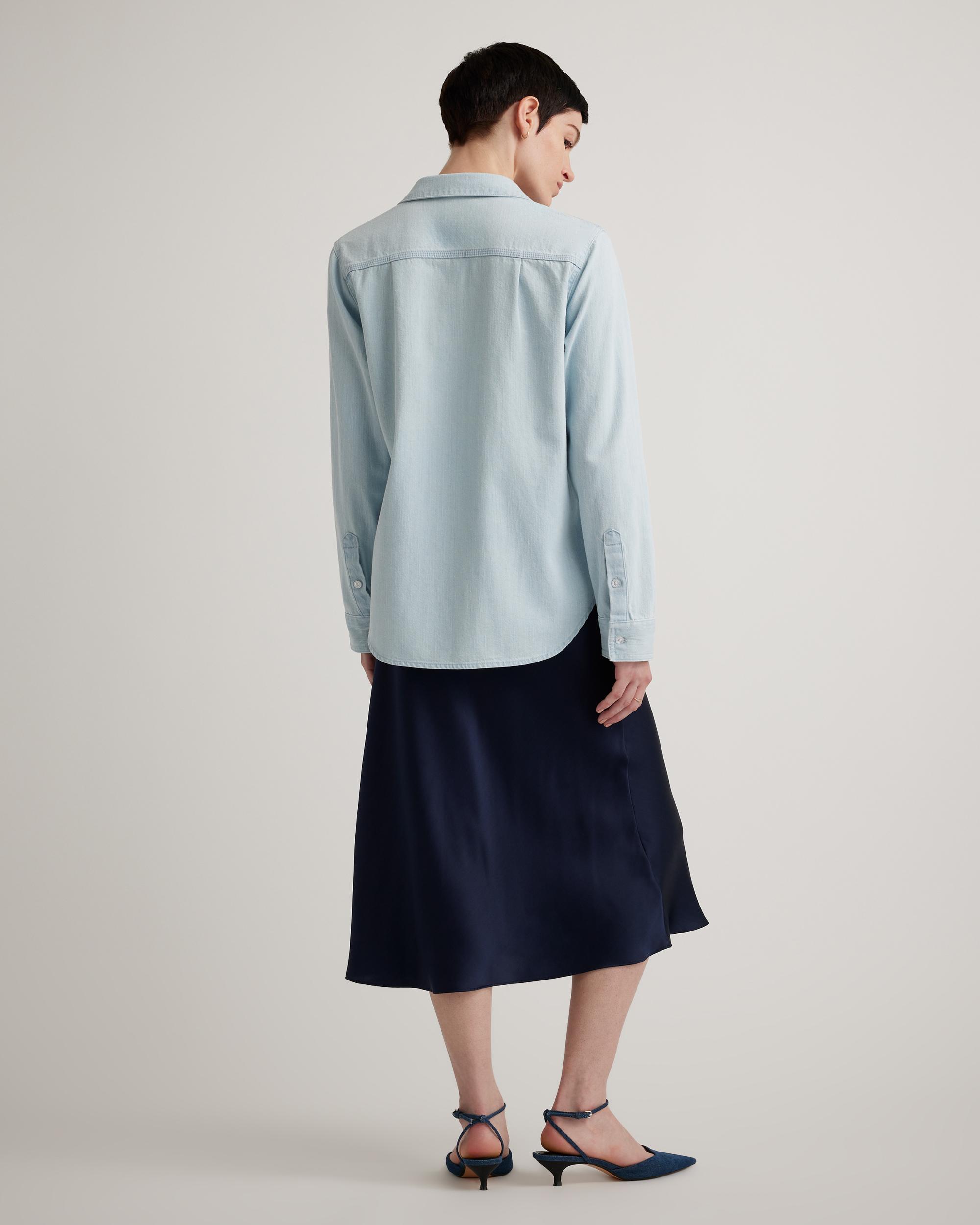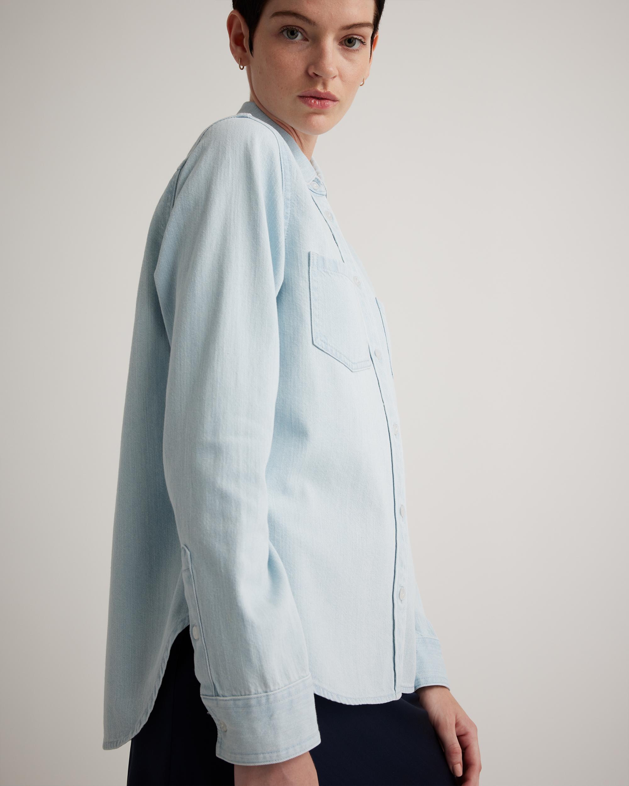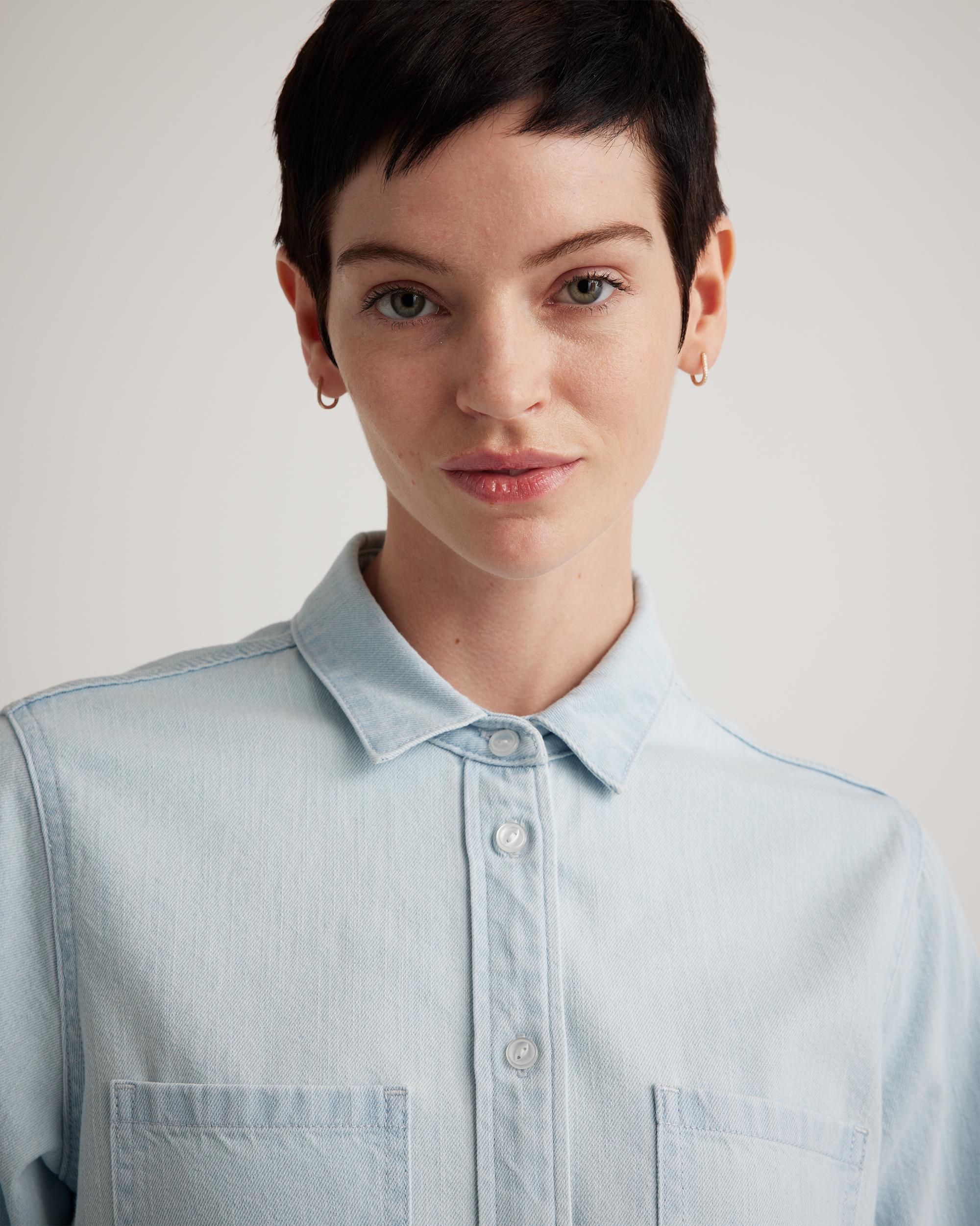 Roll up, roll up. Our denim shirt will have you looking relaxed but ready for anything. As comfy as it is stylish, this classic is made of soft, 100% cotton denim with roll-up sleeves, two front pockets, and darted back for more shape. The tulip sides give a bit of feminine curve and the distressed wash provides extra texture. | Quince | Women's Distressed Denim Shirt in Light Chambray, Size XS, Cotton