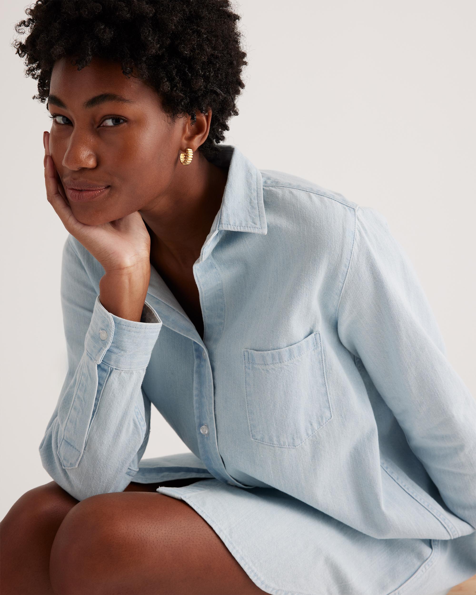 It's the versatility and comfiness of your favorite broken-in jeans, but in our Distressed Denim Shirt Dress. Style it sporty with sneakers and a baseball cap or dress it up with shimmery extras from head to toe—either way, you'll wear this one way more often than you think. | Quince | Women's Distressed Denim Shirt Dress in Light Chambray, Size Large, Cotton