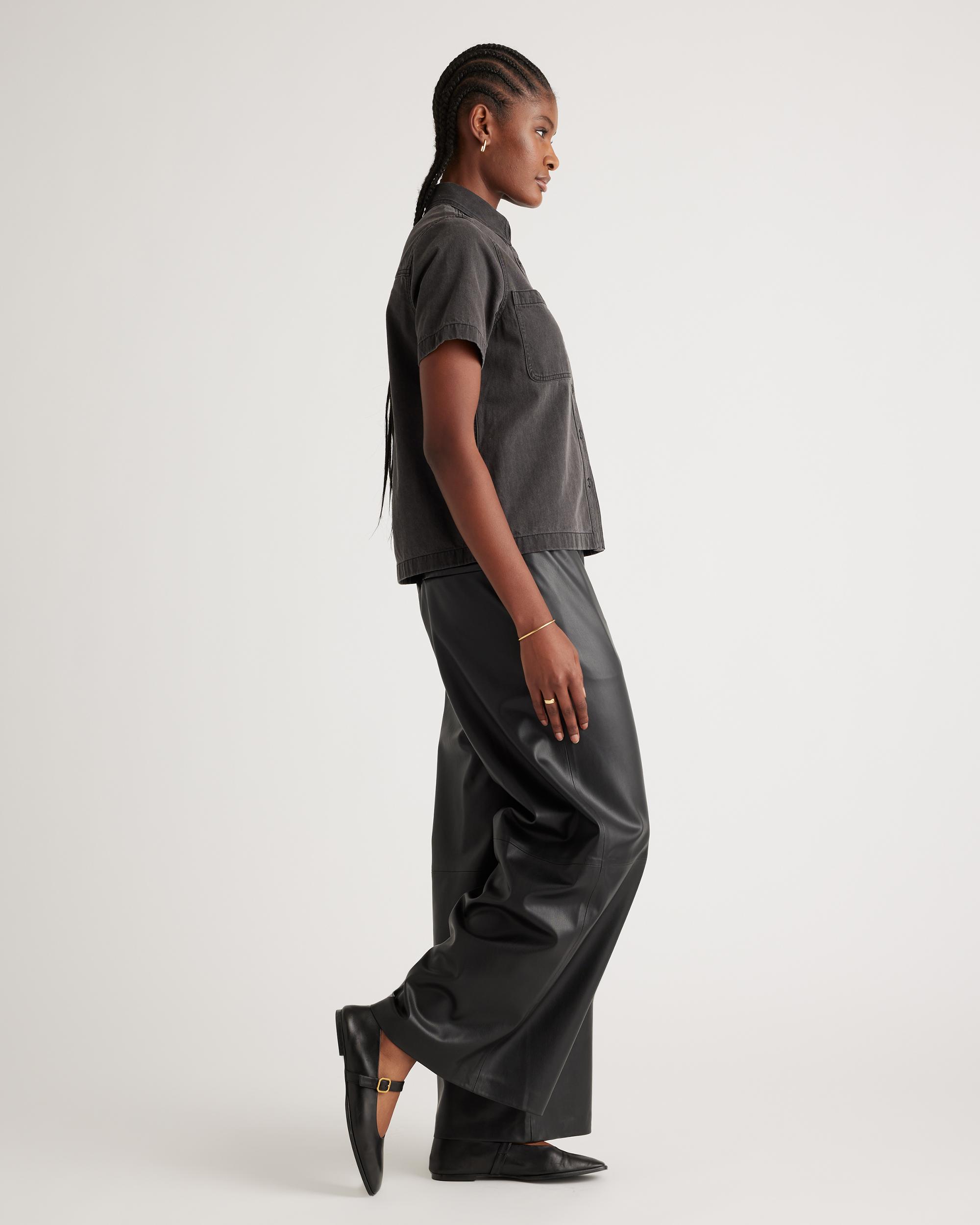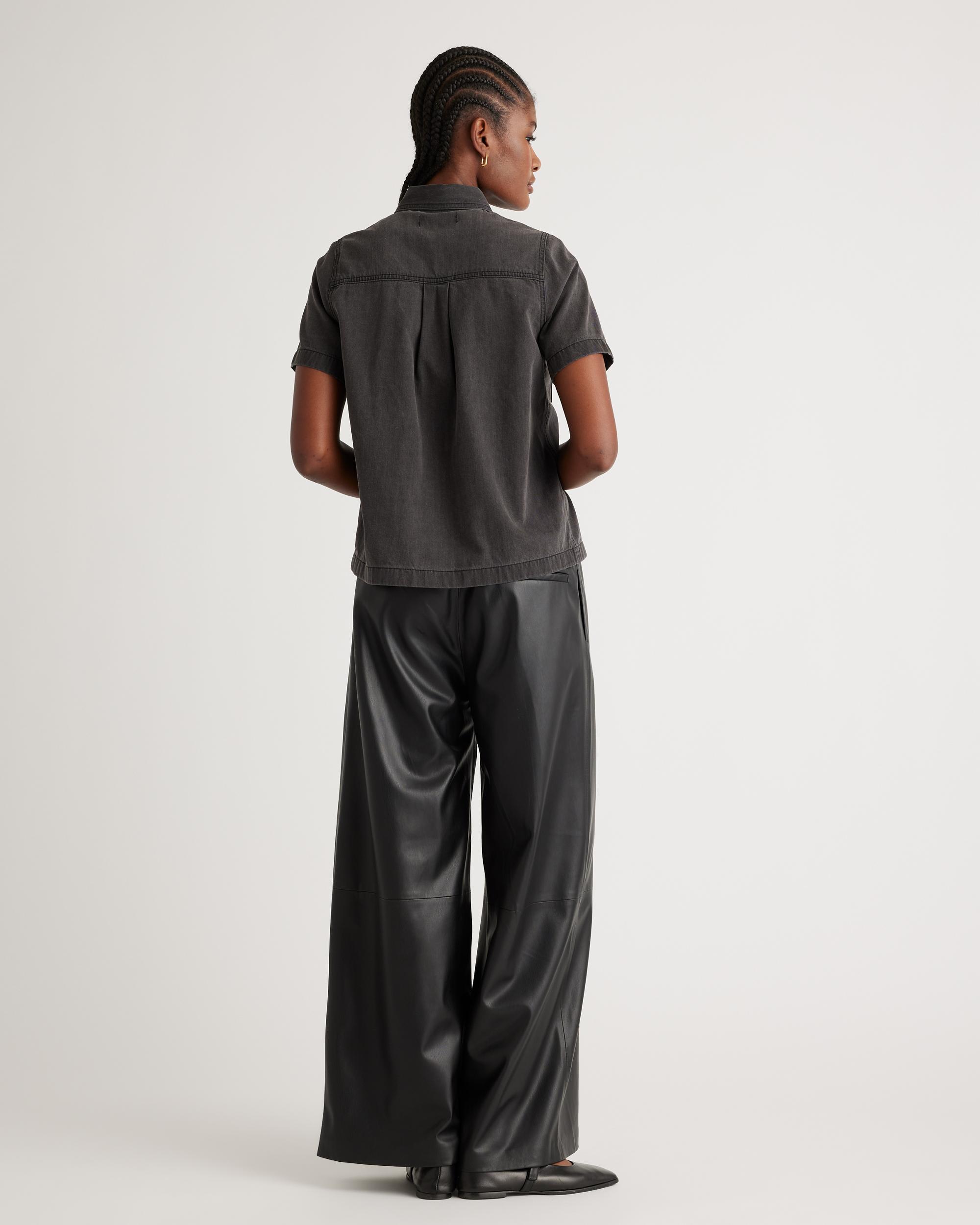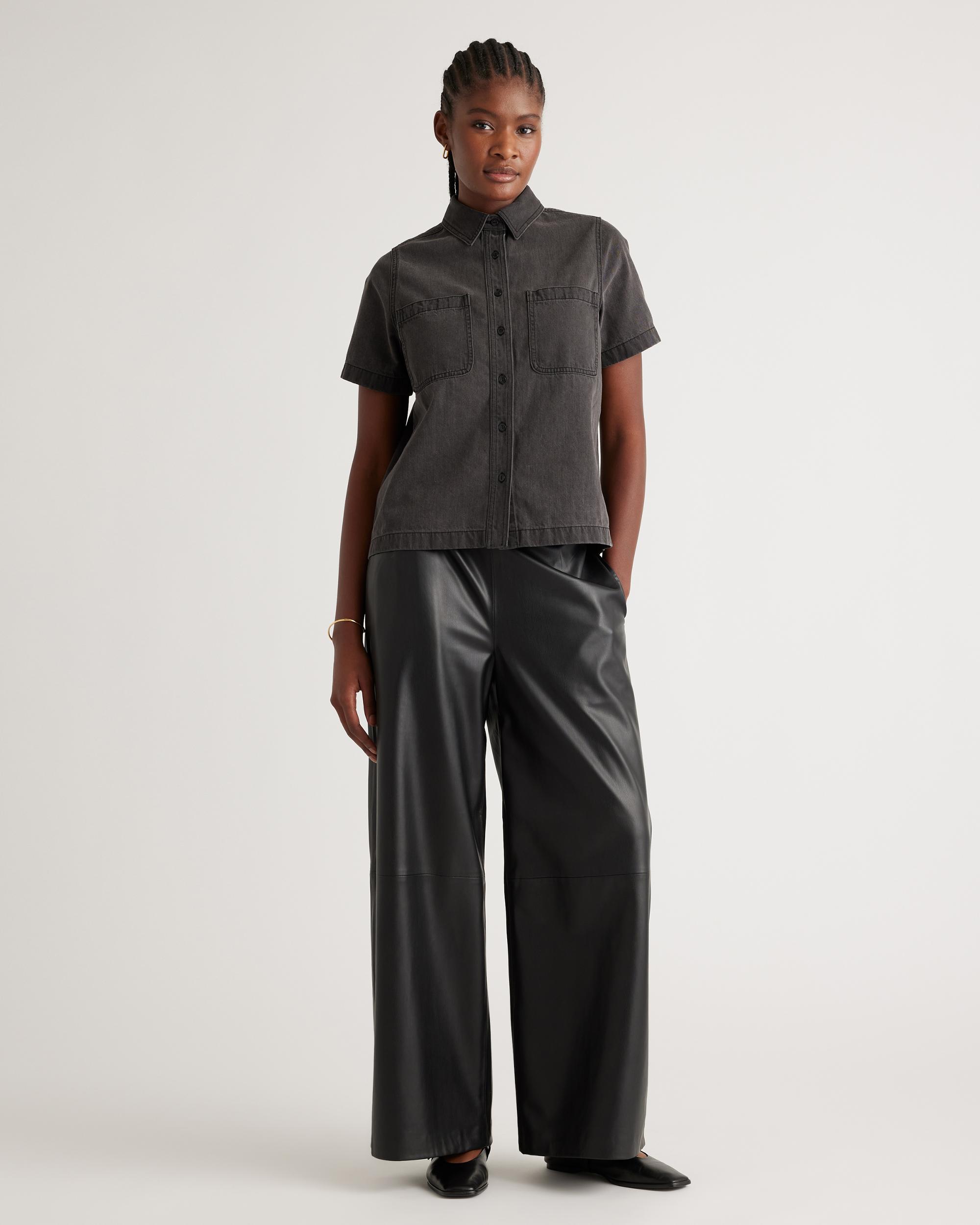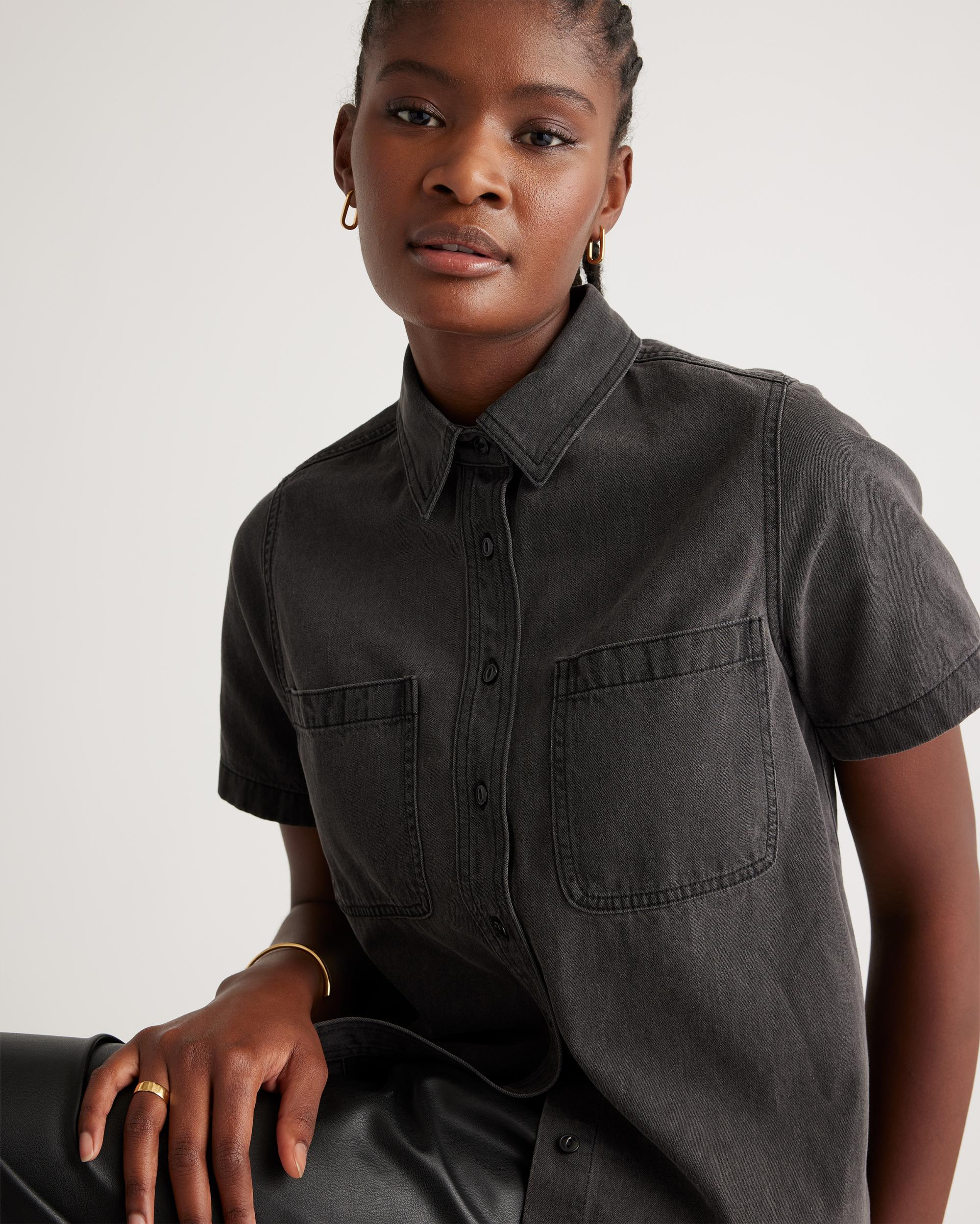 When easy does it, you need this Distressed Denim Short Sleeve Shirt. A total classic, it features a full button front, chest pockets, and a subtly distressed wash. The boxy fit feels like a modern update and looks amazing over figure-skimming skirts and pants. | Quince | Women's Distressed Denim Short Sleeve Shirt in Washed Black, Size Medium, Cotton