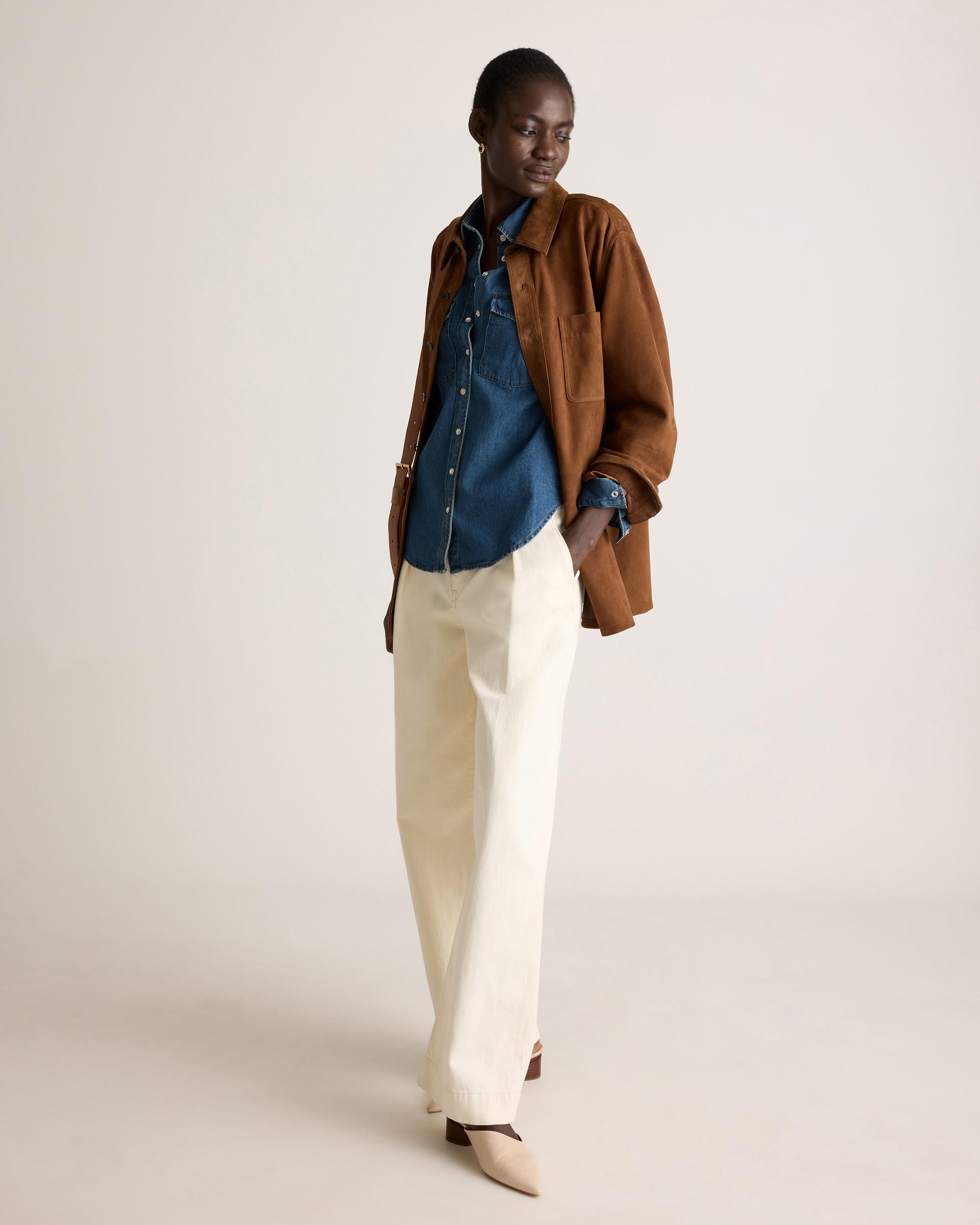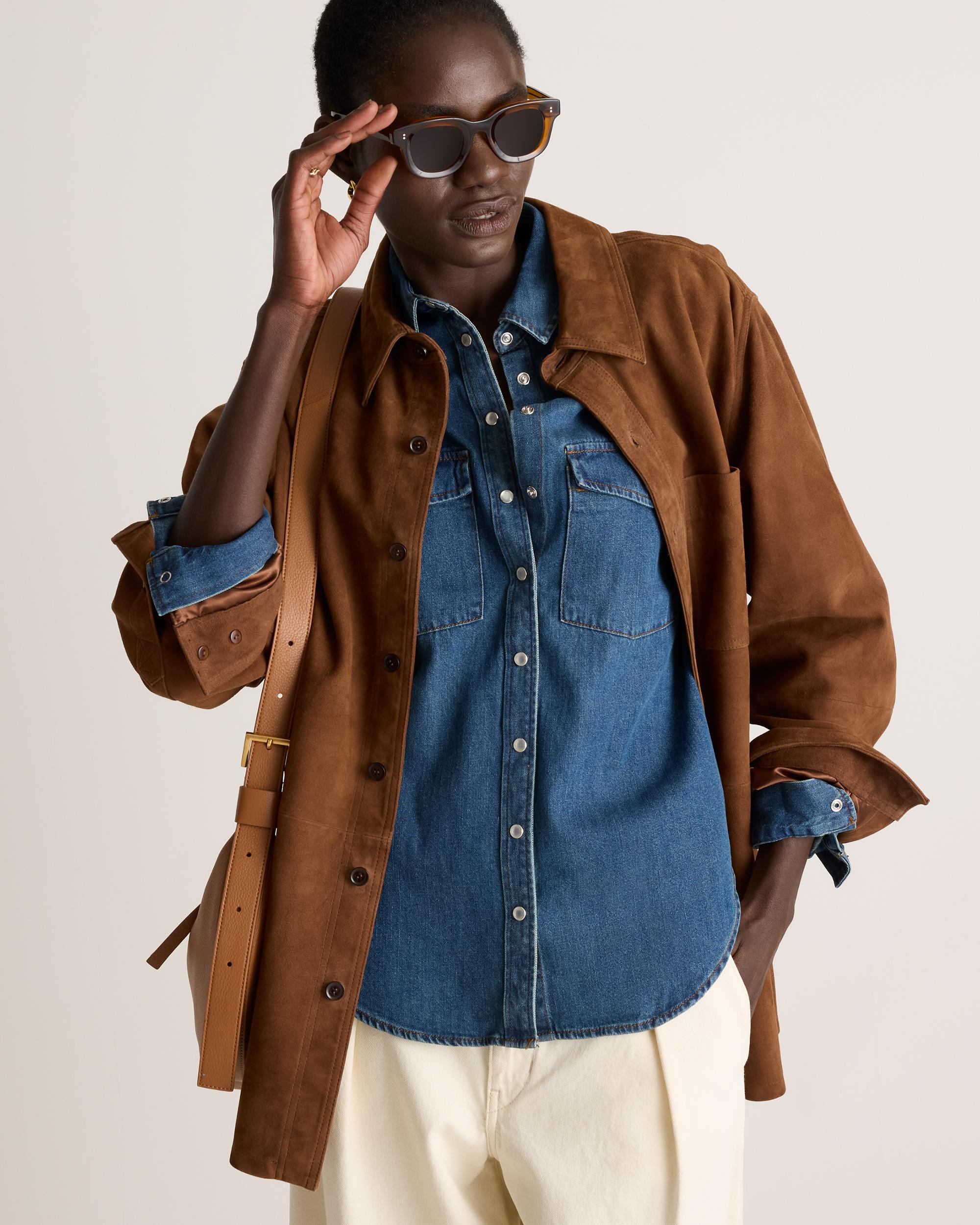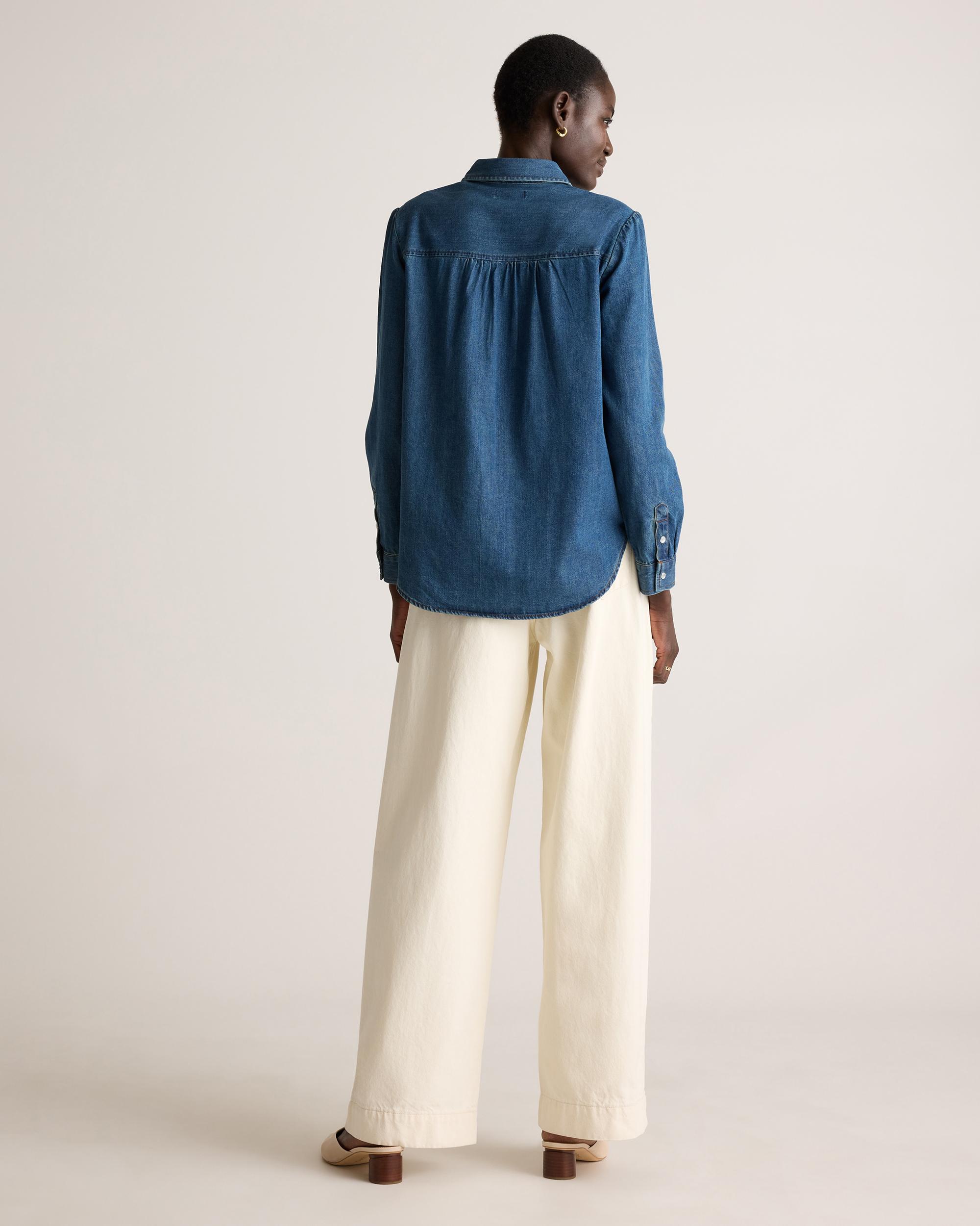 Upgrade your classic staple with our Distressed Denim Western Shirt. Designed to seamlessly blend everyday style with vintage charm, this wardrobe essential features a classic western cut with a relaxed fit that ensures all-day comfort. Pearlescent snap buttons, pointed yokes, and chest pockets tip their hat to classic western vibes, keeping things modern and oh-so-wearable. | Quince | Women's Distressed Denim Western Shirt in Dark Indigo, Size XL, Cotton