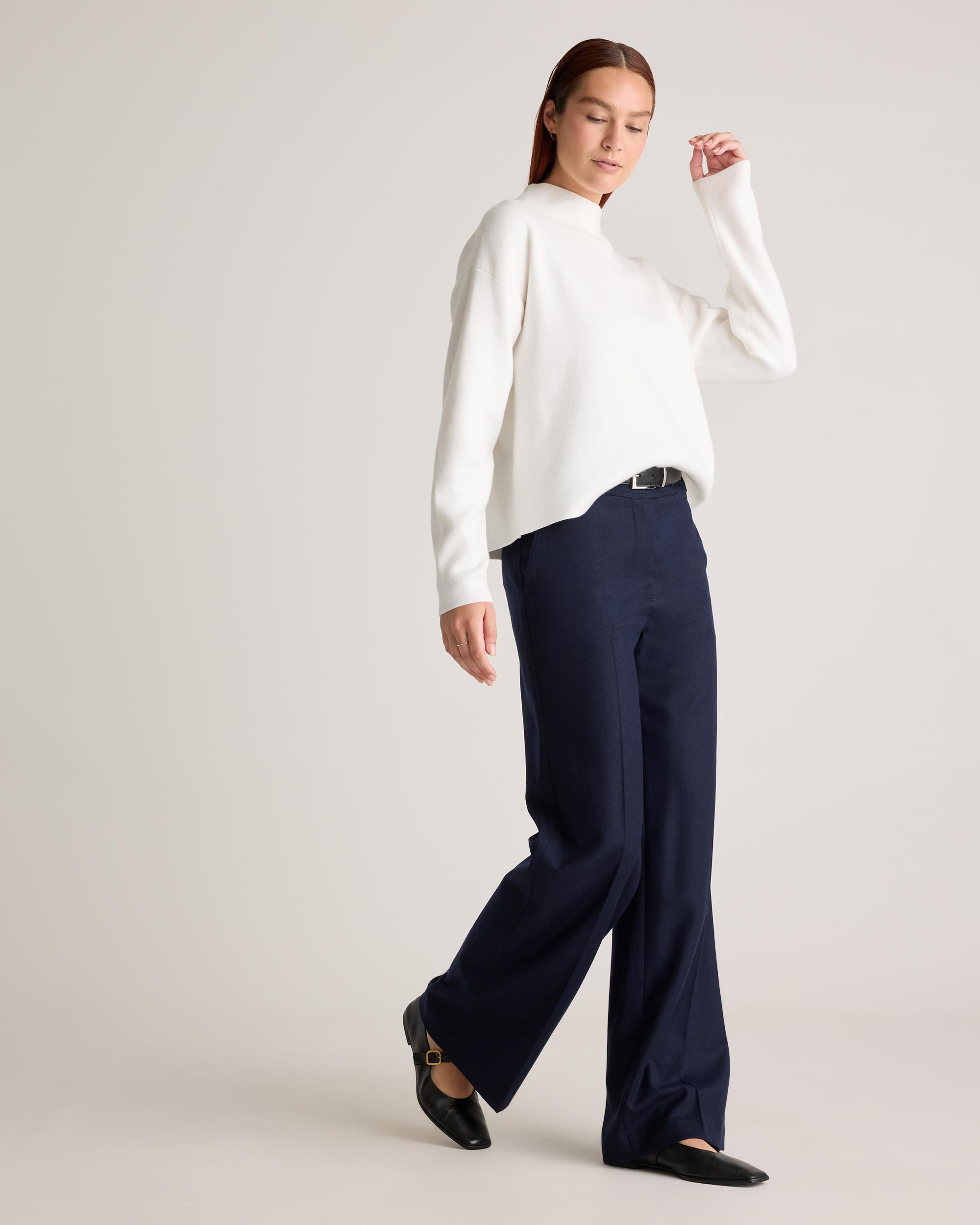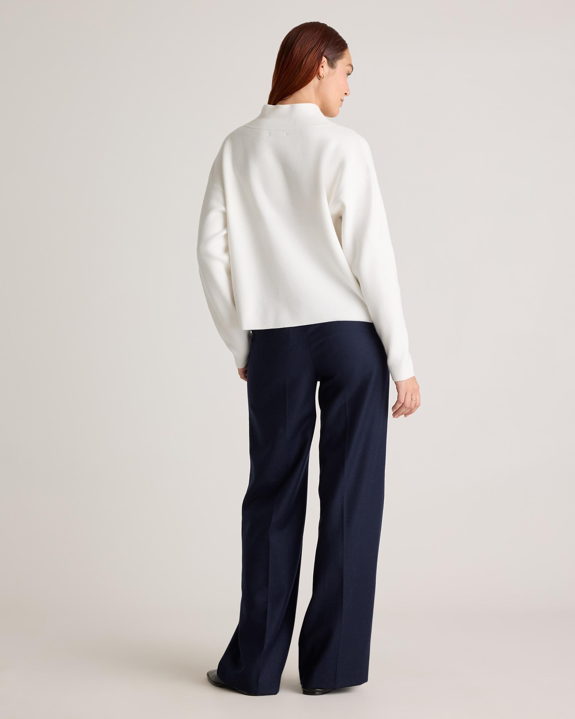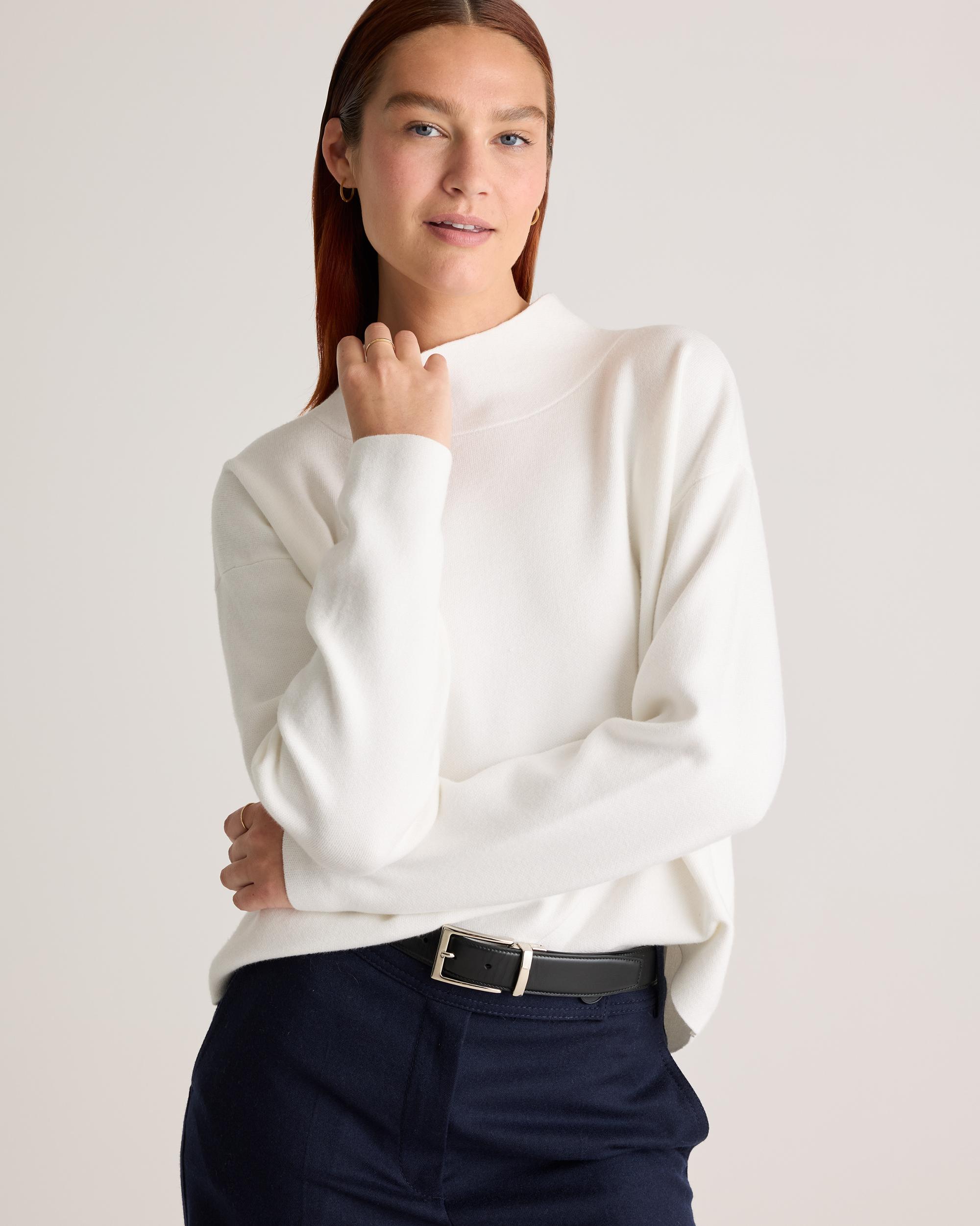 Elevate your style with our eco-friendly Eco-Knit Milano Stitch Mock Neck Pullover. Carefully crafted with Lenzing Ecovero™, this sustainable pullover boasts a sleek mock neck design. It combines sophistication, comfort, and sustainability in one timeless piece. Choose fashion that aligns with your values and showcases your impeccable taste, whether you're strolling through the city or enjoying a cozy night out. | Quince | Women's Eco-Knit Milano Stitch Mock Neck Pullover in Ivory, Size Medium, Viscose