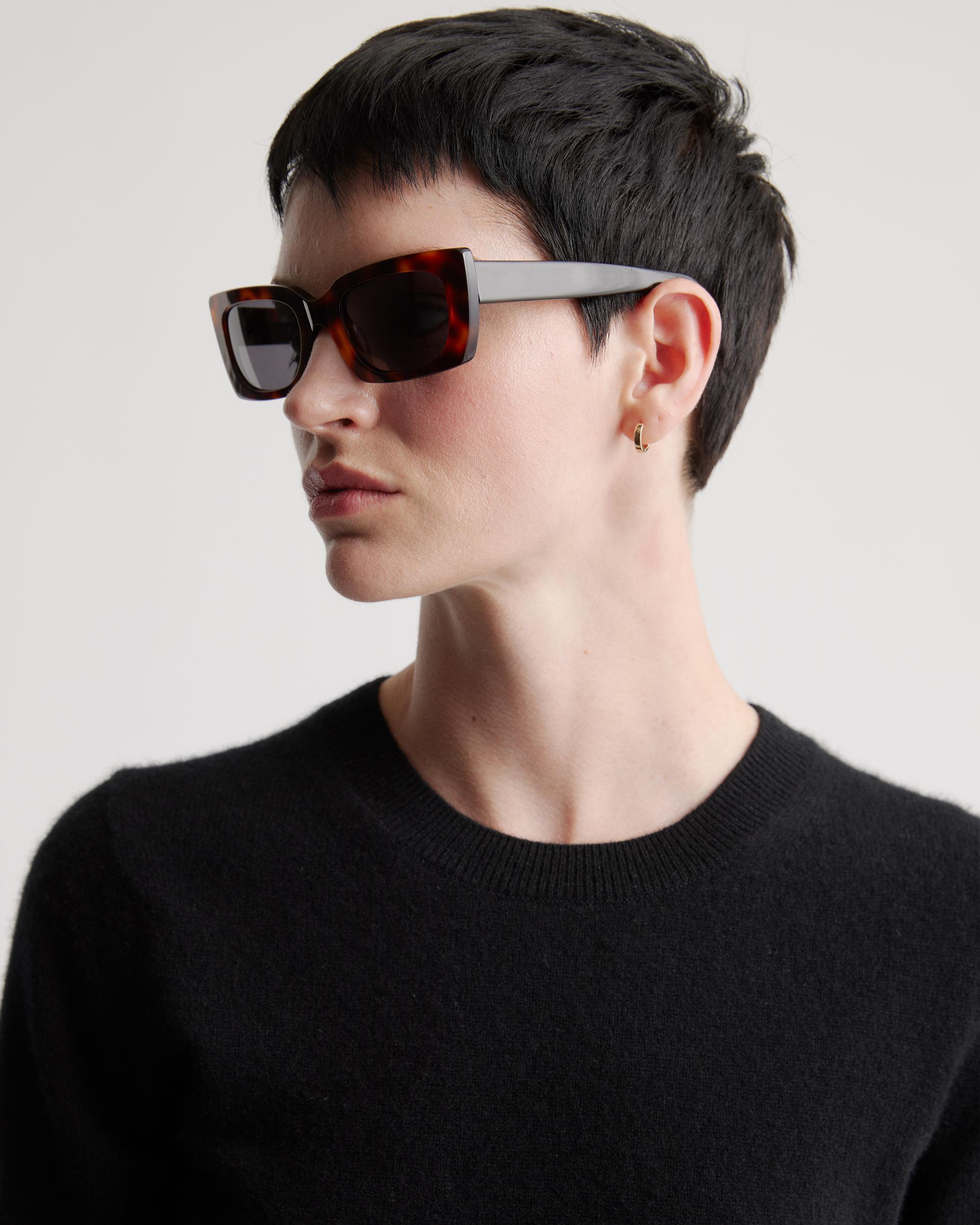 Work your angles with our Emmerson Polarized Acetate Sunglasses. These angled rectangular frames are classic yet edgy with an architectural point of view. They’re lightweight for all-day comfort, and because they’re polarized, they’ll protect your eyes from glare. Bonus: The acetate frames are a plant-based alternative to conventional plastics made from petroleum, so you can feel good about wearing them too. | Quince | Women's Emmerson Polarized Acetate Sunglasses in Ginger Tortoise with Grey Lens, Cellulose Acetate