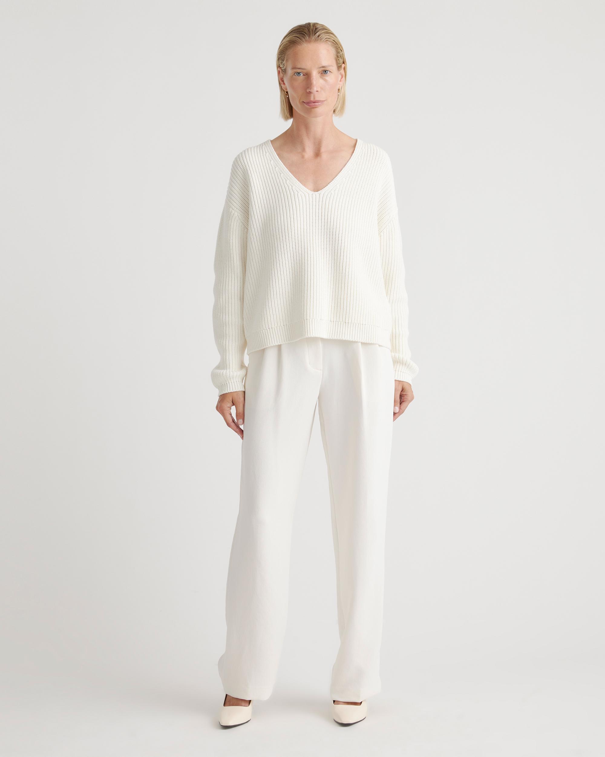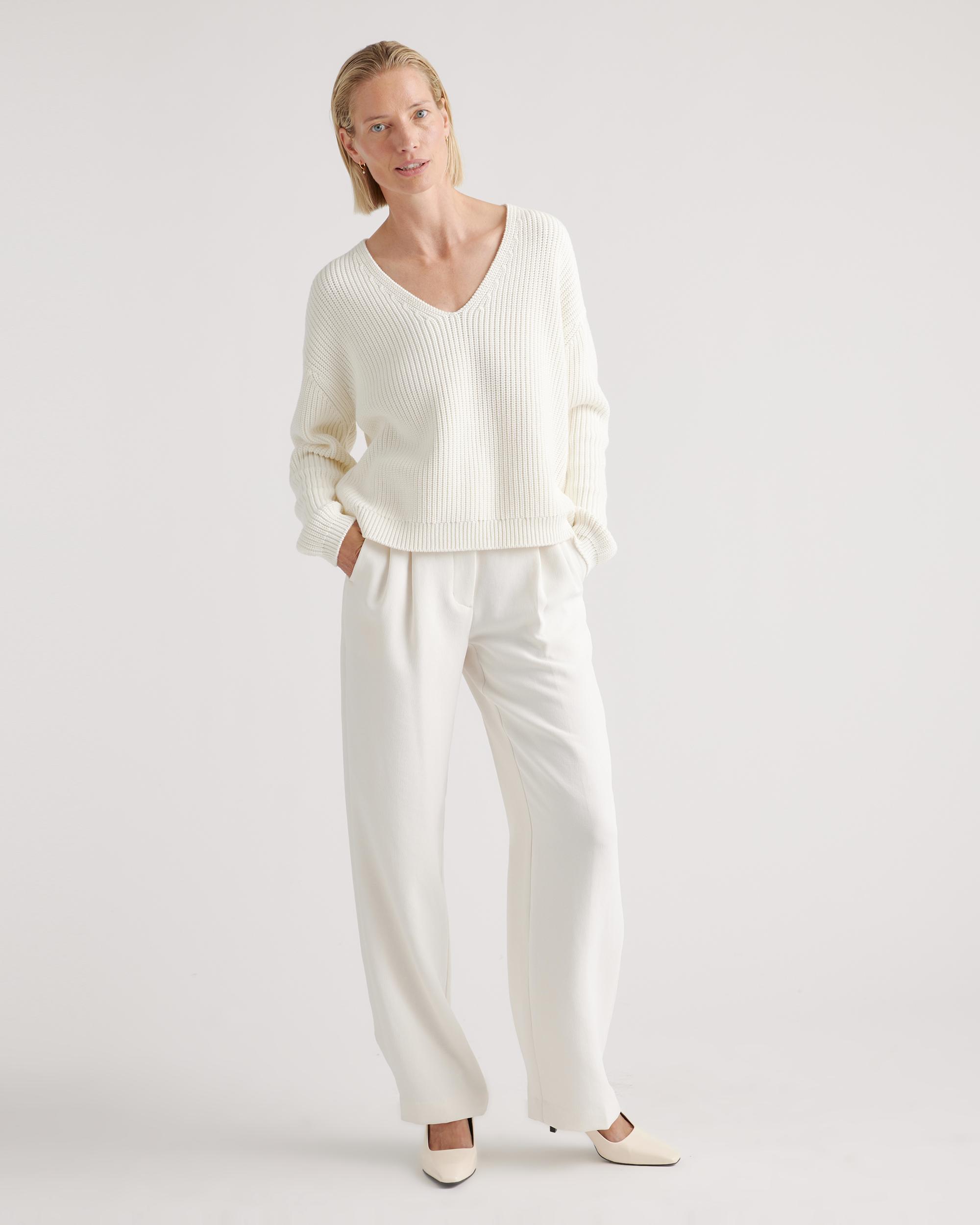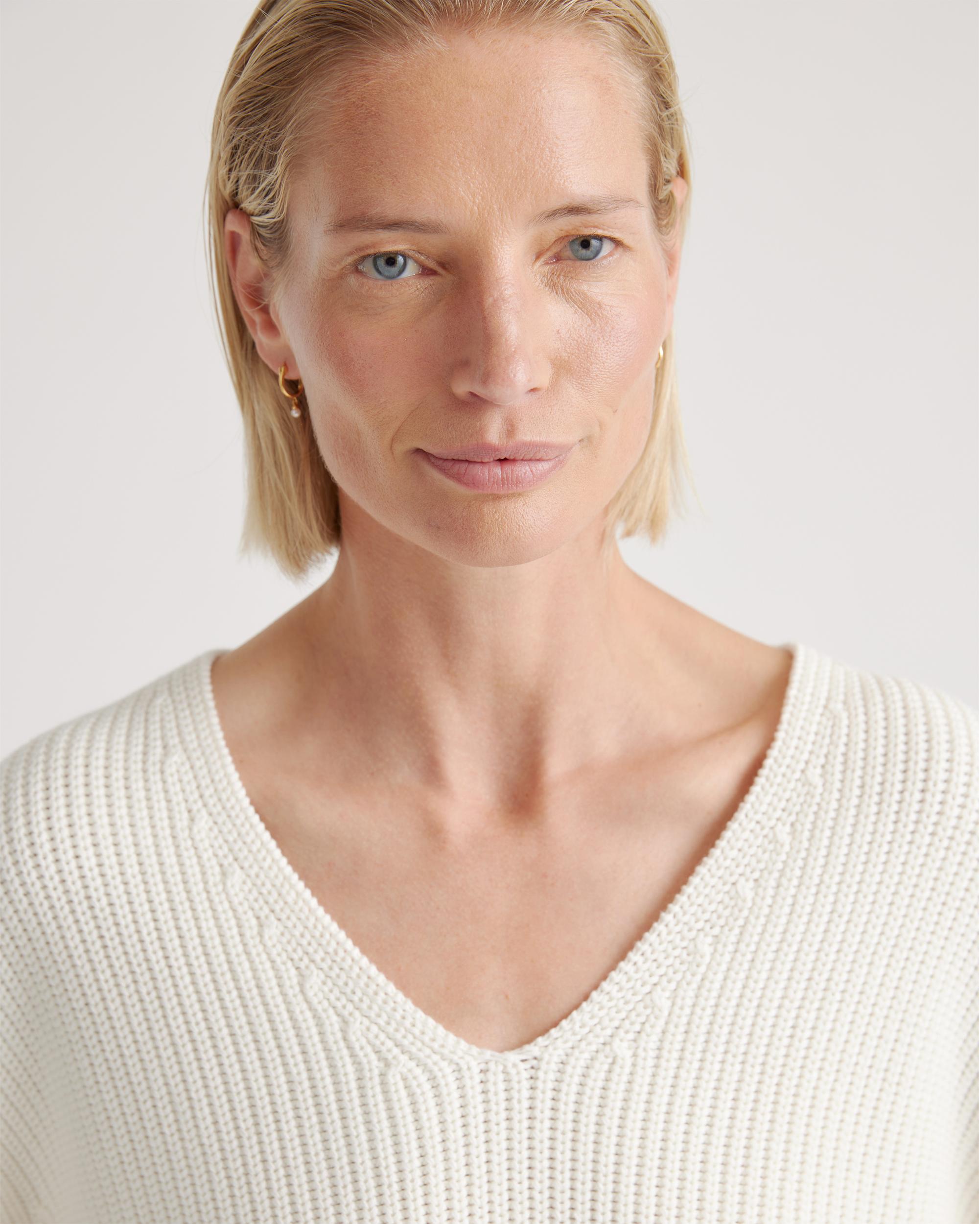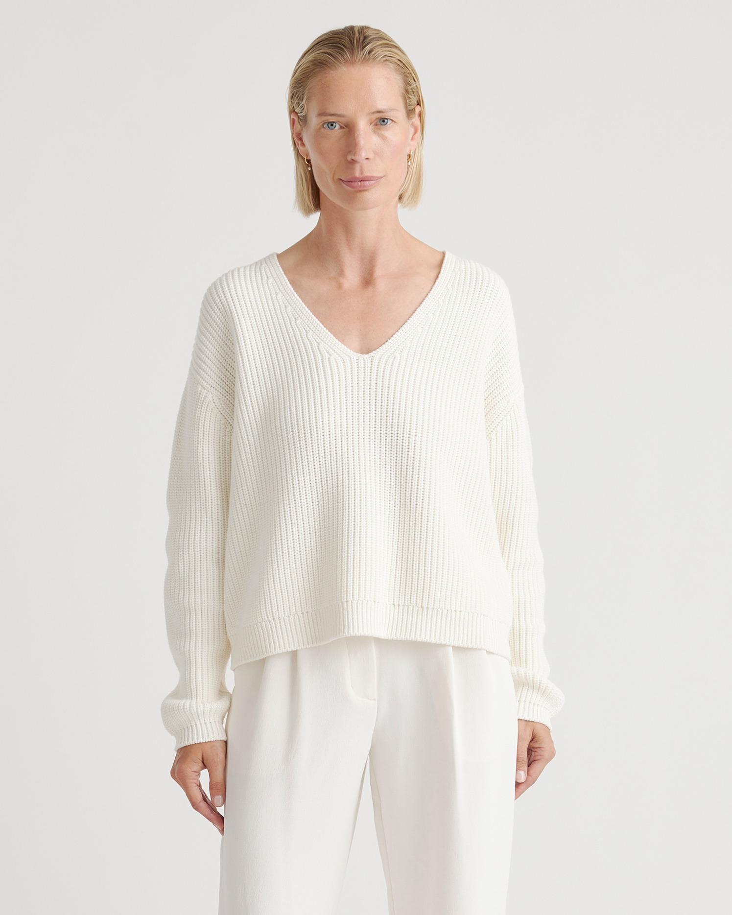 You loved our 100% Organic Cotton Fisherman Crew, so we put a fresh spin on it with the 100% Organic Cotton Fisherman V-Neck Sweater. With its relaxed fit, cropped length, and classic V-neck design, this sweater will be your new go-to for effortless style. Crafted from super-soft organic cotton in a wide ribbed knit, it's comfy and made to last. Also offered in sizes 1X-3X. | Quince | Women's Fisherman V-Neck Sweater in Ivory, Size Small, Organic Cotton