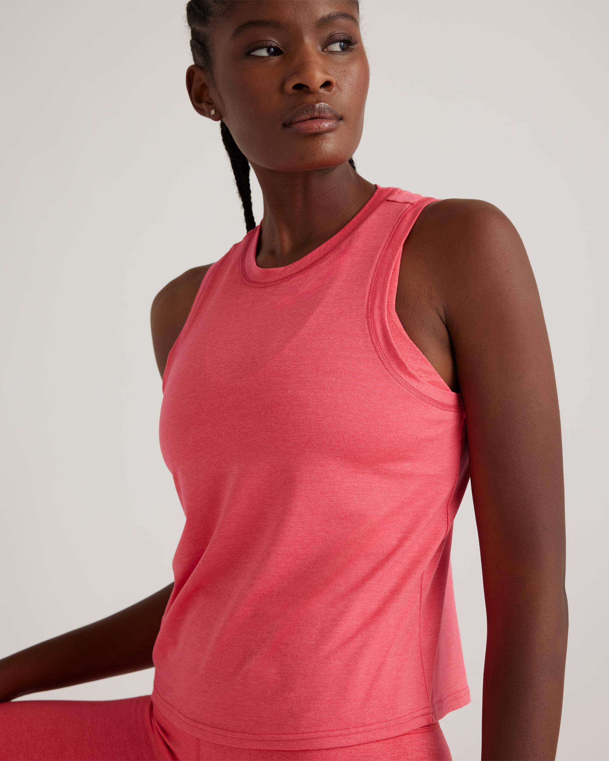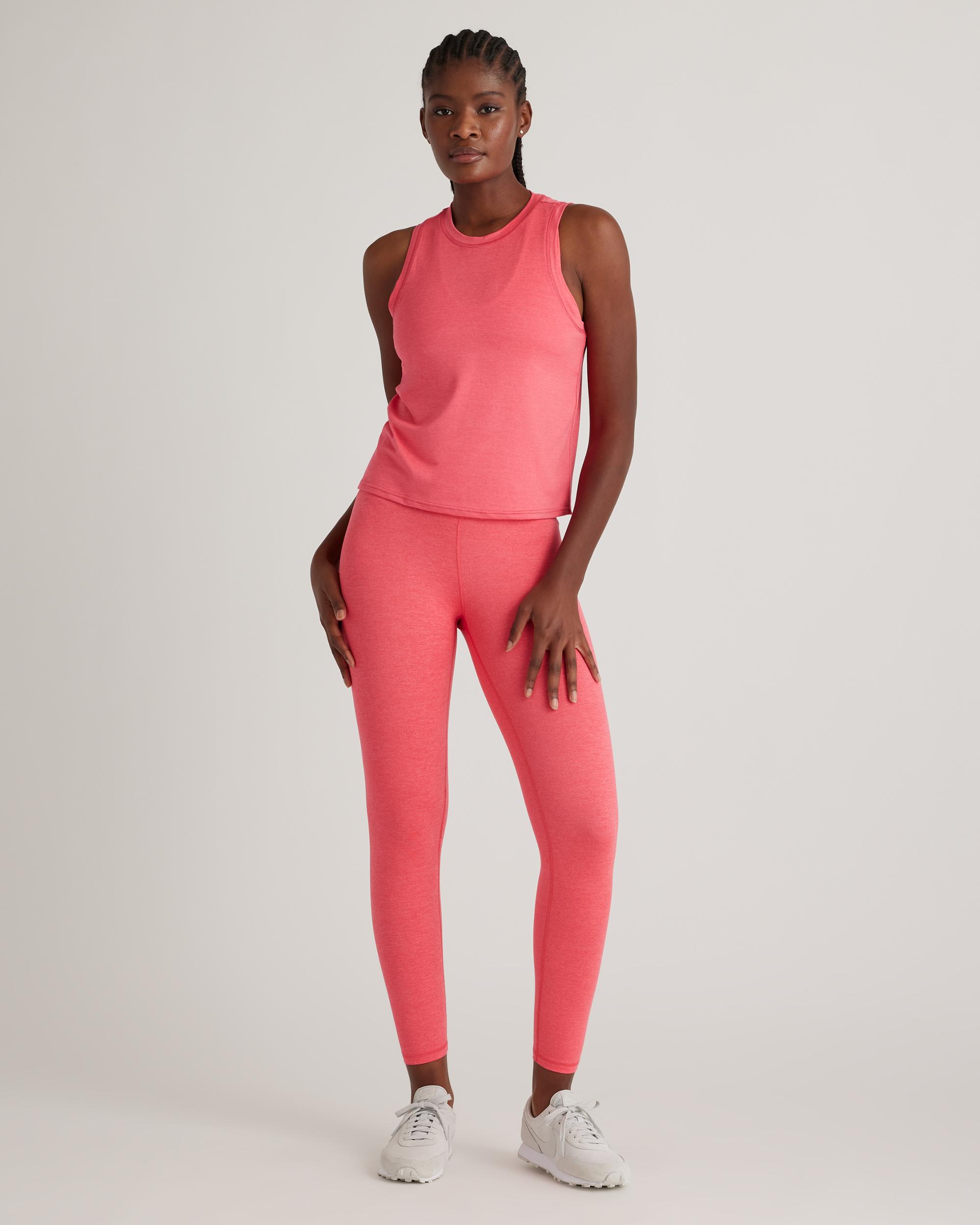 Perfect for running, yoga, travel or just lounging, our lightweight Flowknit Breeze fabric is jam-packed with performance features like moisture wicking and anti-odor for ultimate versatility. Our Flowknit Breeze is made from Global Recycle Standard poly yarn, which diverts and recycles plastics destined for landfill or the ocean, so you can feel and look good in what you wear. | Quince | Women's Flowknit Breeze High-Neck Tank Top in Heather Coral, Size XL, 100% Polyester