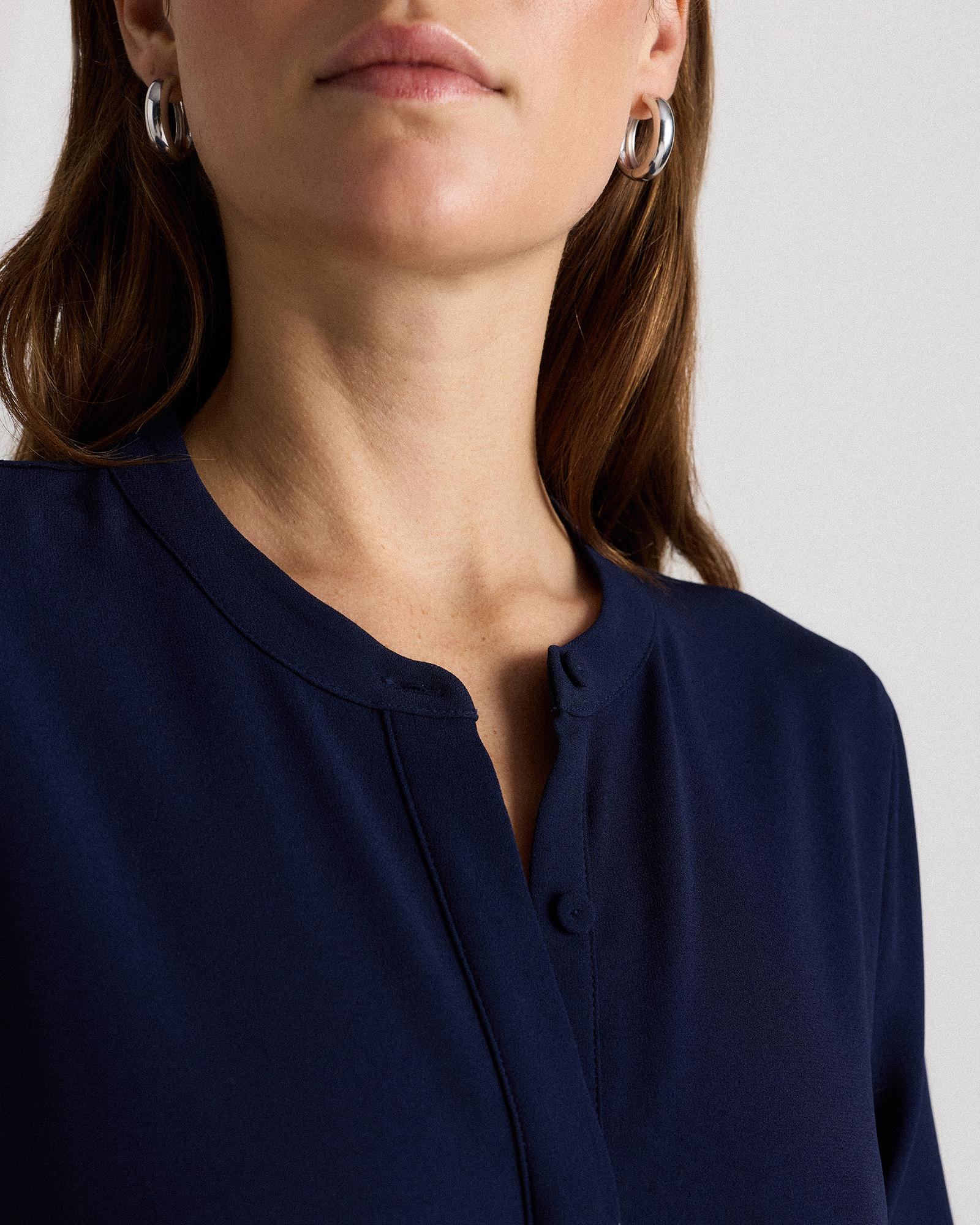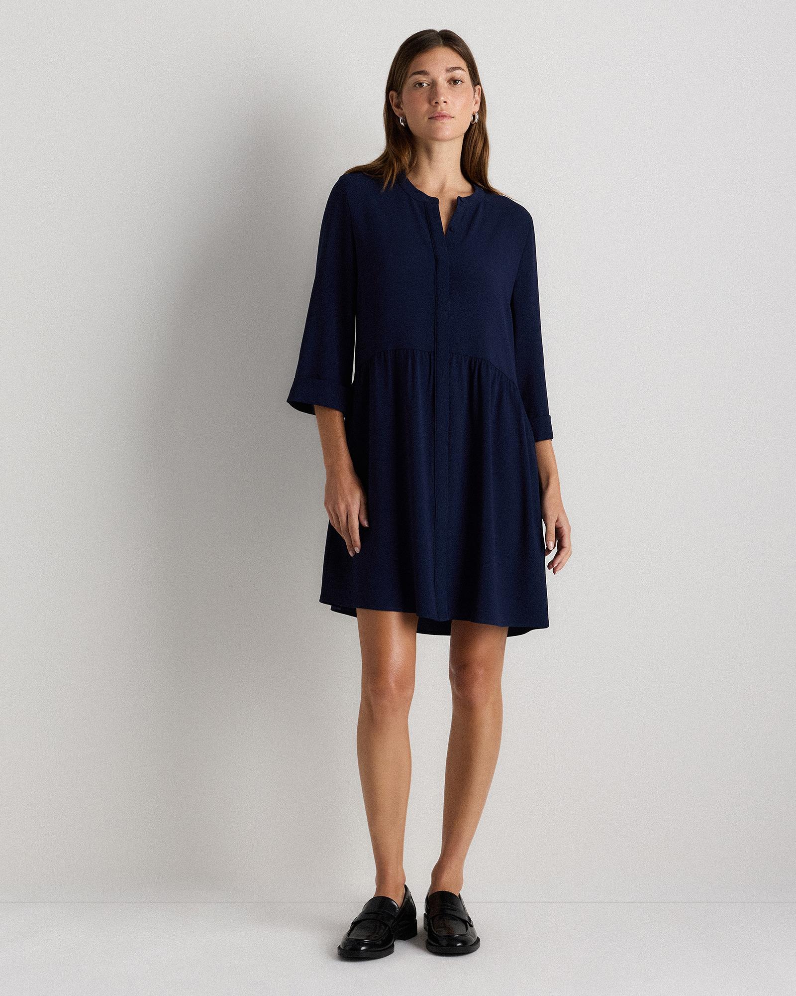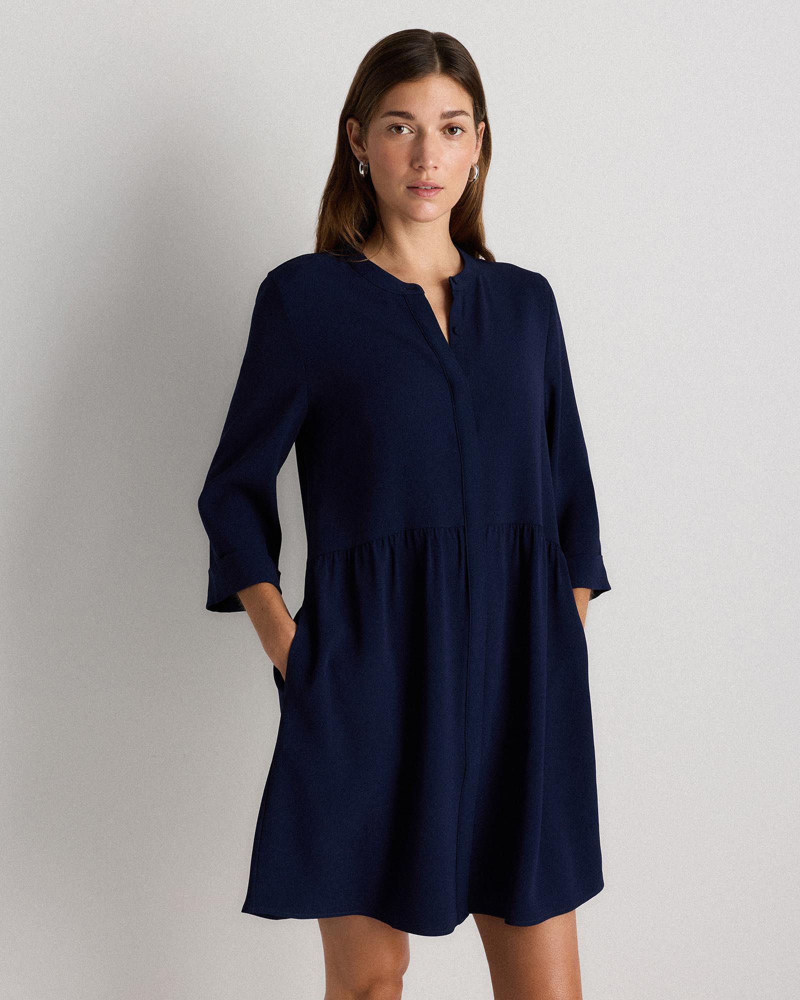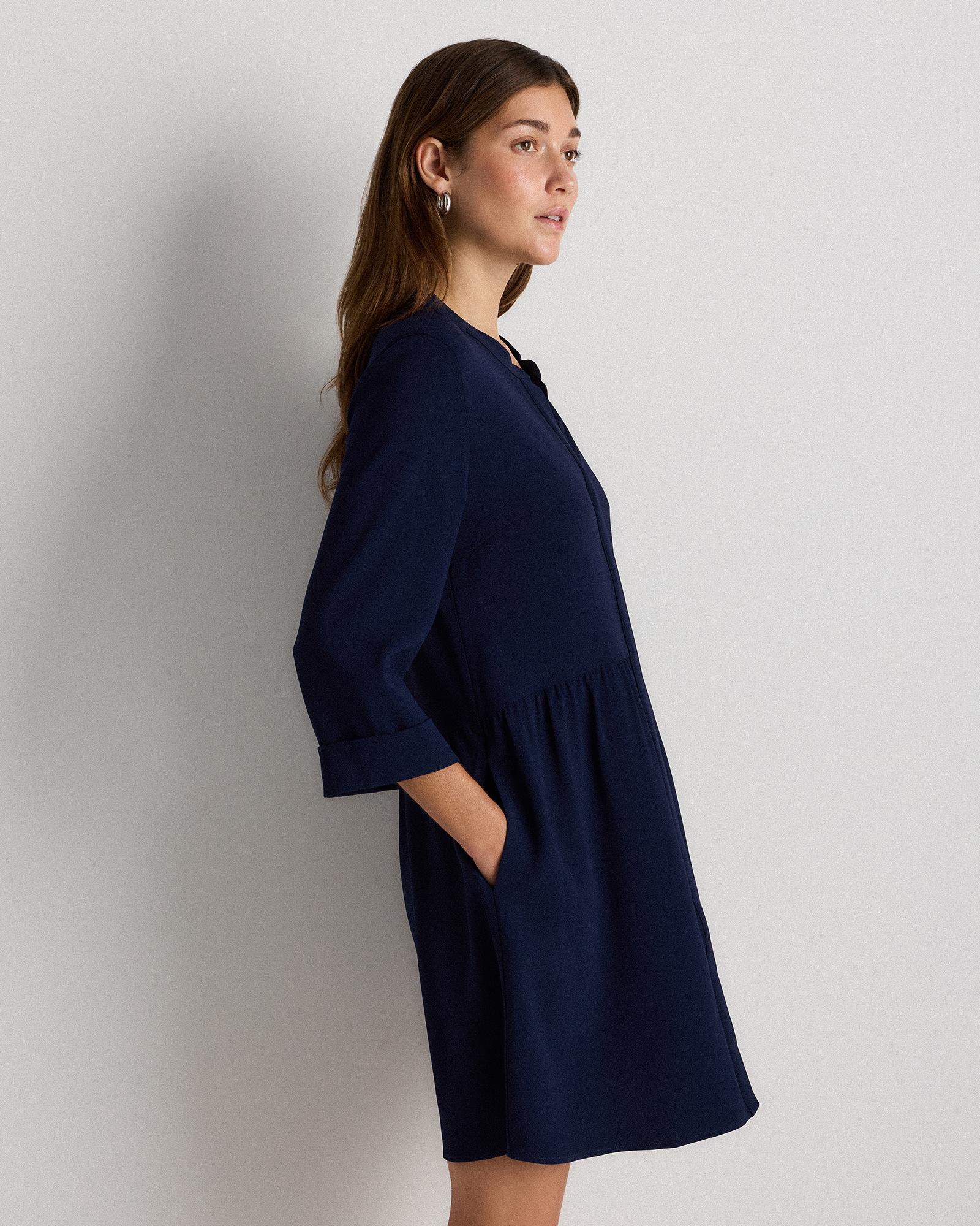 Crafted from a wrinkle resistant material with a drapey crepe exterior and smooth satin interior, our Fluid Crepe Shirt Dress will have you looking polished and chic from desk to drinks. The mandarin collar and three-quarter length sleeves create a classic silhouette with a feminine flair. It's the ultimate day to night dress, and we know it will be a staple in your closet. | Quince | Women's Fluid Crepe Shirt Dress in Navy, Size XS, Polyester