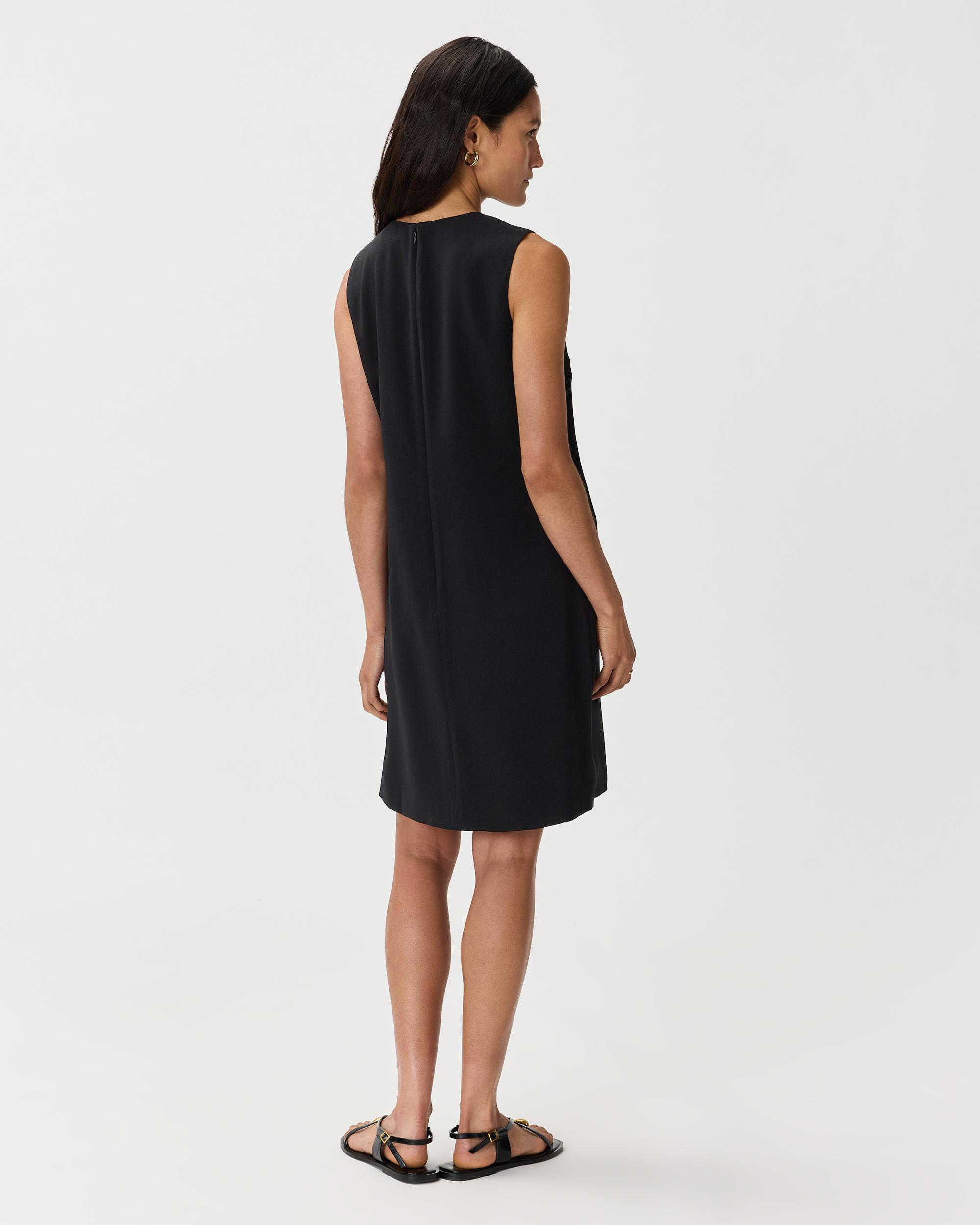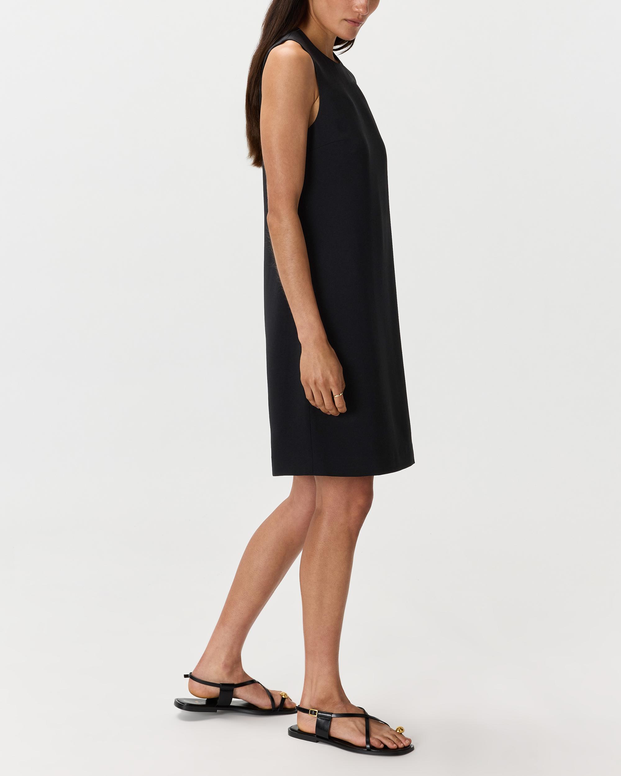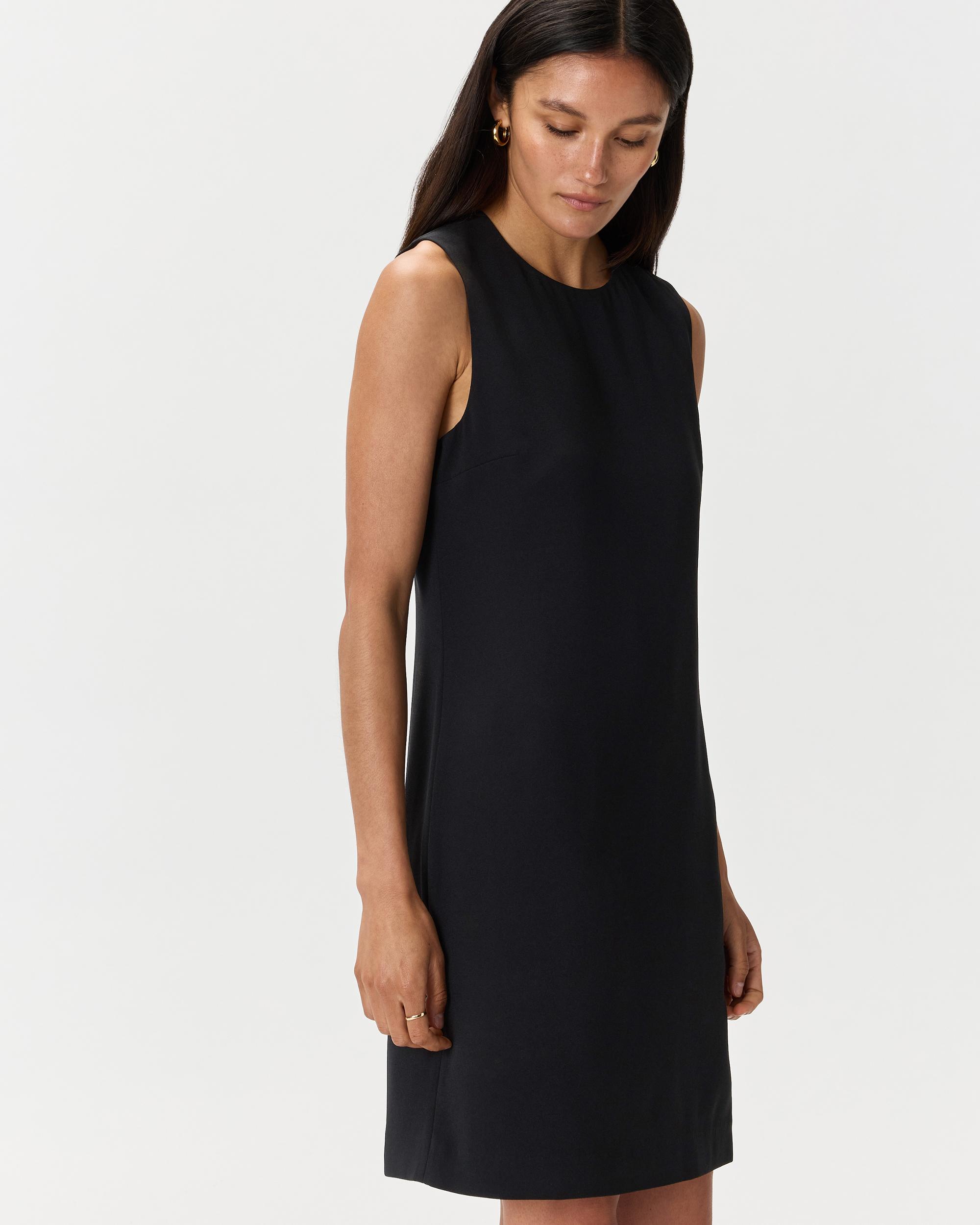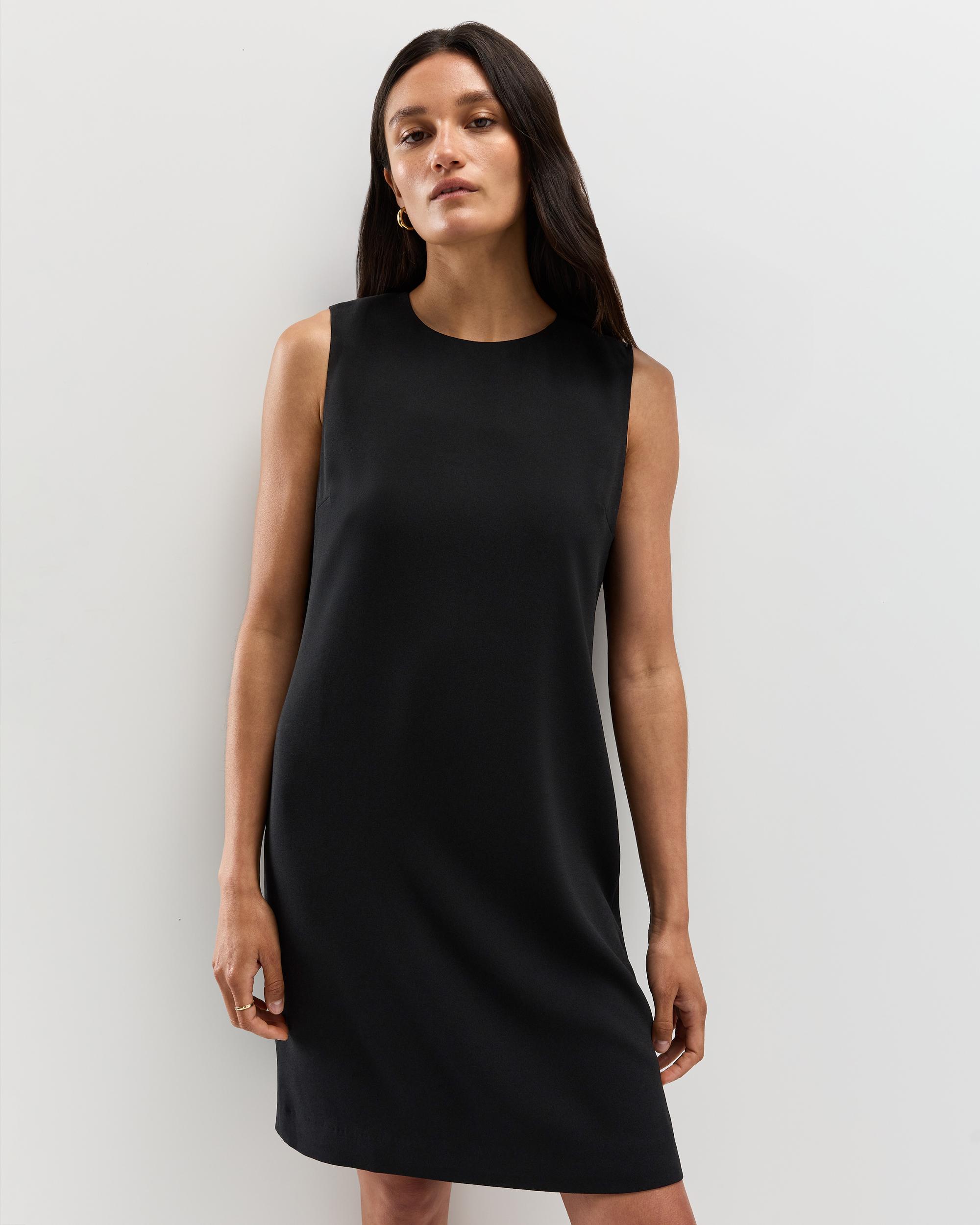 Meet your new workwear uniform. Our Fluid Crepe Sleeveless Shift Dress is crafted from a wrinkle resistant, drapey crepe fabric. Creating an effortless shift silhouette, this piece will have you looking professional and polished all day long. | Quince | Women's Fluid Crepe Sleeveless Shift Dress in Black, Size XS, Polyester
