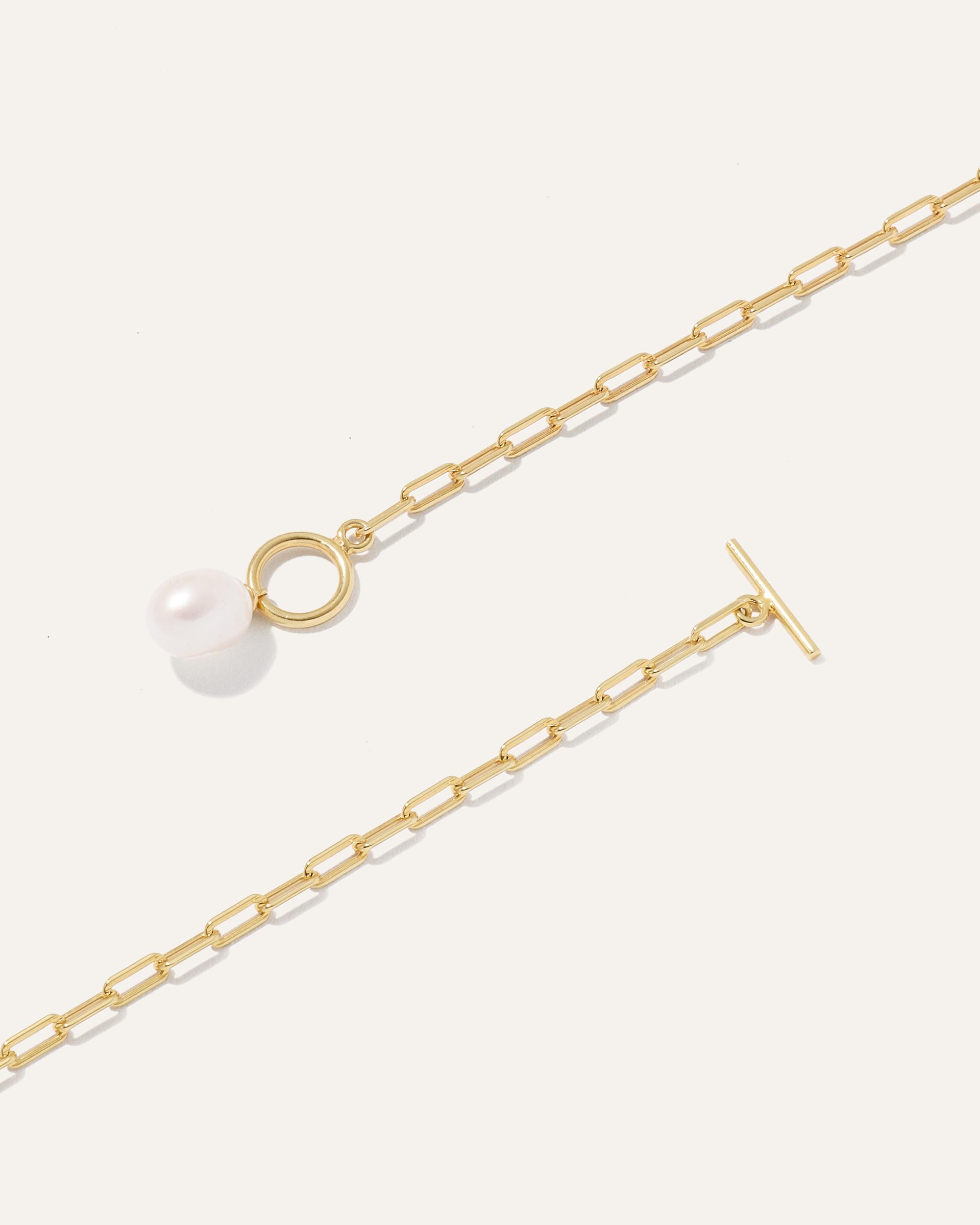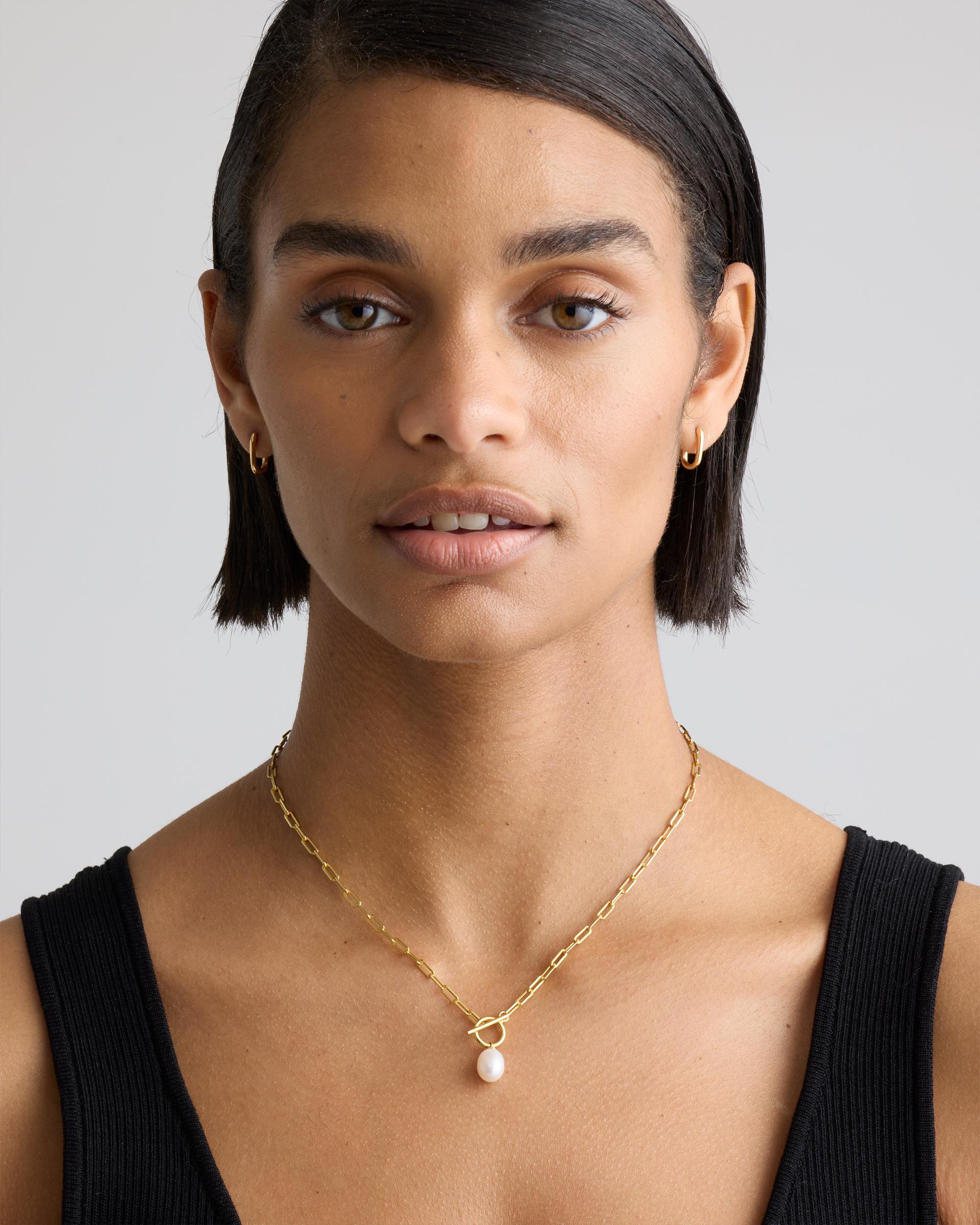 This unique toggle closure necklace puts a modern spin on the traditional pearl pendant. Featuring a high-quality freshwater pearl, a bold 18k gold vermeil paperclip chain, and the perfect length to sit higher on the neck for layering, this piece is sure to luxe up any look. | Quince | Women's Freshwater Cultured Pearl Toggle Necklace in Gold Vermeil
