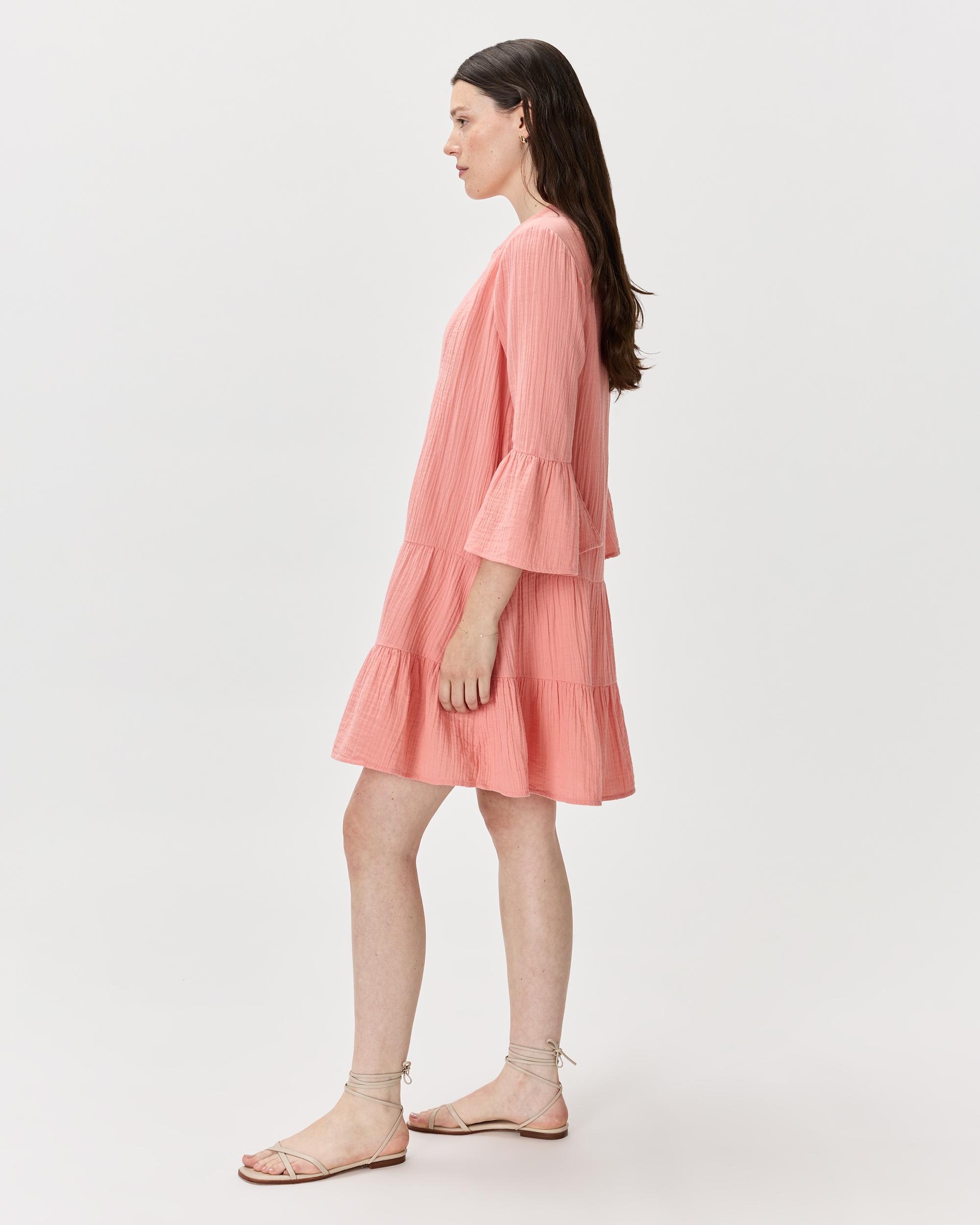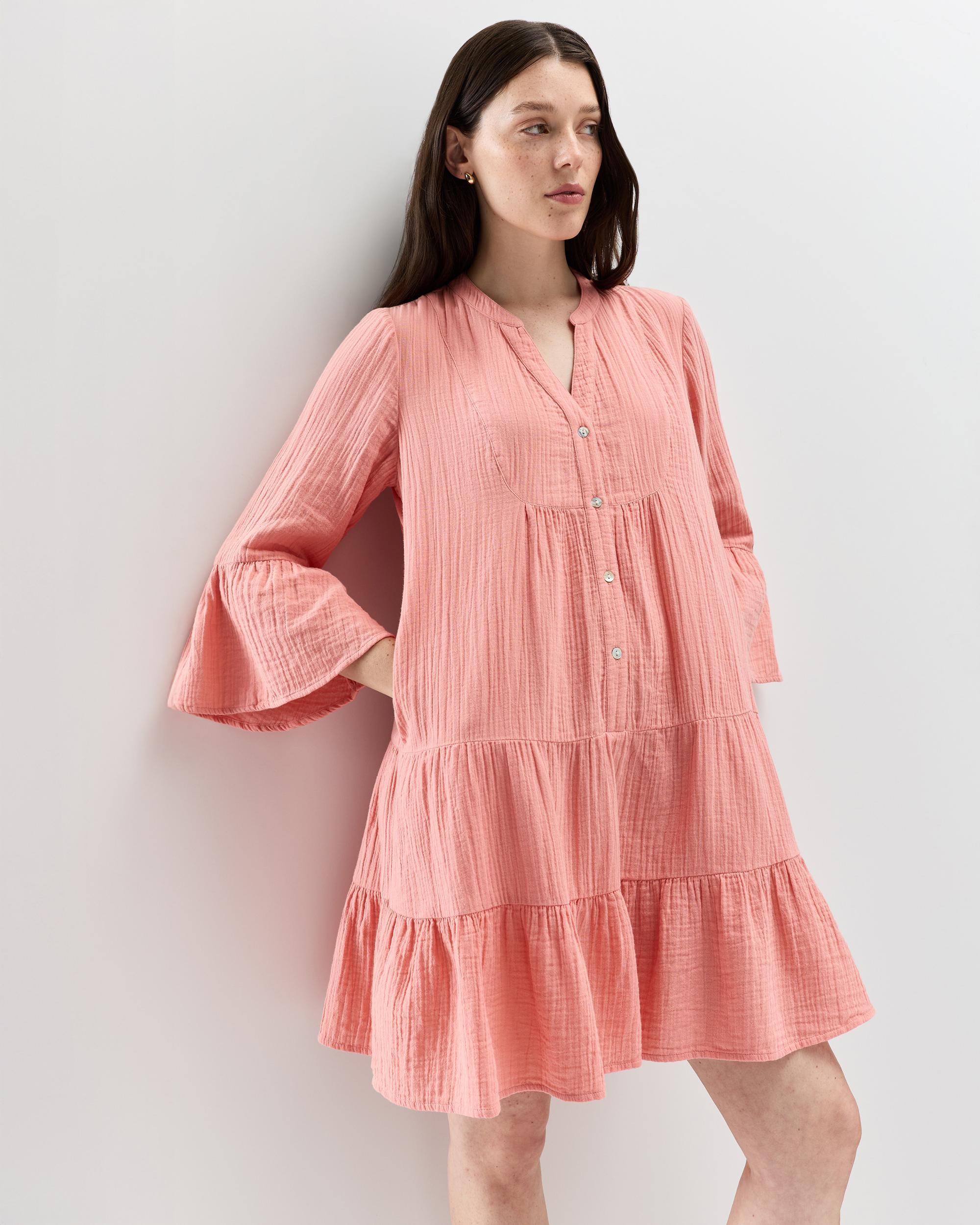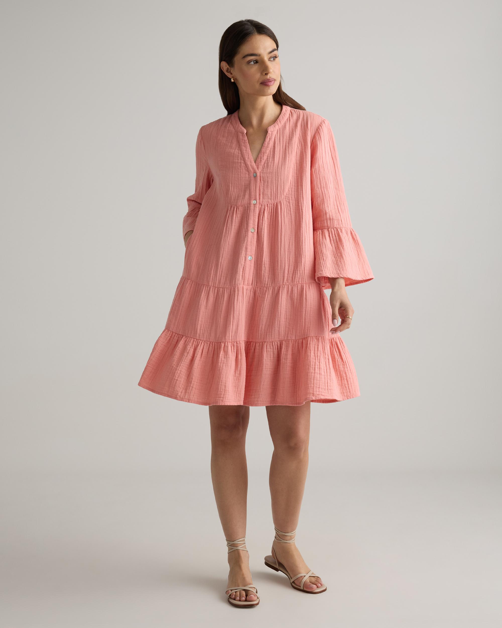 Crafted from breathable cotton gauze, the 100% Organic Cotton Gauze Long Sleeve Tiered Mini Dress features a tiered mini-length skirt for a playful silhouette and long billowy sleeves for an elegant, relaxed fit. Lightweight and airy, it’s perfect for any occasion. Bonus: it's got pockets! | Quince | Women's Gauze Long Sleeve Tiered Mini Dress in Coral Blush, Size Small, Organic Cotton