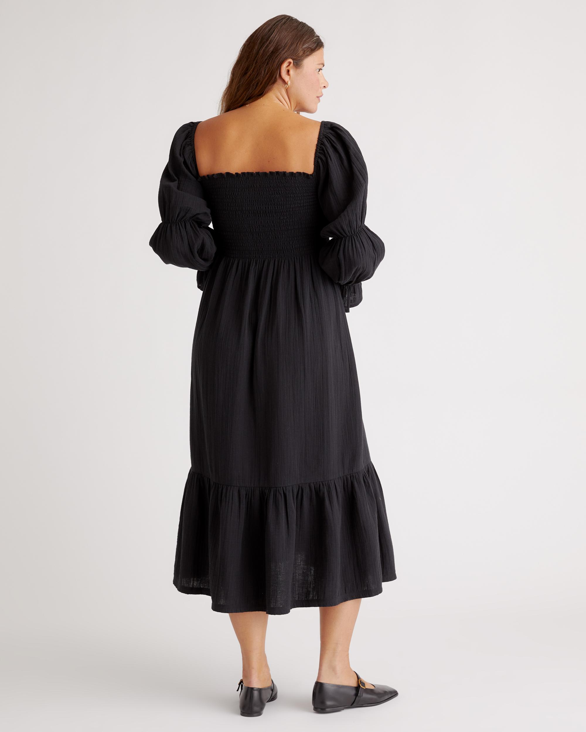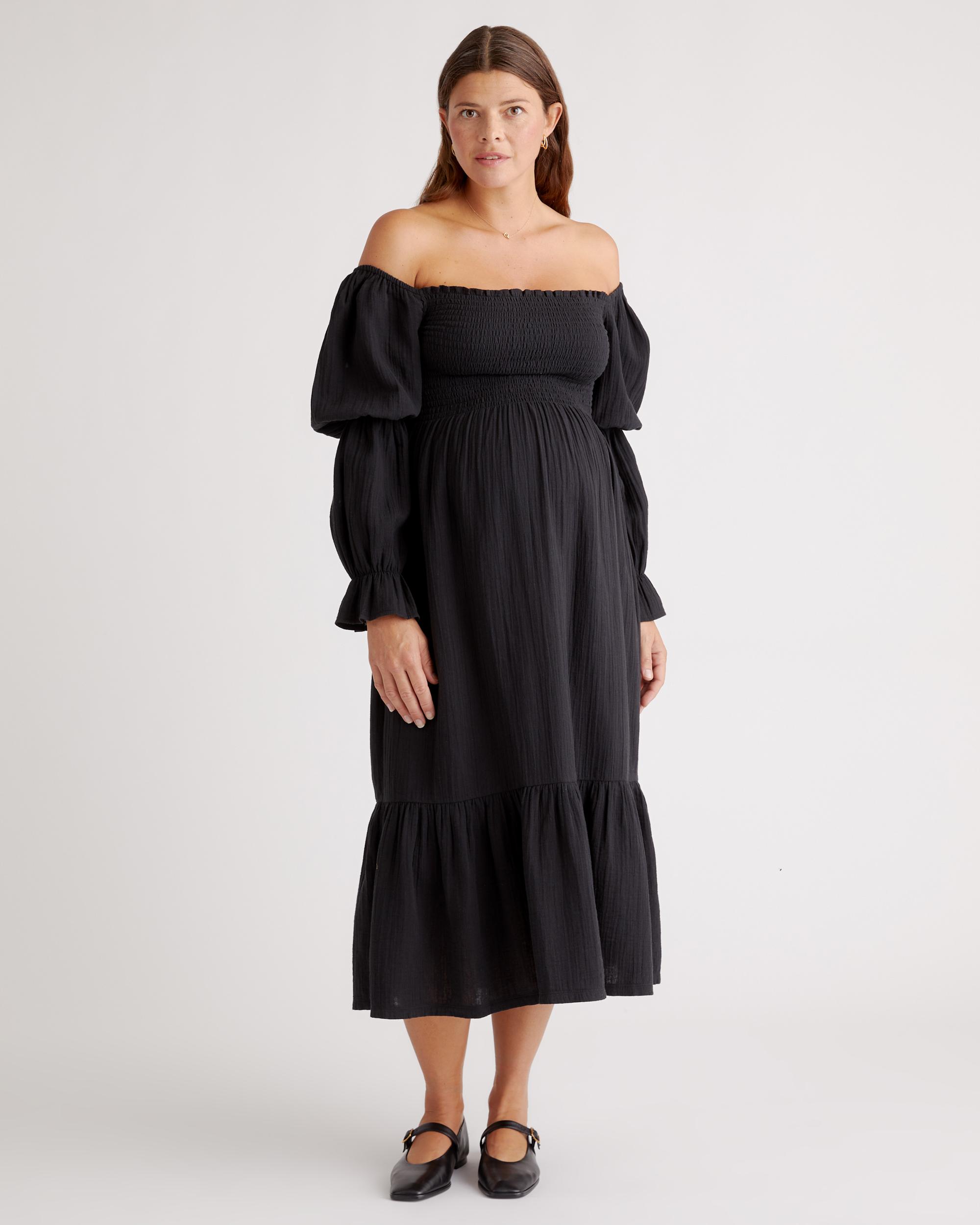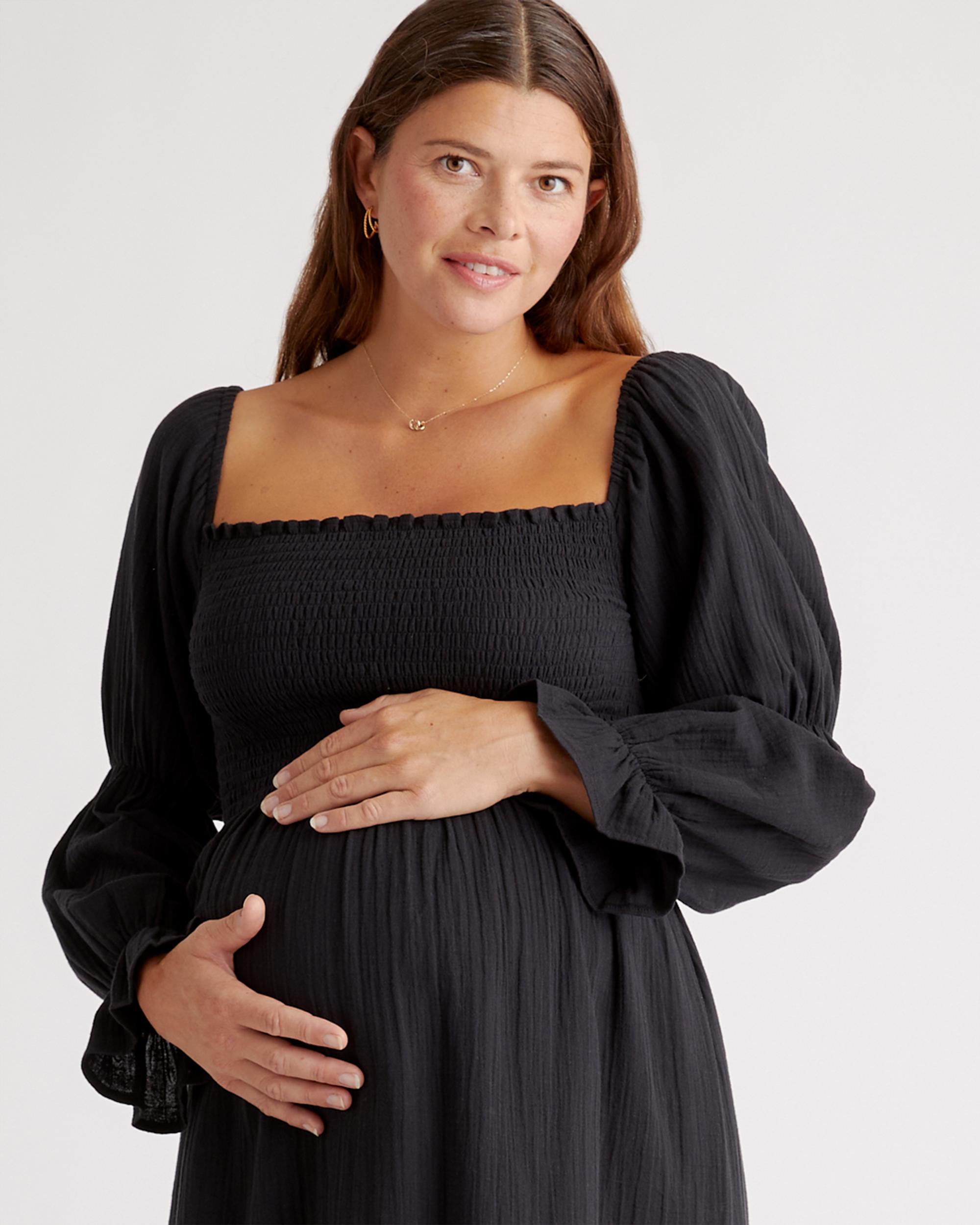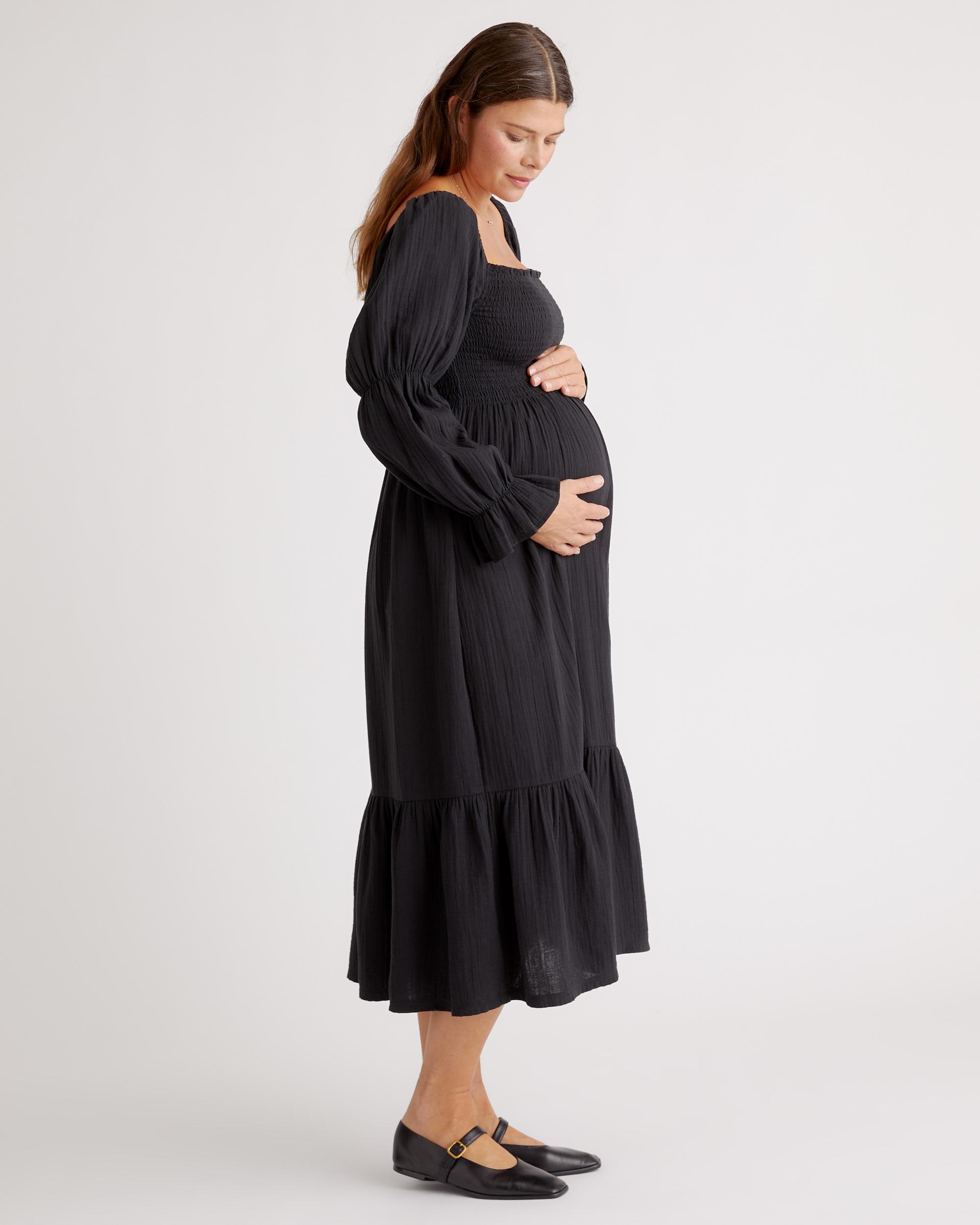 Breezy, beautiful, and made for motherhood—this smocked midi dress is perfect for all your summertime events. Crafted from 100% organic cotton gauze, it’s naturally breathable, lightweight, and gentle on sensitive skin, making it ideal for warm days or layering through the seasons. A stretchy smocked bodice adapts to your changing shape, offering a flattering, flexible fit before, during, and after pregnancy. | Quince | Women's Gauze Maternity Smocked Midi Dress in Black, Size Medium, Organic Cotton