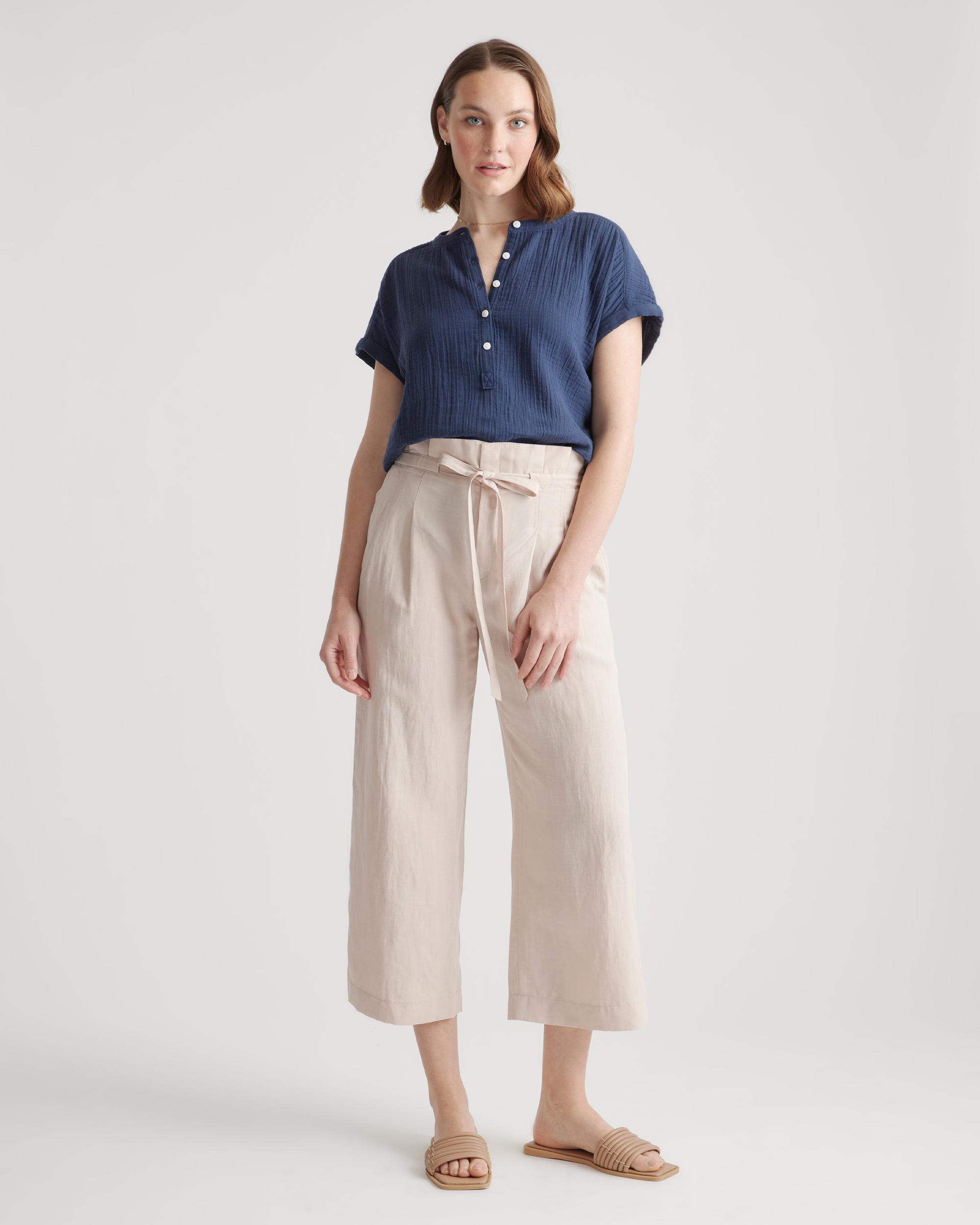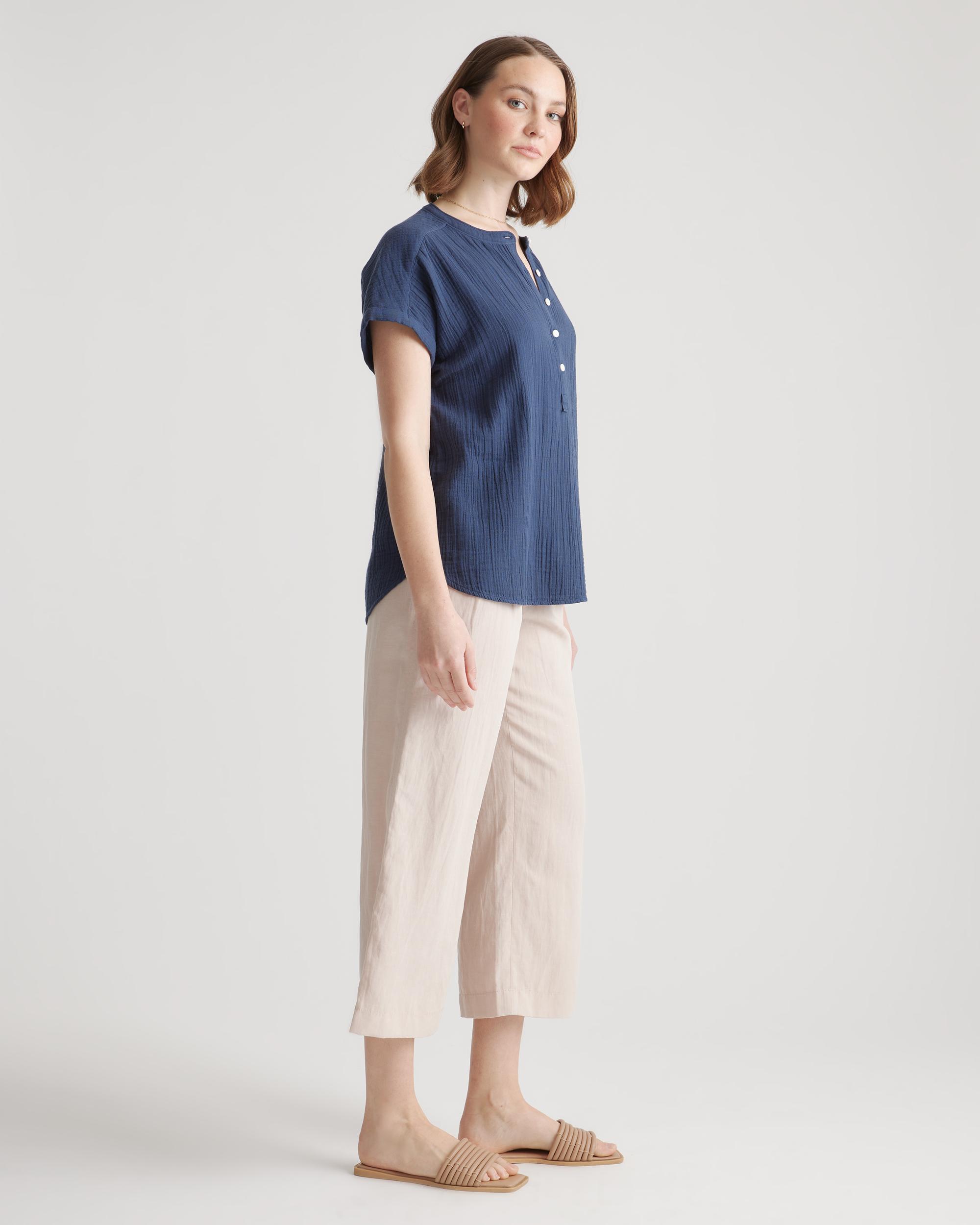 Looking for a wear with anything piece? We’ve got you. With a relaxed fit, this short sleeve shirt is like your favorite broken-in tee, but elevated with a dolman sleeve, banded collar and a button-down three quarter placket. And made with our premium ultra-breathable organic cotton gauze, it feels like a dream. Also available in 1X - 3X. | Quince | Women's Gauze Roll Sleeve Shirt in Indigo Blue, Size Large, Organic Cotton