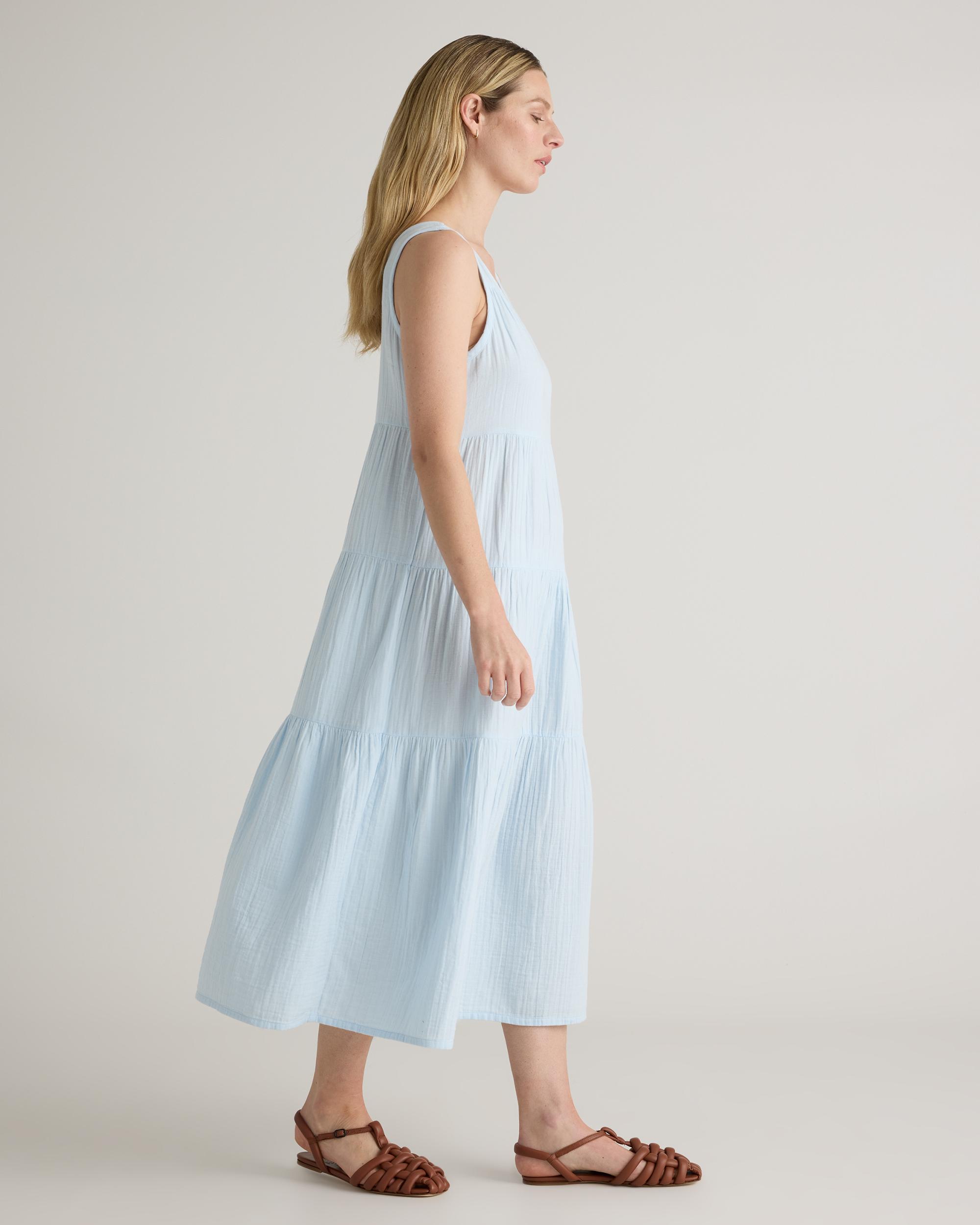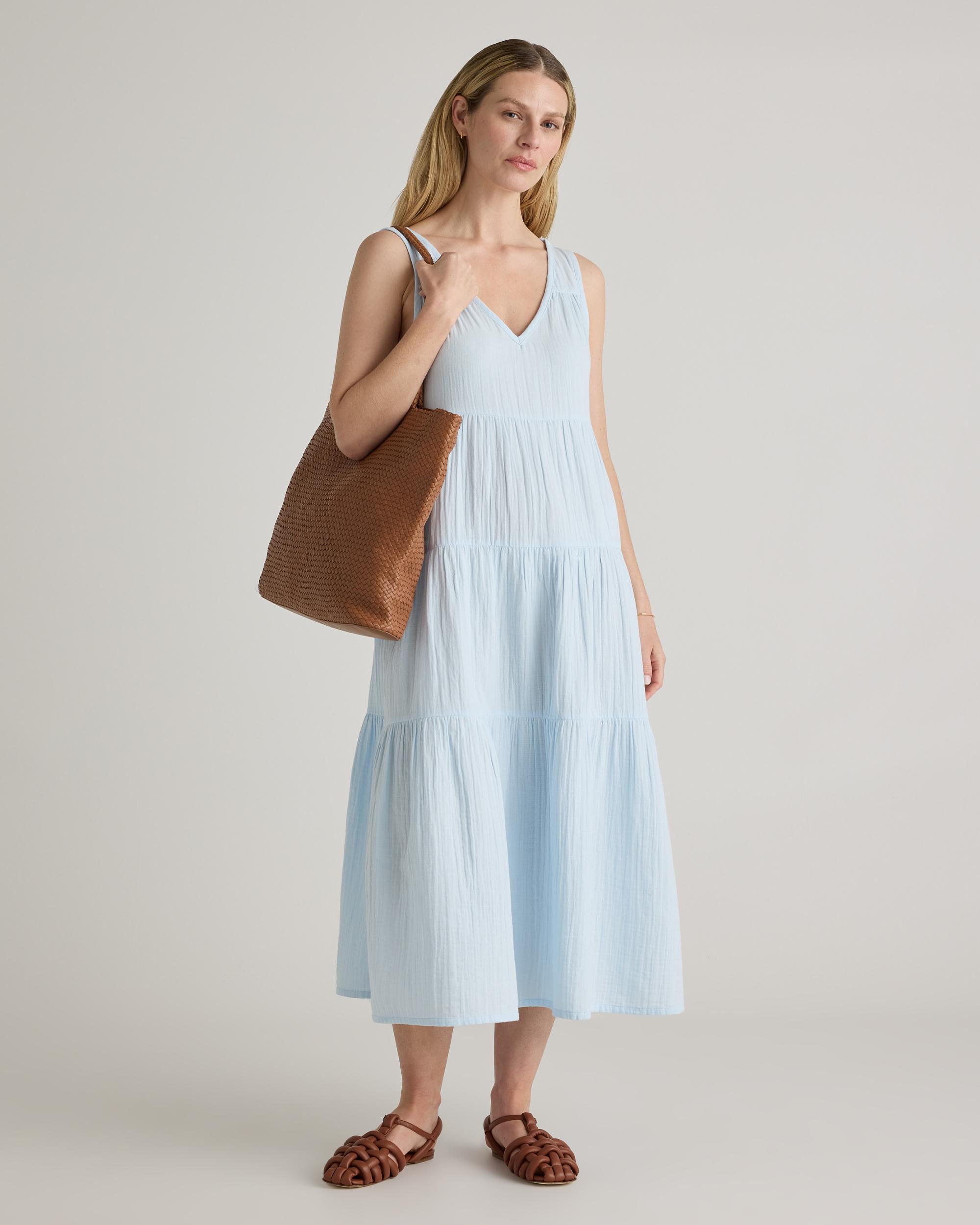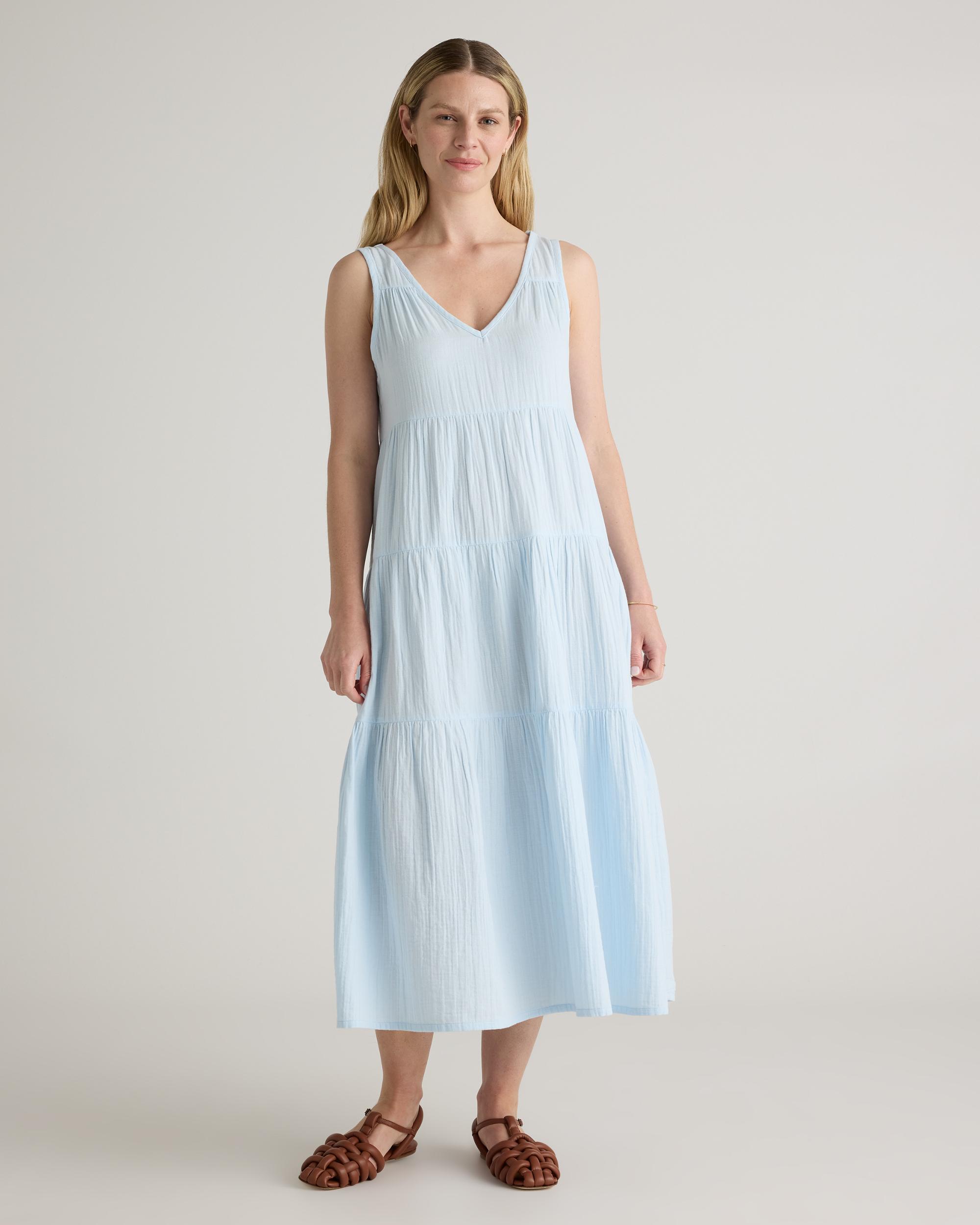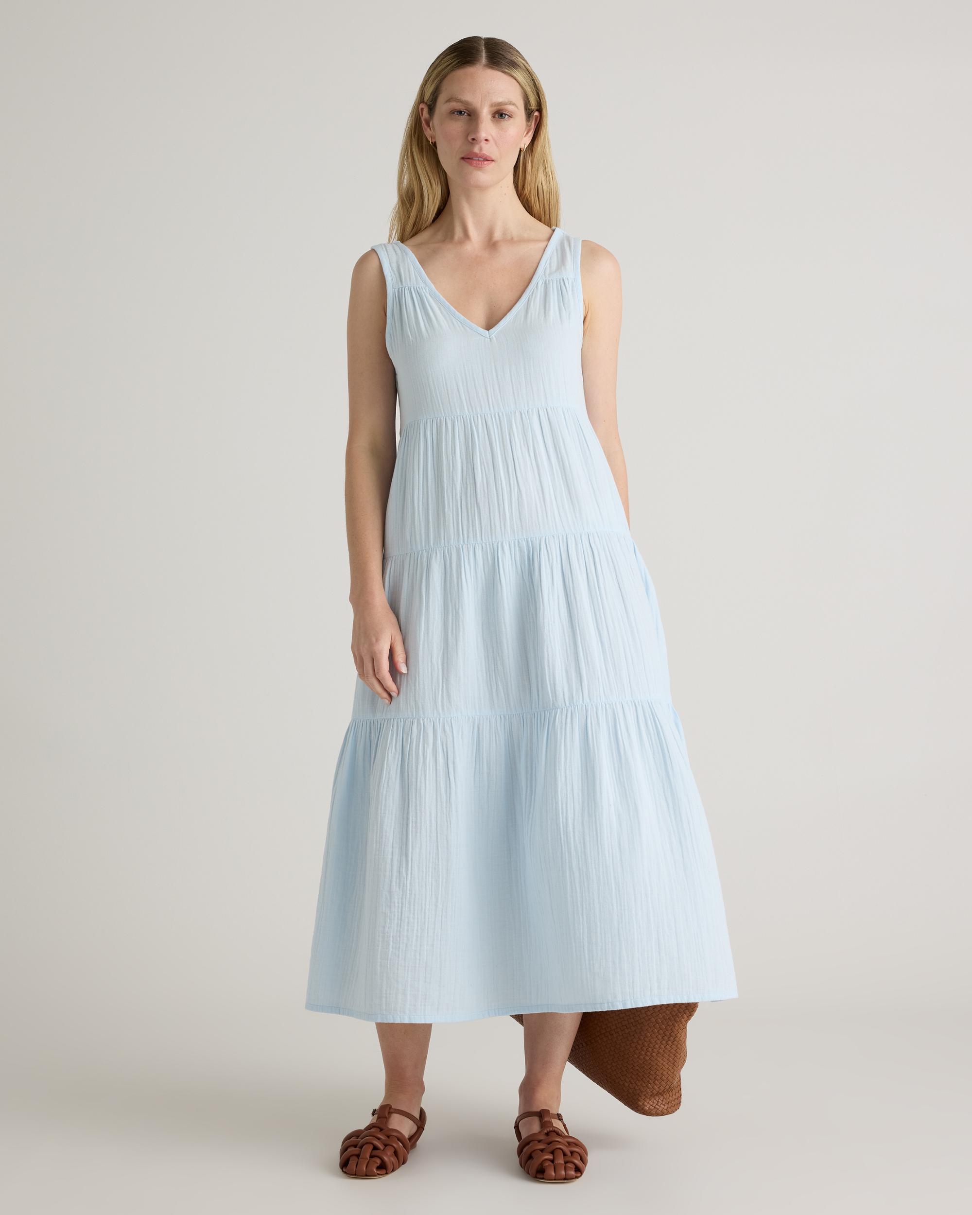 The ultimate slip on and step out style, this easy-to-wear dress still packs a fashionable punch. Made of breezy, lightweight organic cotton gauze, it features a v-neck in the front and back and flowy tiered bodice. Slide into a pair of sandals and top with a few pieces of jewelry and you’ve got a full look. Also offered in sizes 1X-3X | Quince | Women's Gauze Tiered Maxi Dress in Nantucket Blue, Size Medium, Organic Cotton