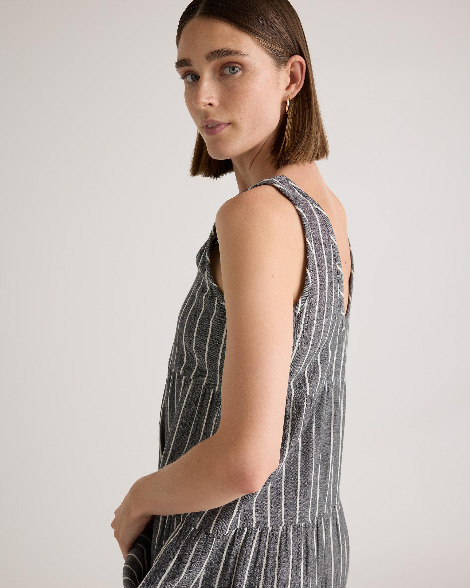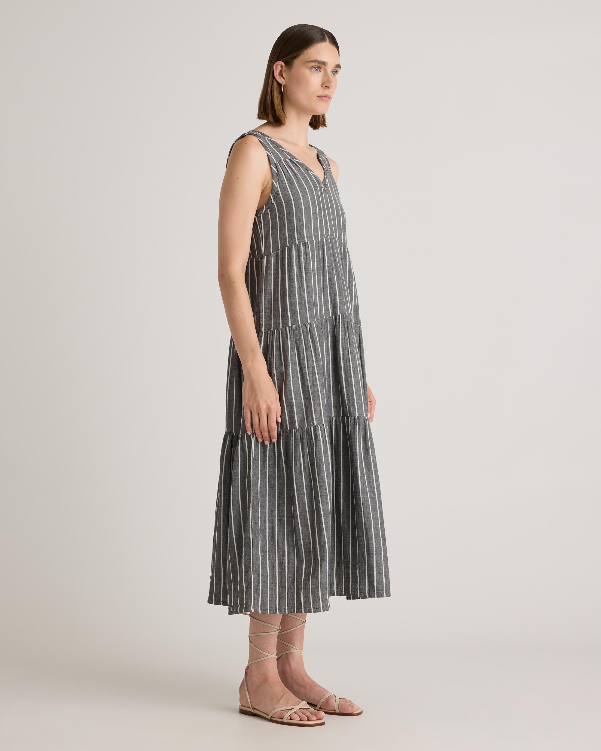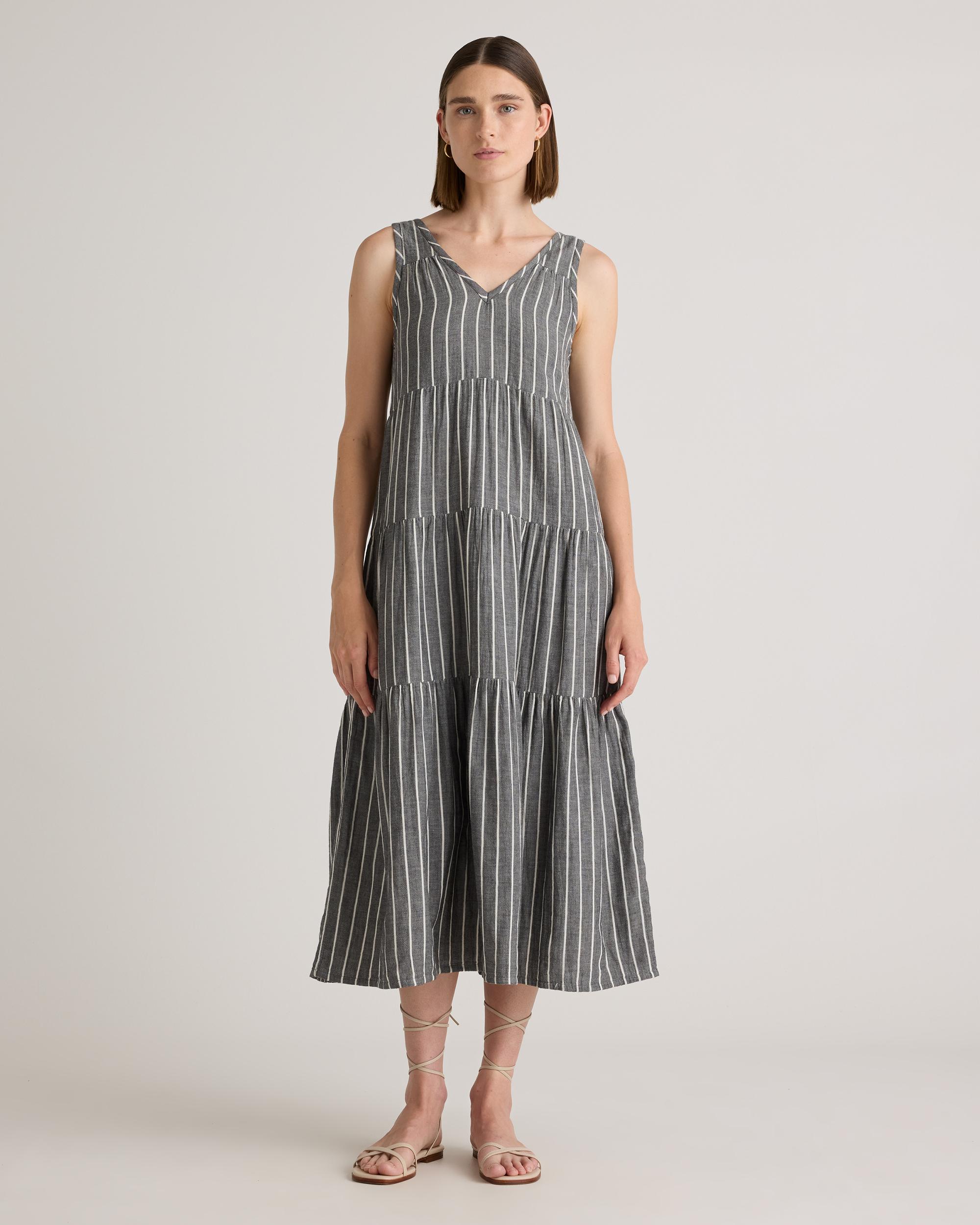 The ultimate slip on and step out style, this easy-to-wear dress still packs a fashionable punch. Made of breezy, lightweight organic cotton gauze, it features a v-neck in the front and back with a flowy, tiered skirt. Slide into a pair of sandals and top with a few pieces of jewelry and you’ve got a full look. Also offered in sizes 1X-3X | Quince | Women's Gauze Tiered Maxi Dress in Faded Black / White Stripe, Size XL, Organic Cotton