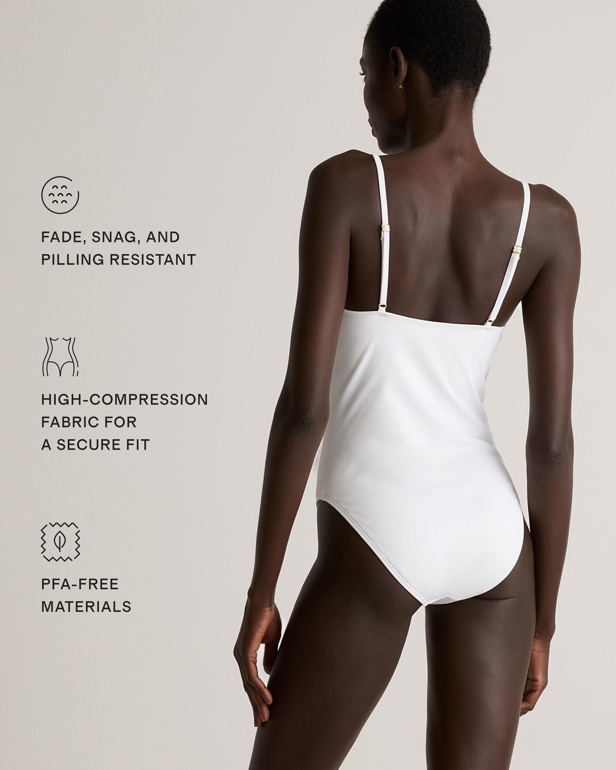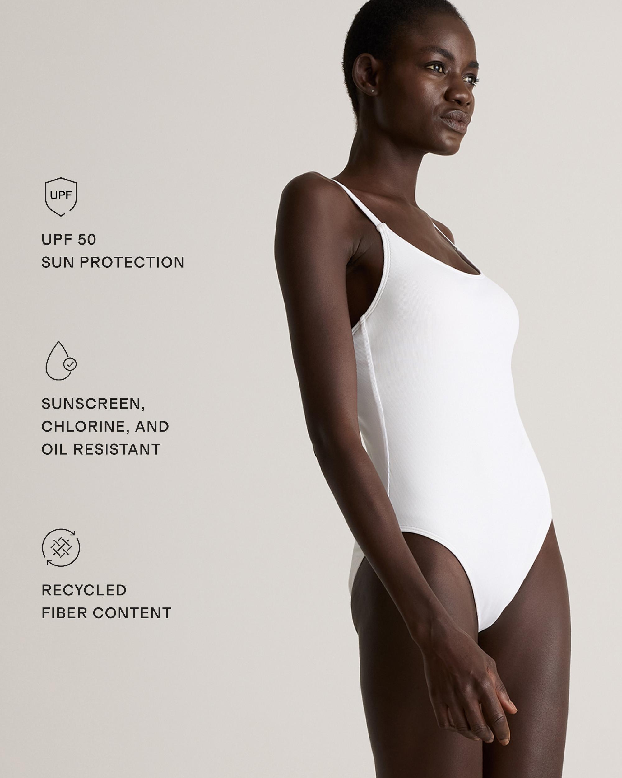 This timeless one-piece swimsuit is a triple threat: It was made to last, made with ribbed Italian-crafted fabric, and thoughtfully made with recycled materials. With moderate backside coverage, it feels comfy and secure thanks to compressive fabric and expert craftsmanship. Resists fading, pilling, and snagging, so you'll be wearing it for years to come. | Quince | Women's Italian Cami Ribbed One-Piece Swimsuit in White, Size XS, 78% Recycled Polyamide, 22% Spandex