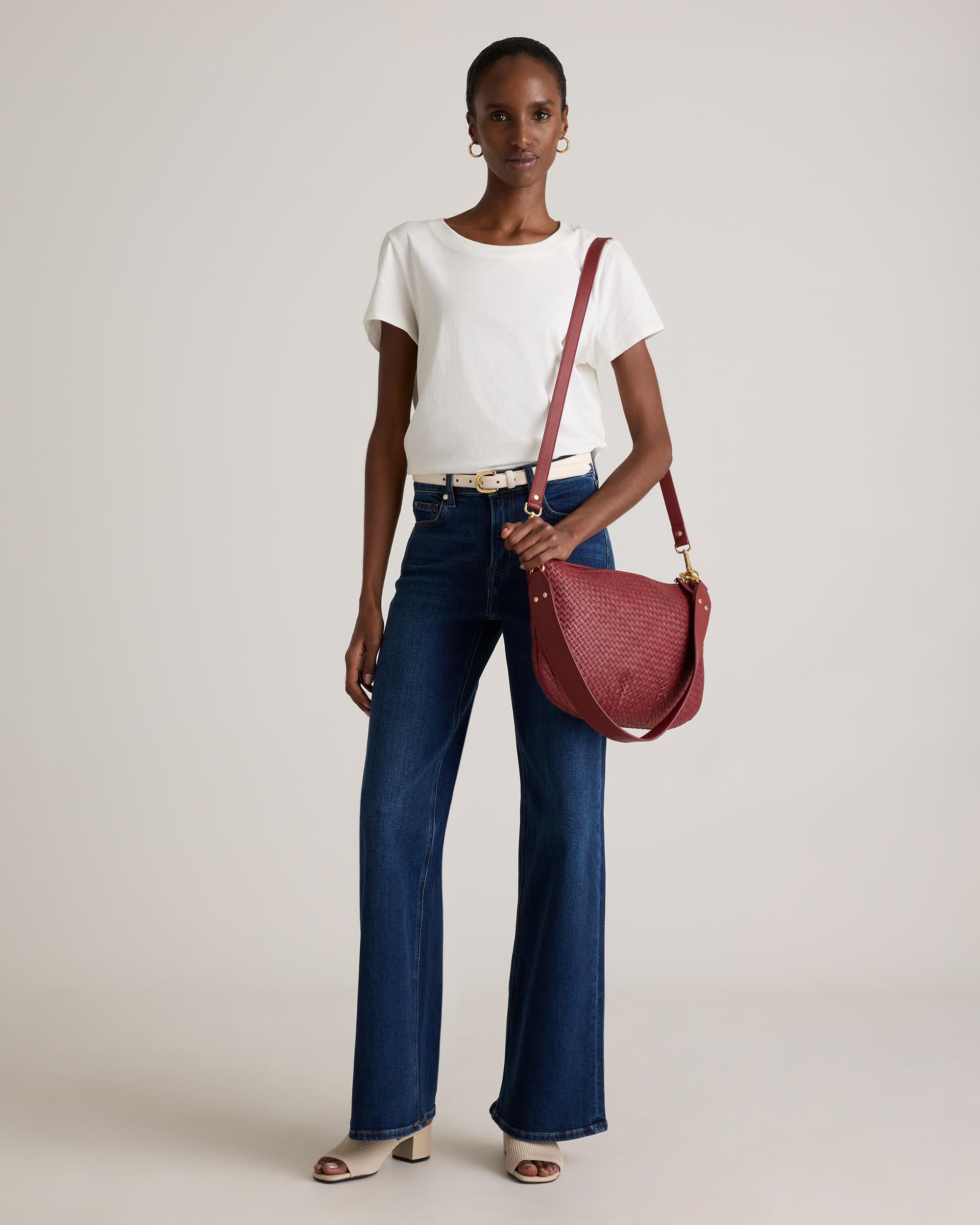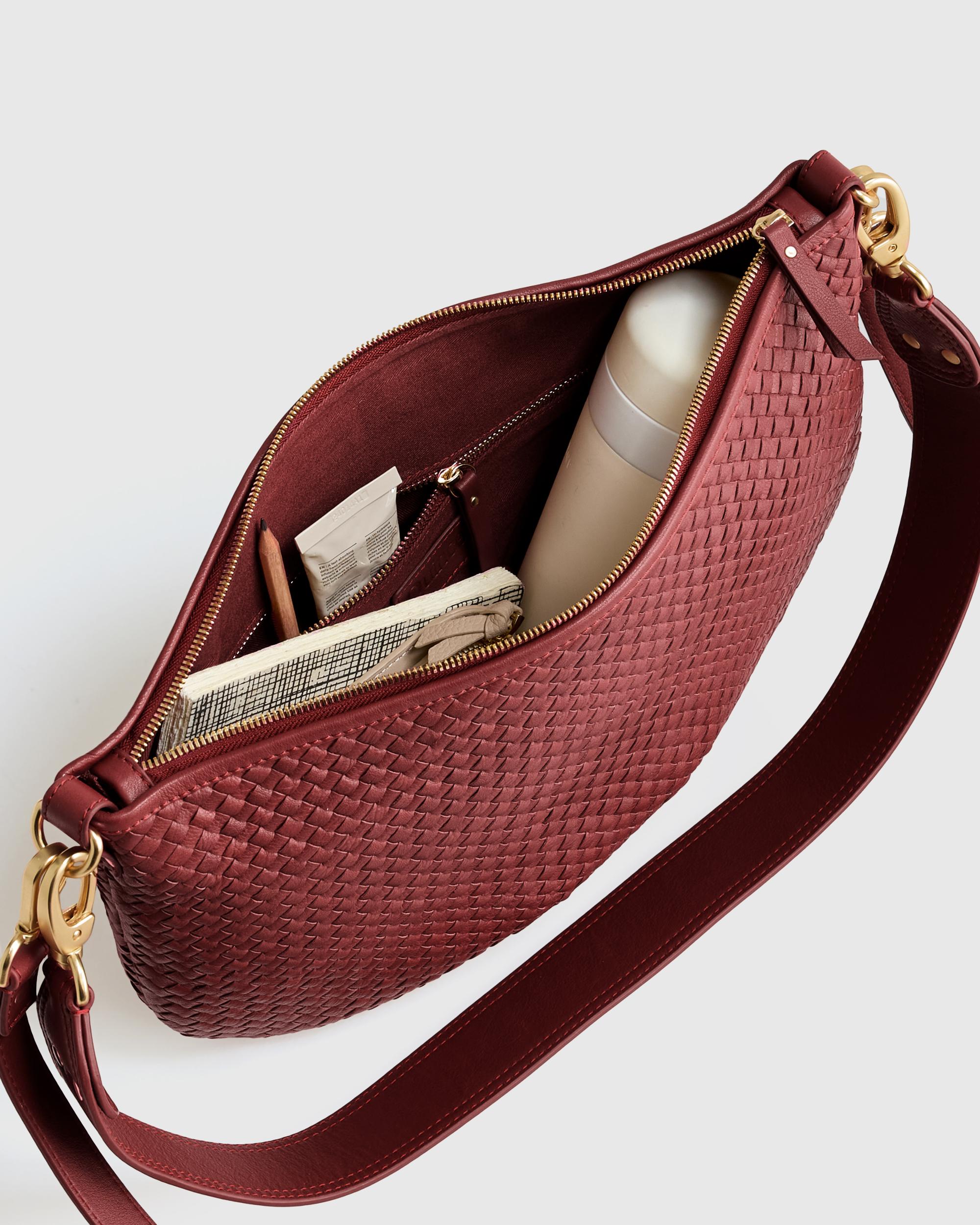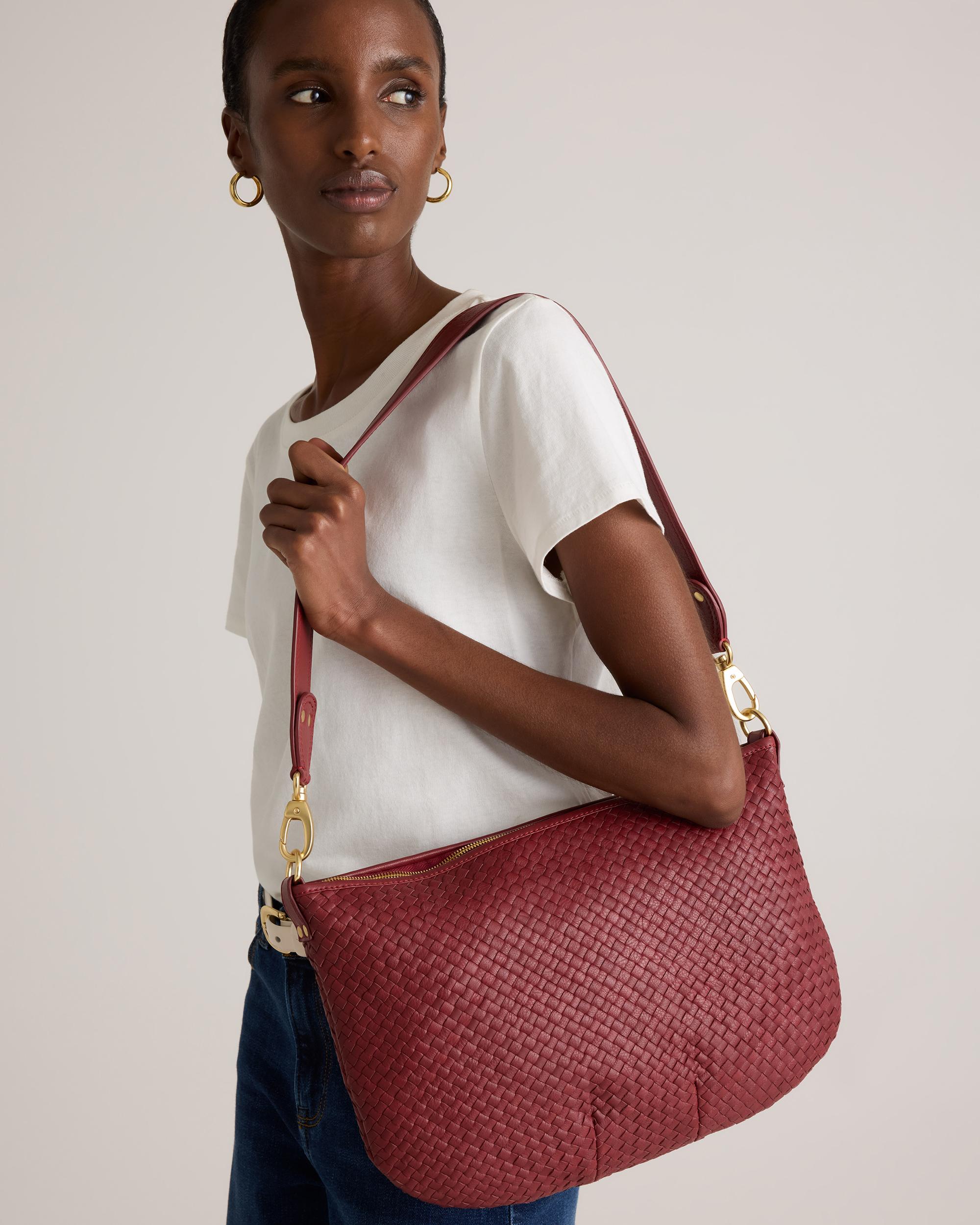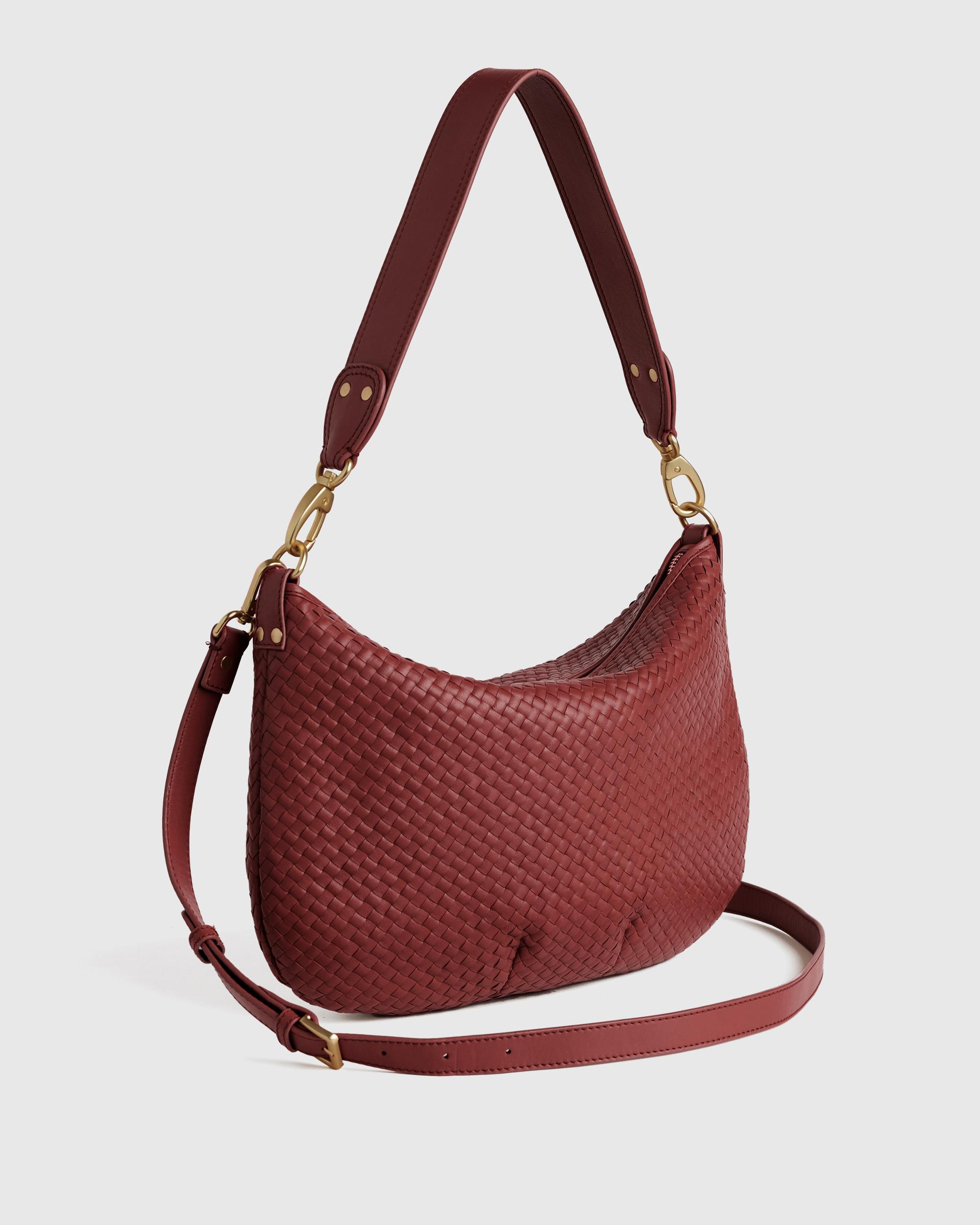Meet our Italian Leather Handwoven Crossbody. Handwoven using 100% top-grain Italian leather, this luxe carry-all features two detachable straps so you can style it over your shoulder or as a classic crossbody. | Quince | Women's Italian Leather Convertible Crescent Handwoven Shoulder Bag in Merlot