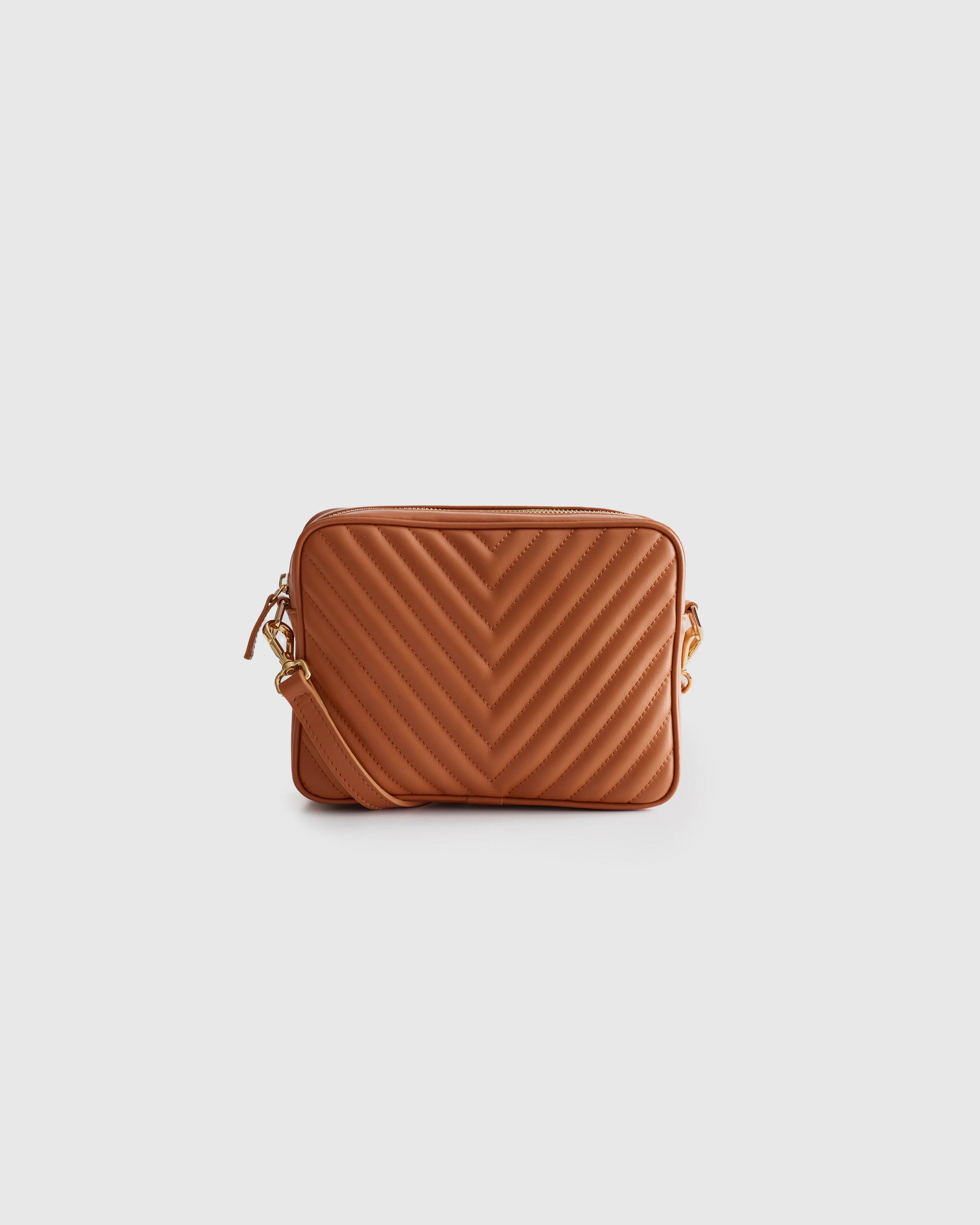 Our fan-fave Italian Leather Crossbody Bag has been given a quilted makeover. Handcrafted from premium 100% Italian leather, this beauty features an adjustable strap and zip top closure. Wear it crossbody or over the shoulder and get ready for the compliments to pour in. | Quince | Women's Italian Leather Quilted Crossbody Bag in Cognac