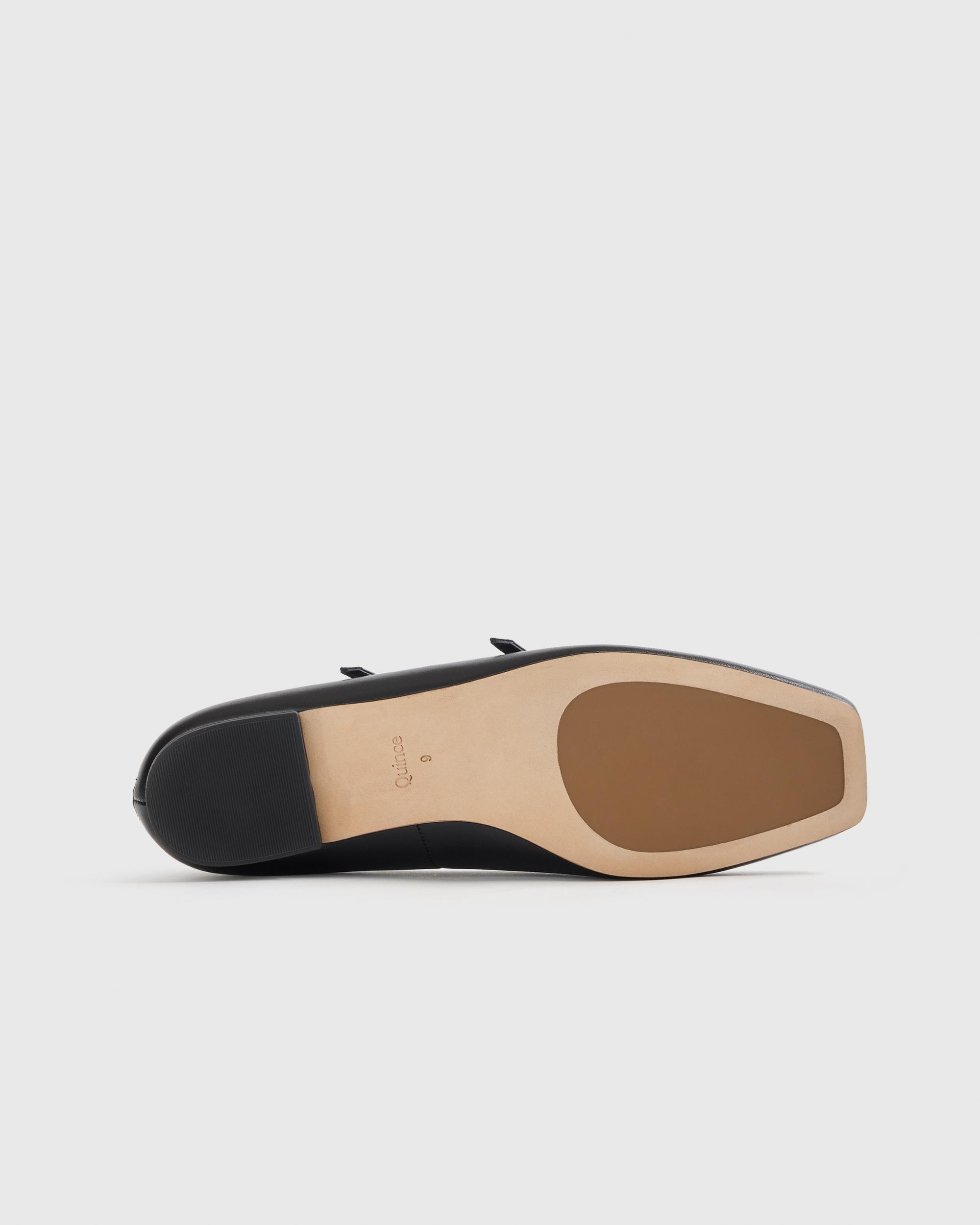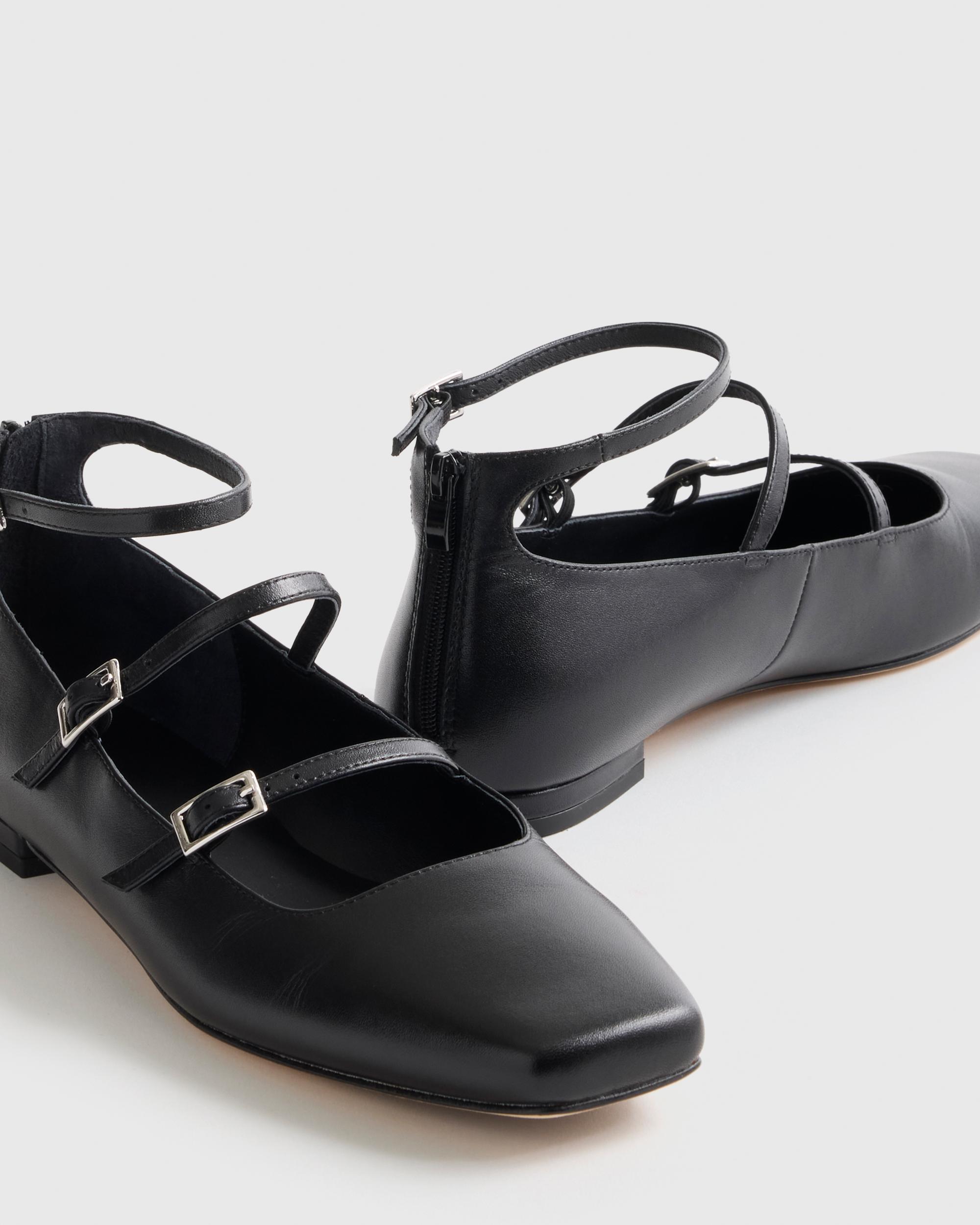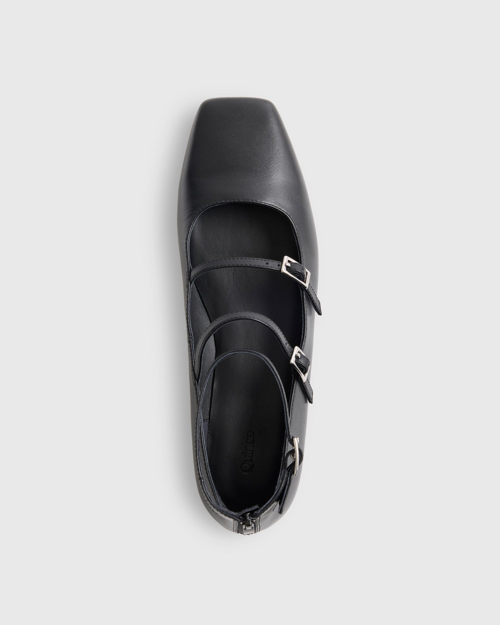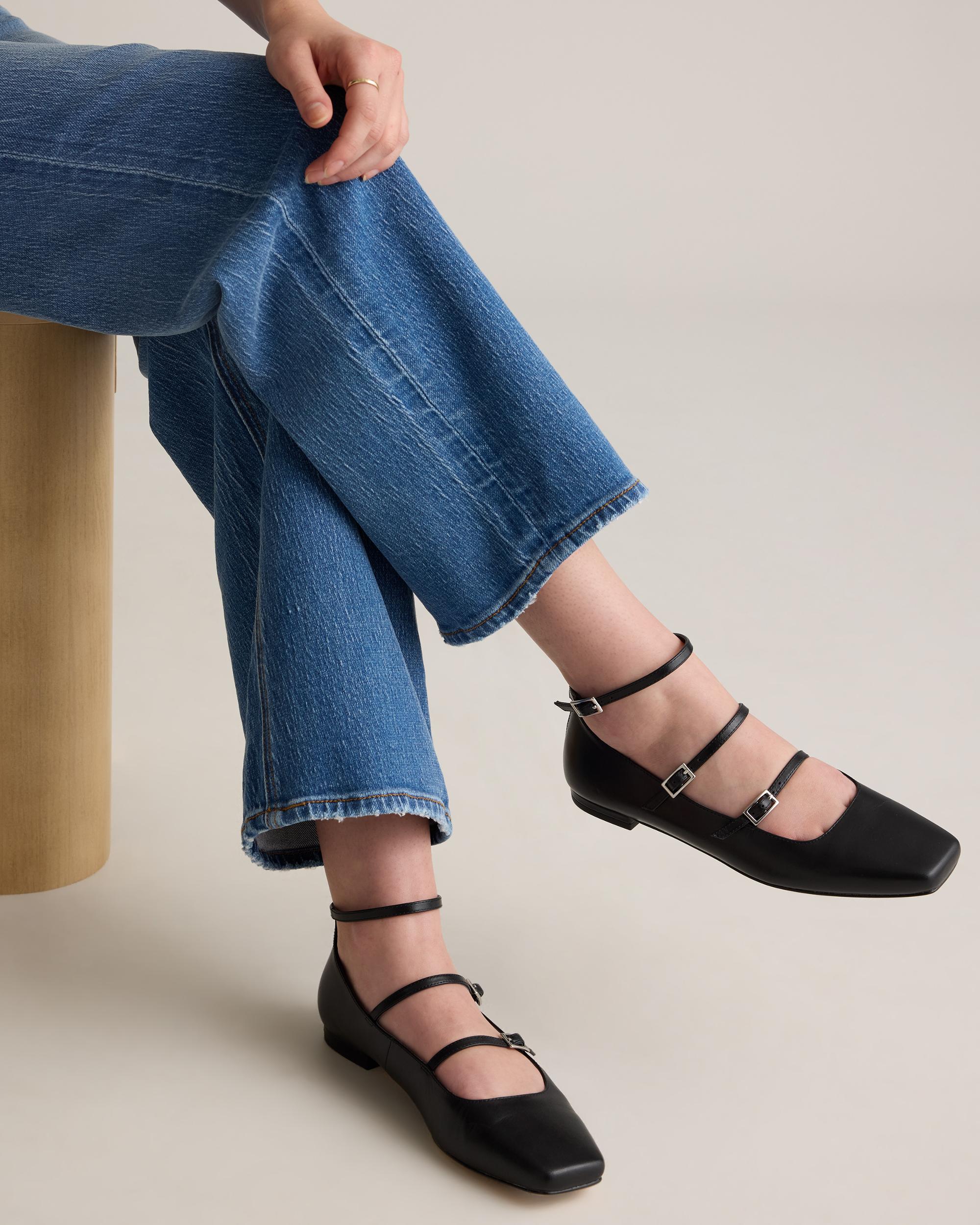 Meet our Italian Leather Strappy Ballet Flats, the epitome of elegance and sophistication. Crafted from premium Italian leather, these flats feature a chic triple strap design that adds a touch of femininity to any outfit. The cushioned insoles and sleek square toe detail provides comfort and versatility, making them perfect for both casual and formal occasions. | Quince | Women's Italian Leather Strappy Ballet Flat in Black, Size 5