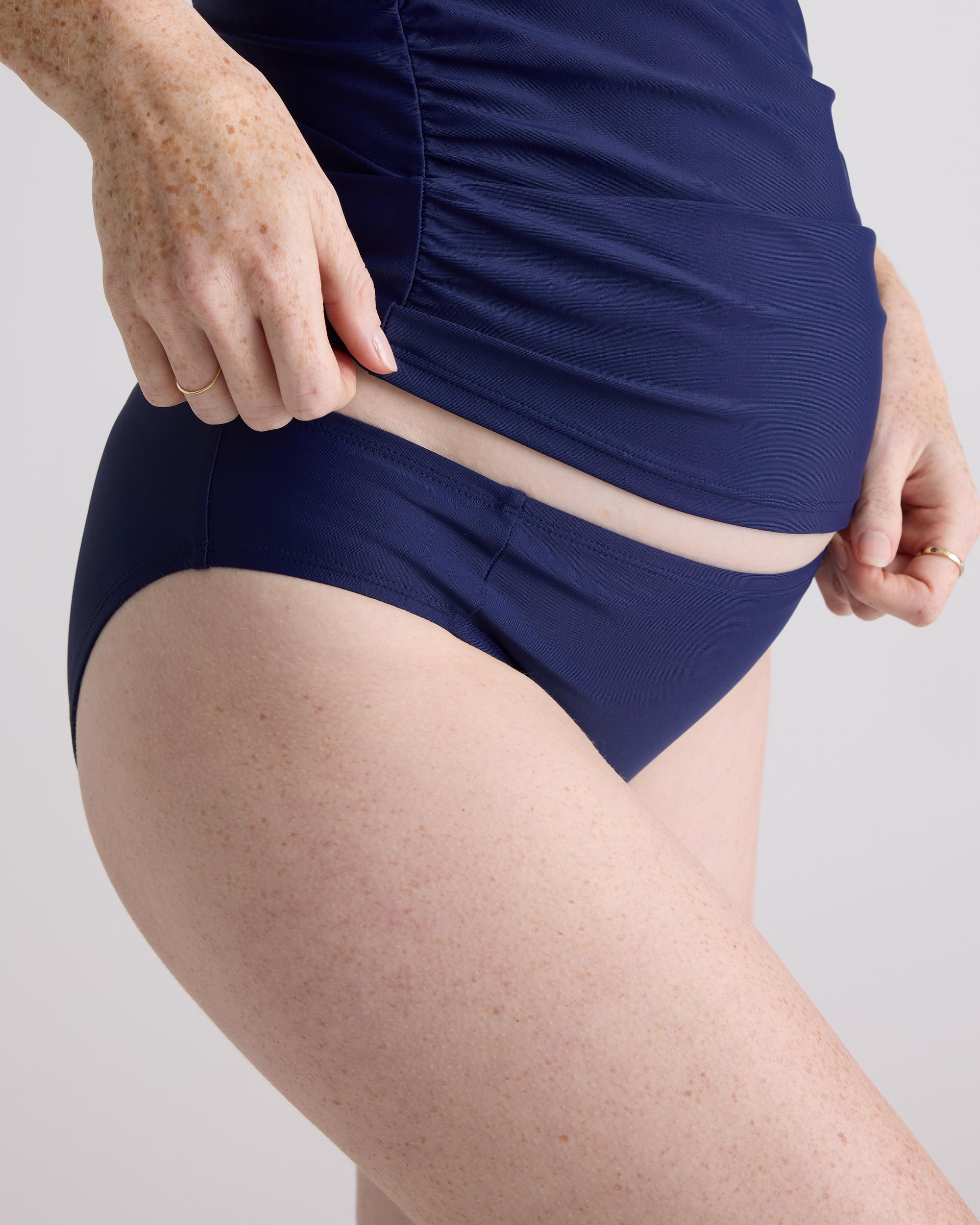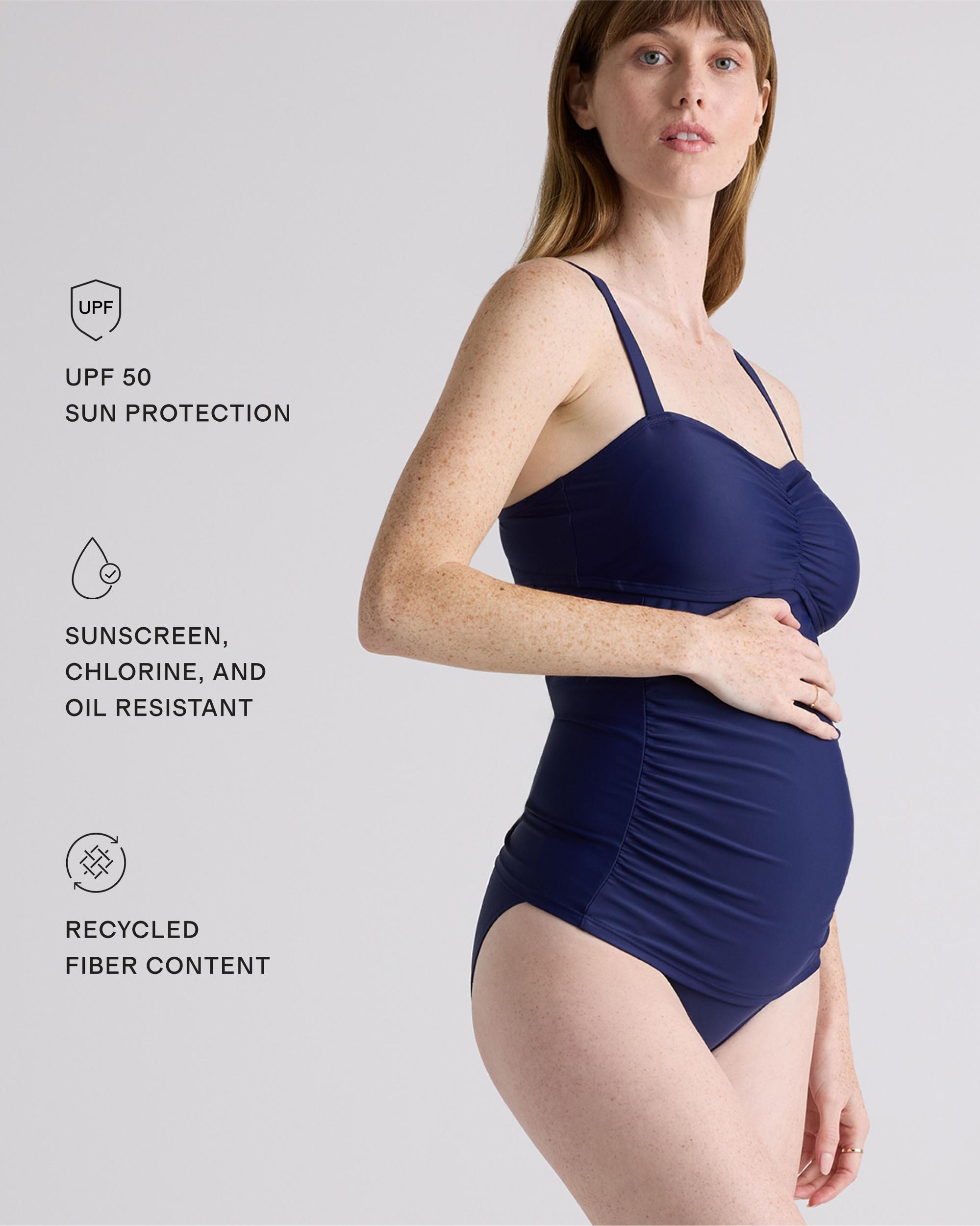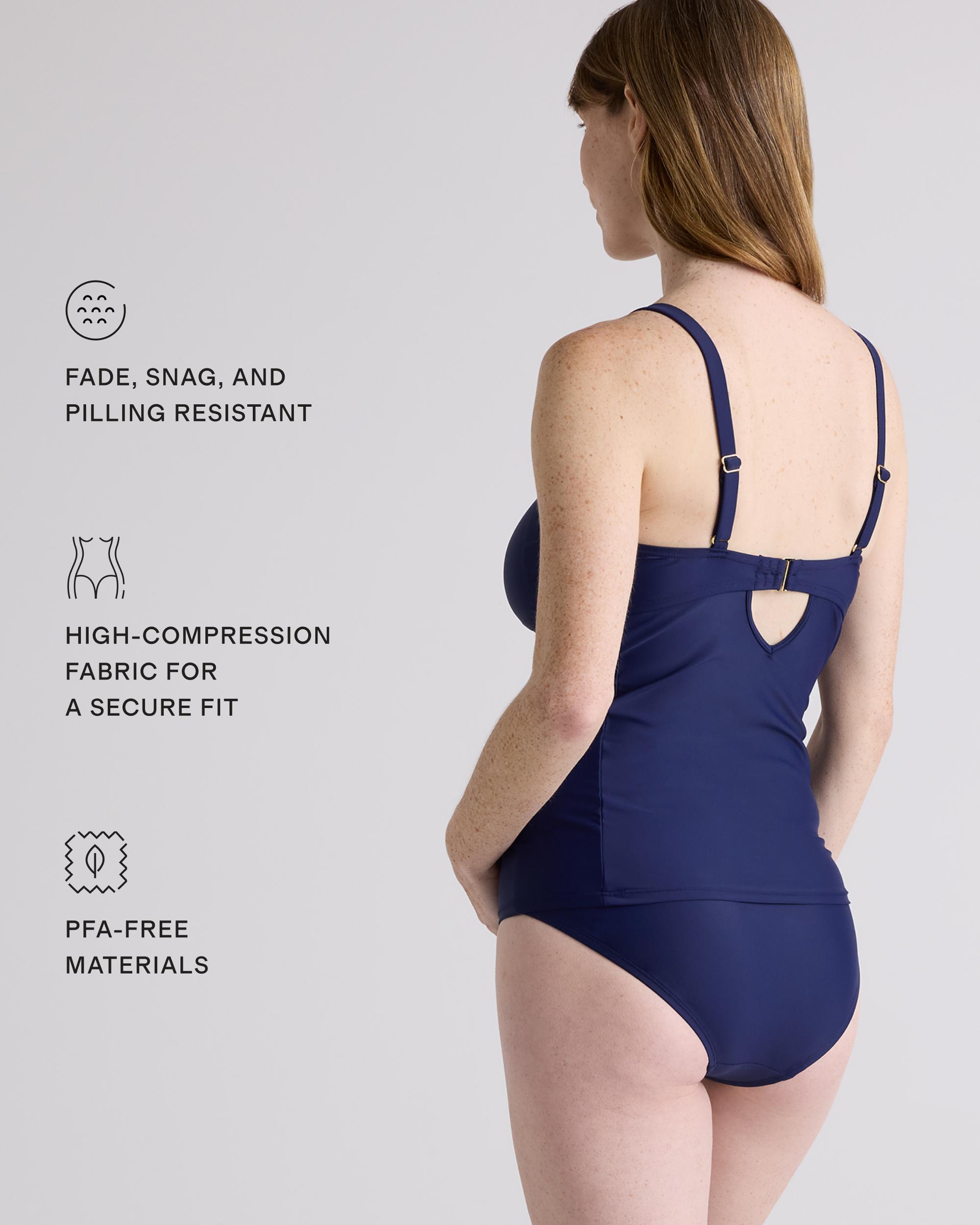 This timeless maternity two-piece tankini swimsuit is a triple threat: made to last, made with Italian-crafted fabric and thoughtfully made with recycled materials. With moderate backside coverage, it feels comfy and secure thanks to compressive fabric and expert craftsmanship. Thanks to the fabric that's resistant to fading, pilling, and snagging, this will be your go-to suit for pregnancy. | Quince | Women's Italian Maternity Two-Piece Tank Topini Swimsuit in Deep Navy, Size Large, 78% Recycled Polyamide, 22% Spandex