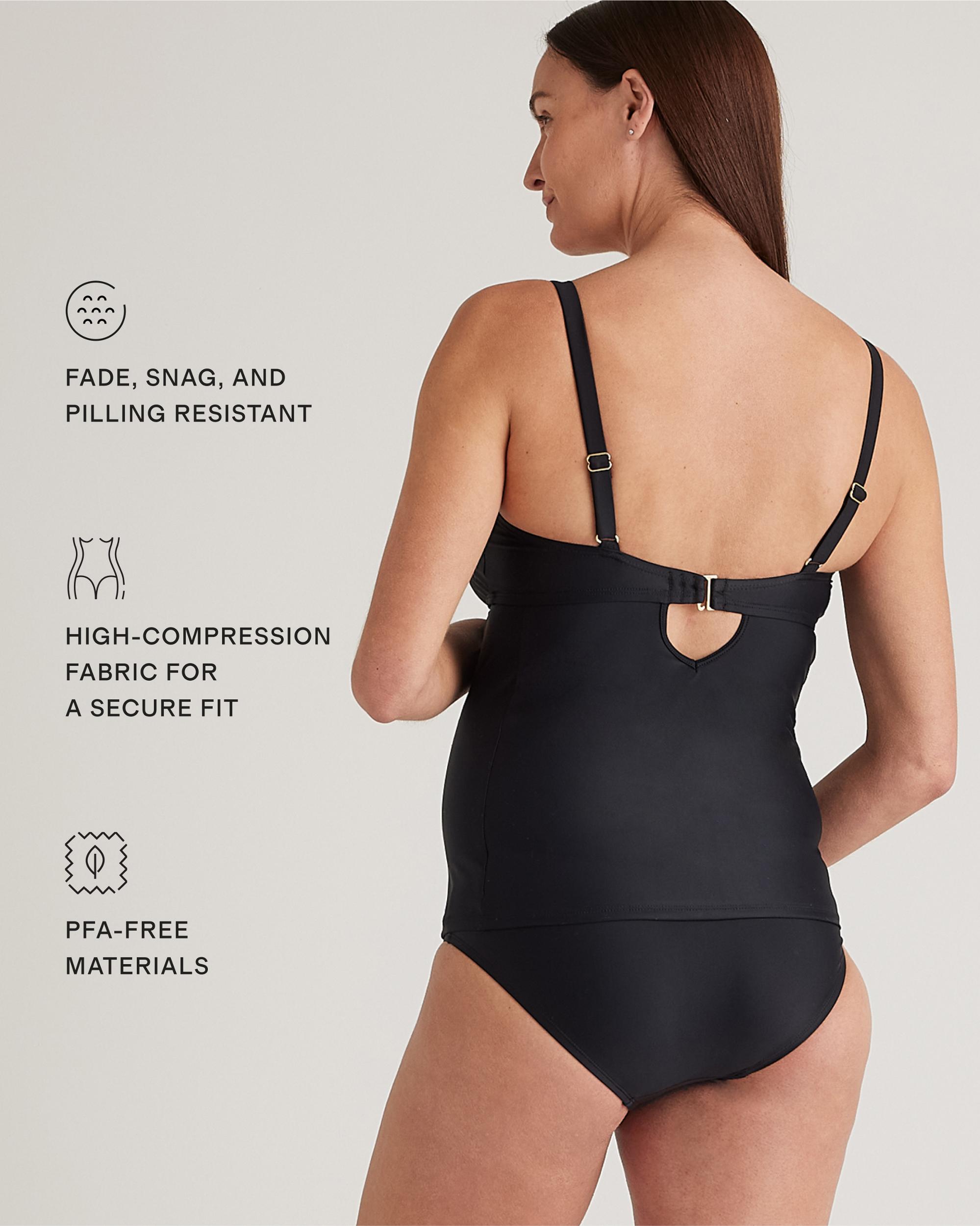 This timeless maternity two-piece tankini swimsuit is a triple threat: made to last, made with Italian-crafted fabric and thoughtfully made with recycled materials. With moderate backside coverage, it feels comfy and secure thanks to compressive fabric and expert craftsmanship. Thanks to the fabric that's resistant to fading, pilling, and snagging, this will be your go-to suit for pregnancy. | Quince | Women's Italian Maternity Two-Piece Tank Topini Swimsuit in Black, Size Large, 78% Recycled Polyamide, 22% Spandex