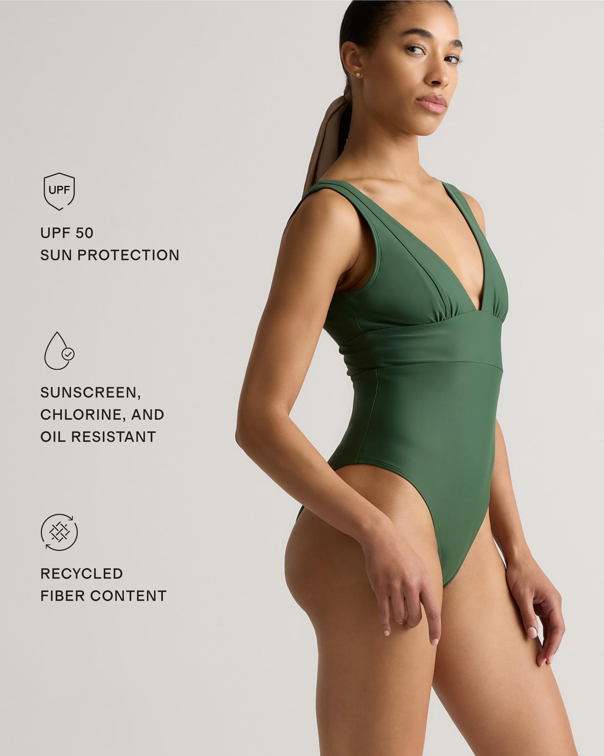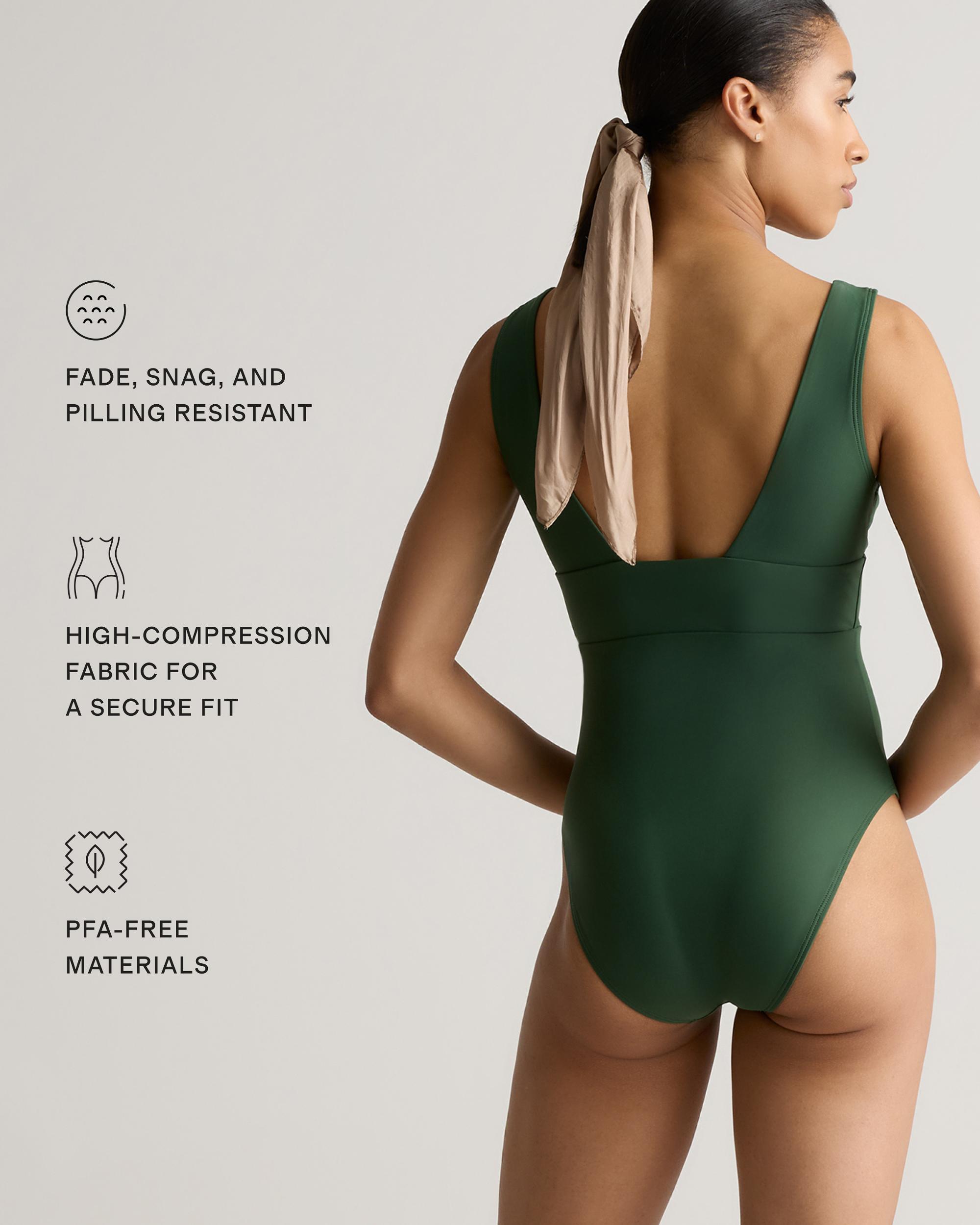 This one-piece swimsuit is a triple threat: It was made to last, made with Italian-crafted fabric, and thoughtfully made with recycled materials. With a dramatic plunge design and moderate backside coverage, it feels comfy and secure thanks to compressive fabric and expert craftsmanship. Resists fading, pilling, and snagging, so you'll be wearing it for years to come. | Quince | Women's Italian Plunge One-Piece Swimsuit in Palm, Size Medium, 78% Recycled Polyamide, 22% Spandex