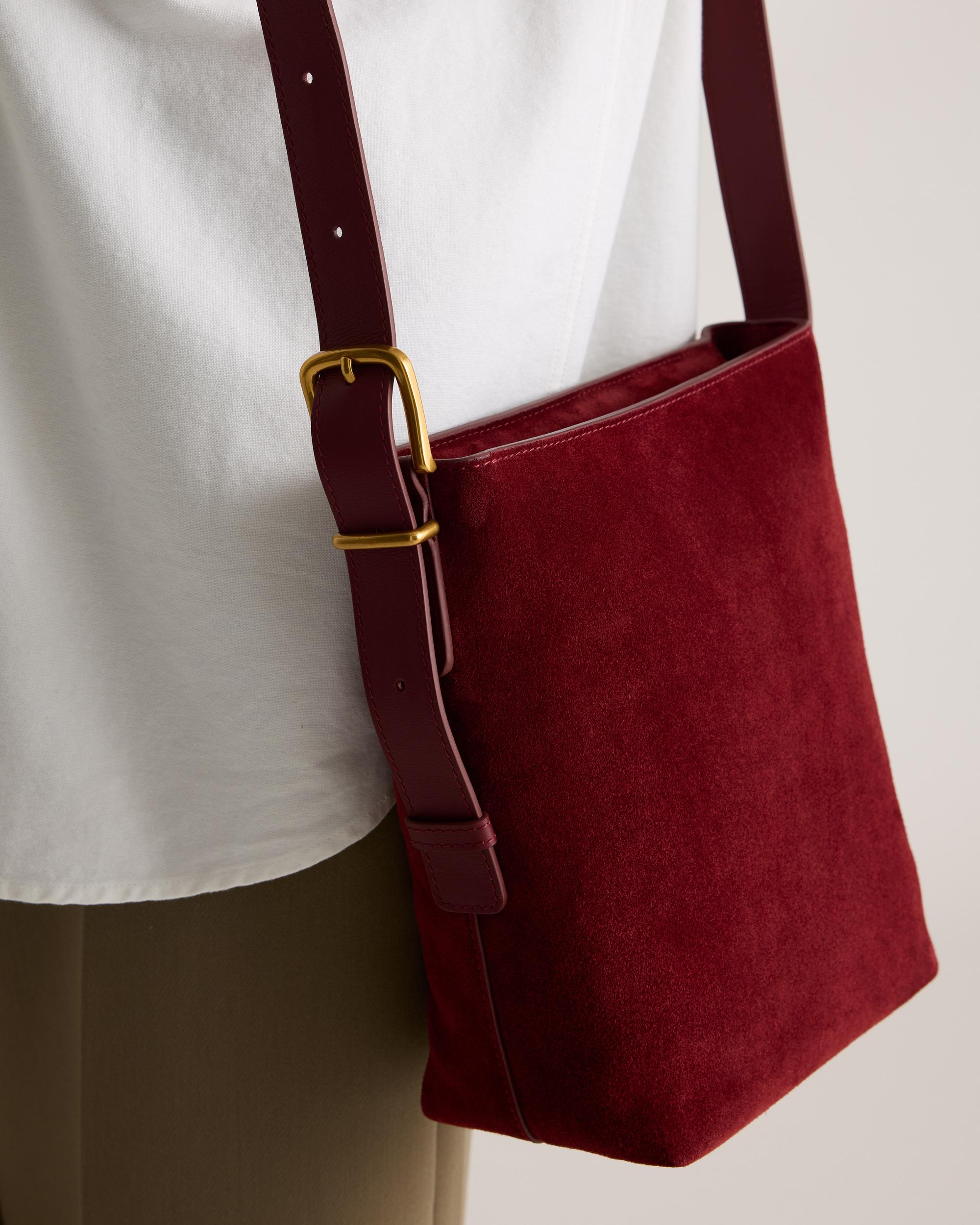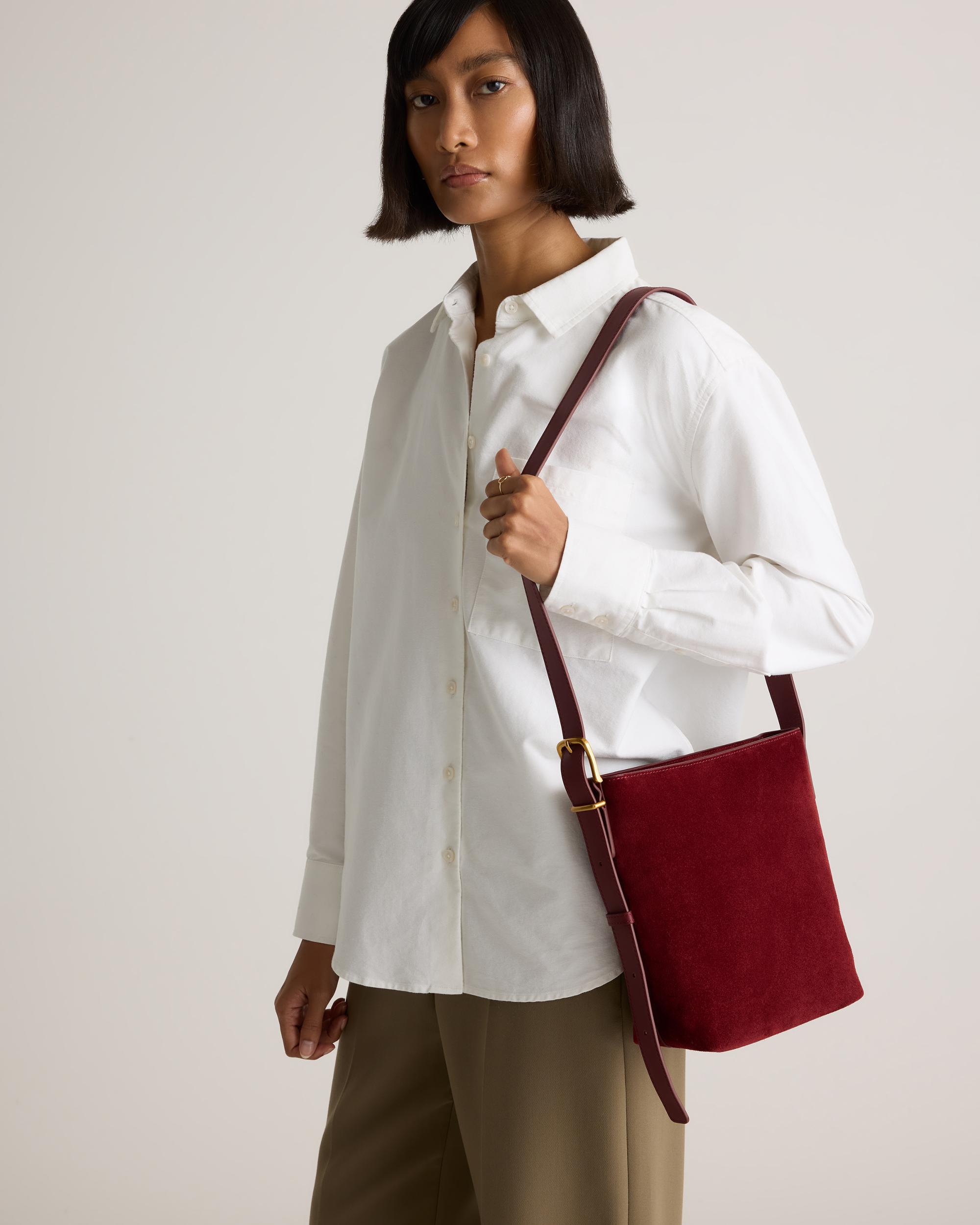 Introducing our Italian Suede Bucket Crossbody, the must have fall accessory. Crafted from buttery soft Italian suede with nappa leather trims, this beauty is sure to add a hint of luxury to any look. We guarantee you'll be reaching for this bag all season long. | Quince | Women's Italian Suede Bucket Crossbody in Merlot, Suede Leather