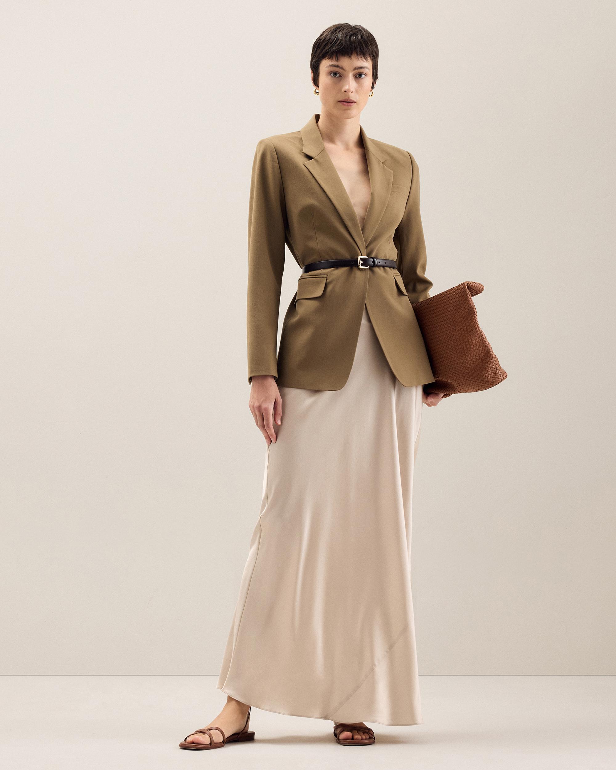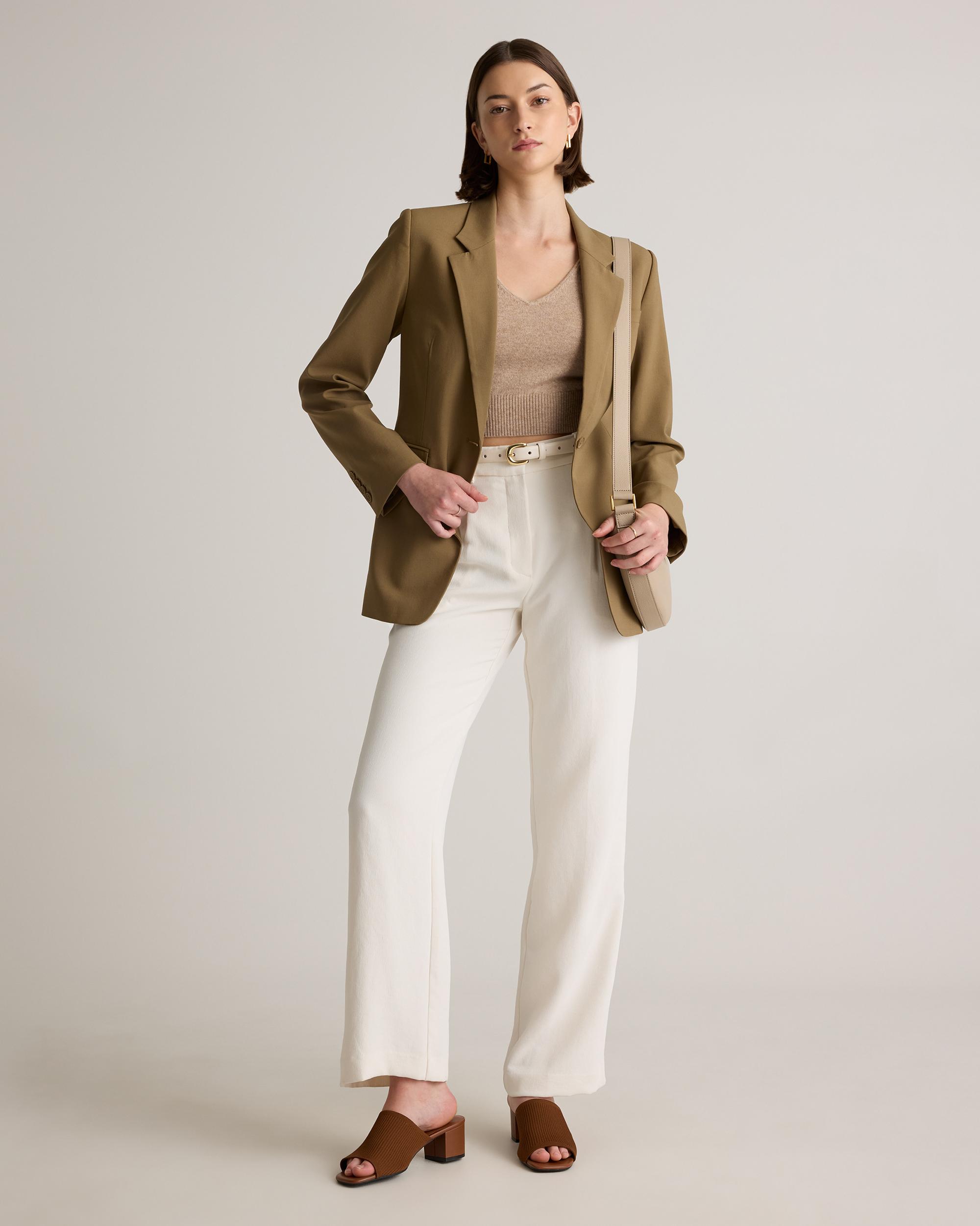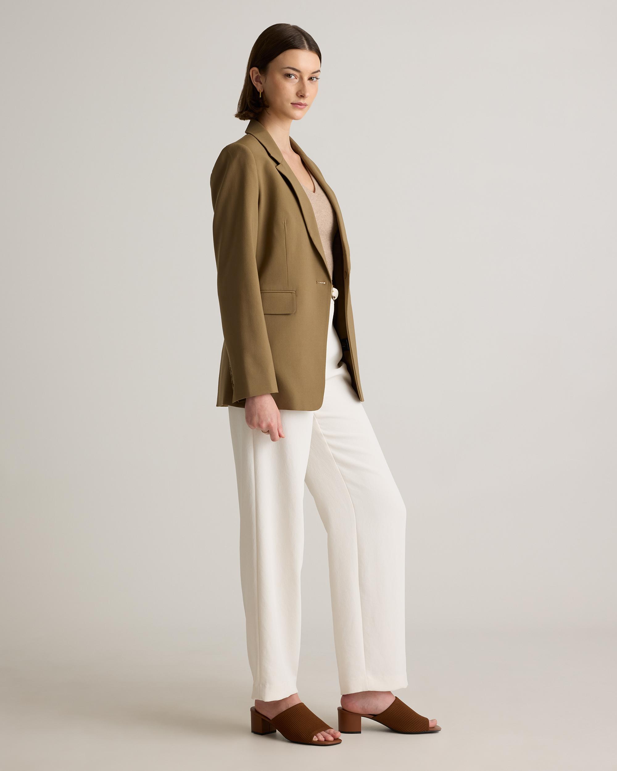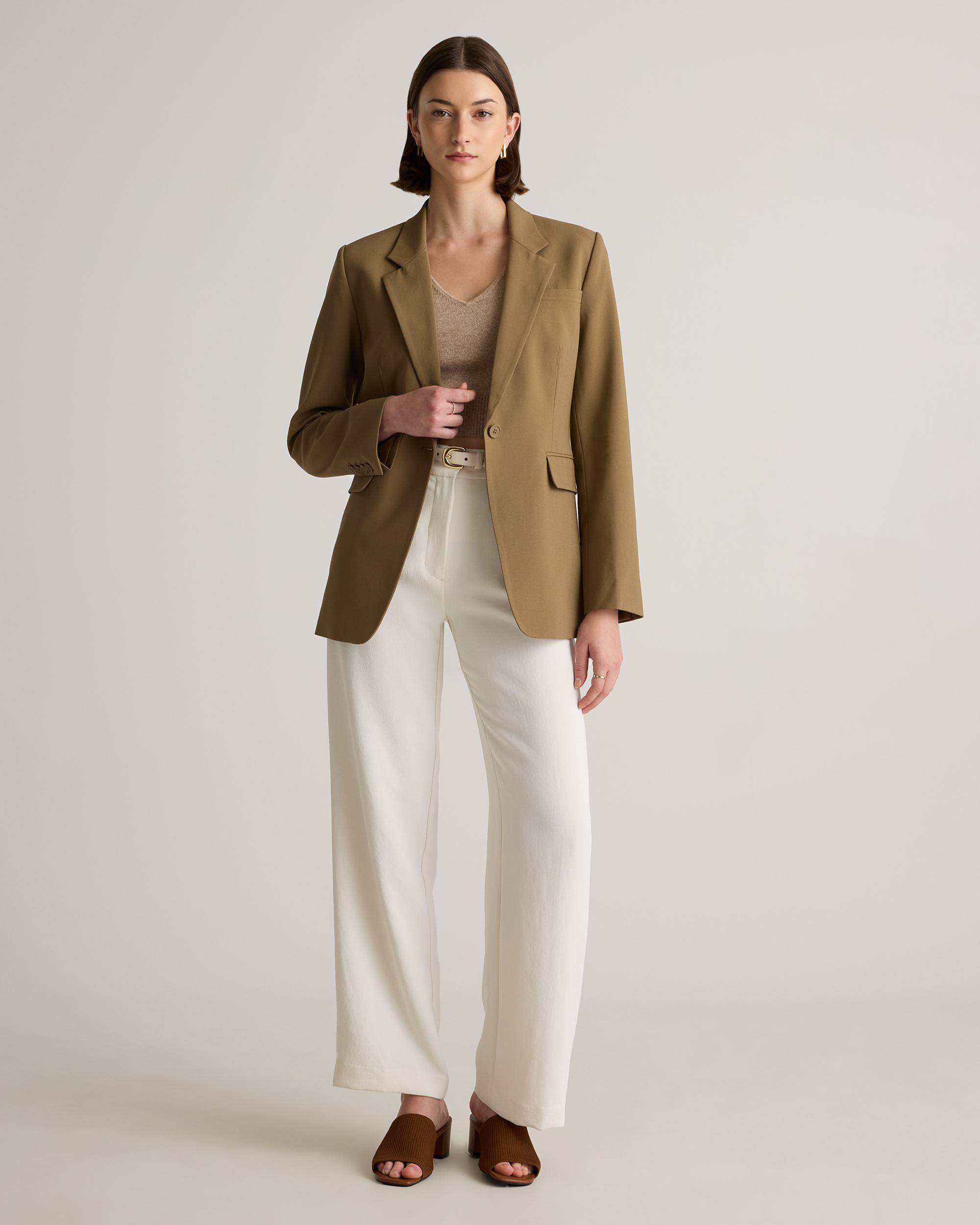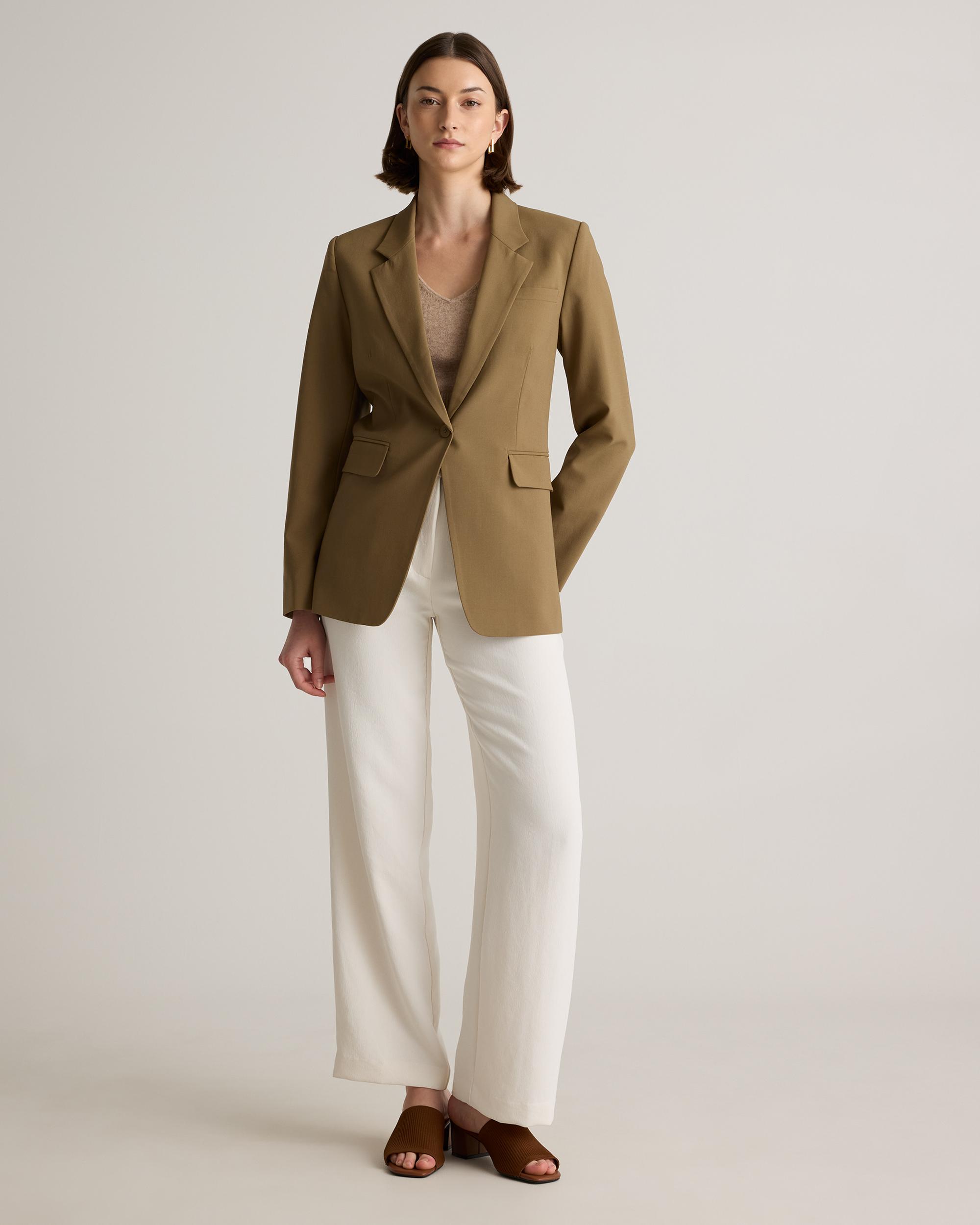 Our Italian Wool Long Blazer is a sophisticated staple crafted from luxe Italian 3D Wool® for exceptional softness and warmth. The innovative fabric keeps things breathable and temperature regulated, while a unique three-dimensional structure brings crazy comfy stretch. This blazer’s sleek silhouette exudes elegance that pairs effortlessly with jeans or our Italian Wool pants for versatile styling. | Quince | Women's Italian Wool Long Blazer in Sahara Camel, Size XL