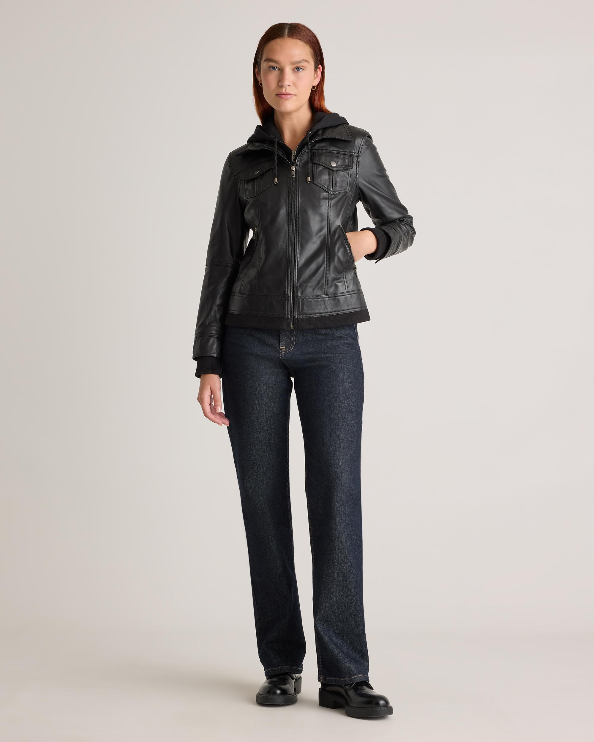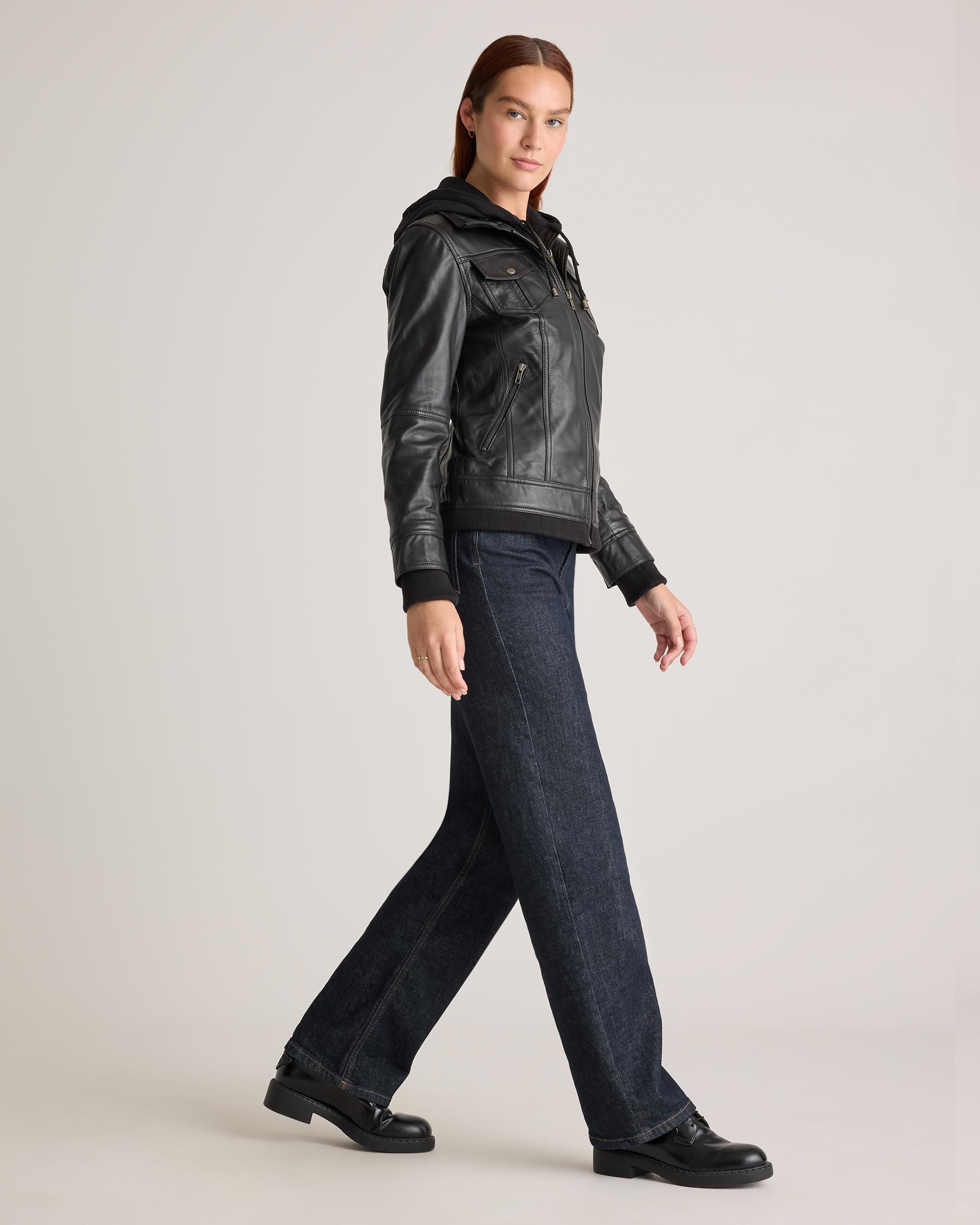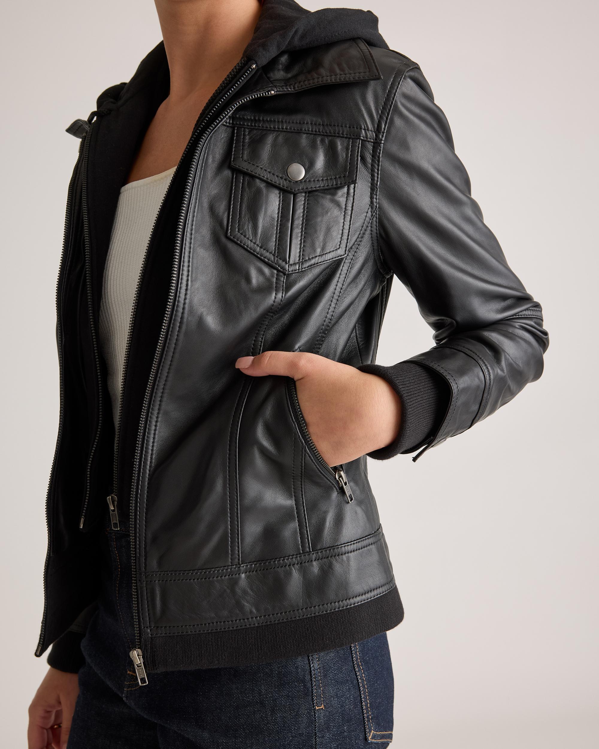 Made from 100% top grain leather, this jacket comes in a classic, timeless design. So comfortable and stylish, you'll be happy wearing it again and again. Read more about what makes our leather special in our Leather 101 guide. | Quince | Women's Jacket with Hood in Black, Size Large, Leather
