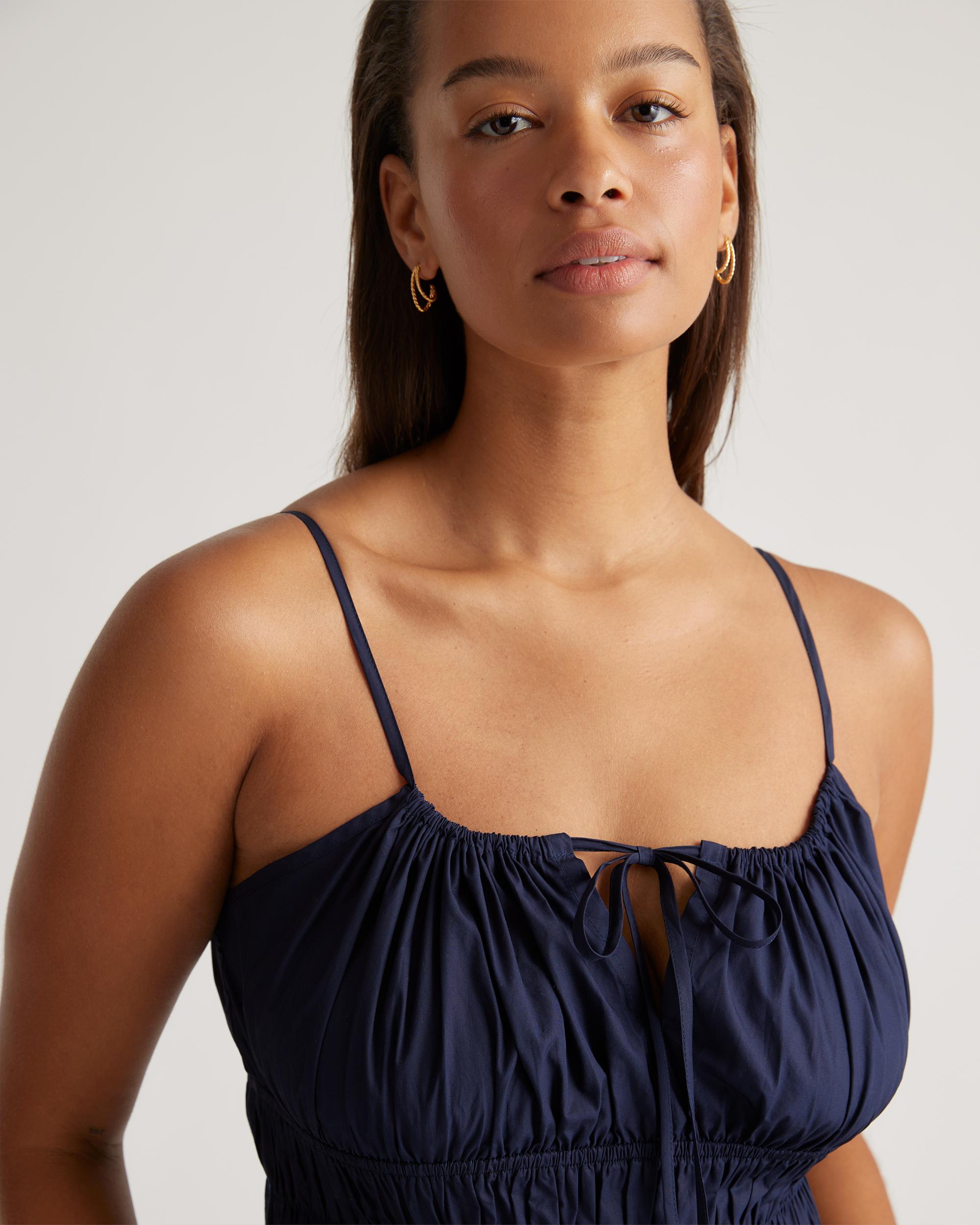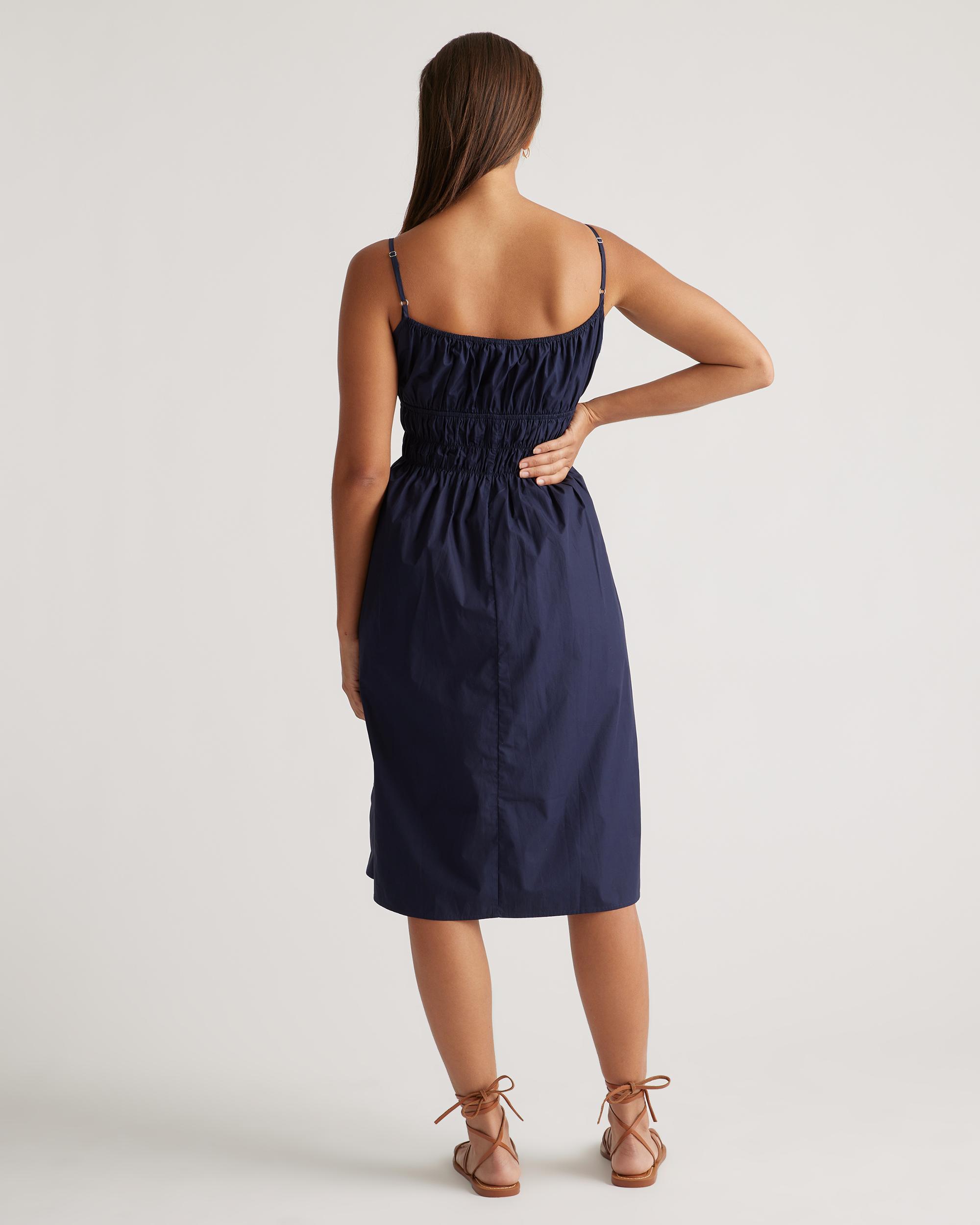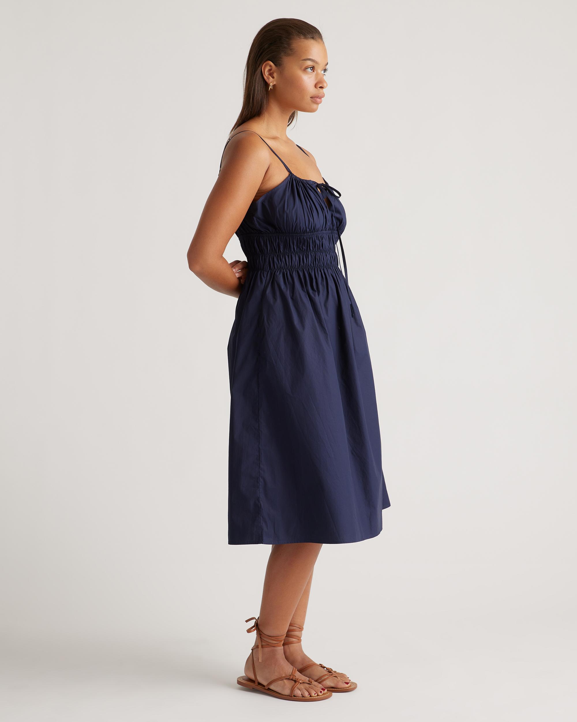 Discover the effortless charm of our 100% Organic Cotton Keyhole Midi Dress. Crafted with care from premium organic cotton poplin, this must-have dress has a cool, crisp look and a lightweight feel. The smocked bodice hugs your ribs in a flattering yet comfortable way, while the front tie and adjustable straps allow you to customize the fit. Best part: it has pockets! Easy to dress up or down, this chic silhouette works for a range of occasions. | Quince | Women's Keyhole Midi Dress in Navy, Size XL, Organic Cotton