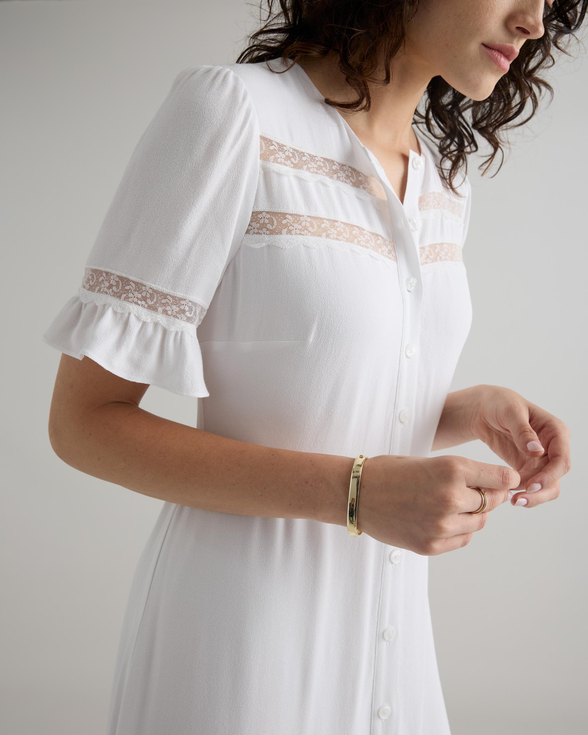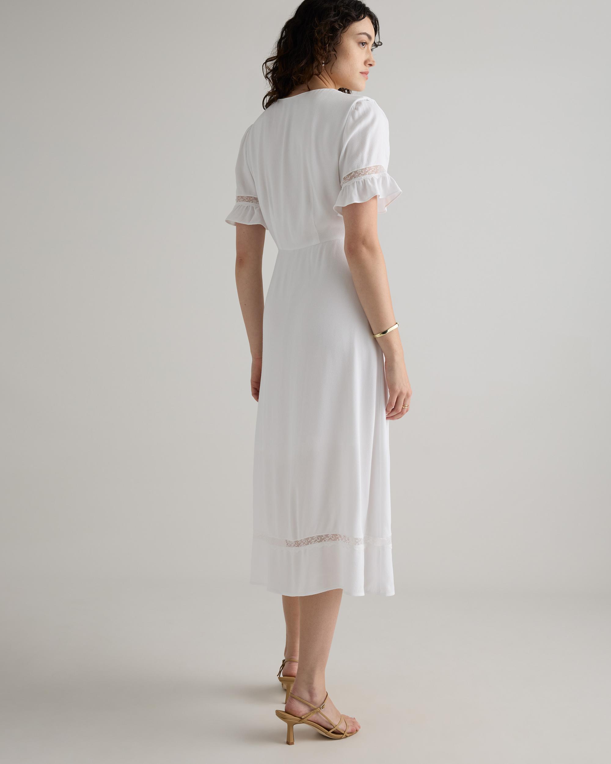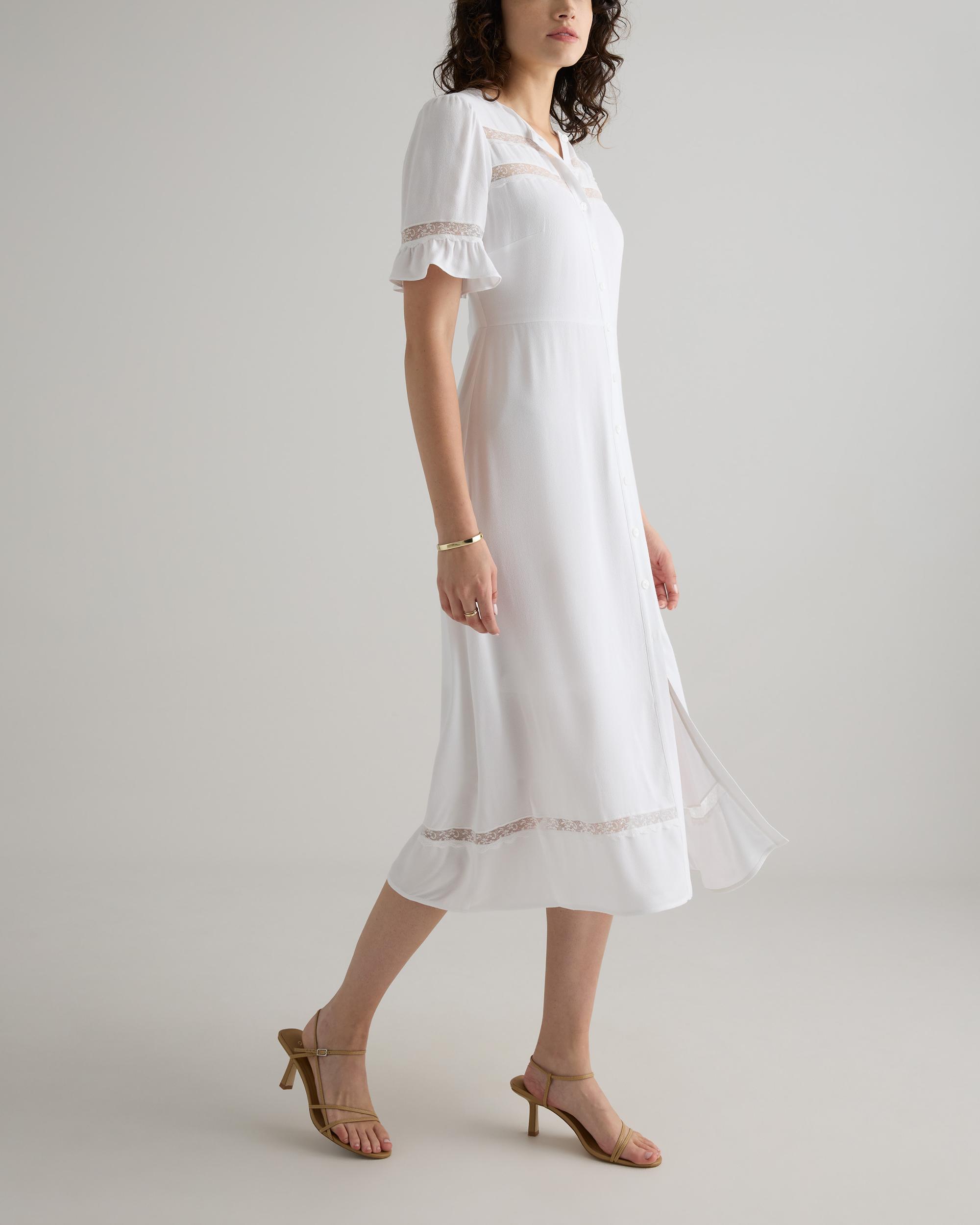 Discover the timeless charm of our Lightweight Crepe Lace Inset Midi Dress. Made from a breathable, drapey fabric and featuring quarter-length flutter sleeves, this body skimming dress is perfect for any summer occasion. The intricate lace details add a romantic touch to this classic button front design. | Quince | Women's Lightweight Crepe Lace Inset Midi Dress in Ivory, Size Small, Viscose