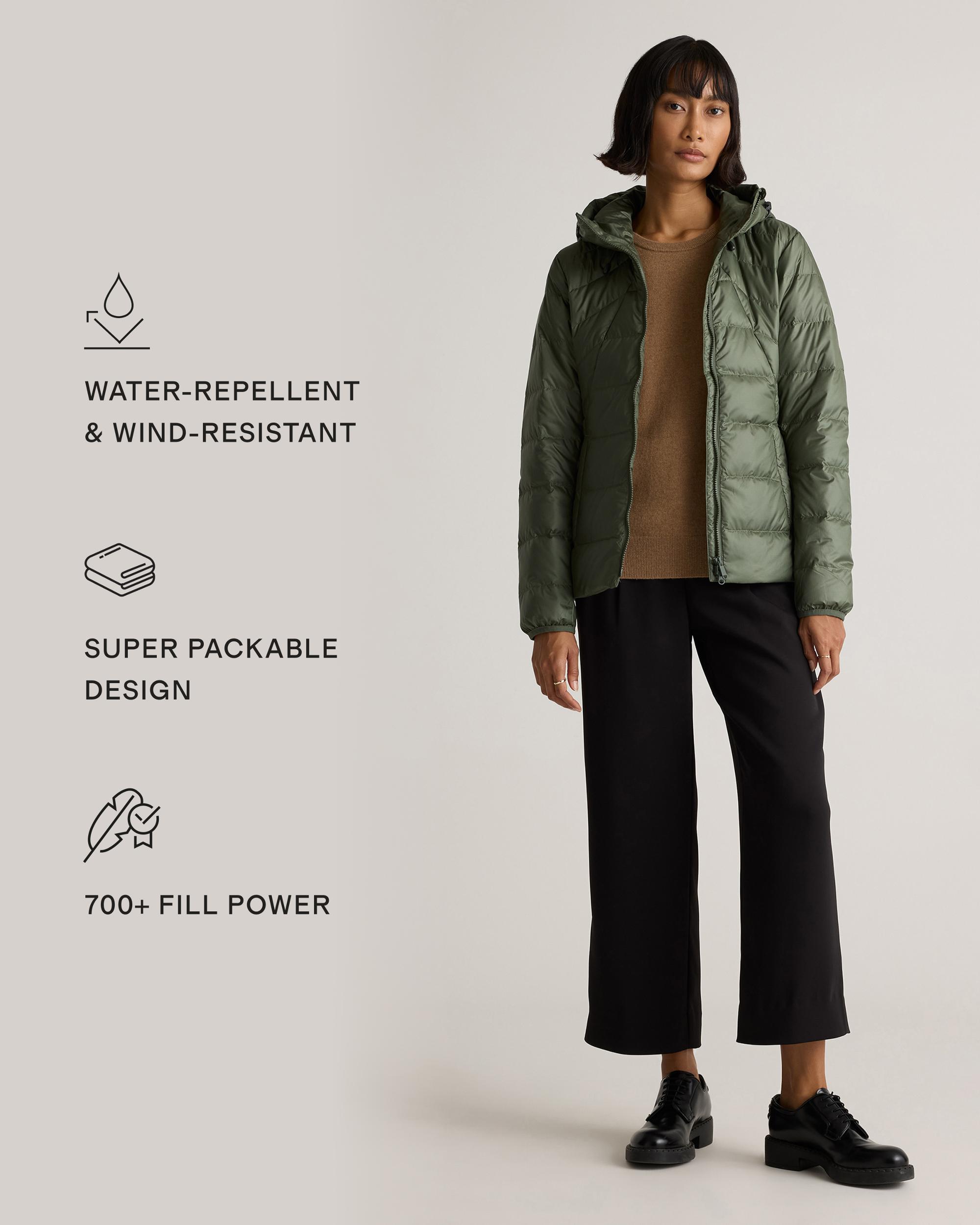 A conveient layer to have on hand, our Lightweight Down Packable Puffer Hooded Jacket packs into a pocket that you can toss into your bag. Designed to keep you shielded from the elements, it's water-repellent and wind-resistant. Made with recycled materials and RDS certified down, this jacket embodies responsible craftsmanship. With its 700 fill power, it provides exceptional warmth—making it a perfect companion for your outdoor adventures. | Quince | Women's Lightweight Down Packable Puffer Hooded Jacket in Loden, Size Medium, Recycled Polyester