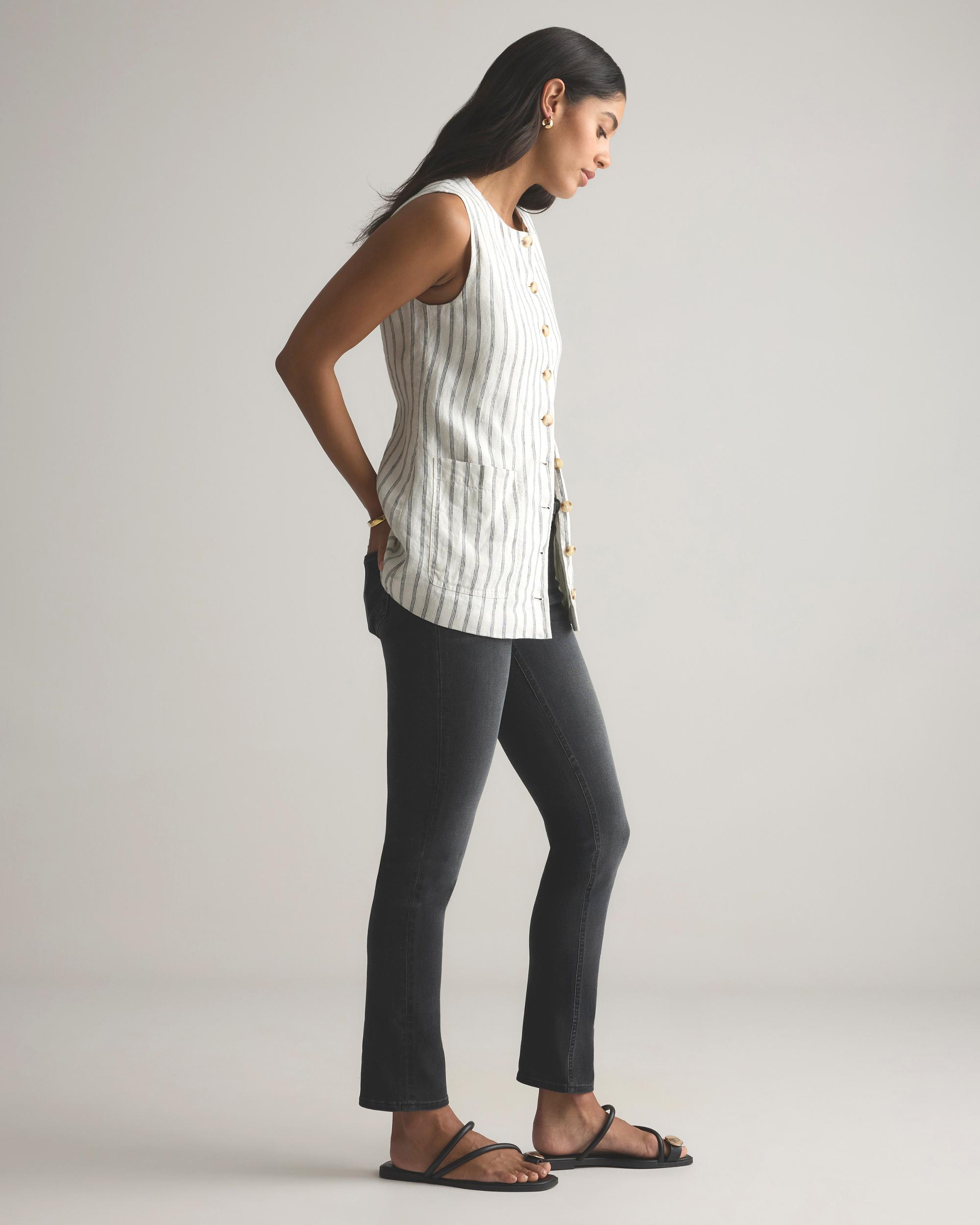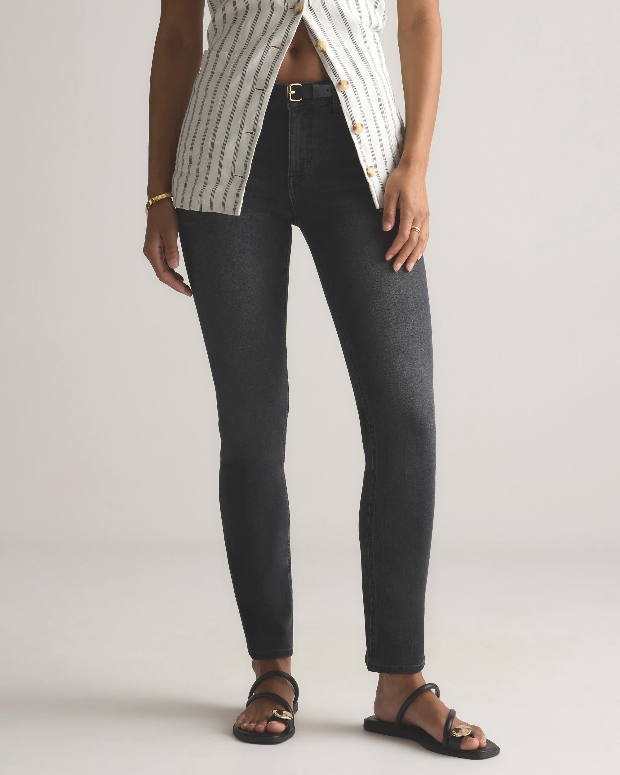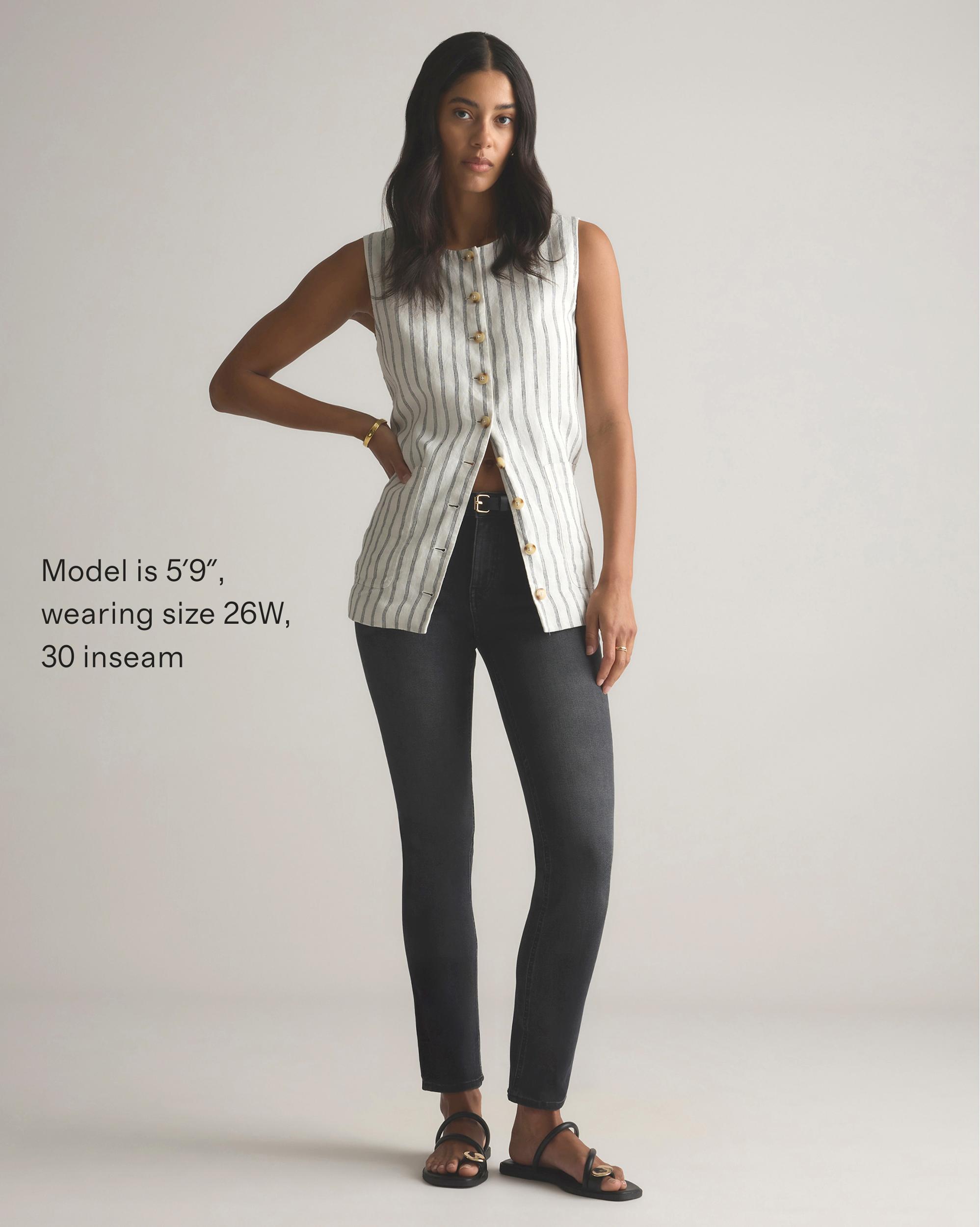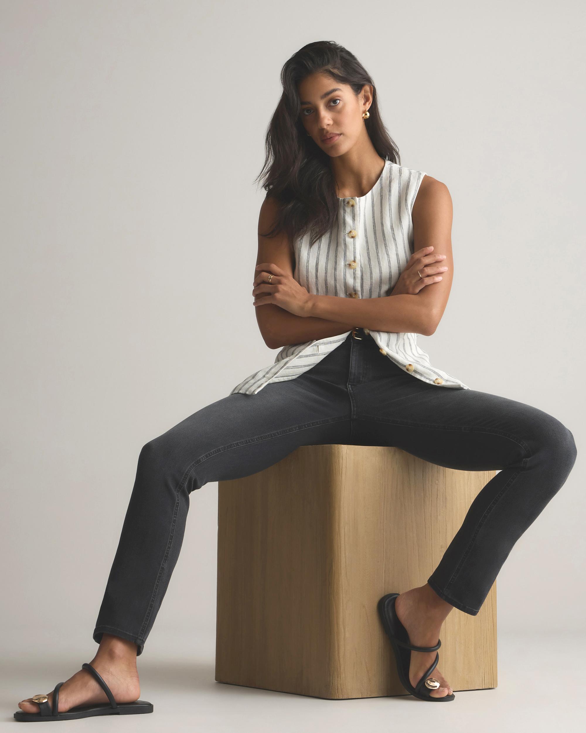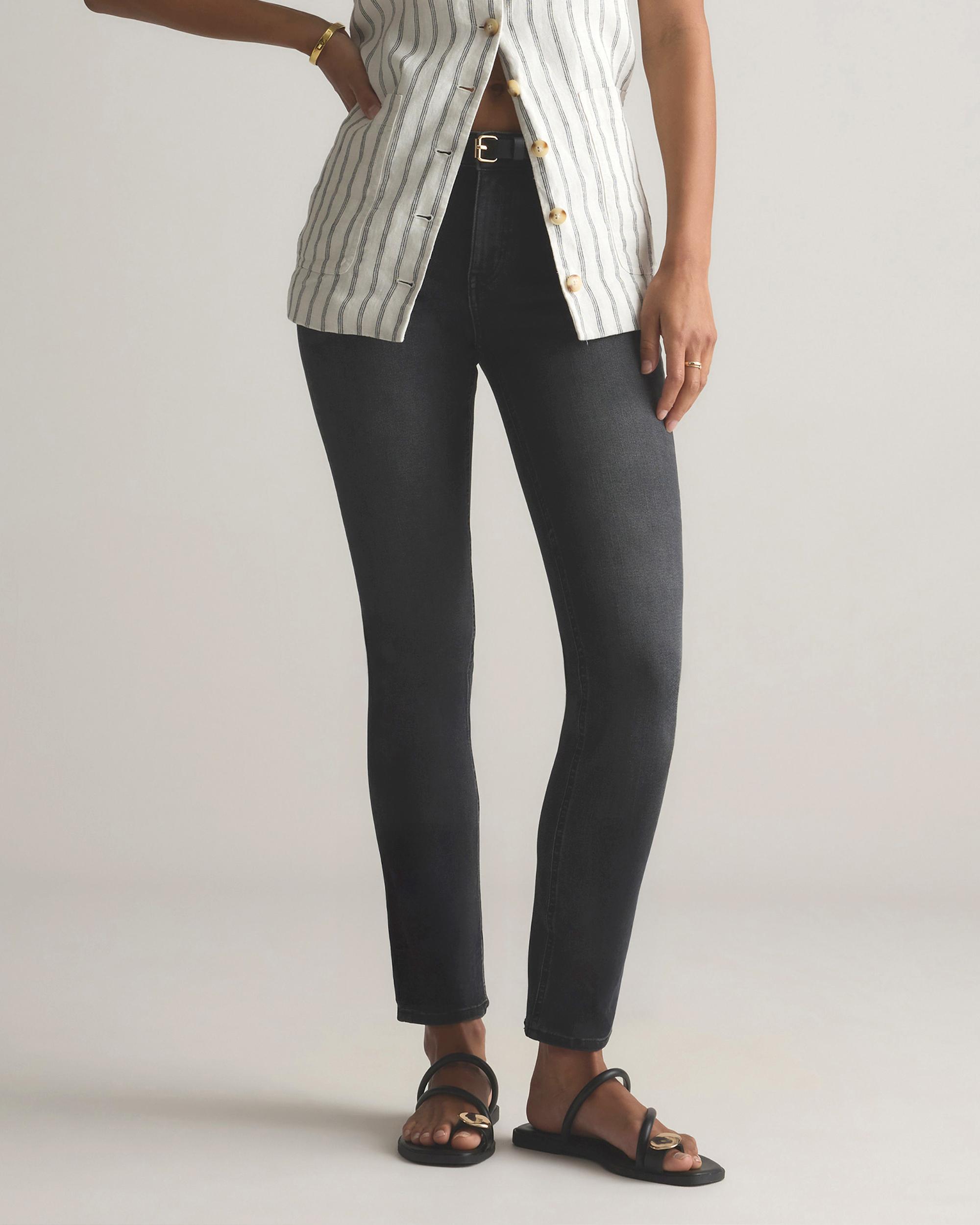 The ideal skinny-straight hybrid with a just-right ankle length. Our Luna Stretch Slim Straight Jeans have a sleek and flattering silhouette with a mid rise and subtly fitted hip and thigh. Plus it’s crafted from premium super stretch denim with organic cotton for a flexible fit and impossibly soft feel. It’s the comfy pair you’ll always reach for. | Quince | Women's Luna Stretch Slim Straight Jeans in Faded Black, Size 27, Organic Cotton