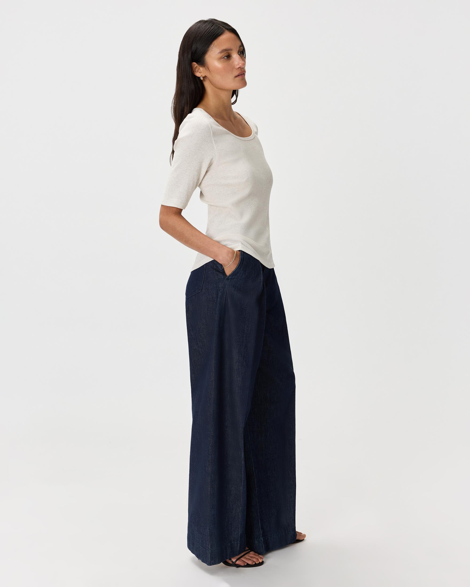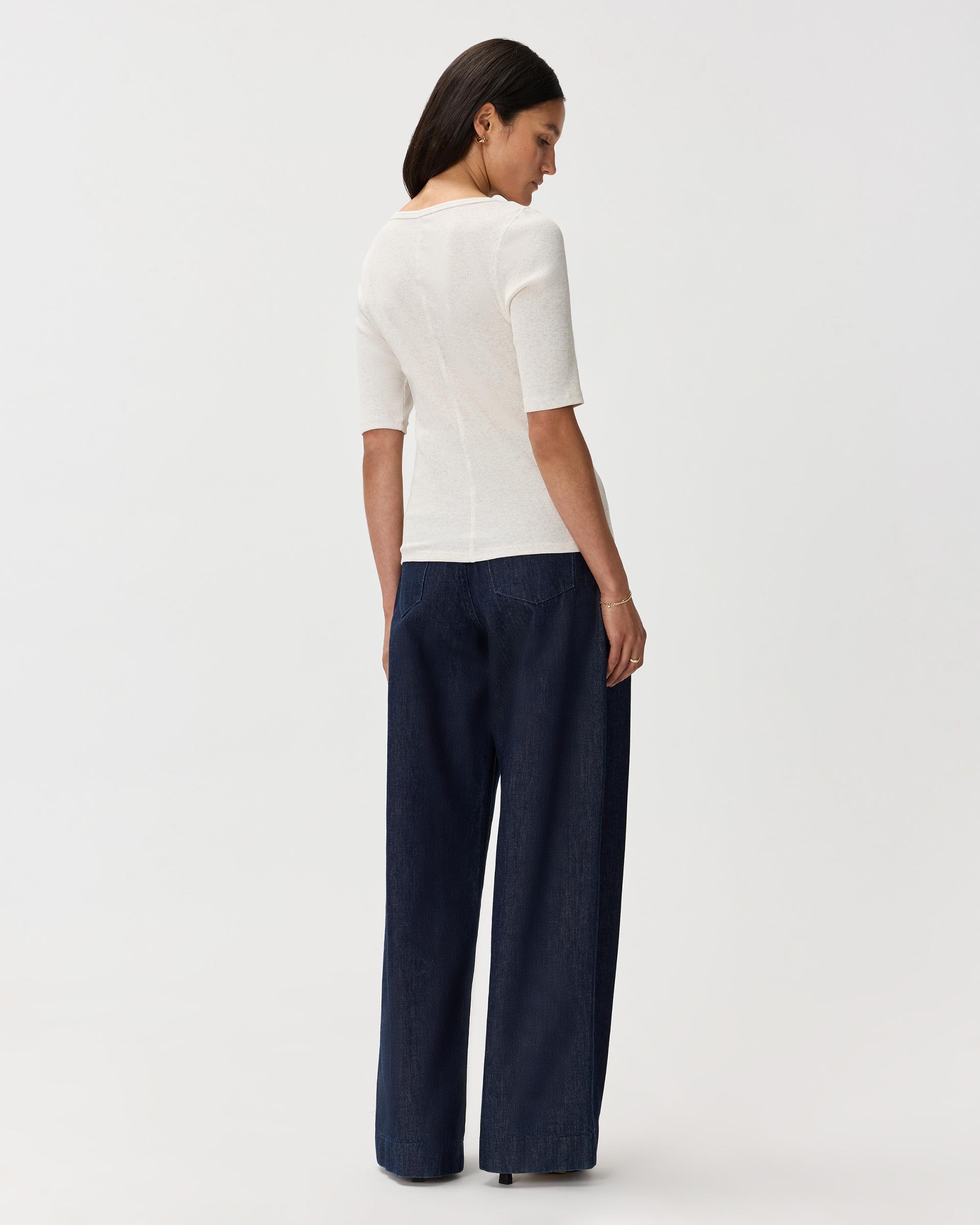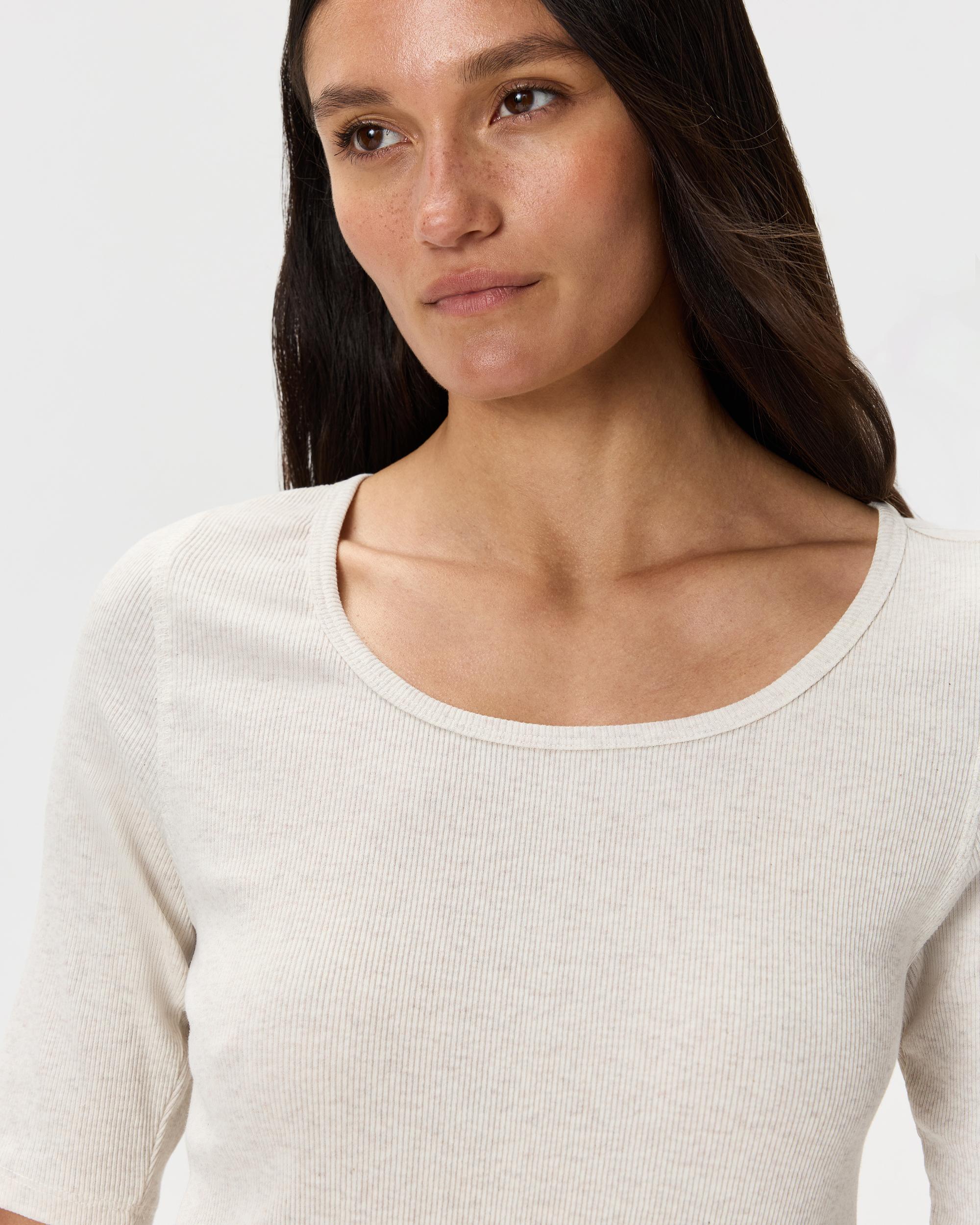 Everyday style gets an upgrade with our Organic Cotton Micro-Rib Elbow Sleeve Tee. Made from premium organic cotton, this tee offers unbeatable comfort and an always-flattering fit. Its micro rib adds a touch of texture while the classic silhouette means endless outfit options. Pair it with high-waisted jeans for an effortless look or layer it under a blazer for a little more polished. | Quince | Women's Micro-Rib Elbow Sleeve T-Shirt in Heather Oatmeal, Size Small, Organic Cotton