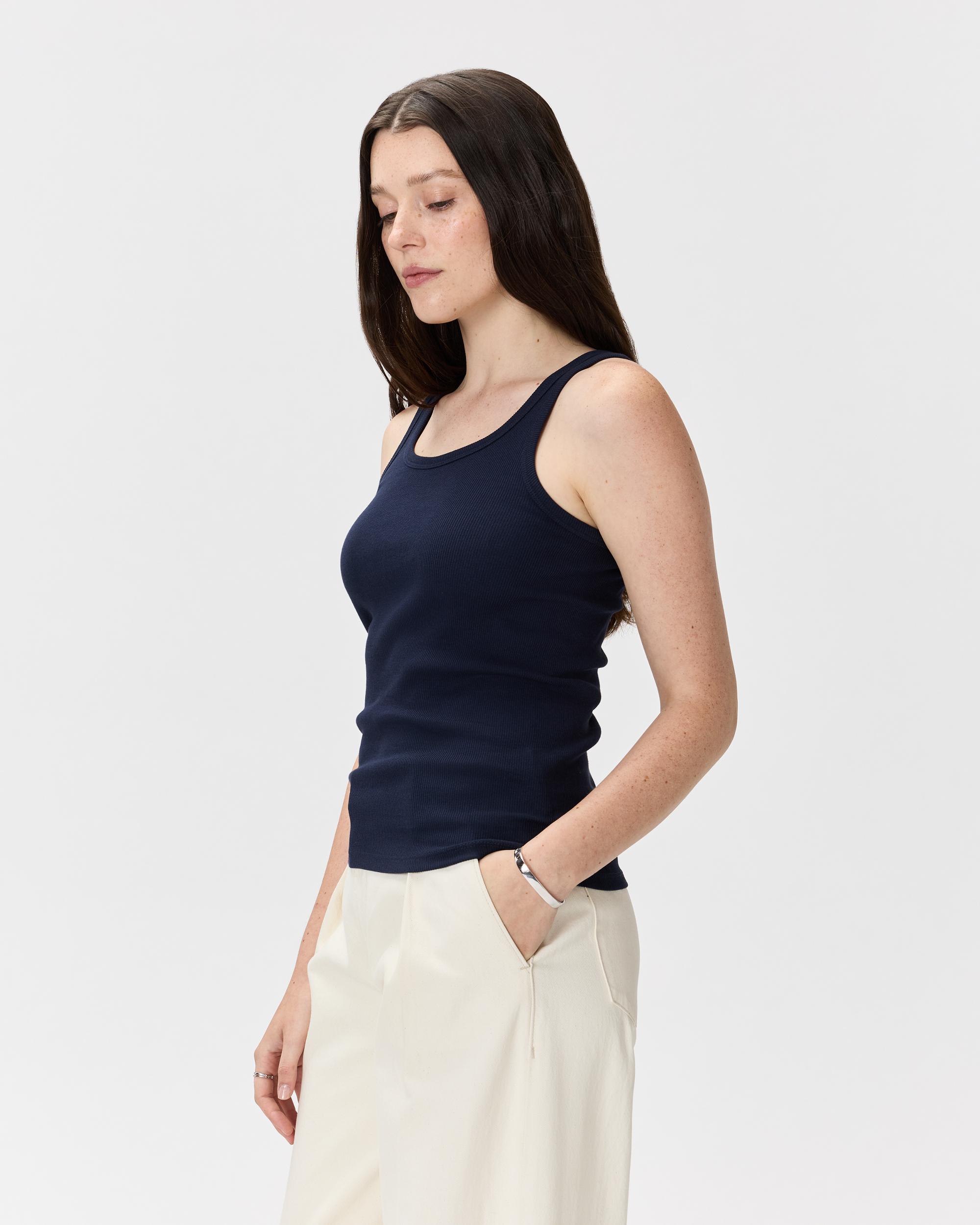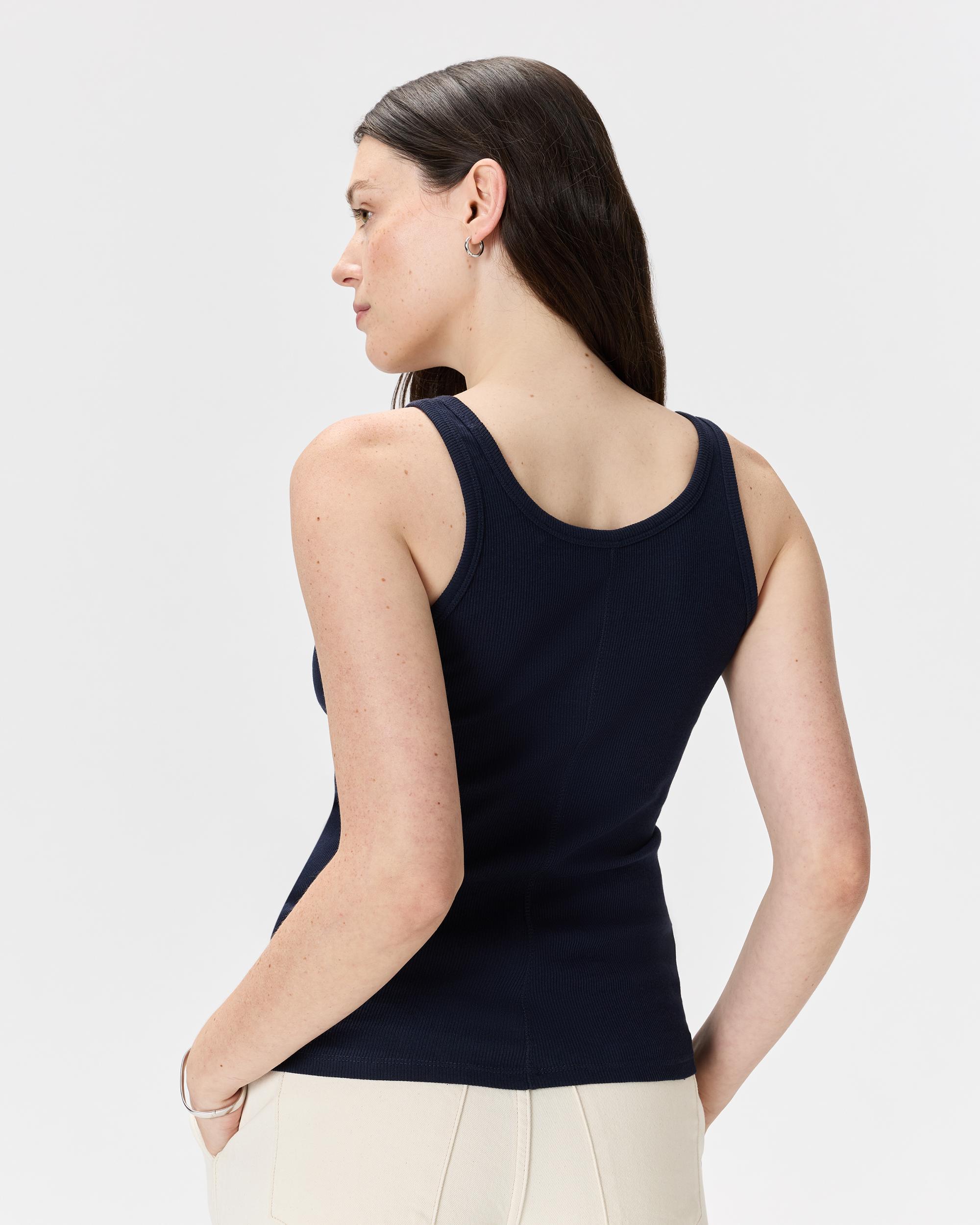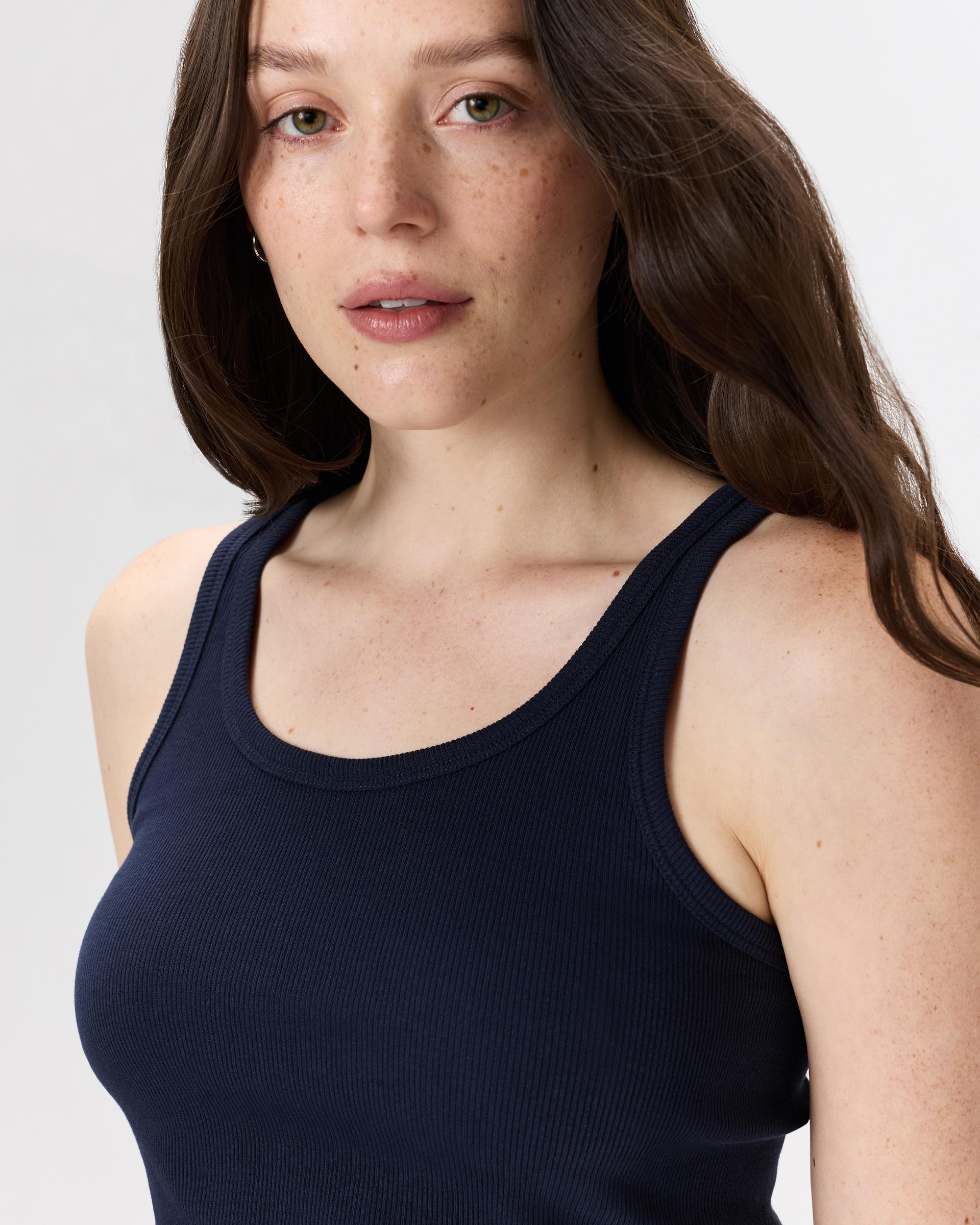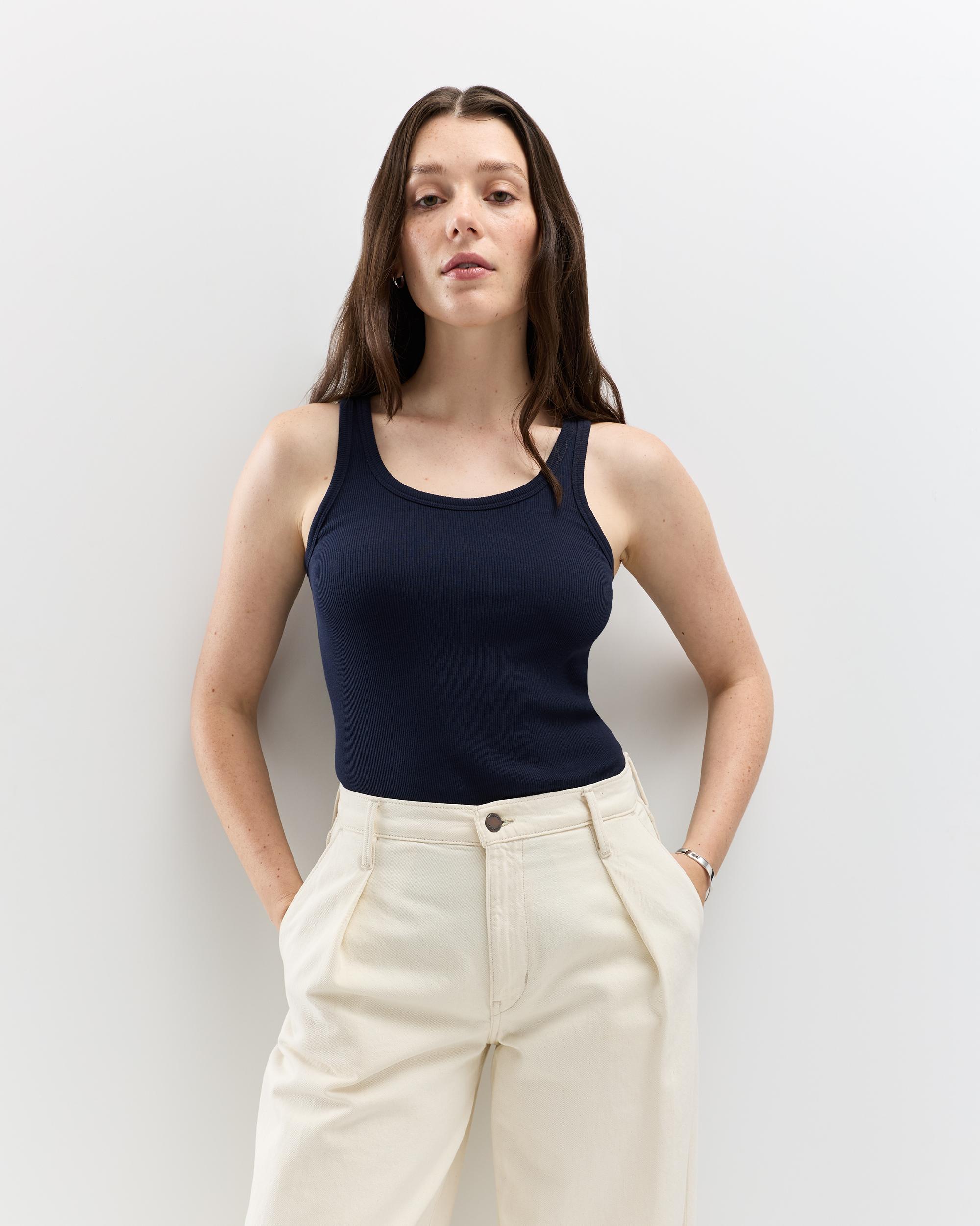 Comfort and style? Done and done with the Organic Cotton Micro-Rib Tank Top. Made from lightweight organic cotton, it's breathable, soft, and so easy to wear. You'll soon figure out it's crazy versatile—perfect to wear alone or as a layering piece with your favorite cardis and blazers. | Quince | Women's Micro-Rib Scoop Neck Tank Top in Deep Navy, Size XL, Organic Cotton