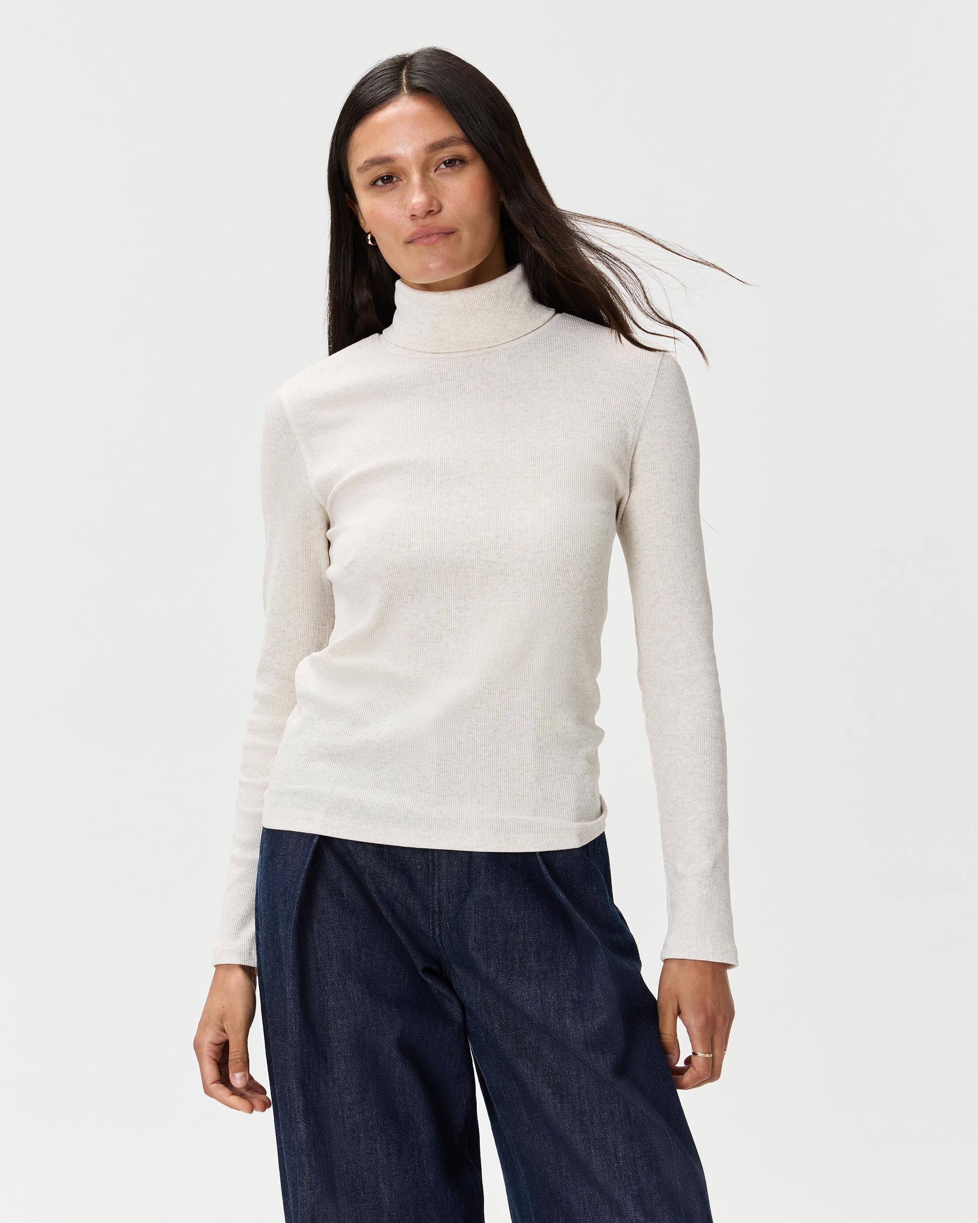 Grab a few, because the Organic Cotton Micro-Rib Turtleneck is a lightweight essential that means both comfort and style. Made from premium organic cotton, its micro rib adds a touch of texture to anything. Pair with high-waisted jeans and your favorite leather jacket for a timelessly cool look. | Quince | Women's Micro-Rib Turtleneck Sweater in Heather Oatmeal, Size Large, Organic Cotton