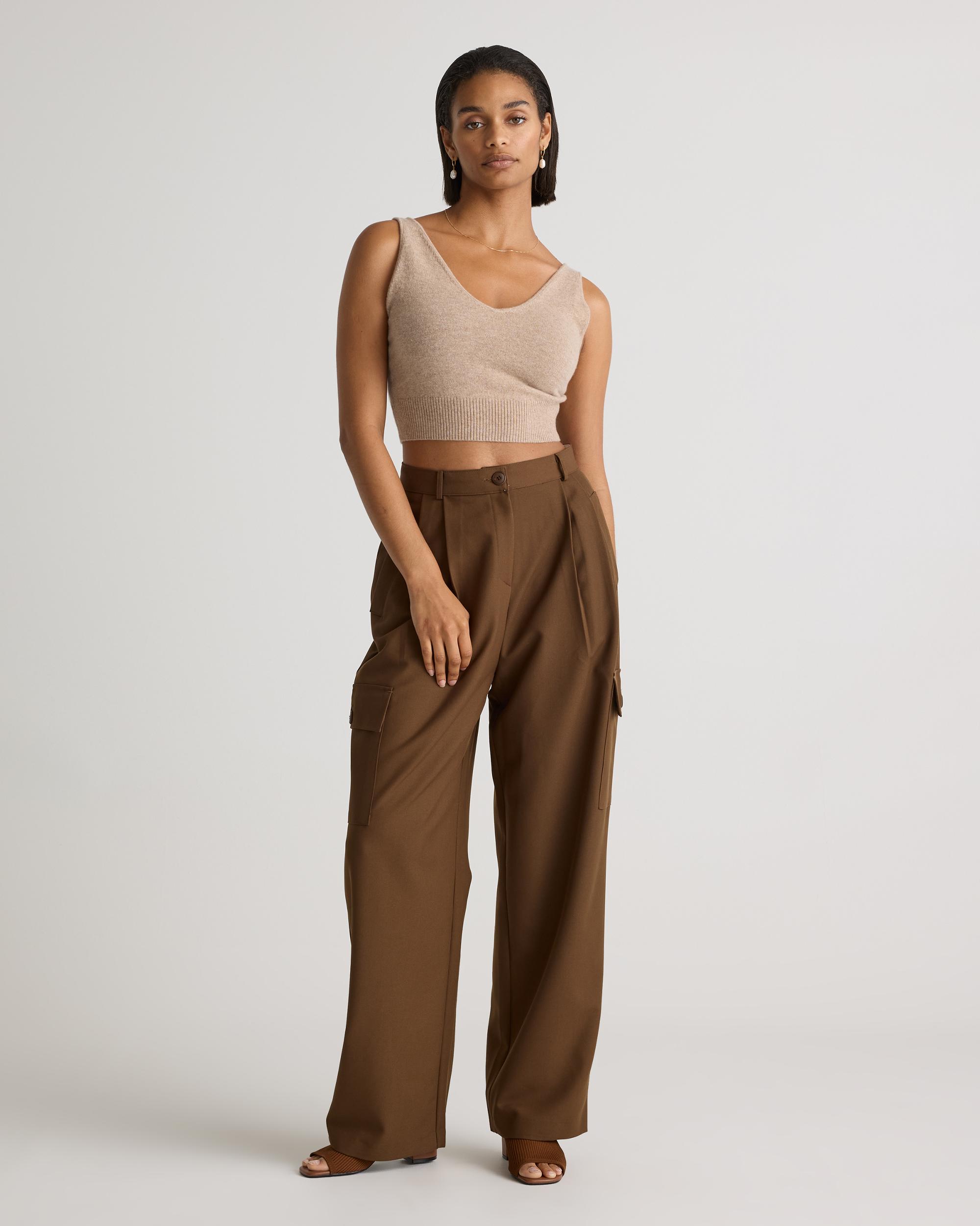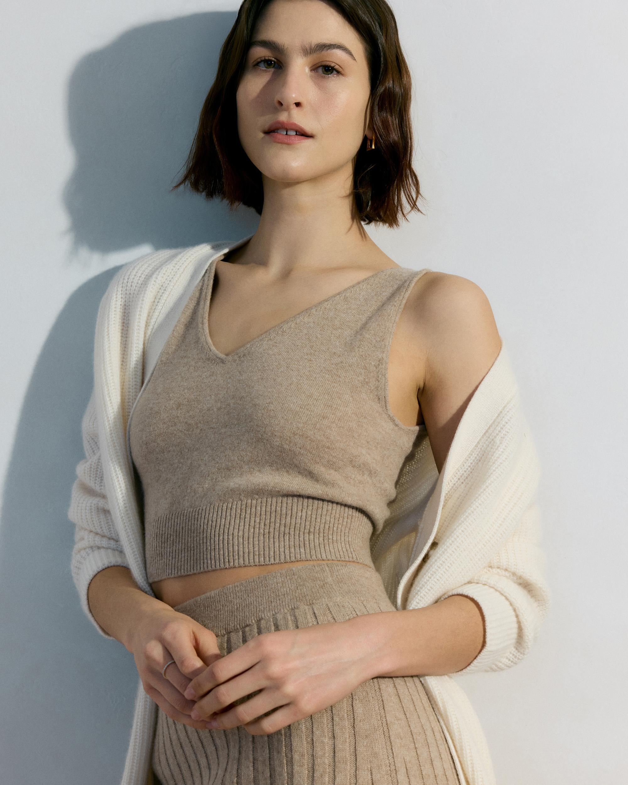 Oh, hello, Mongolian Cashmere Cropped V-Tank. Made from 100% Grade A Mongolian cashmere, this is our luxe take on the statement bralette and it’s available at a radically low price. We've upgraded it to be smoother, cozier, and more substantial than ever, with less pilling. Our luxuriously soft cashmere collection is a best-seller for a reason. P.S. Pair it with our Cashmere Straight Leg Pants for a killer combo. | Quince | Women's Mongolian Cashmere Cropped Tank Top in Oatmeal, Size XS
