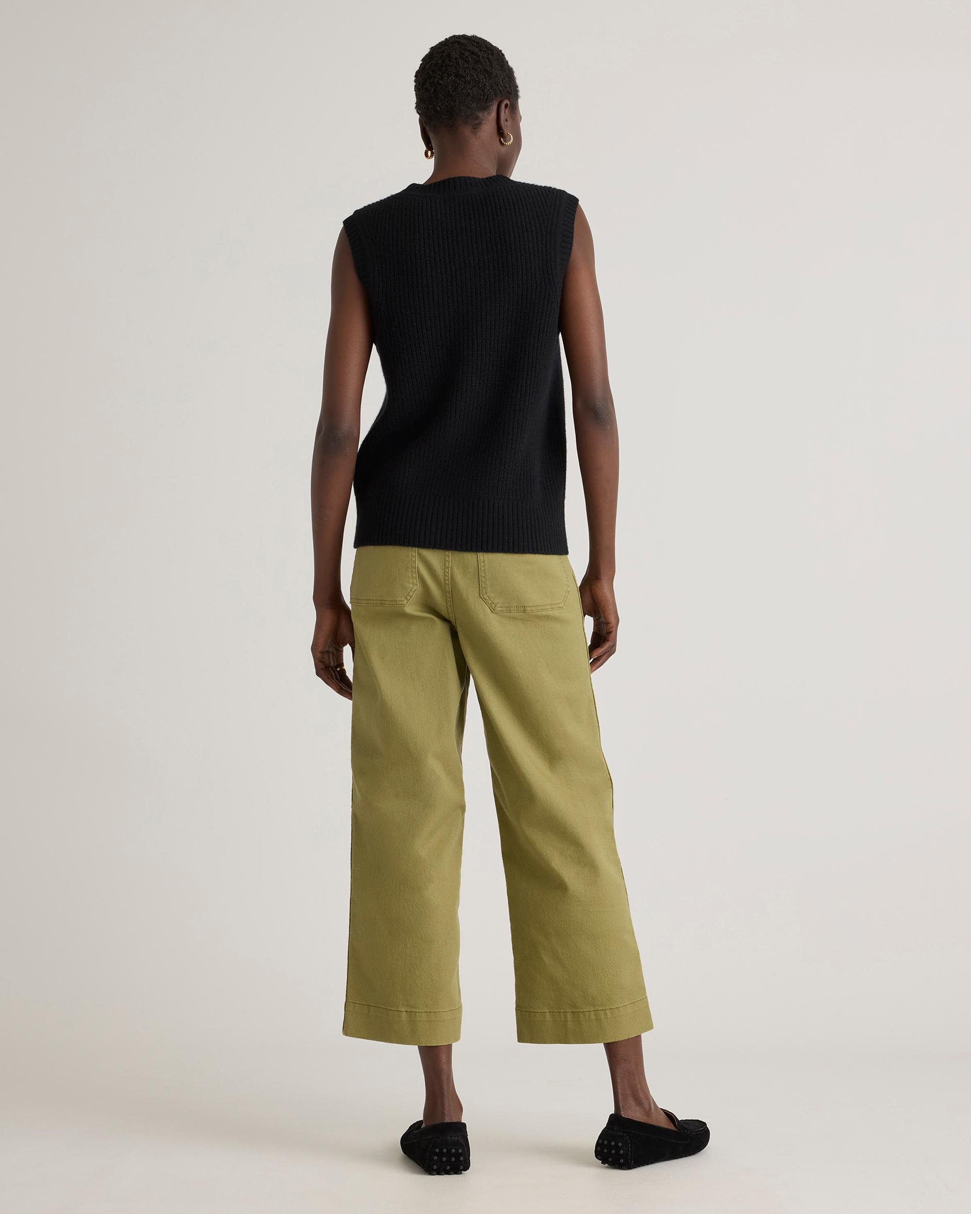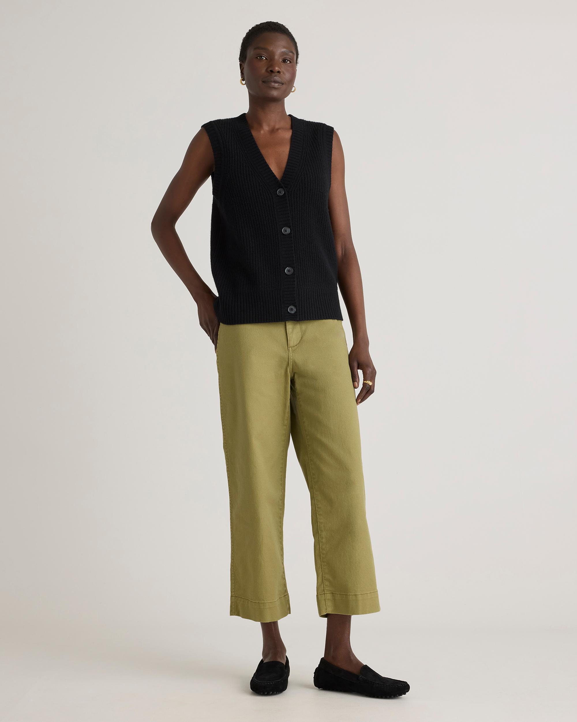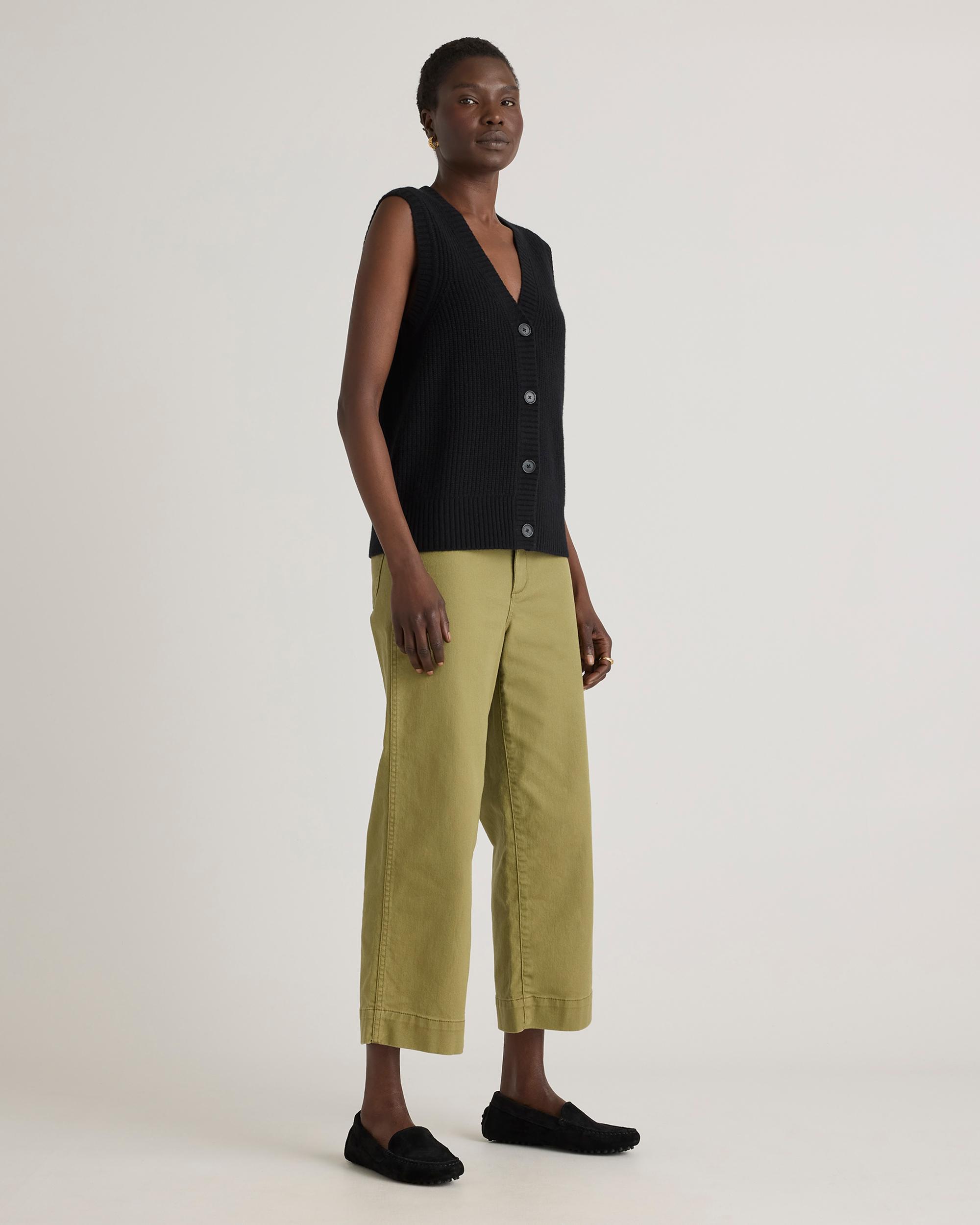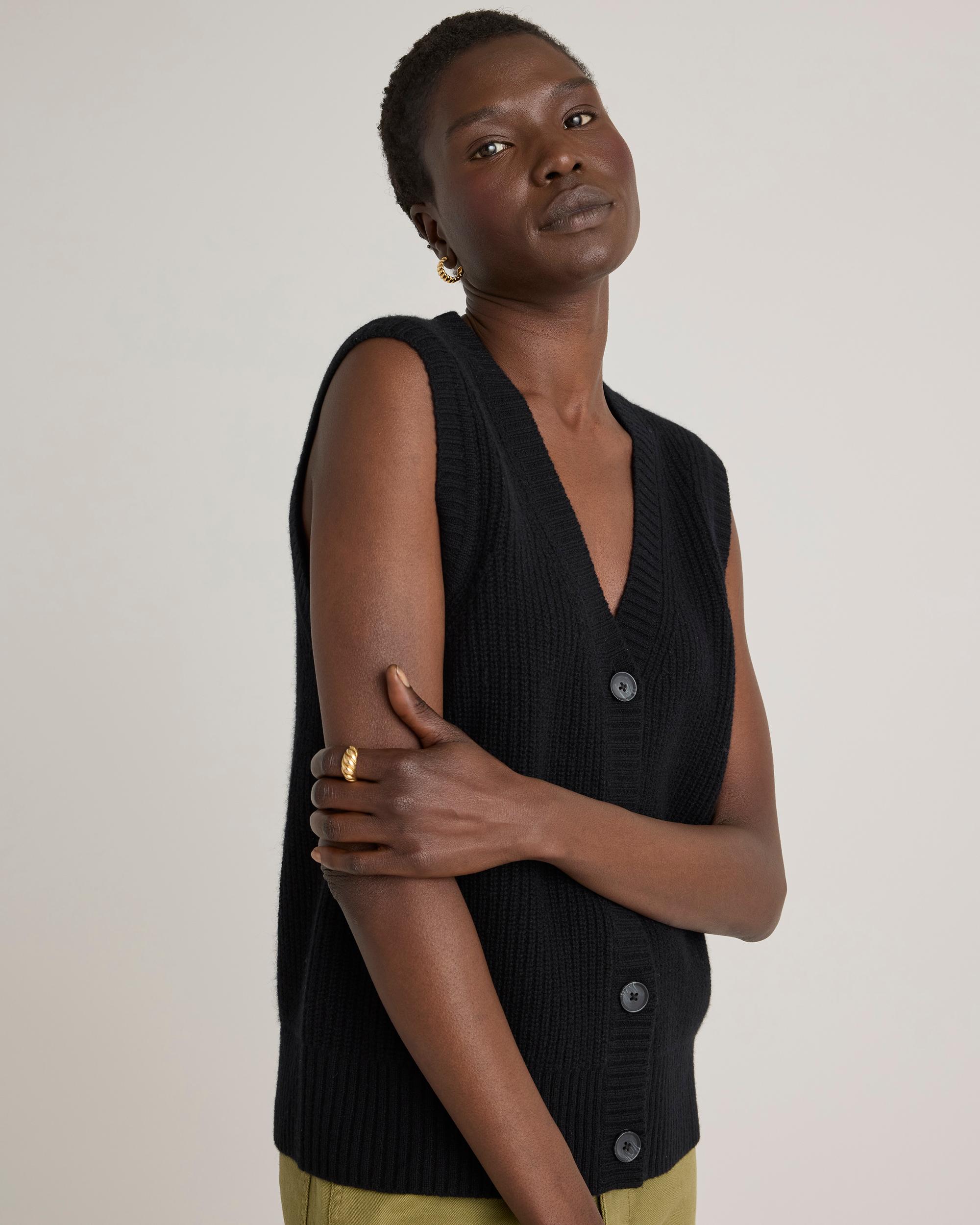 Say yes to sweater vests in 100% Grade-A Mongolian cashmere. This fresh take on a fisherman sweater comes complete with allover ribbed detailing and classic buttons. Wear it as a standalone or over a cami for a luxuriously soft layering piece. It’s the cozy-chic transitional top you’ll want to wear with everything. Read more on what makes it special in our Cashmere 101. | Quince | Women's Mongolian Cashmere Fisherman Sweater Vest in Black, Size XS