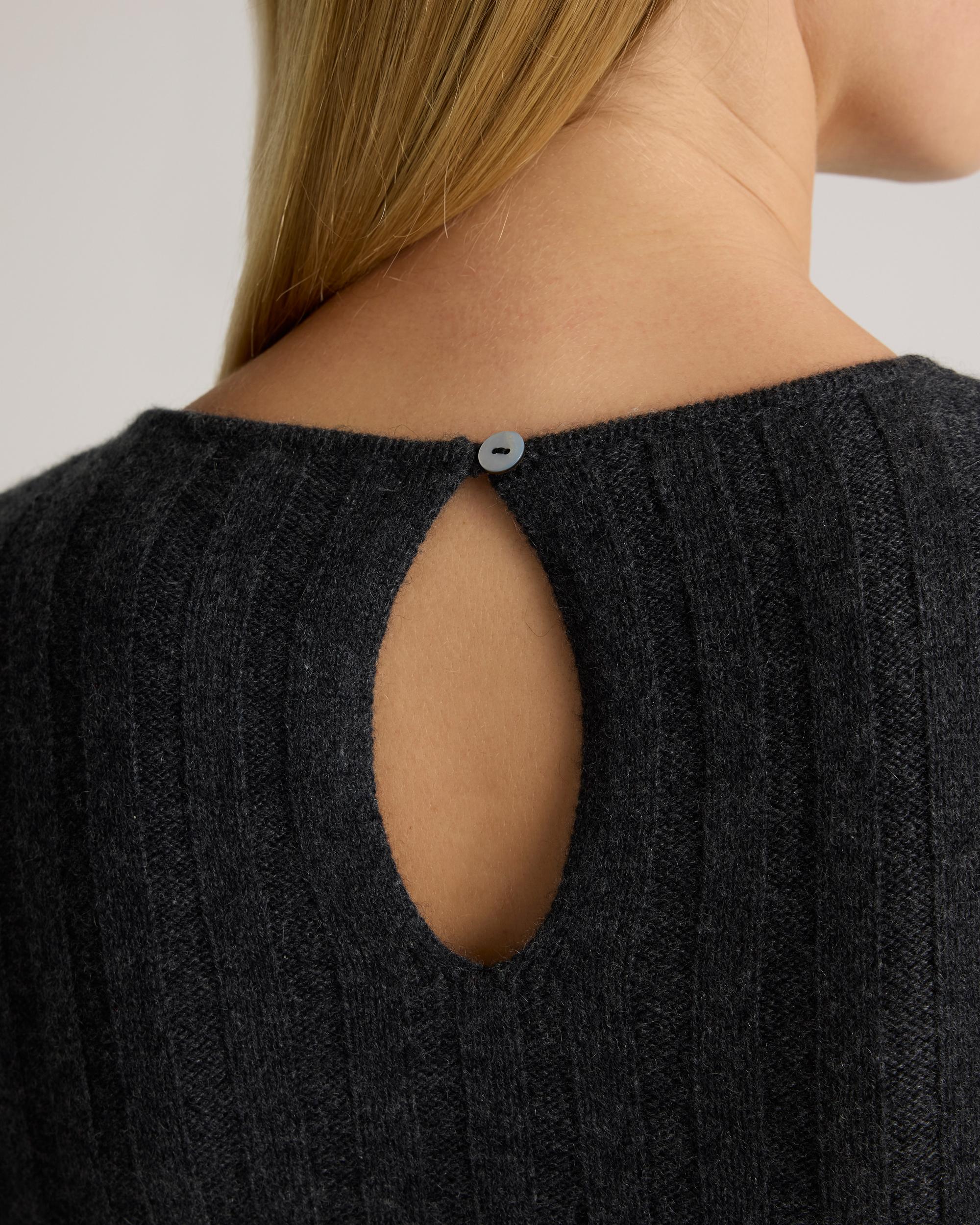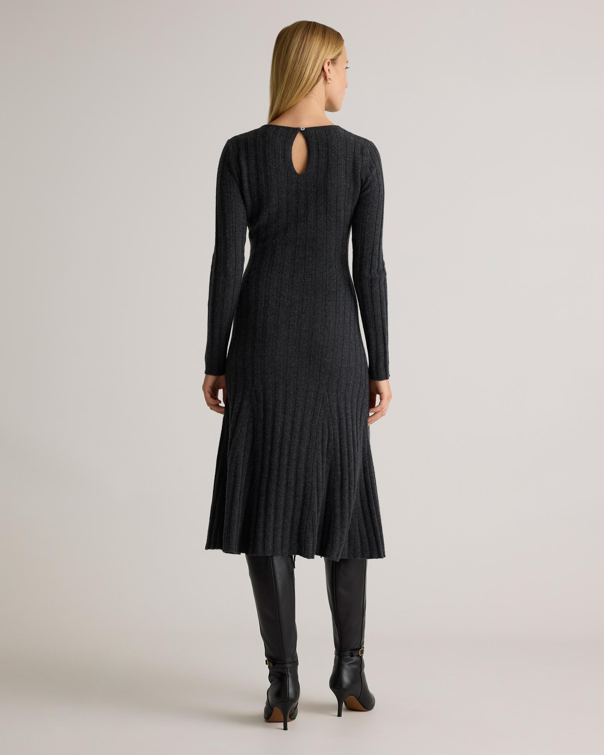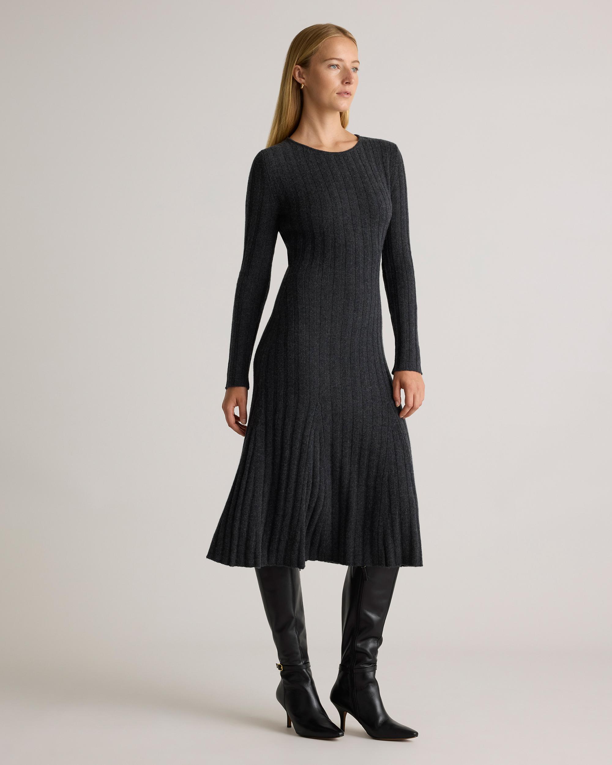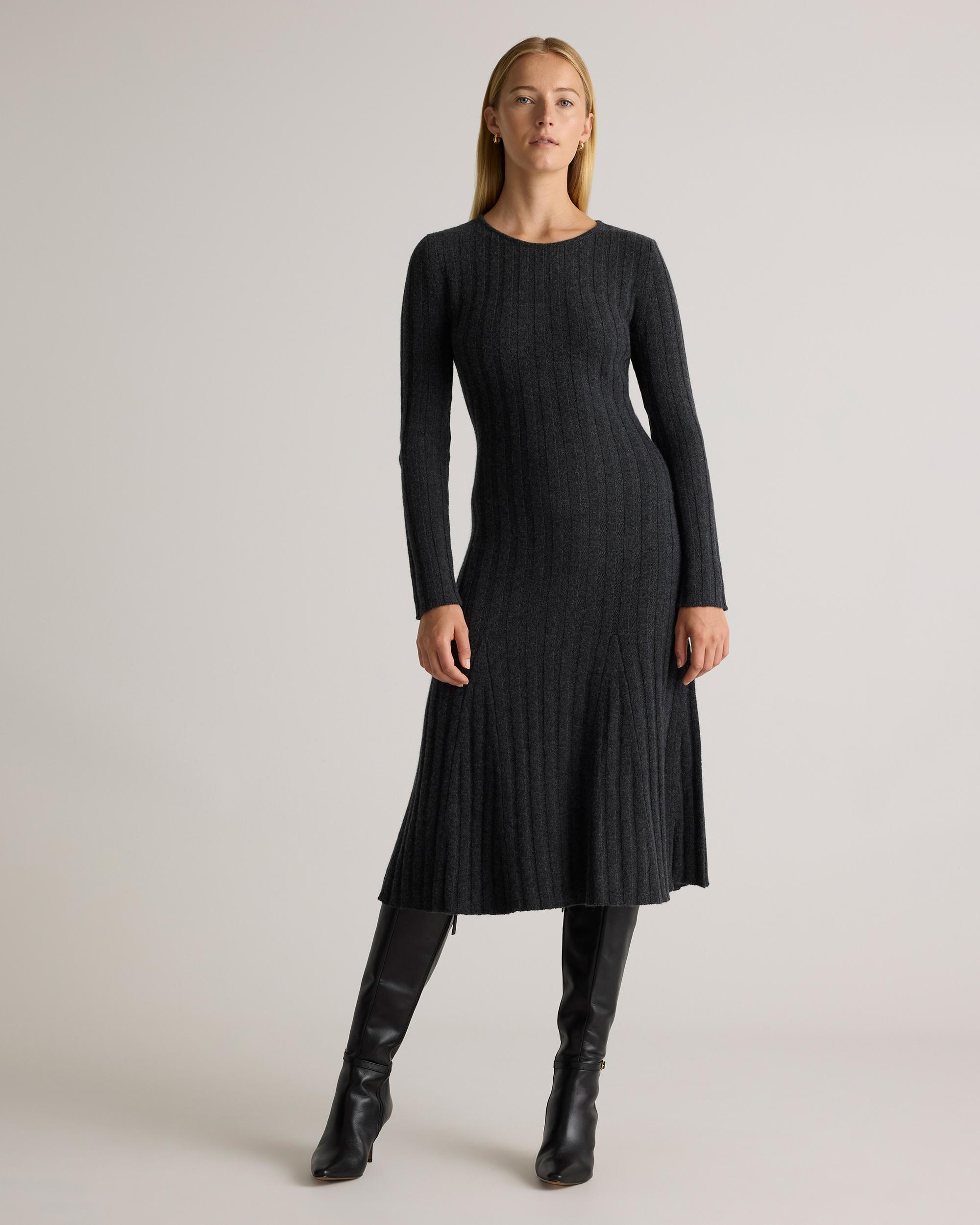 Our Mongolian Cashmere Wide-Rib Midi Dress feels as good as it looks. The wide-rib knit pattern adds depth and texture to the silhouette, while the fitted design flatters your figure in all the right places. Ideal for layering or wearing on its own, this cashmere dress pairs beautifully with boots, heels, or sneakers for a versatile look that can be styled up or down with ease. Read more on what makes it special in our Cashmere 101. | Quince | Women's Mongolian Cashmere Wide-Rib Midi Dress in Heather Charcoal, Size Small