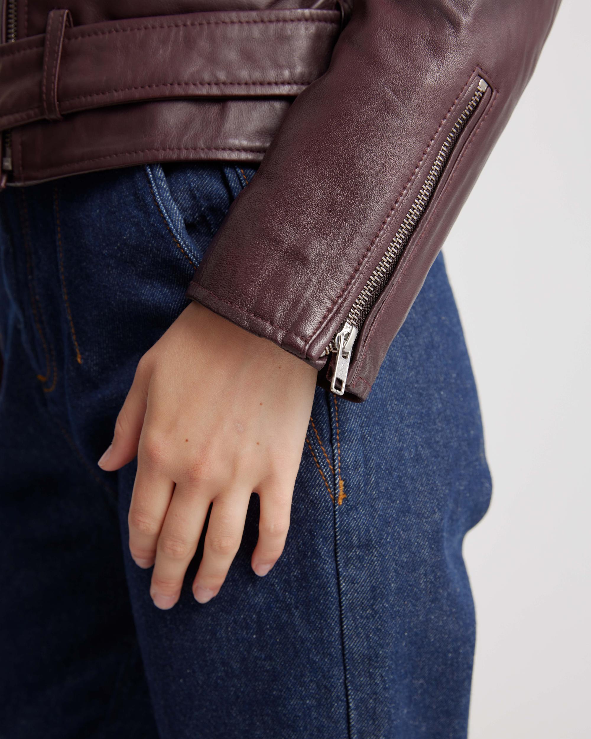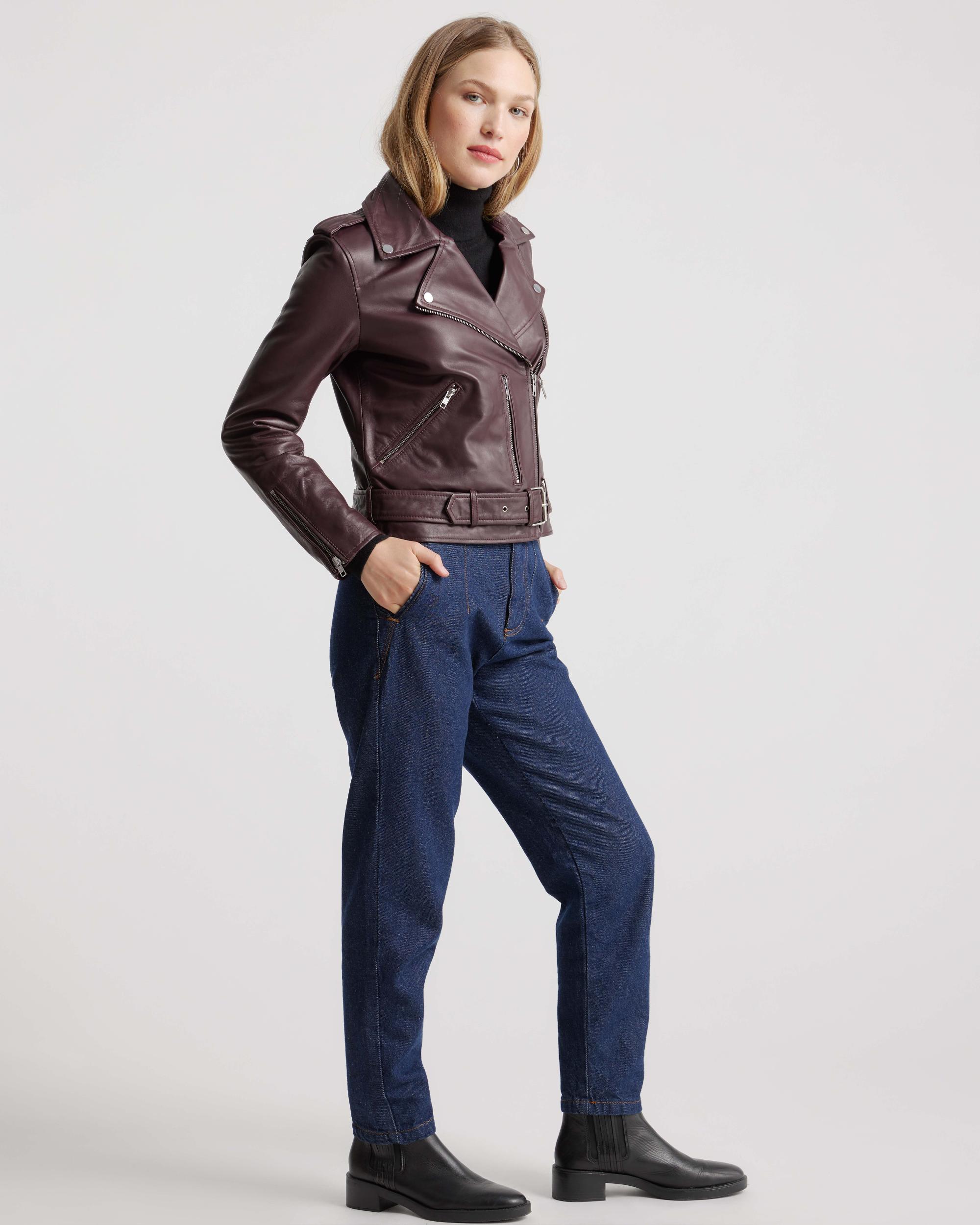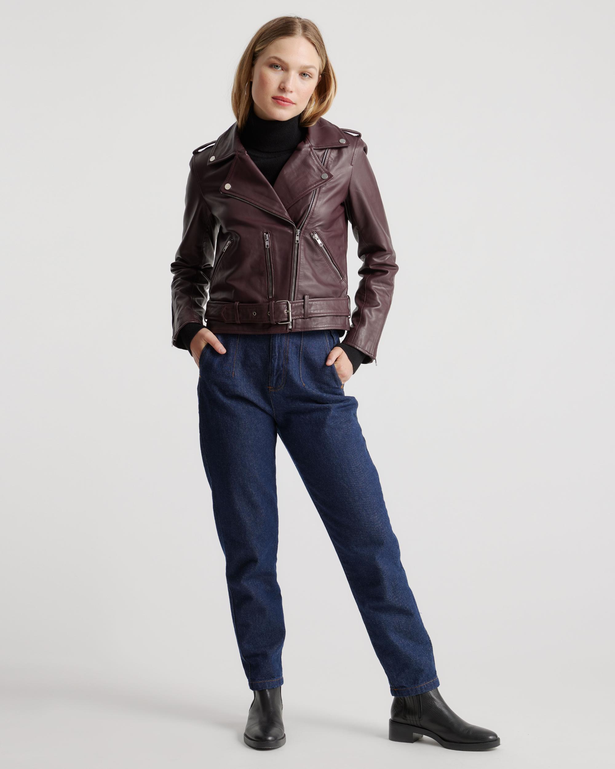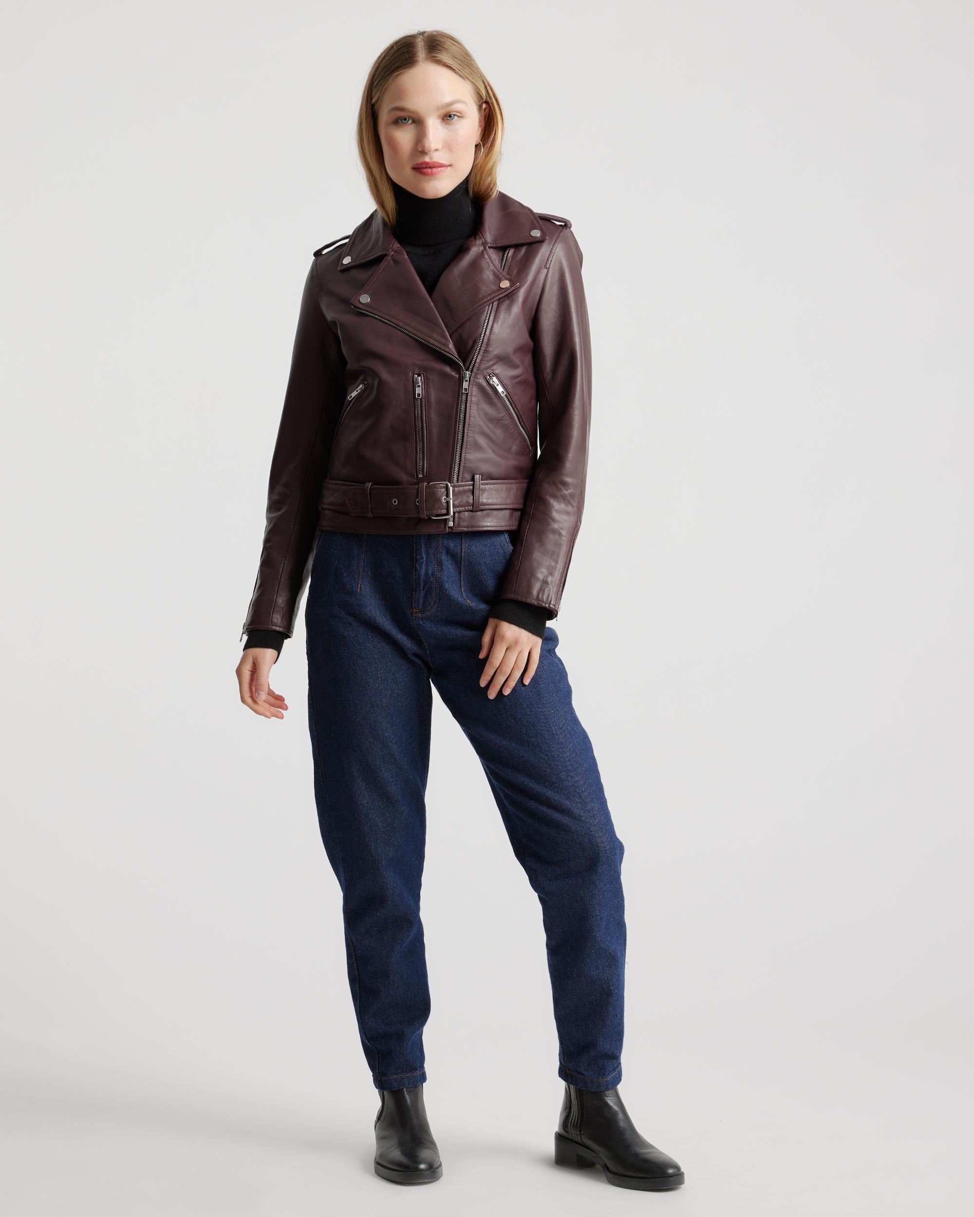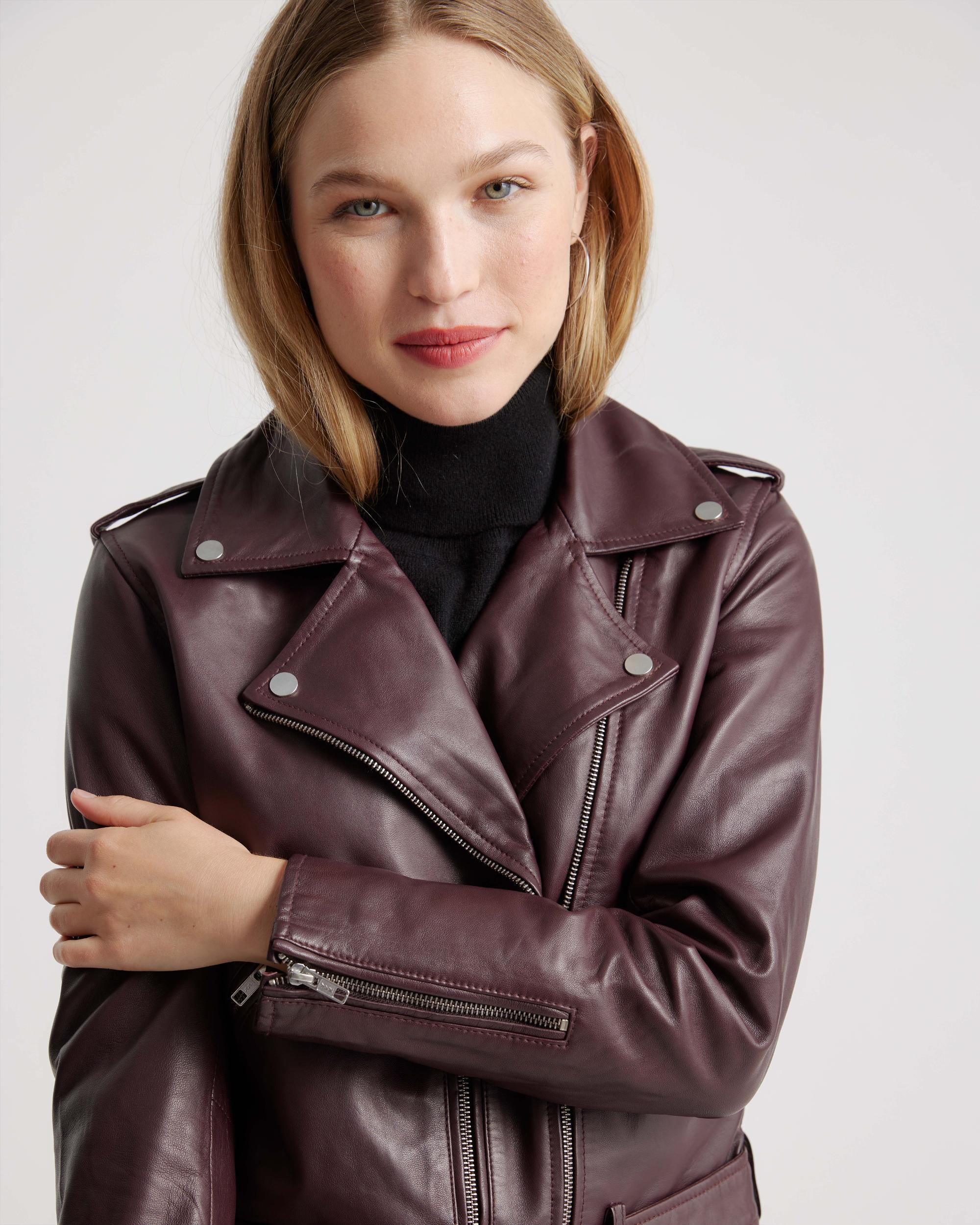 Biker chic incoming. Crafted from 100% top grain leather in a totally timeless design. This leather motorcycle jacket is unbelievably soft, and super stylish. Epaulette shoulders and robust zip details on the sleeves and pockets give it an edgy feel. Plus the pockets are spacious and usable. Fully lined with a poly satin in a slim cut, with belted hem. Read more about what makes our leather special in our Leather 101 guide. | Quince | Women's Motorcycle Jacket in Burgundy, Size Large, Leather