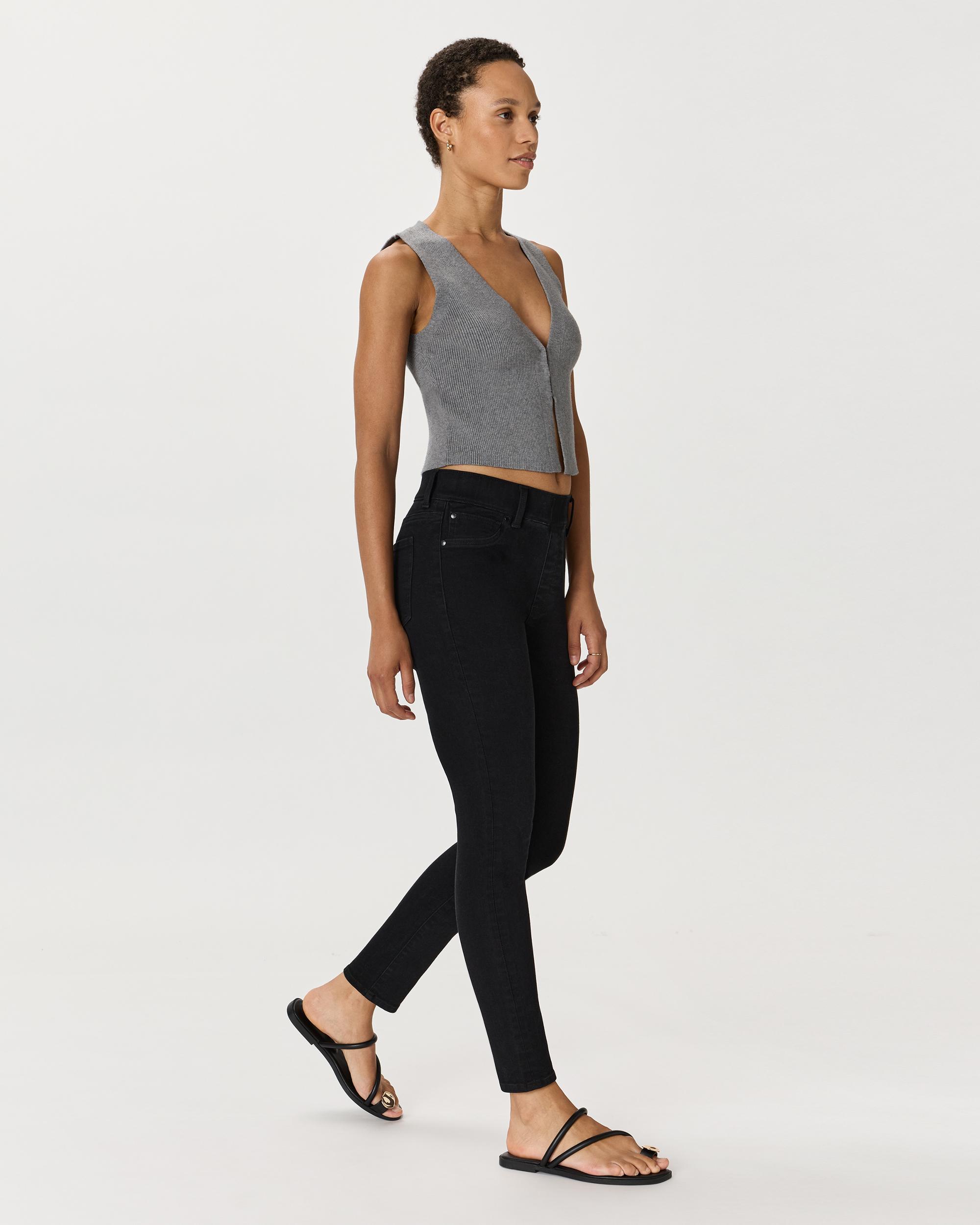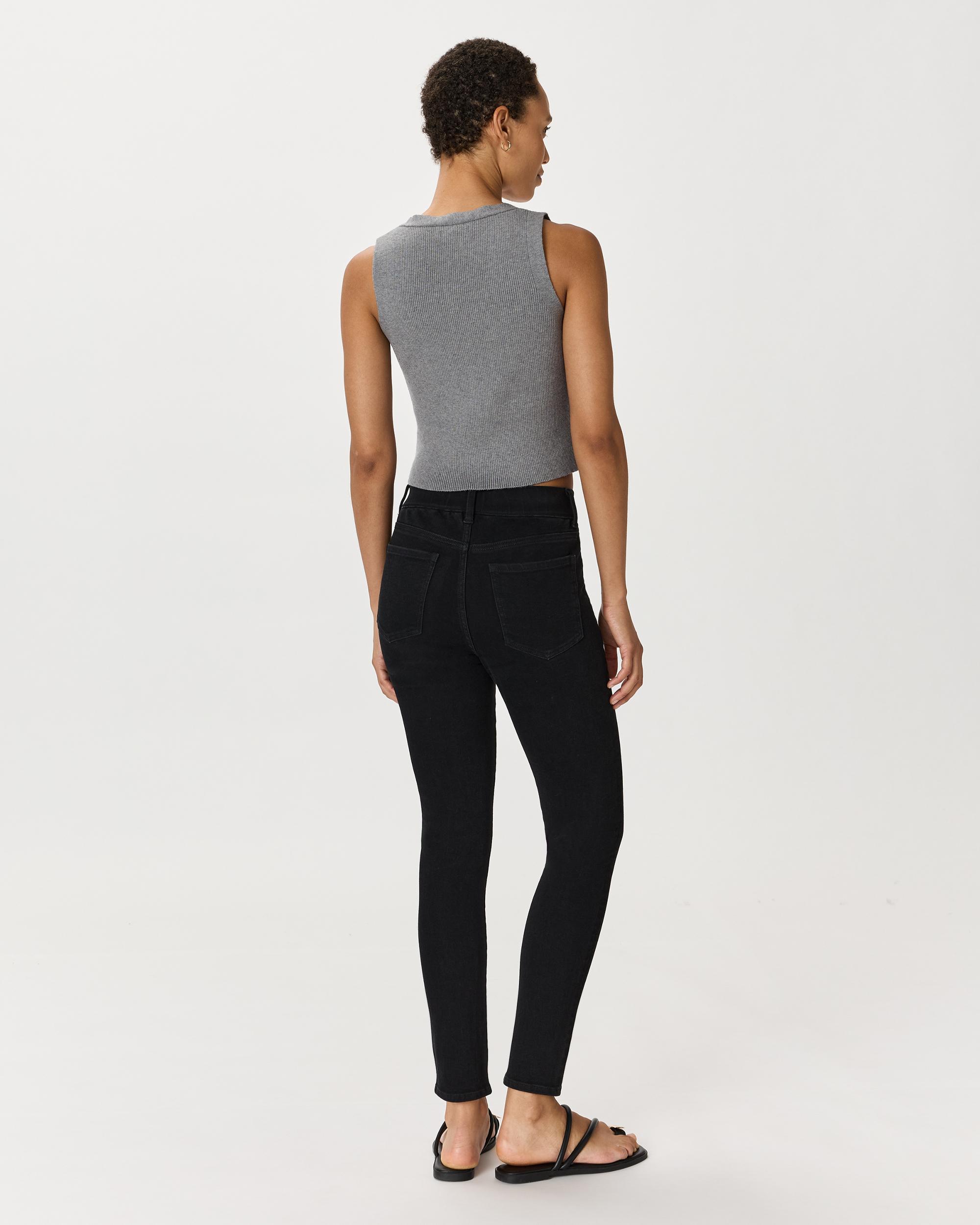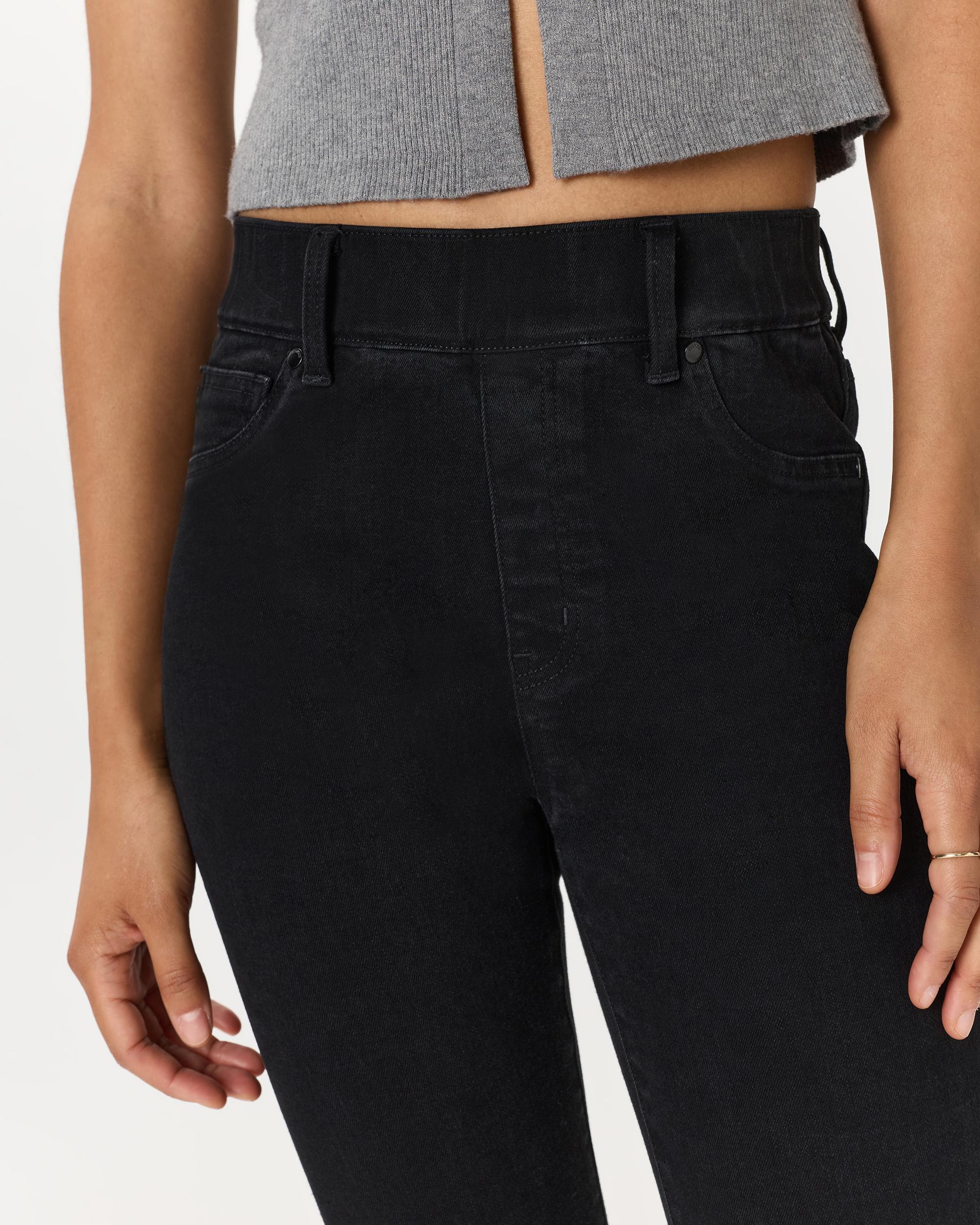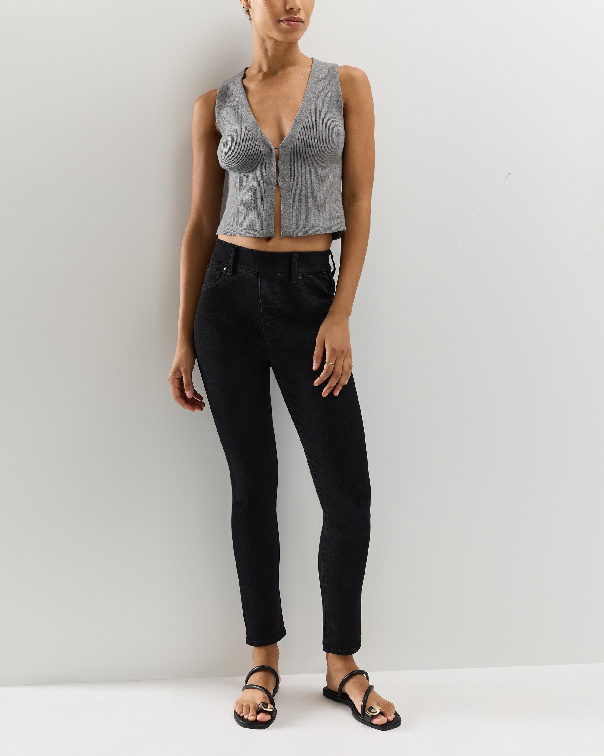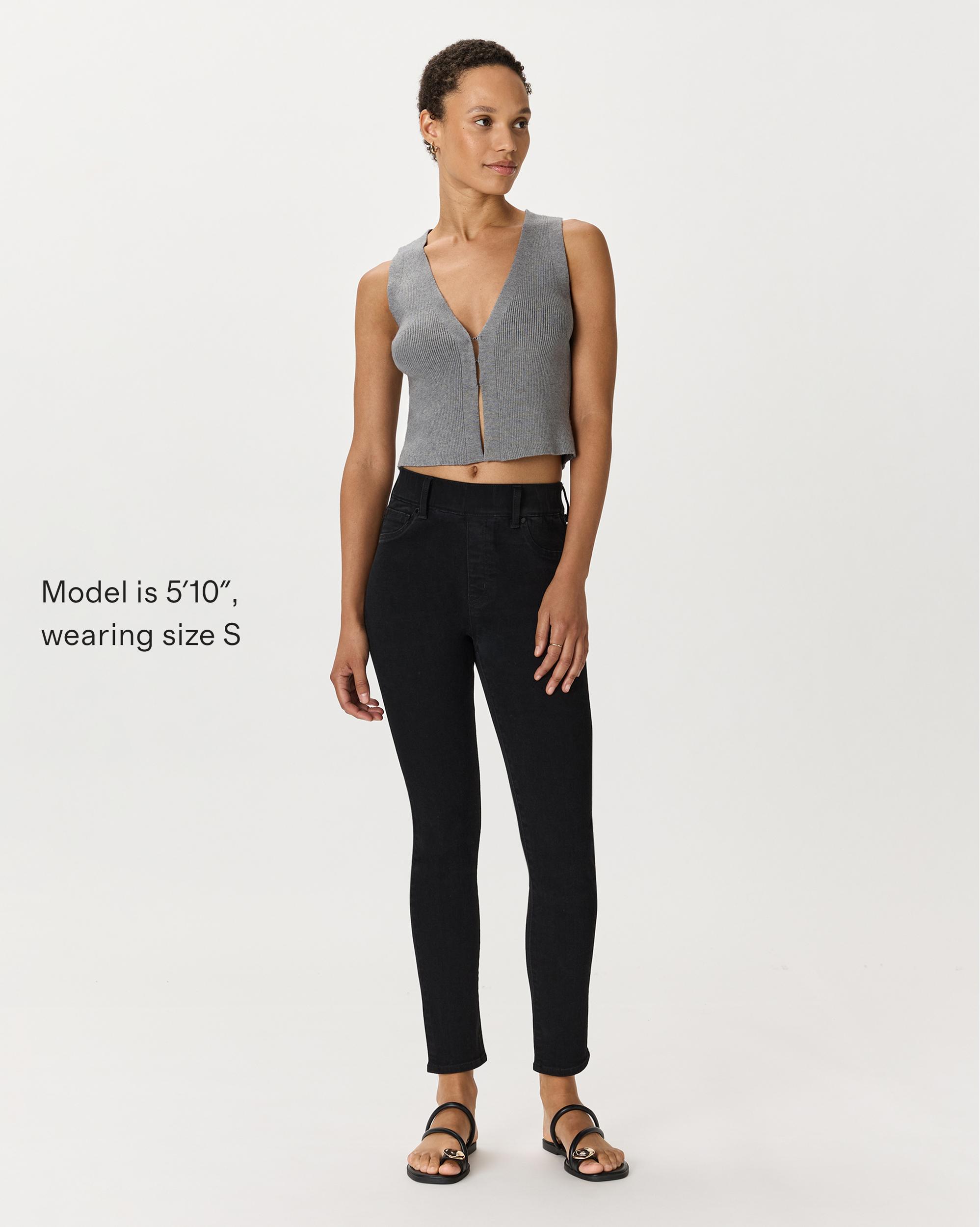 Meet your new go-to skinny jean. Our Nina Stretch Pull-On Skinny Jeans are crafted from ultra-soft, recycled cotton with just the right amount of stretch and recovery. Designed with a smooth, flat waistband and faux front pockets for a clean silhouette, this pair pulls on easily with no buttons, zippers, or bulk in sight. | Quince | Women's Nina Stretch Pull-On Skinny Jeans in Raven Black, Size Medium, Cotton
